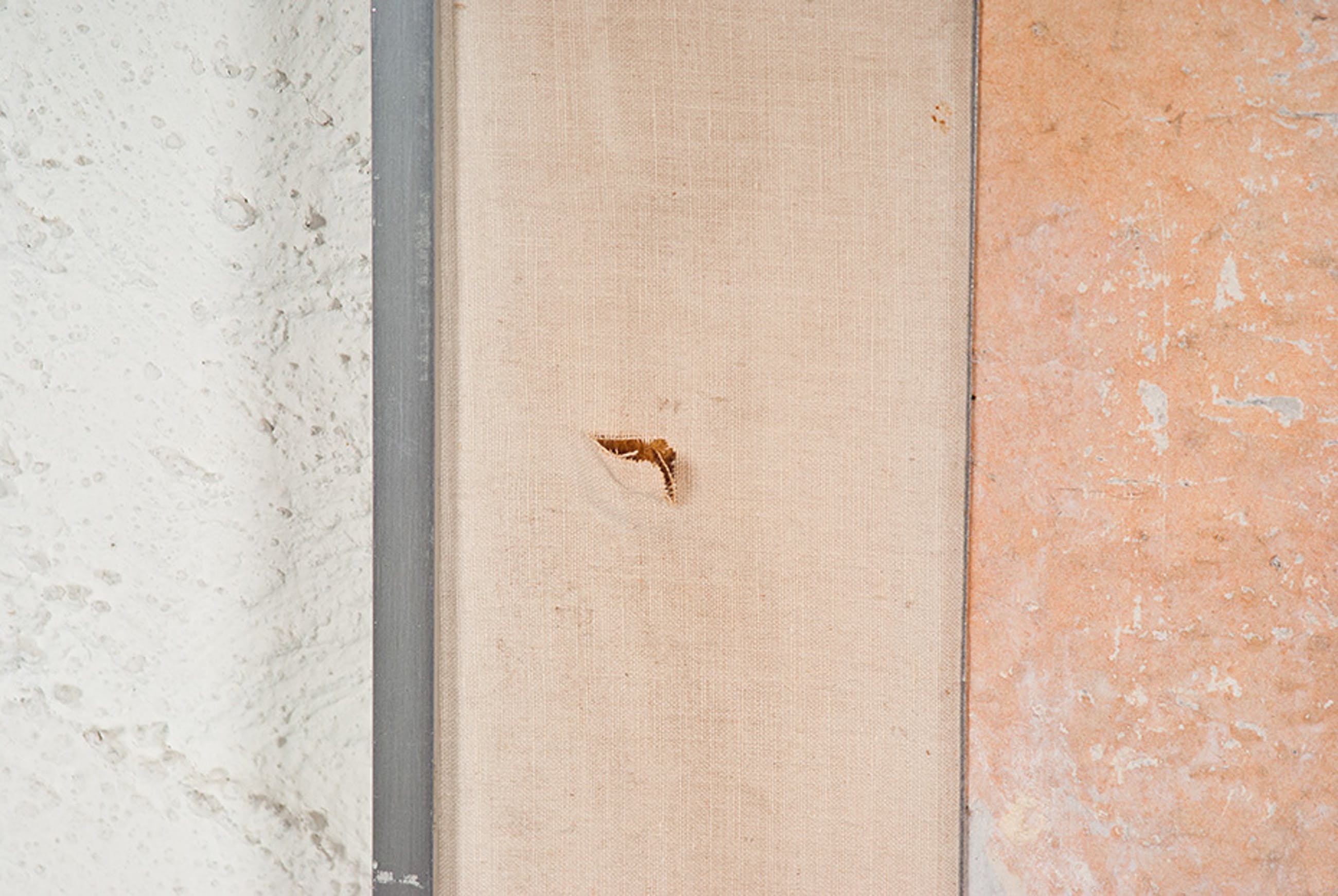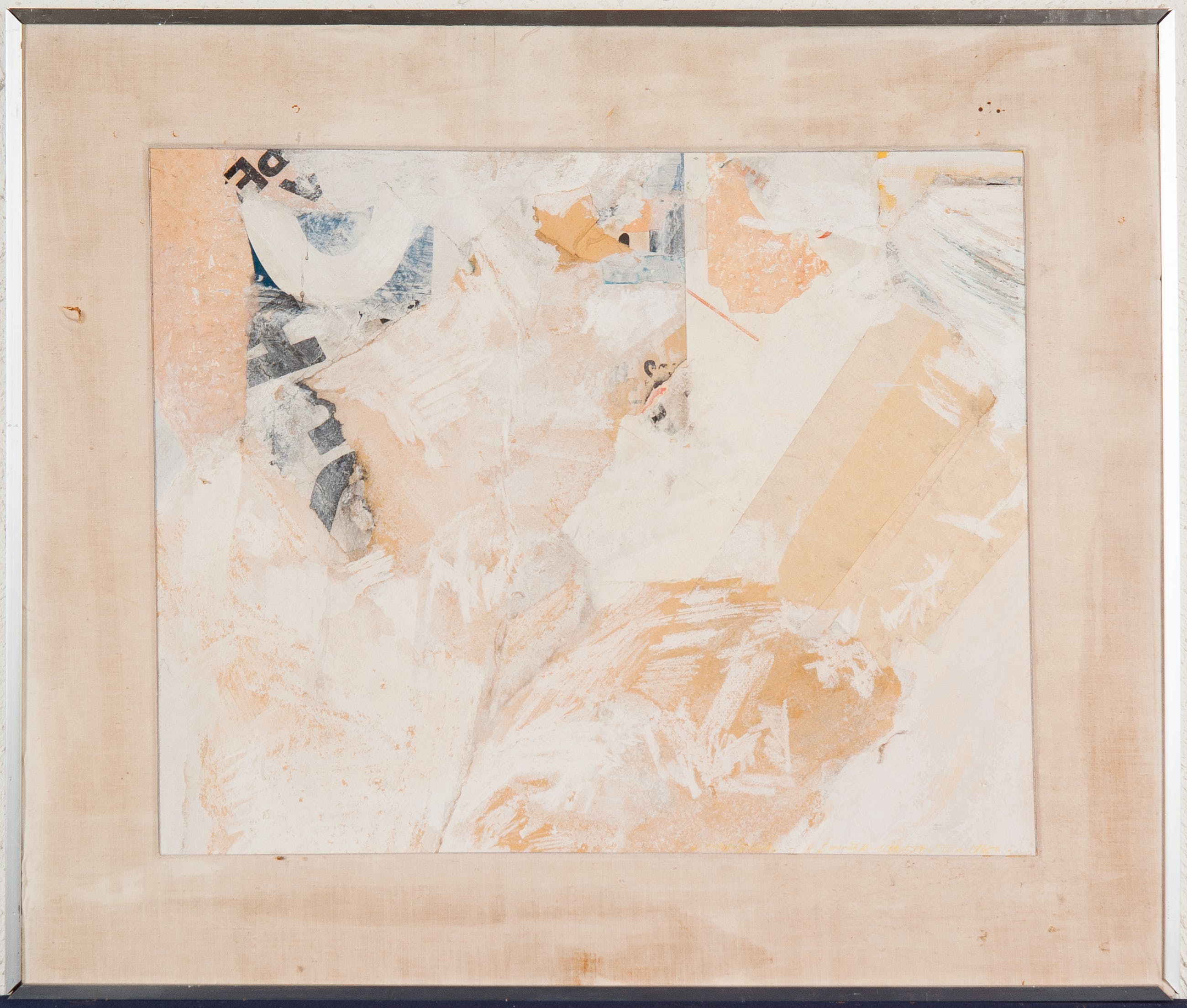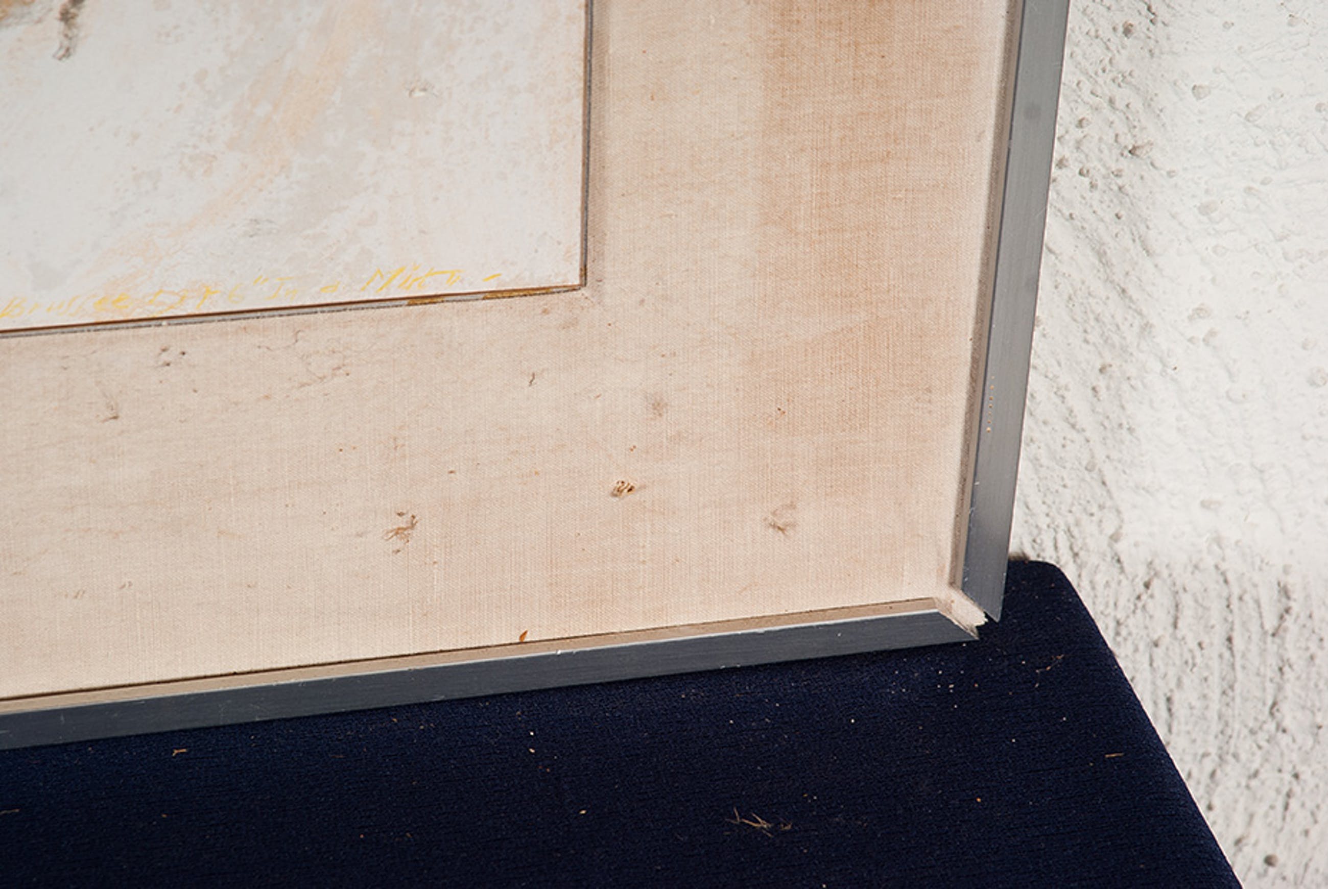 Oppervlak heeft enkele kleine beschadigingen welke door de aard van de techniek nauwelijks opvallen. Het passe-partout is gemaakt van stof dat op een houten frame gespannen is; deze is erg vuil en gescheurd links boven en rechts onder. De rechterzijde lijst is verbogen en werk zit bijgevoegd niet sterk in lijst. | |