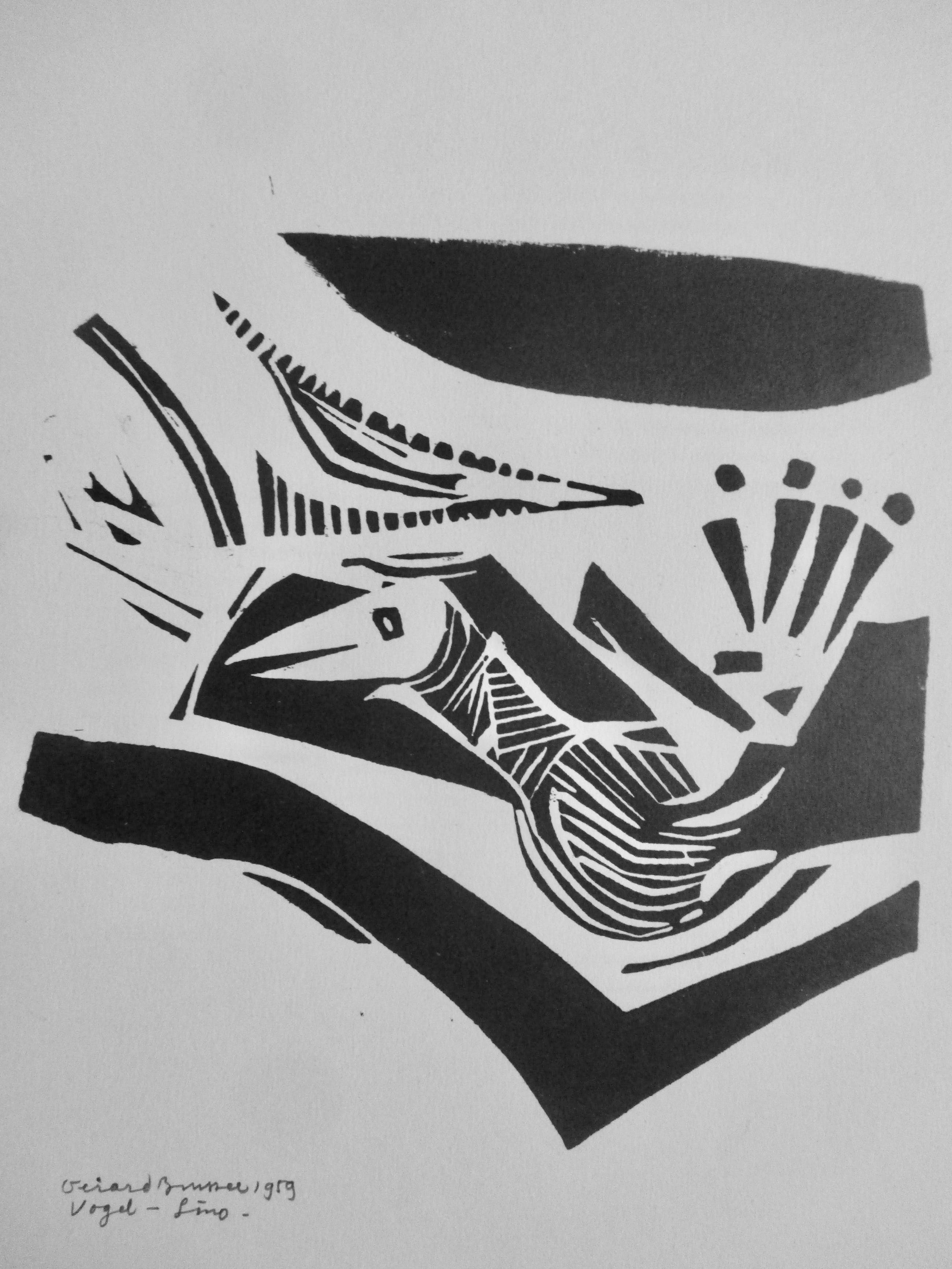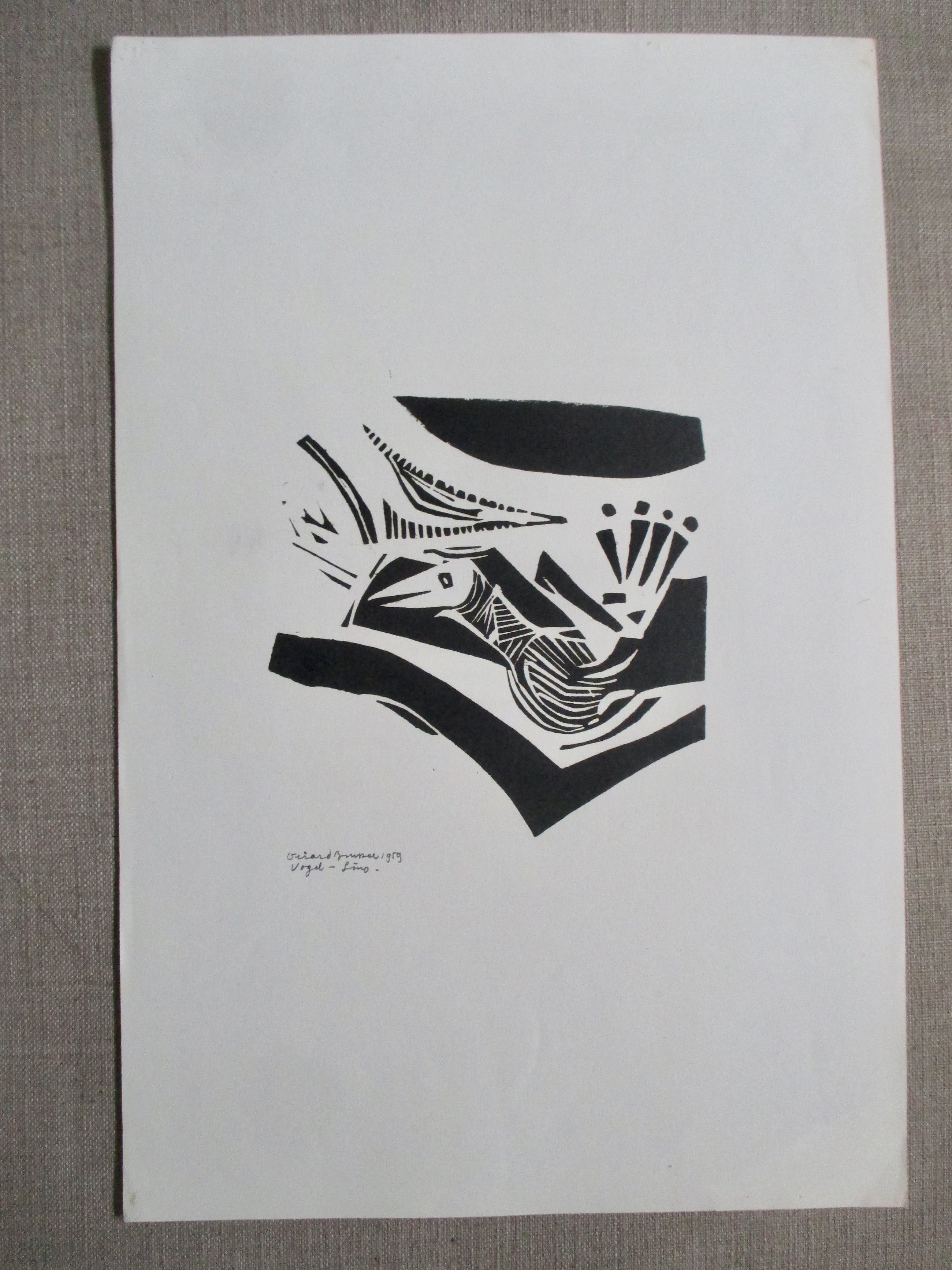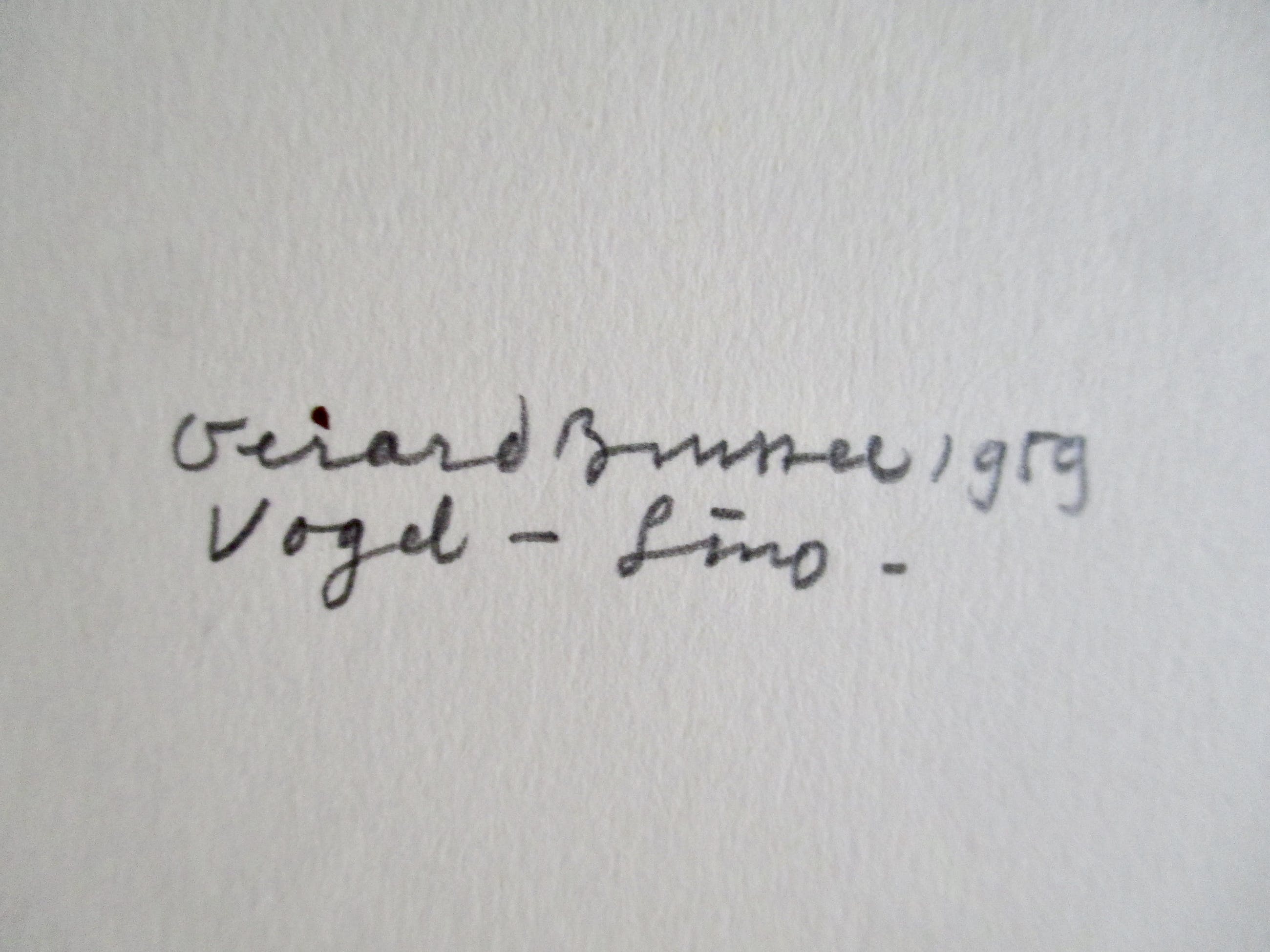 Lino van Gerard Brussee, gesigneerd, gedateerd en getiteld in potlood. Verzending tussen twee plaatjes, 8,25, aangetekend 10,20