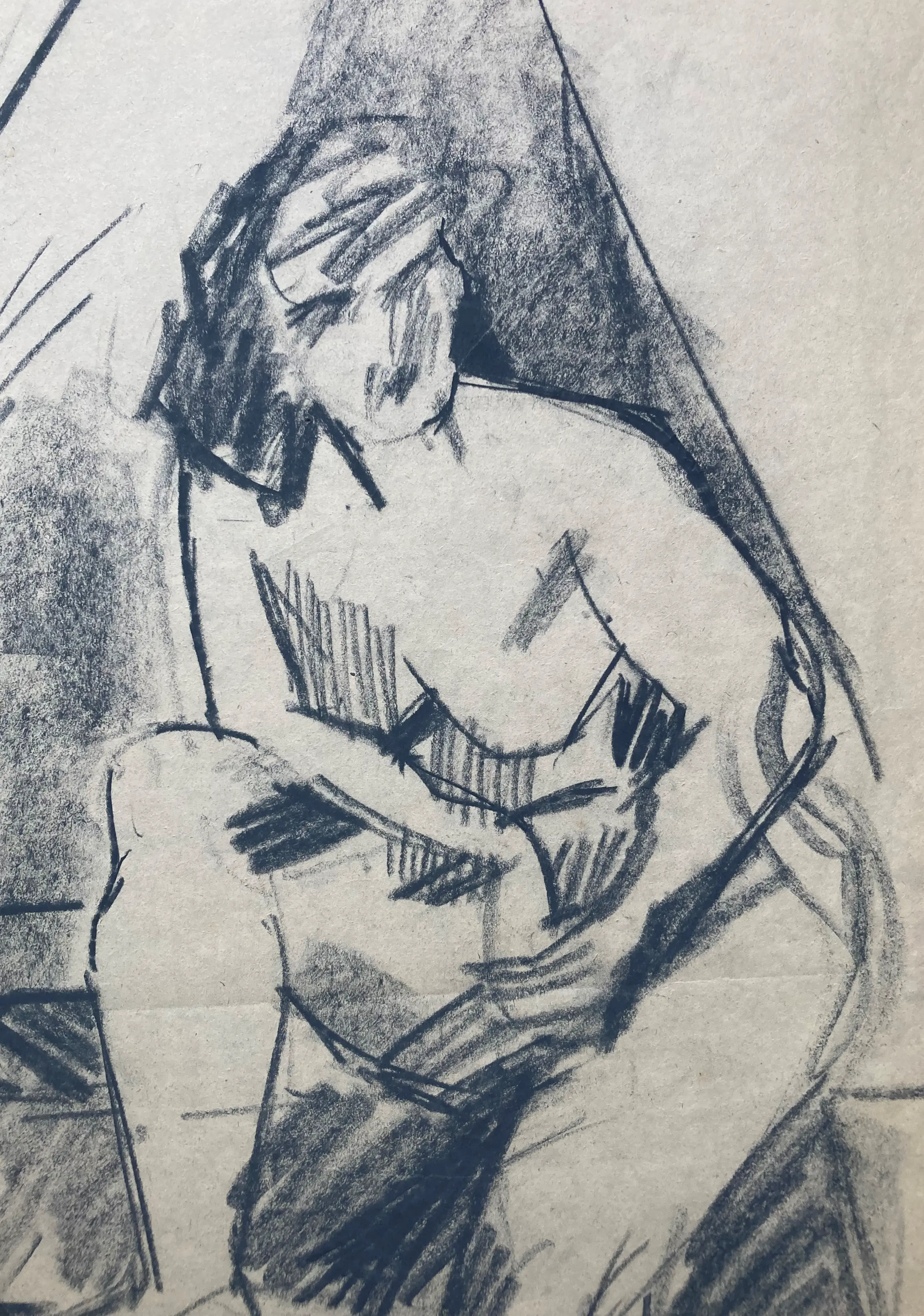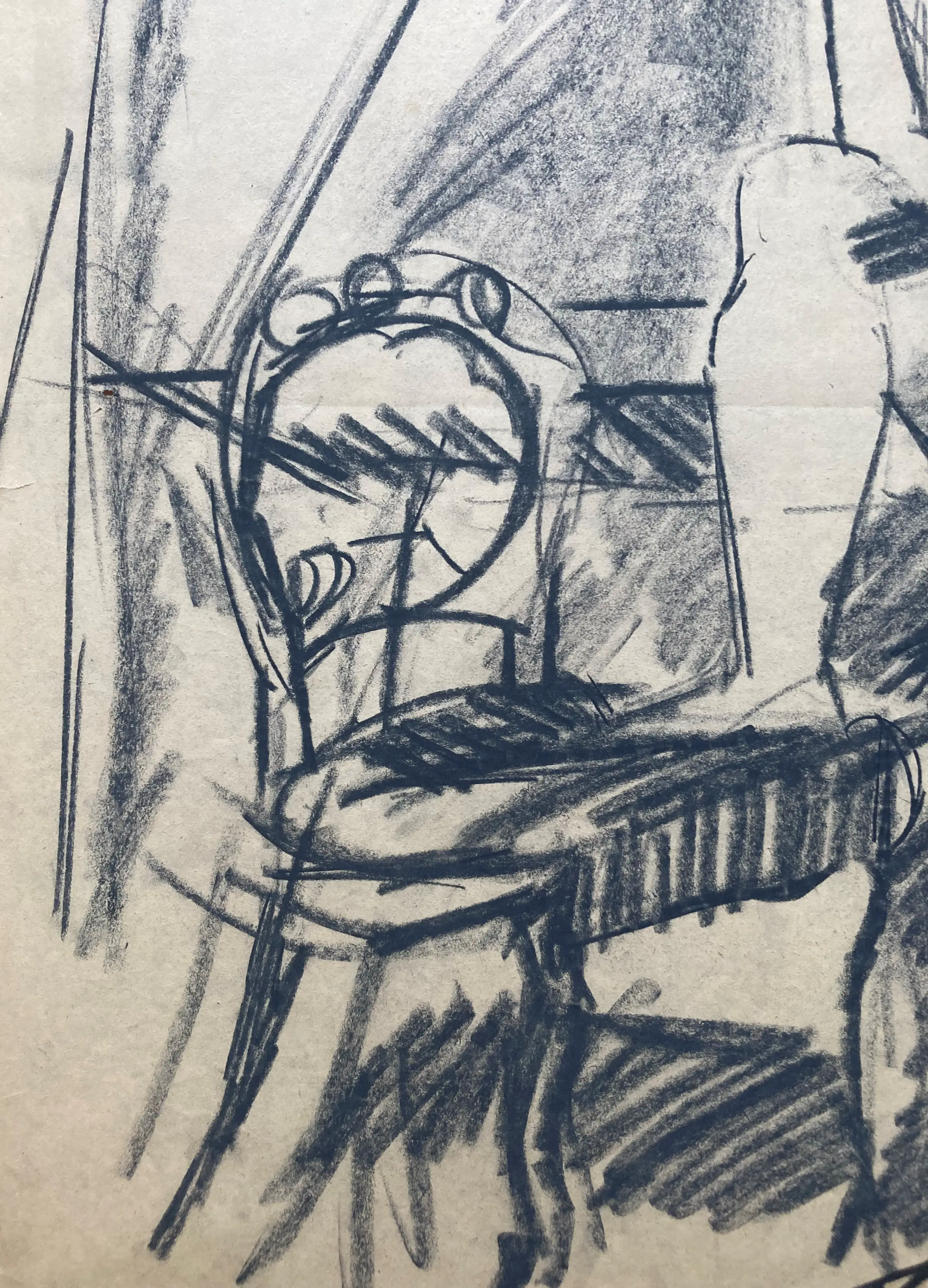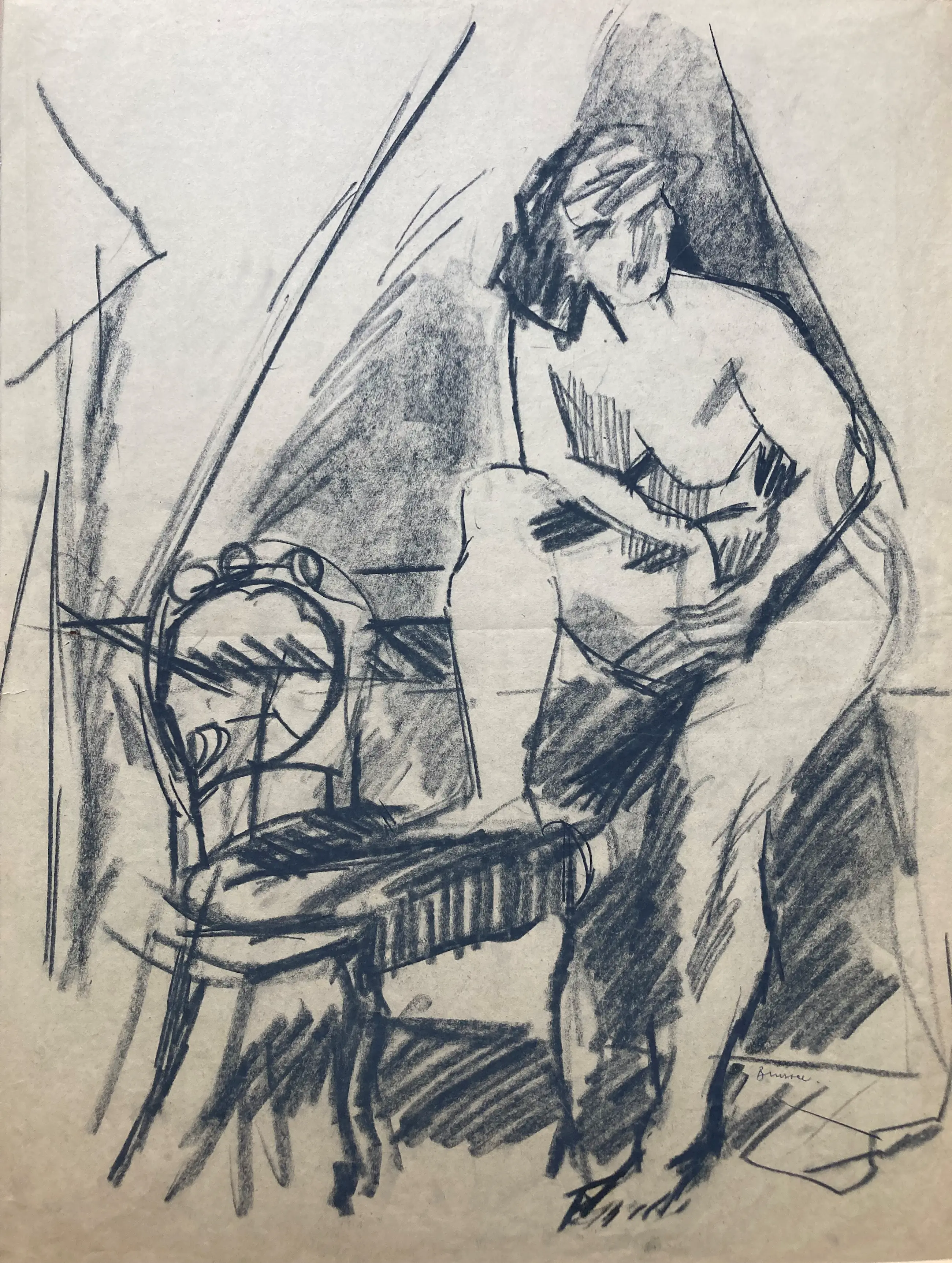 Fraaie grote tekening op dun papier, gesigneerd met pen. Vroeg werk van Brussee uit 1958, afkomstig uit een map met studietekeningen. Papier is licht verkleurd, enkele vouwen, en is aan de randen wat rafelig. Valt weg bij inlijsten zie laatste foto. Geen passepartout.