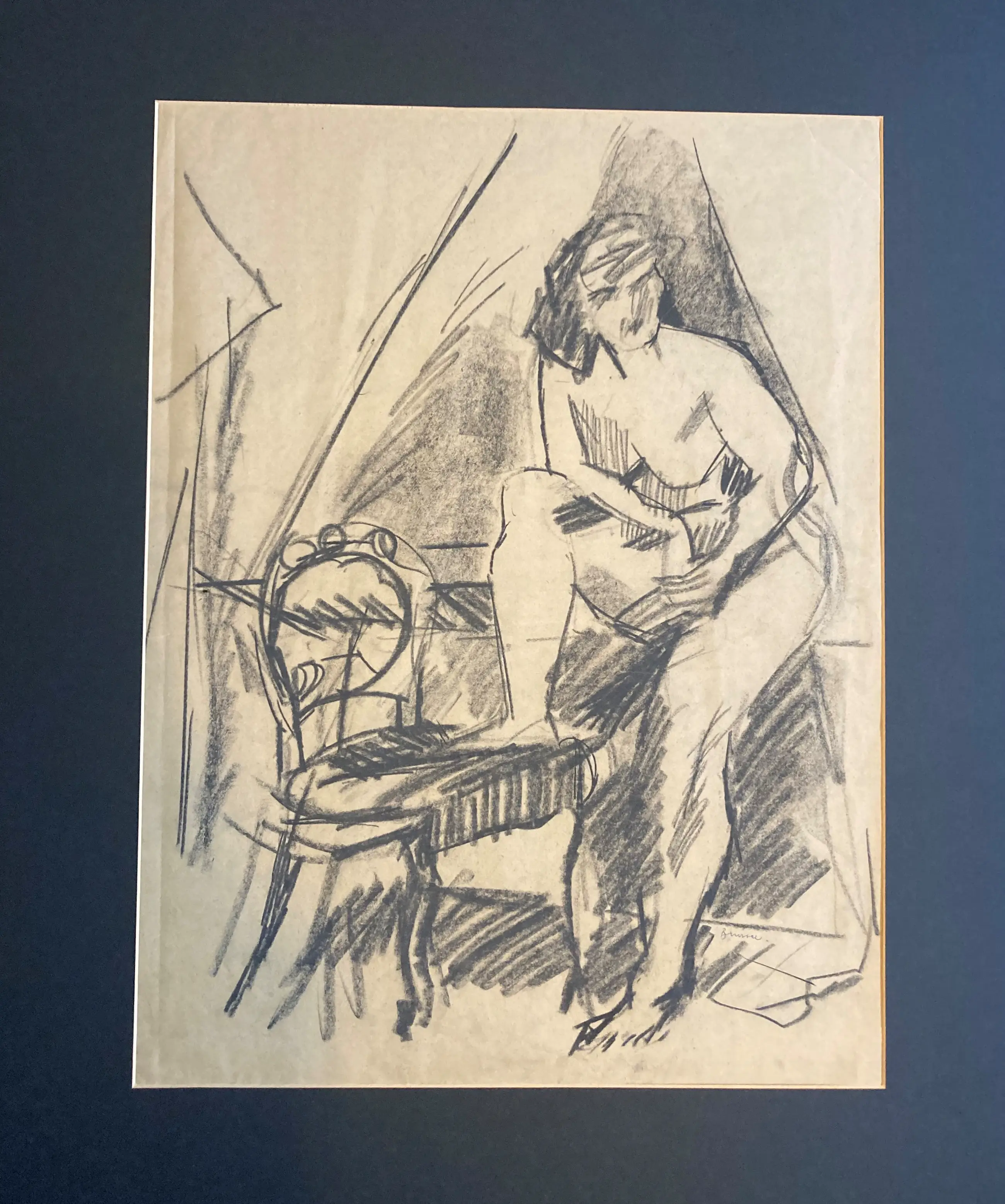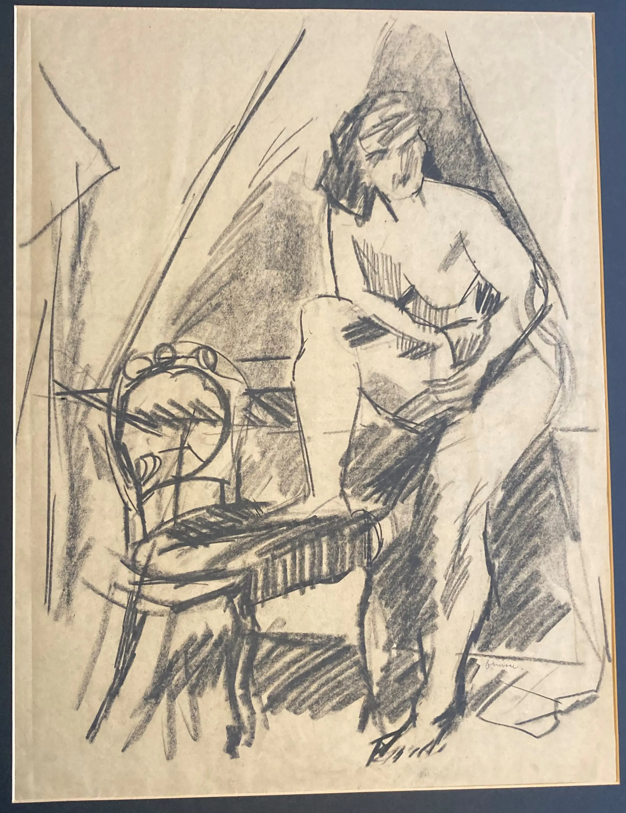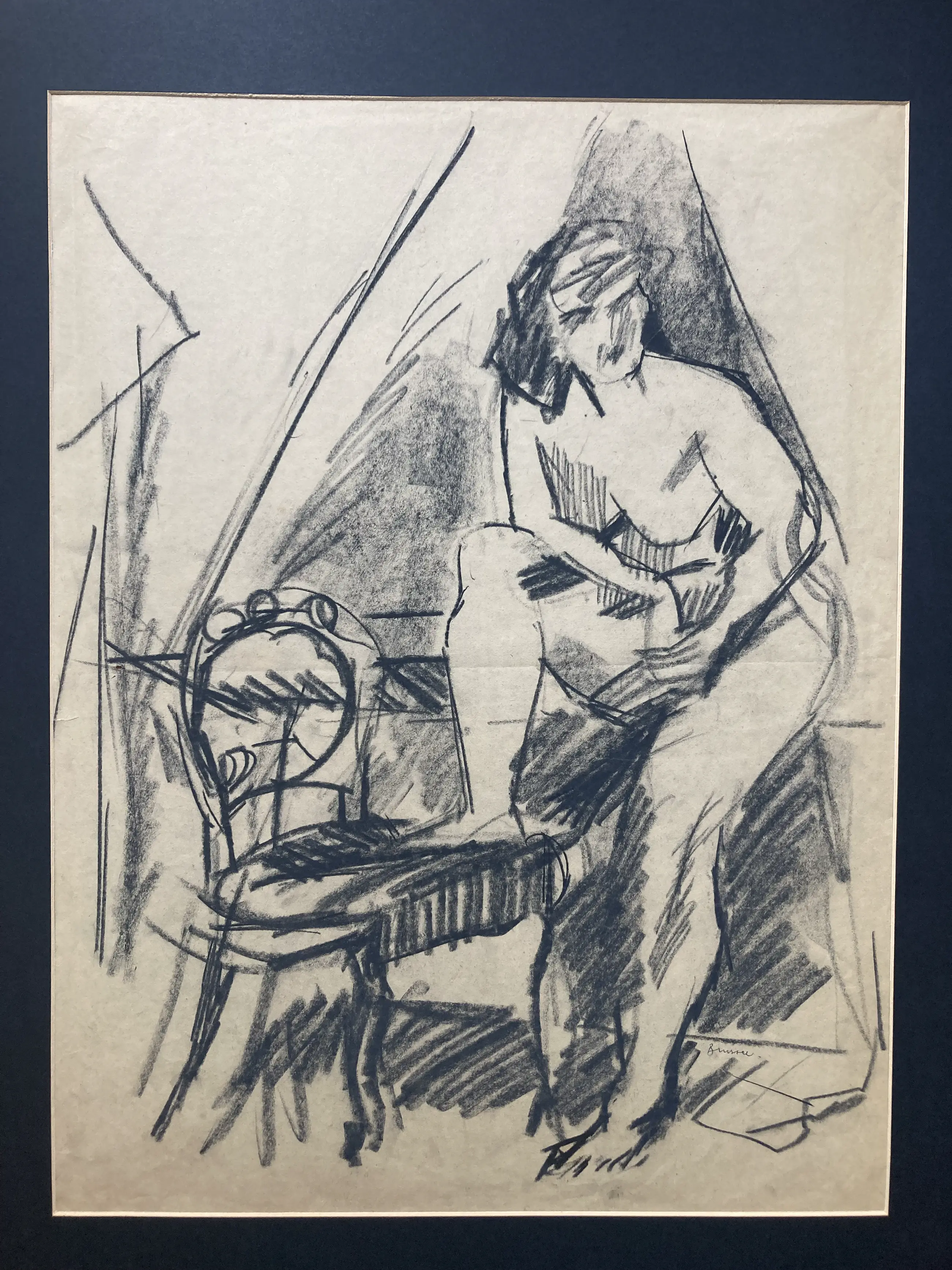 Fraaie grote tekening op dun papier, gesigneerd met pen. Vroeg werk van Brussee uit 1958, afkomstig uit een map met studietekeningen. Papier is licht verkleurd, enkele vouwen, en is aan de randen wat rafelig. Valt weg bij inlijsten zie laatste foto. Geen passepartout.