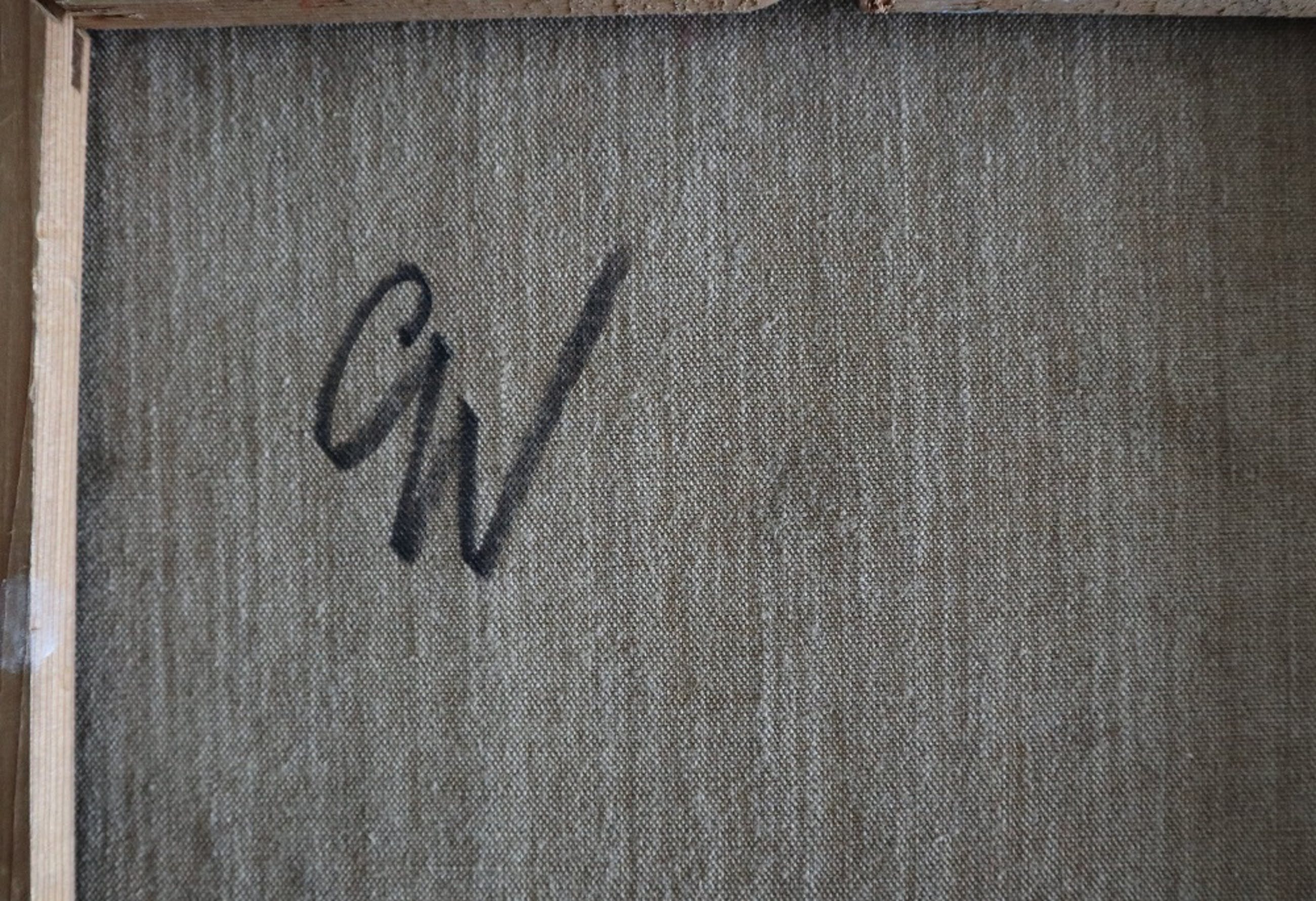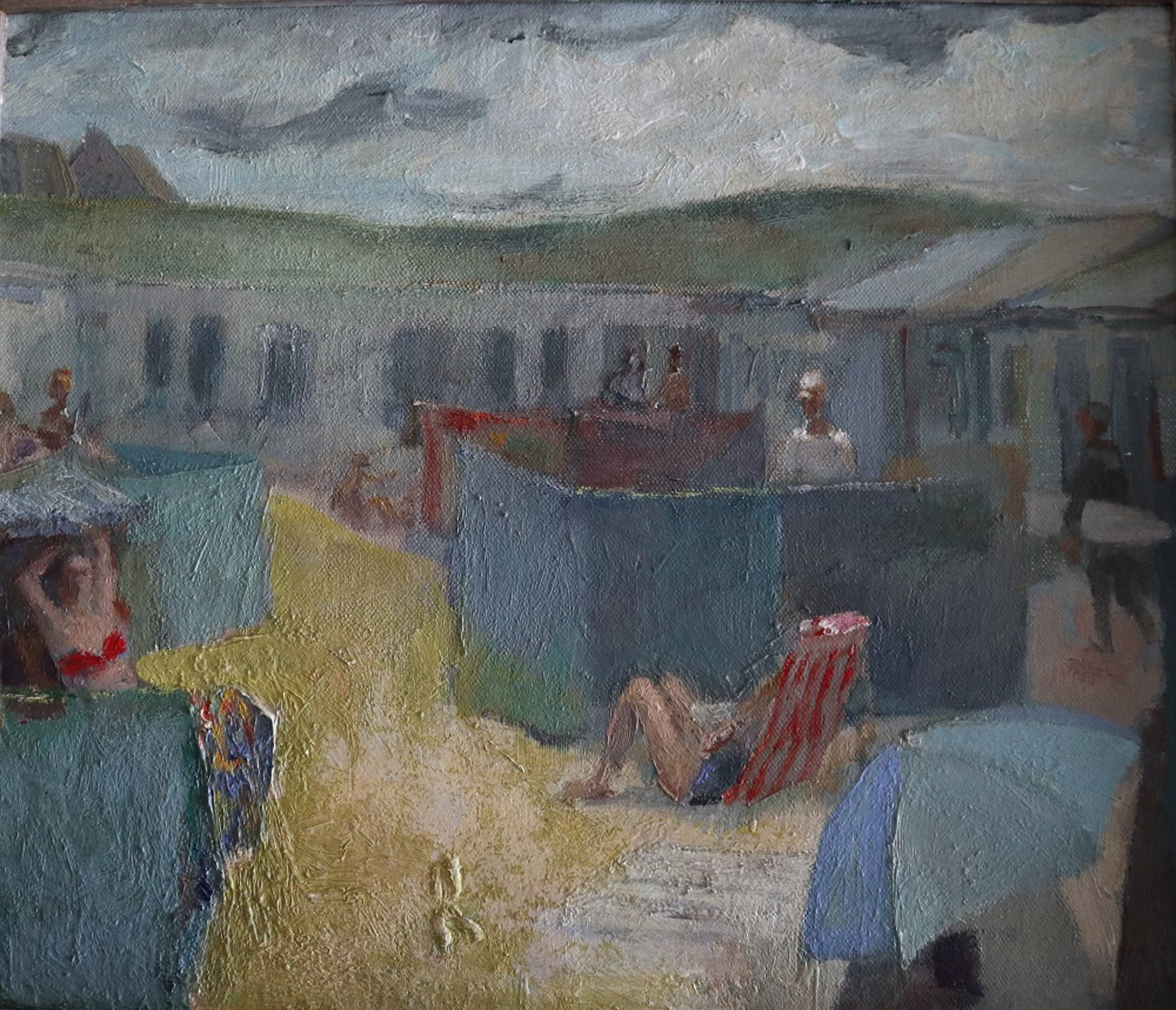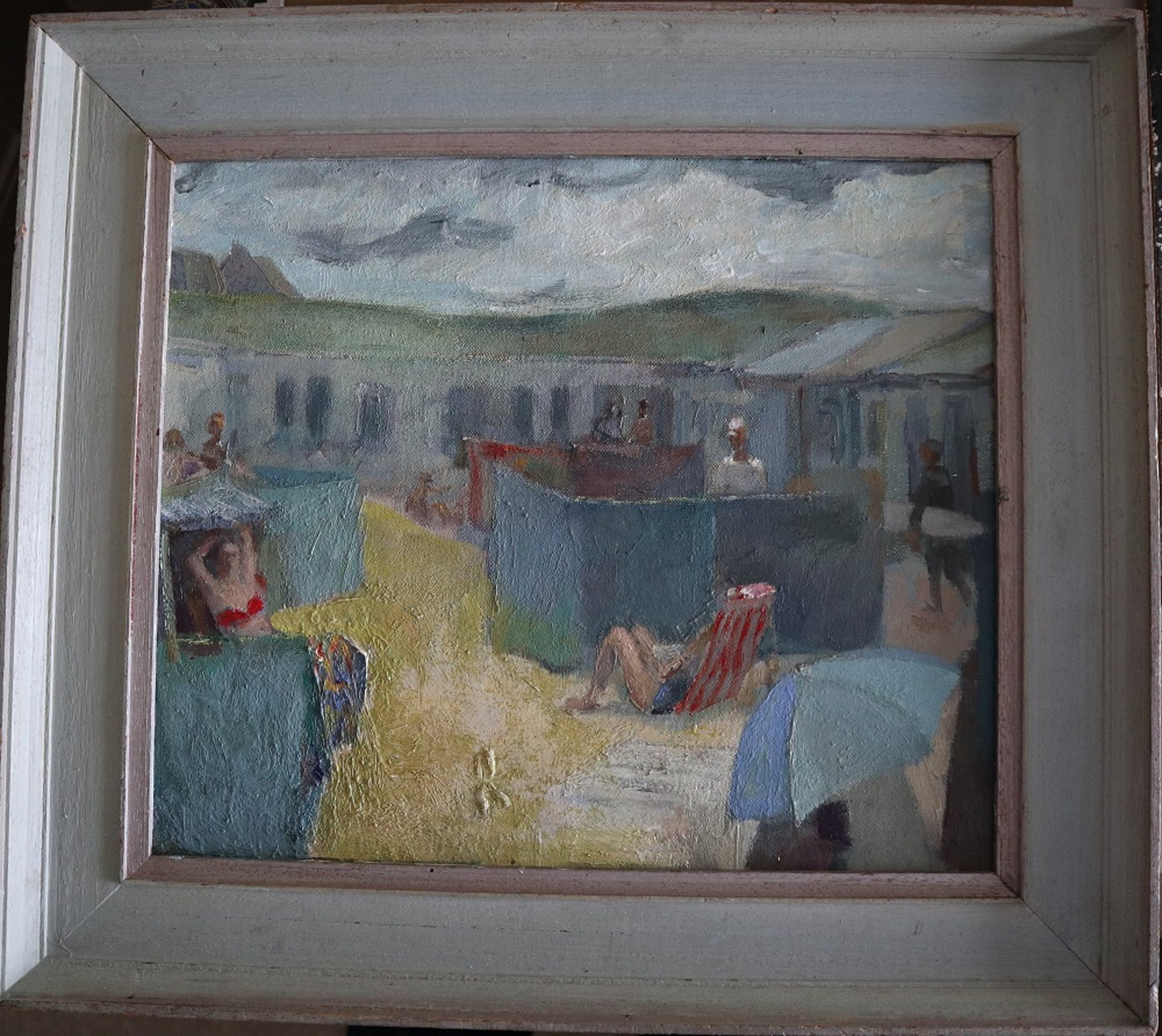 Een zomers schilderij met zonnebadende mensen en windschermen tegen een al te harde wind. Gevat in originele lijst, aan de achterzijde het monogram van de schilder waarmee hij zijn hele oeuvre heeft gesigneerd.