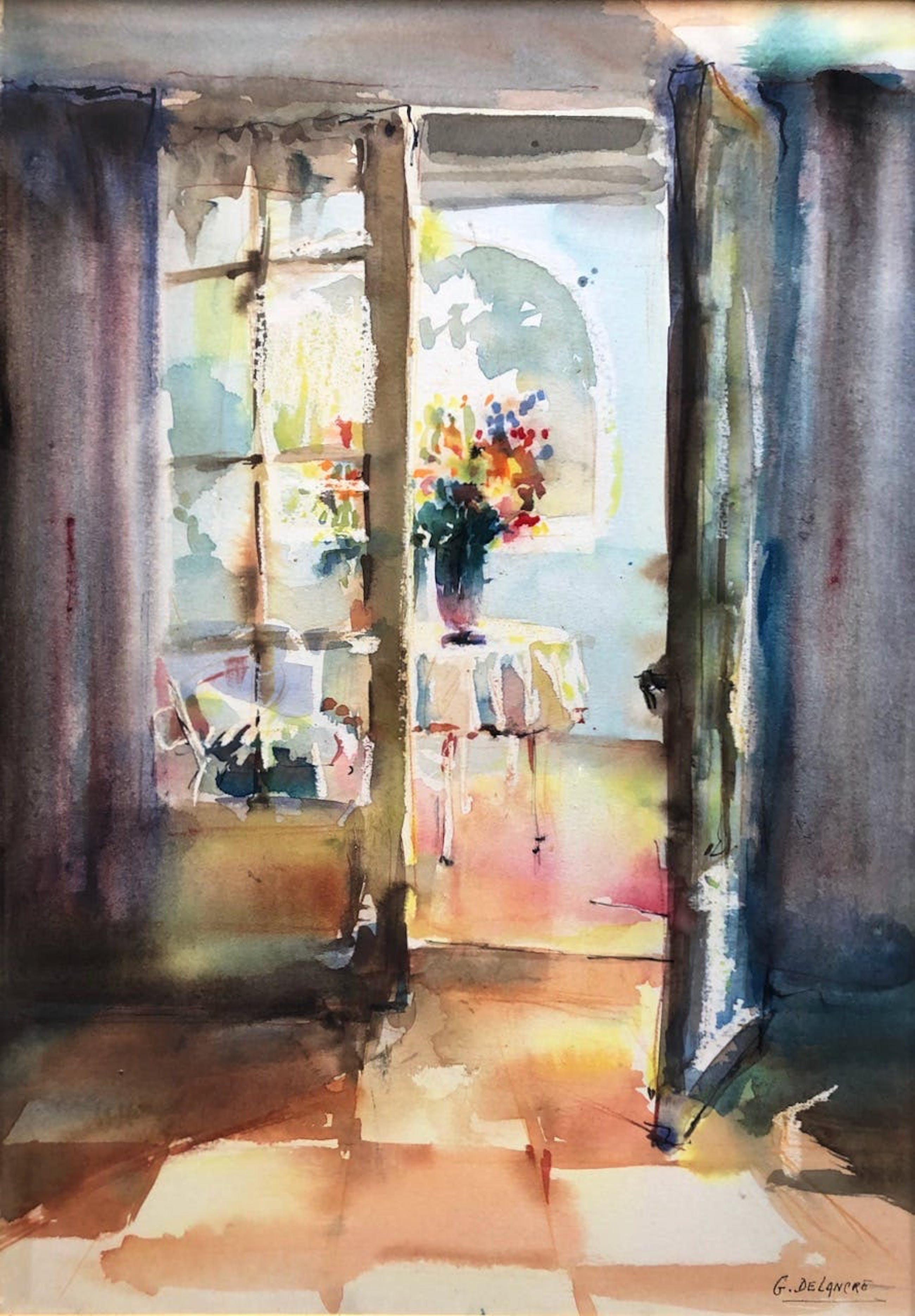 De aquareltechniek is voor hem het meest ver- trouwde medium en het werk oogt tijdloos in zijn opzet. Voorzien van en mooie passe partout en stevige lijst. Gezien de grootte is een verzen- ding met glasplaat wat risicovol. Ik overleg dat graag met de koper.