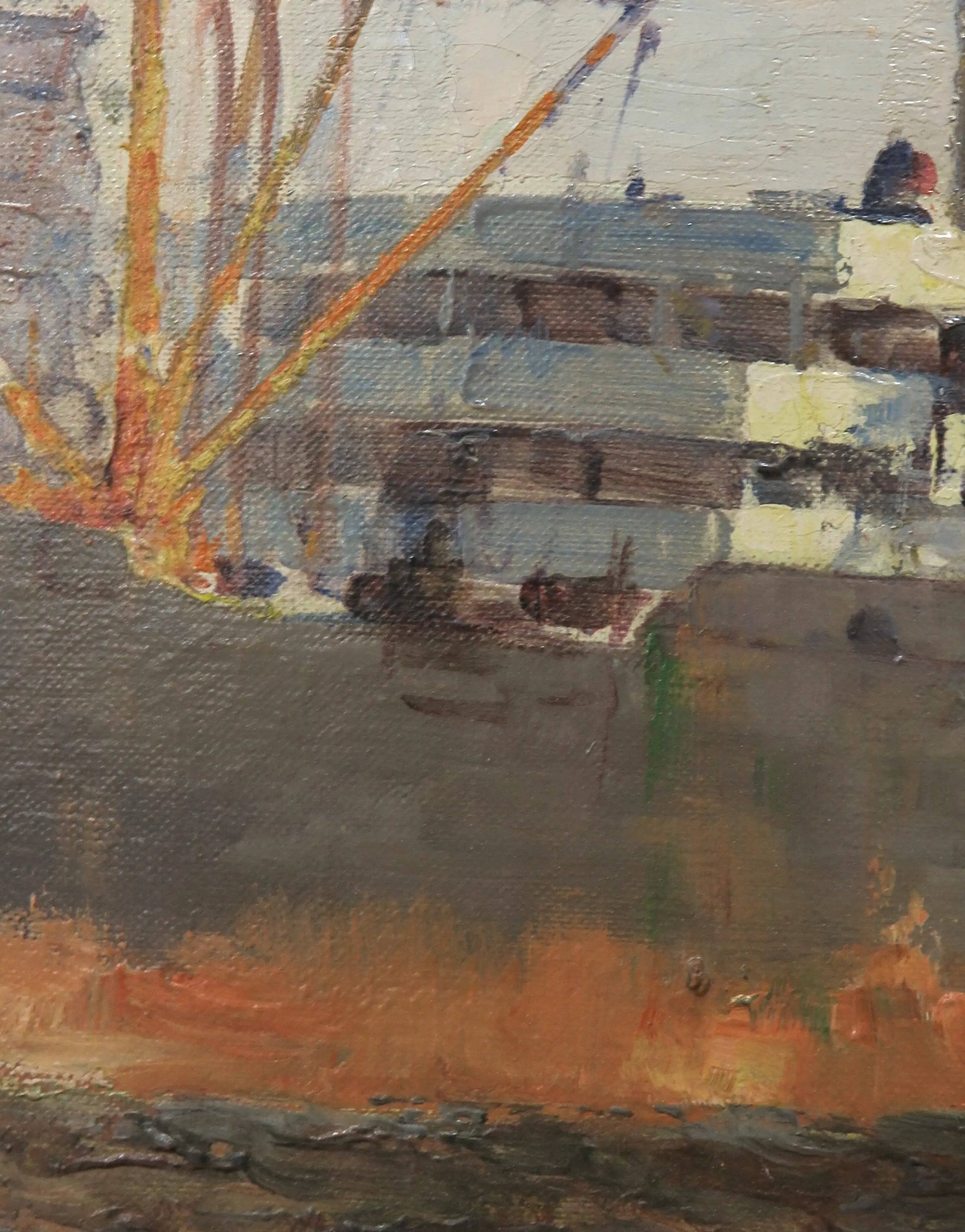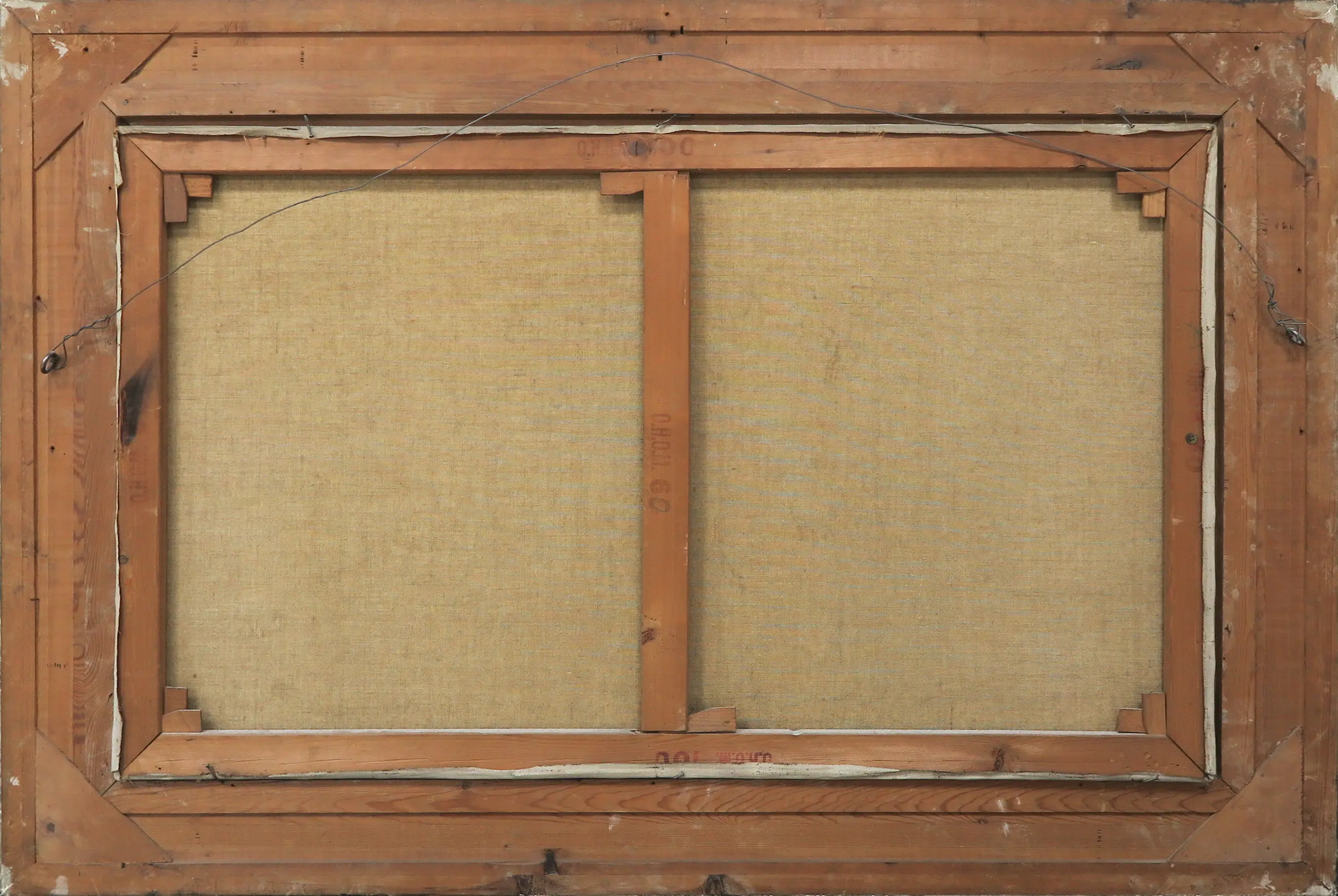 | Goede conditie. Wat craquelé (zonder verfverlies) en hier en daar wat vuilaanslag en vergeelde vernis. Langs de randen en verticaal door het middag wat spieraam doorslag (zichtbaar met strijklicht). Links langs de rand een miniem gaatje boven het spieraam. Het werk is beoordeeld in de lijst. | |