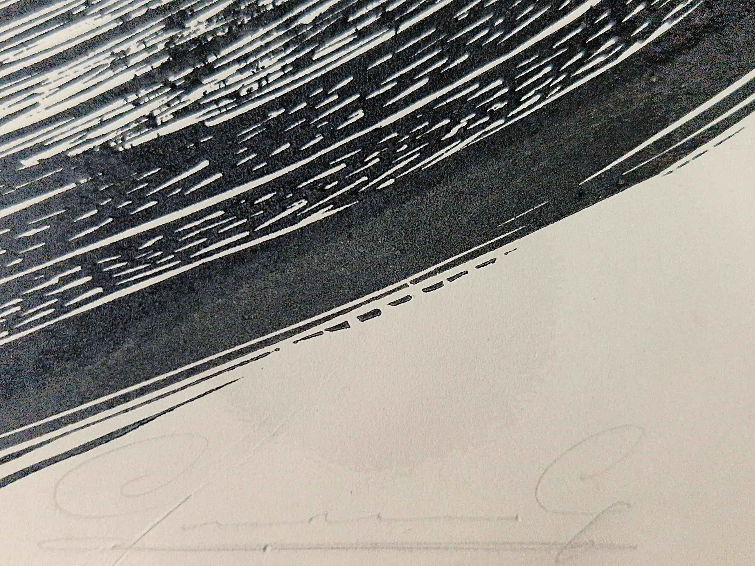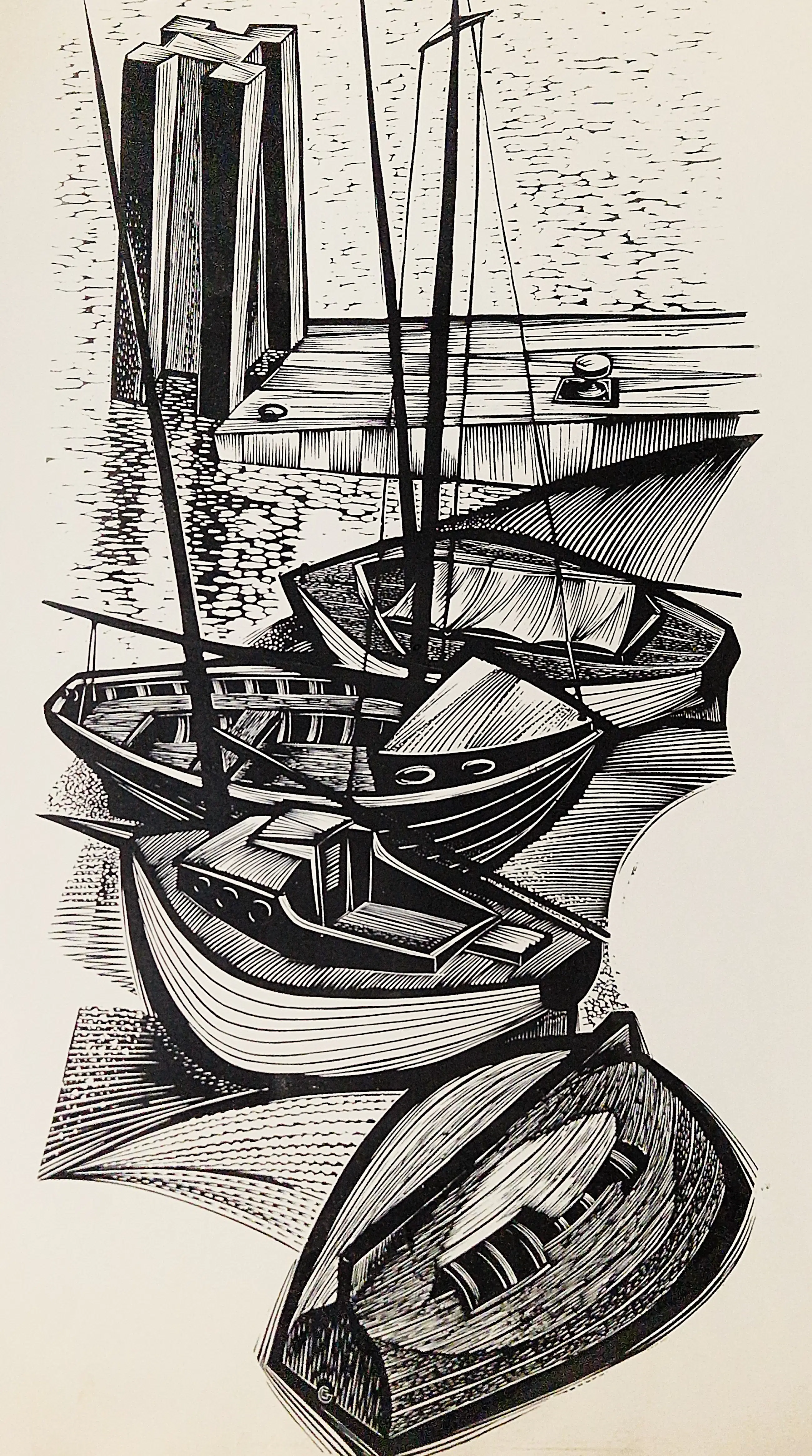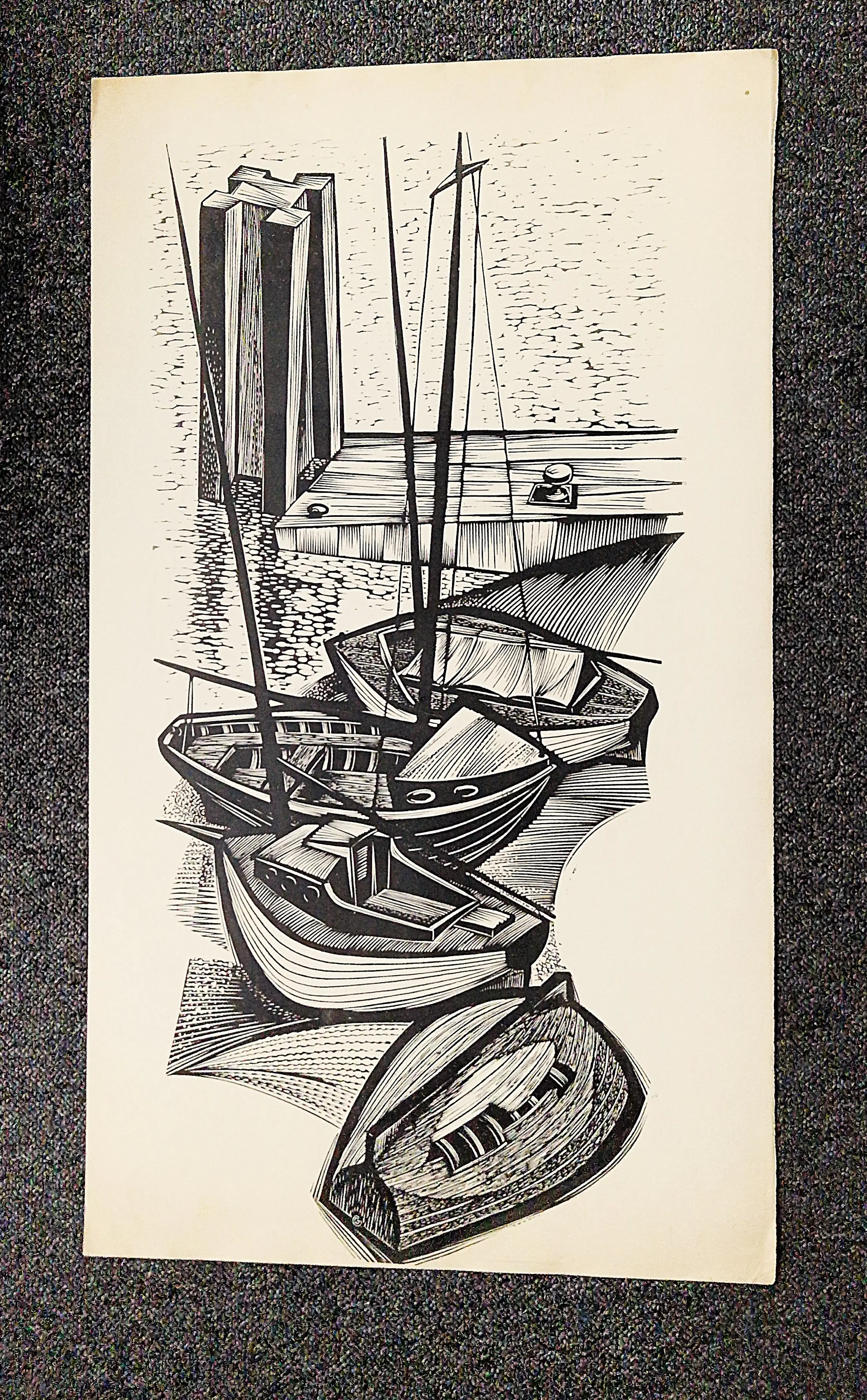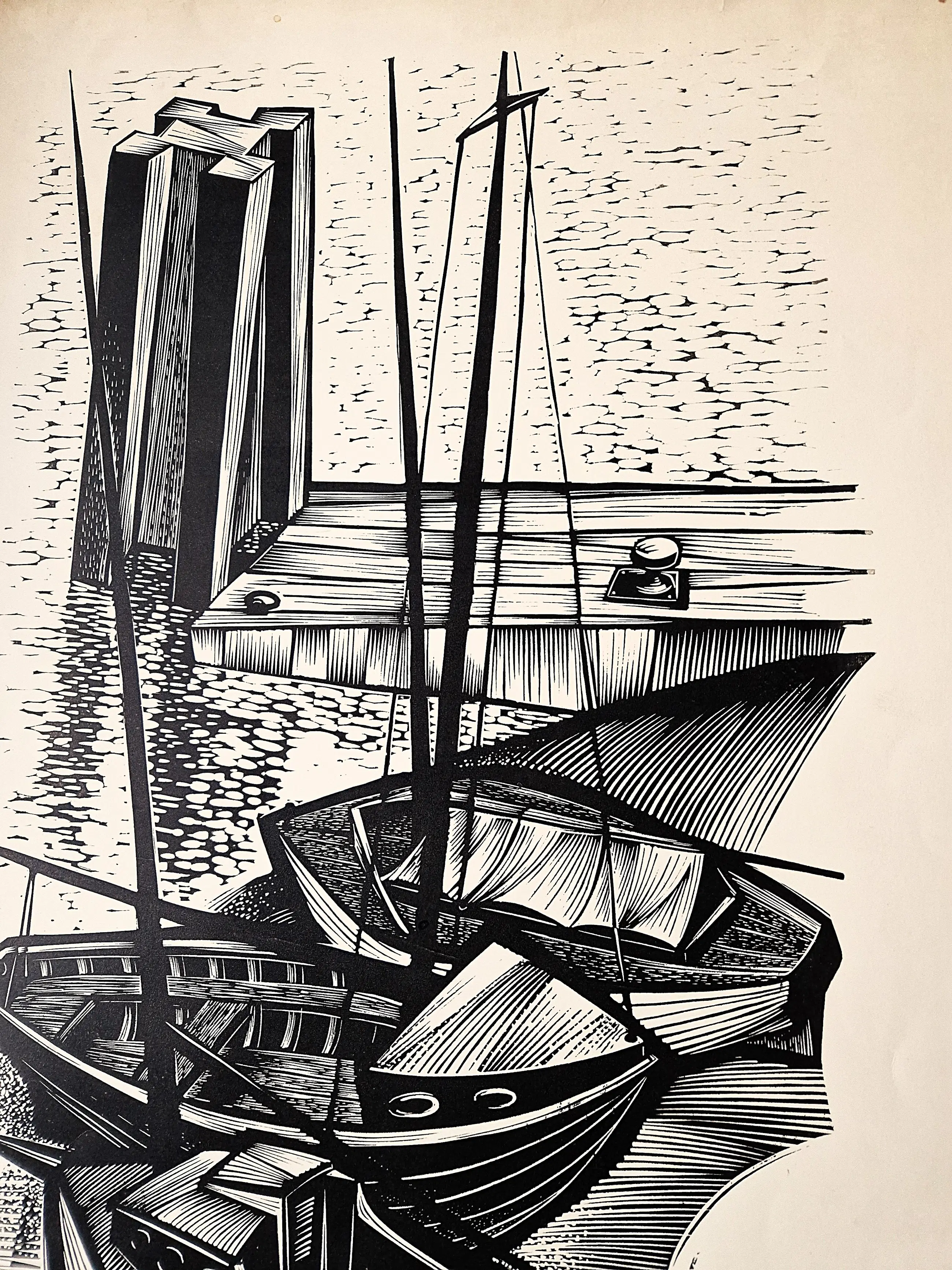 Gerard Gaudaen - grote in 1959 gemaakte Hout/Linosnede - haven met bootjes - potloodgesigneerd
