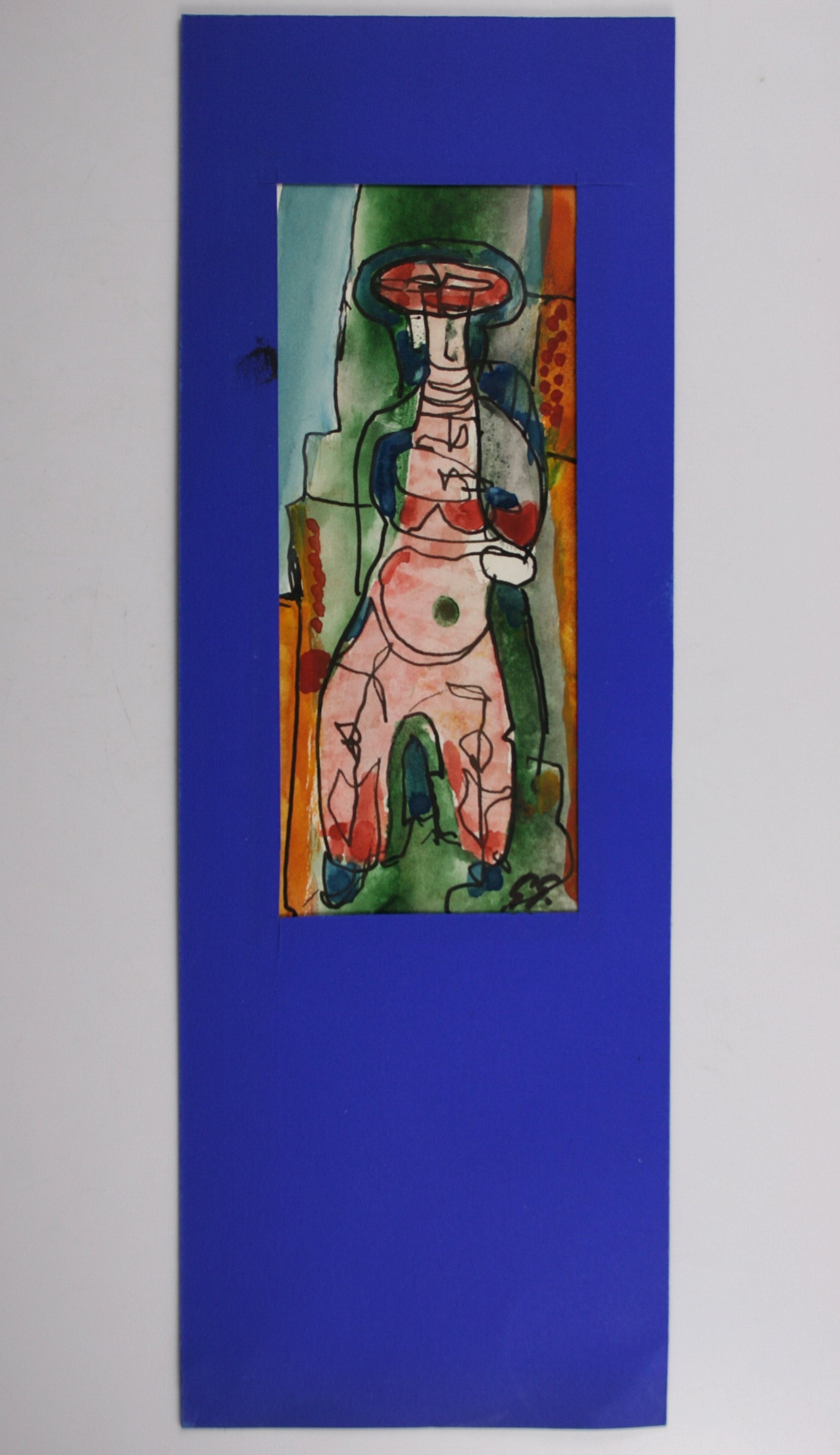 Schilderijtje (gouache, inkt) met abstract figuur.