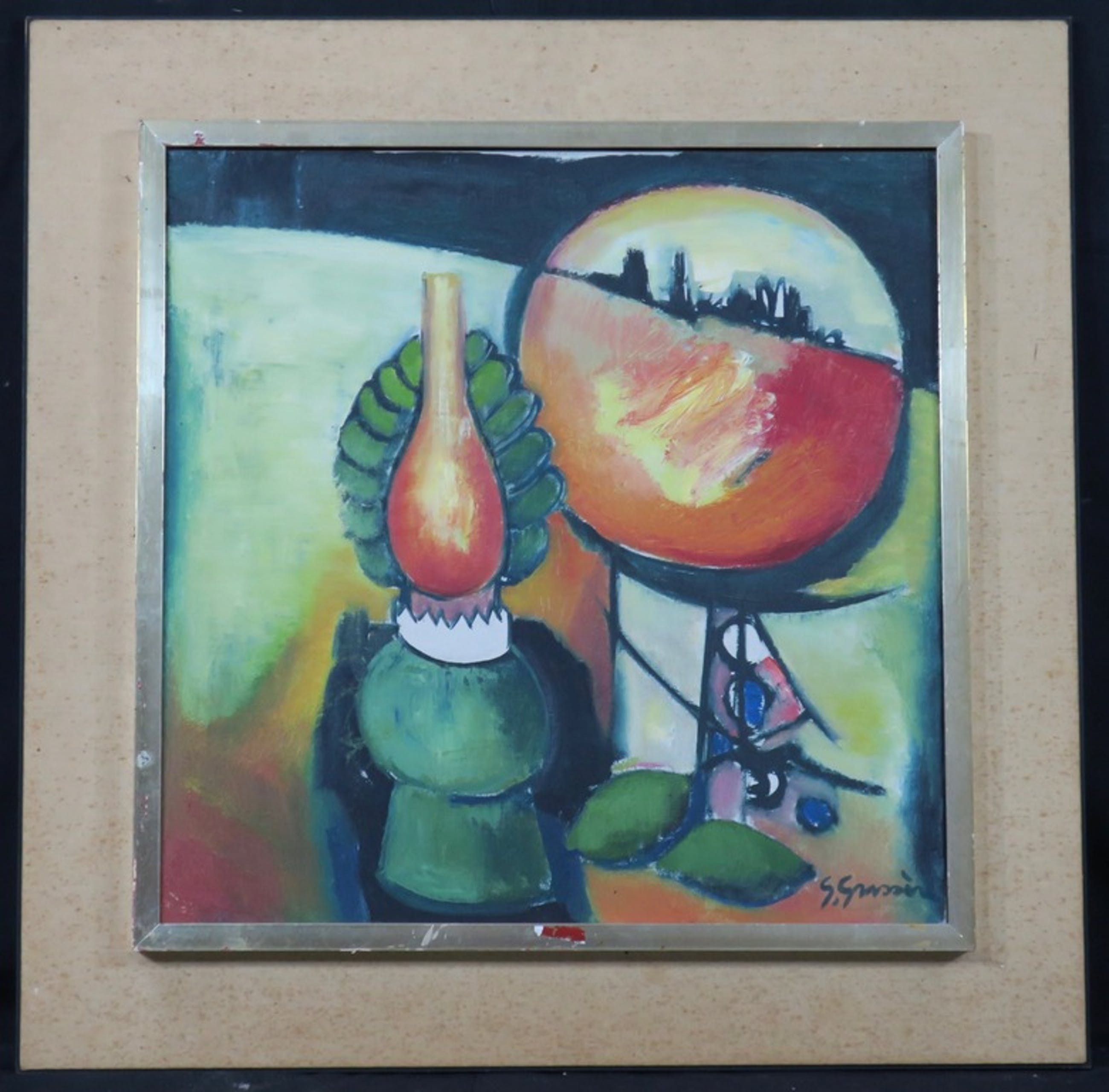 Kleine beschadigingen aan lijsten worden niet beschreven! Bij ingelijste werken achter glas vermelden wij altijd glasschade. Passe-partouts worden op geen enkele manier gegarandeerd en ook niet altijd meegezonden. Alleen als een werk niet uit het passe-partout te halen is, zal dit vermeld worden.