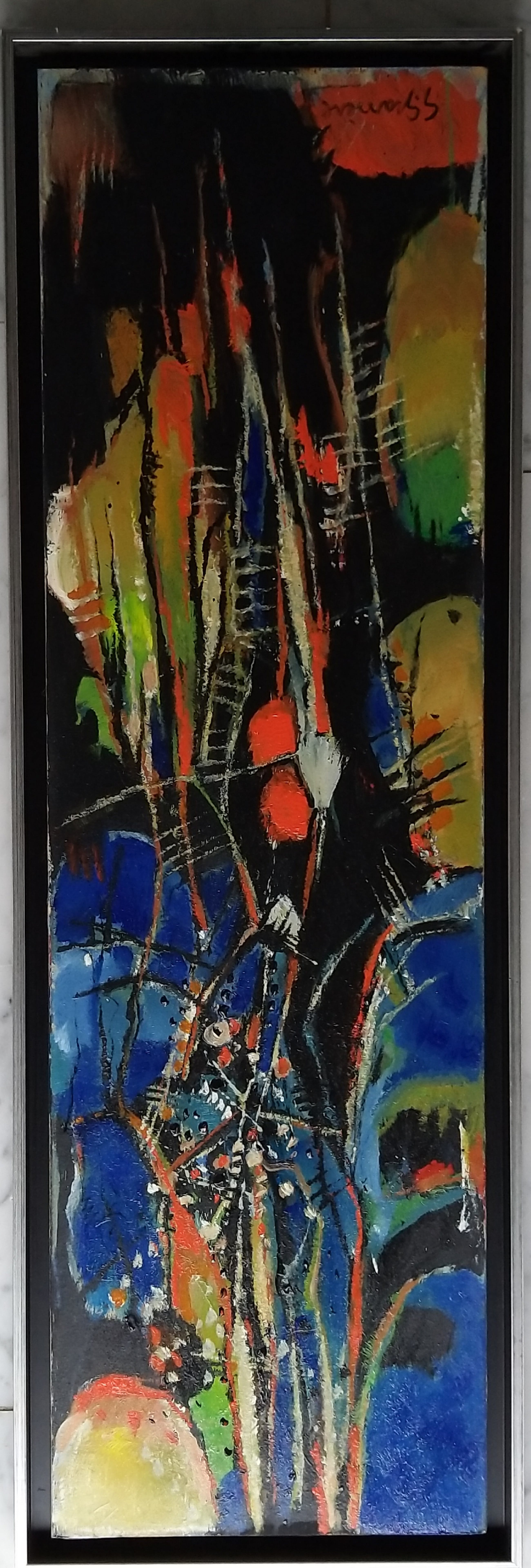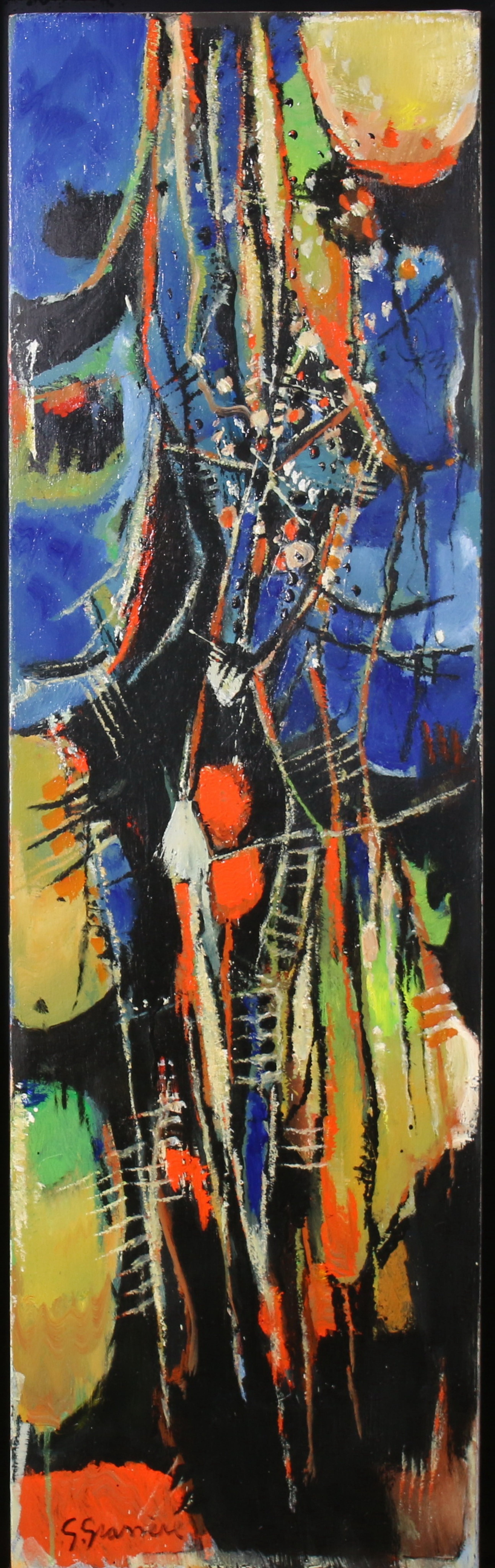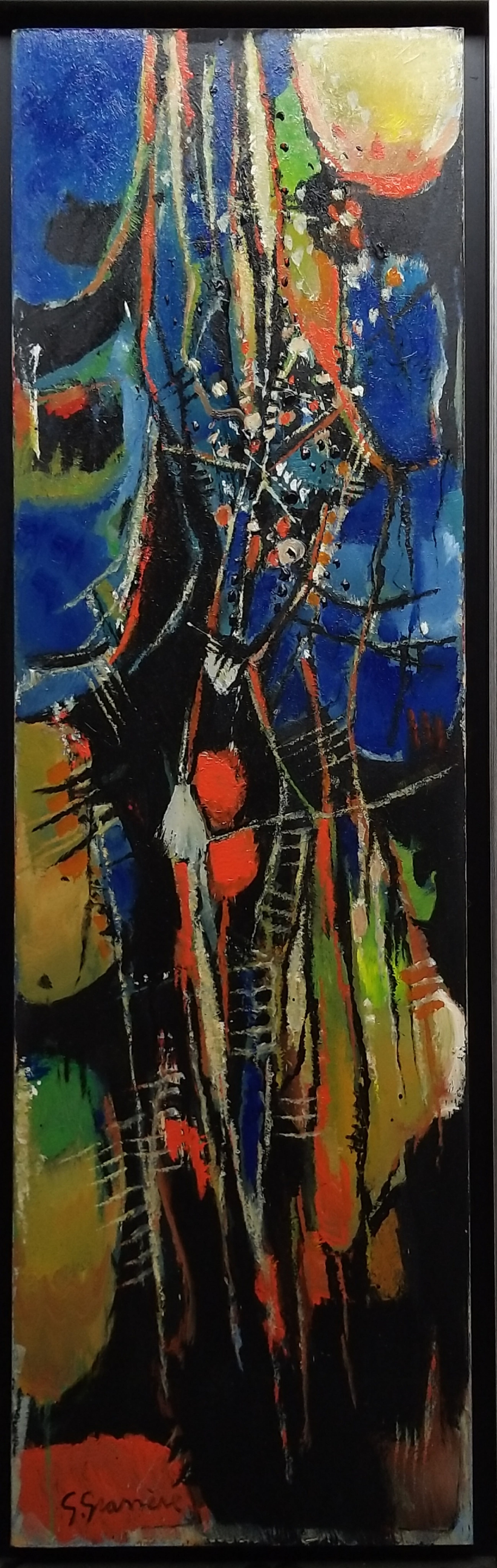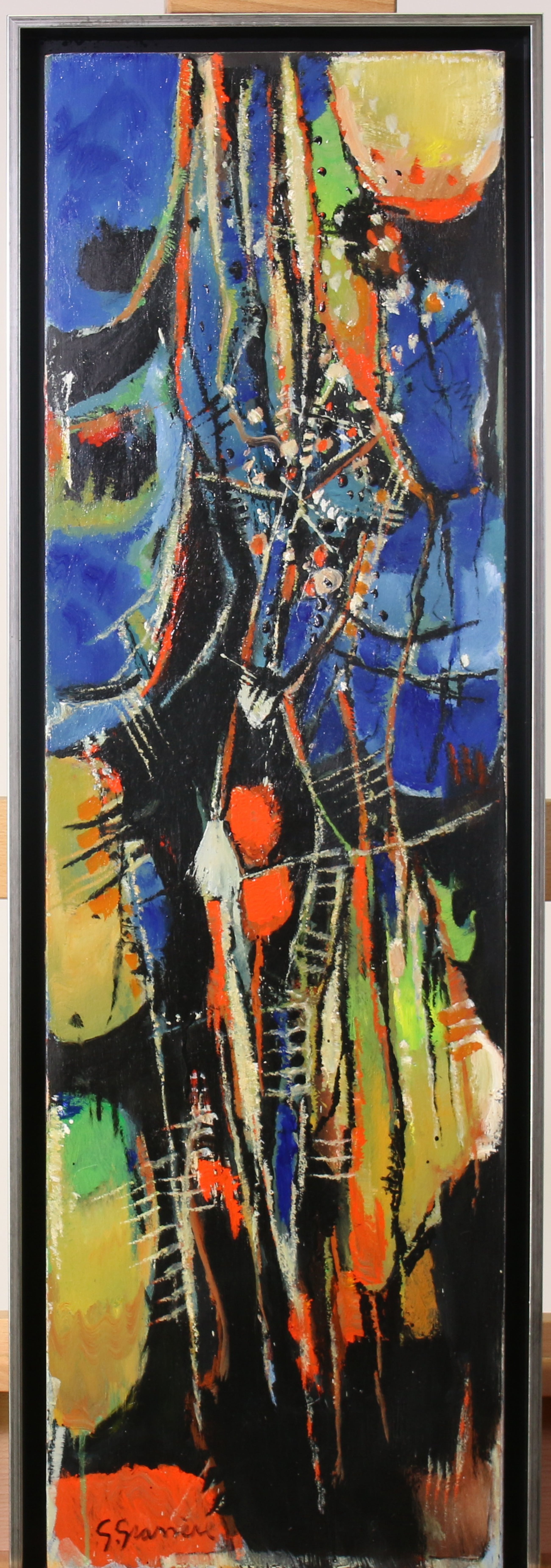 Prachtig abstract werk van Gerard Grassère.Links onder gesigneerdIn bijpassende baklijstOlieverf op paneel Gerard Grassère(Heerlen 1915-'s-Hertogenbosch 1993)was een nederlands kunstschilder.Hij voltooide zijn artistieke opleiding aan de Academie voor Schone Kunsten in Antwerpen.Later studeerde hij nog een tijd in Parijs. Meer info op Wikipedia. Achterzijde op het paneel bevat minuscule gaatjes die verder niet storend zijn.