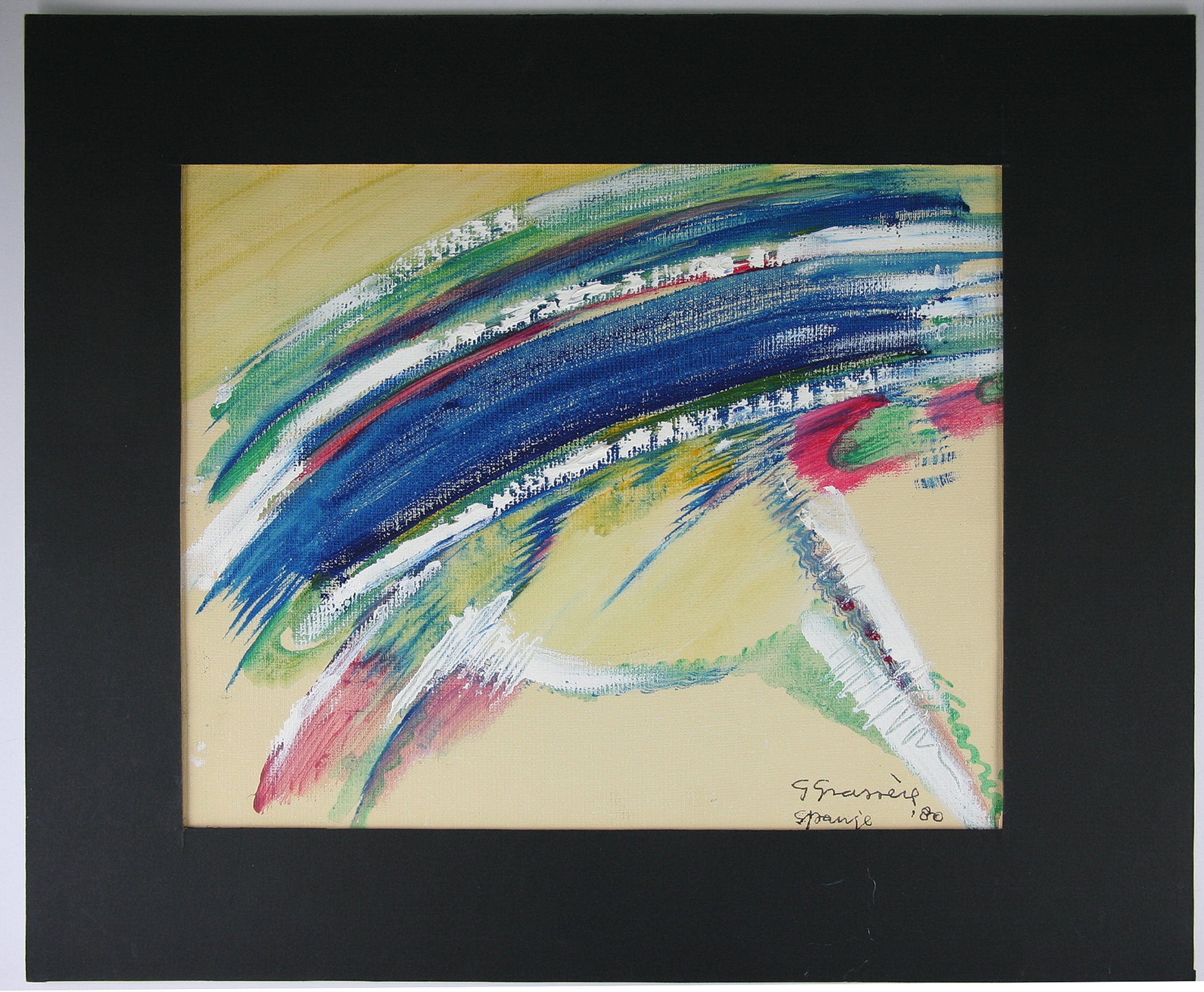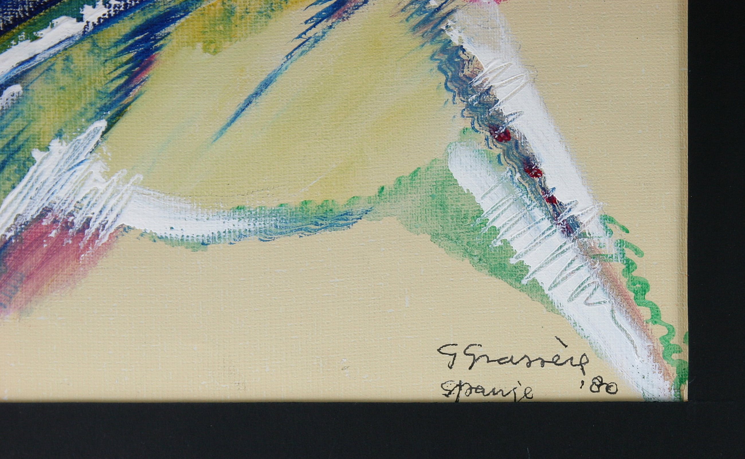 2x gesigneerd: 1x in verf en 1x in inkt met toevoeging "Spanje '80." Beiden linksonder zichtbaar. Kunstwerk wordt zonder passe-partout verzonden om portokosten te besparen. Indien (afgebeeld) passe-partout toch gewenst is, zal het kunstwerk als pakketpost verzonden worden.