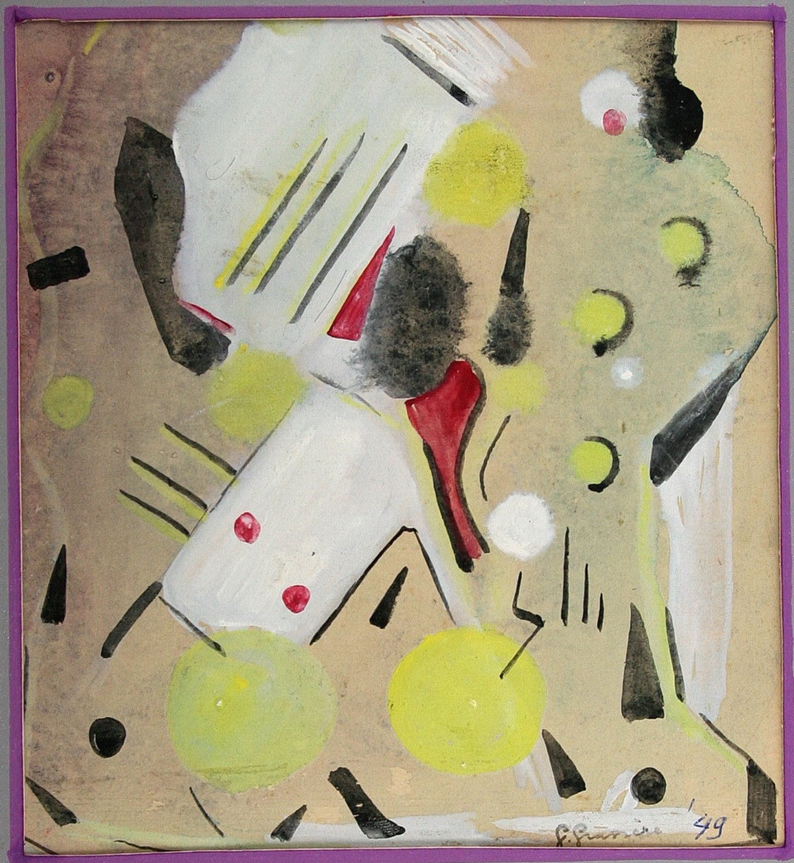 Vroege abstracte gouache (1949) van de Nederlandse kunstenaar Gérard Grassère (1915-1993). Handgesigneerd rechtsonder: "G. Grassère '49". Abstracte lijnen, vlakken en cirkels in de kleuren geel, rood, wit en zwart. Aanvang Cobra periode. Wordt aangetekend verzonden.