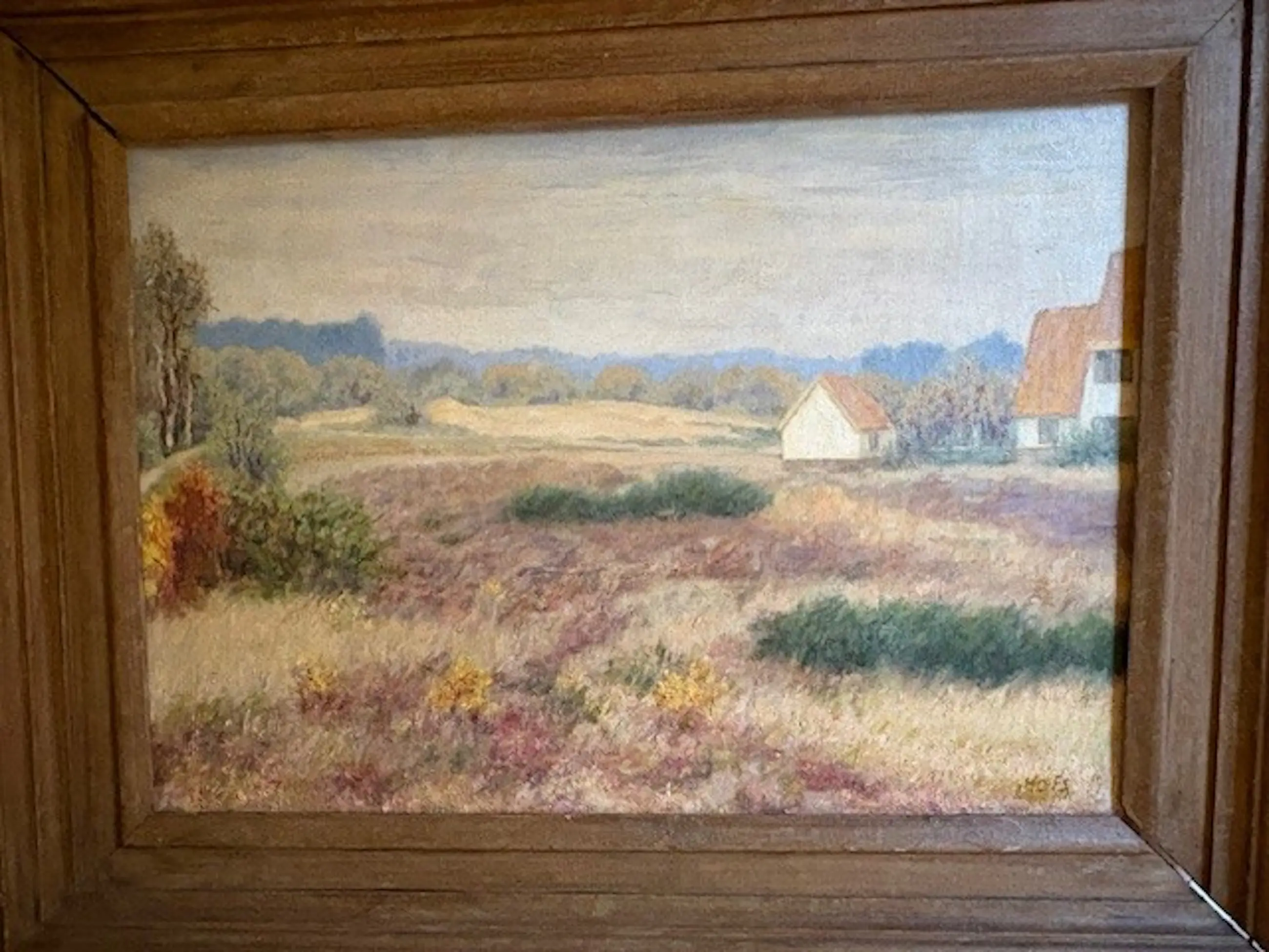 Afbeelding van een heideveld met aan de rechterzijde woningen