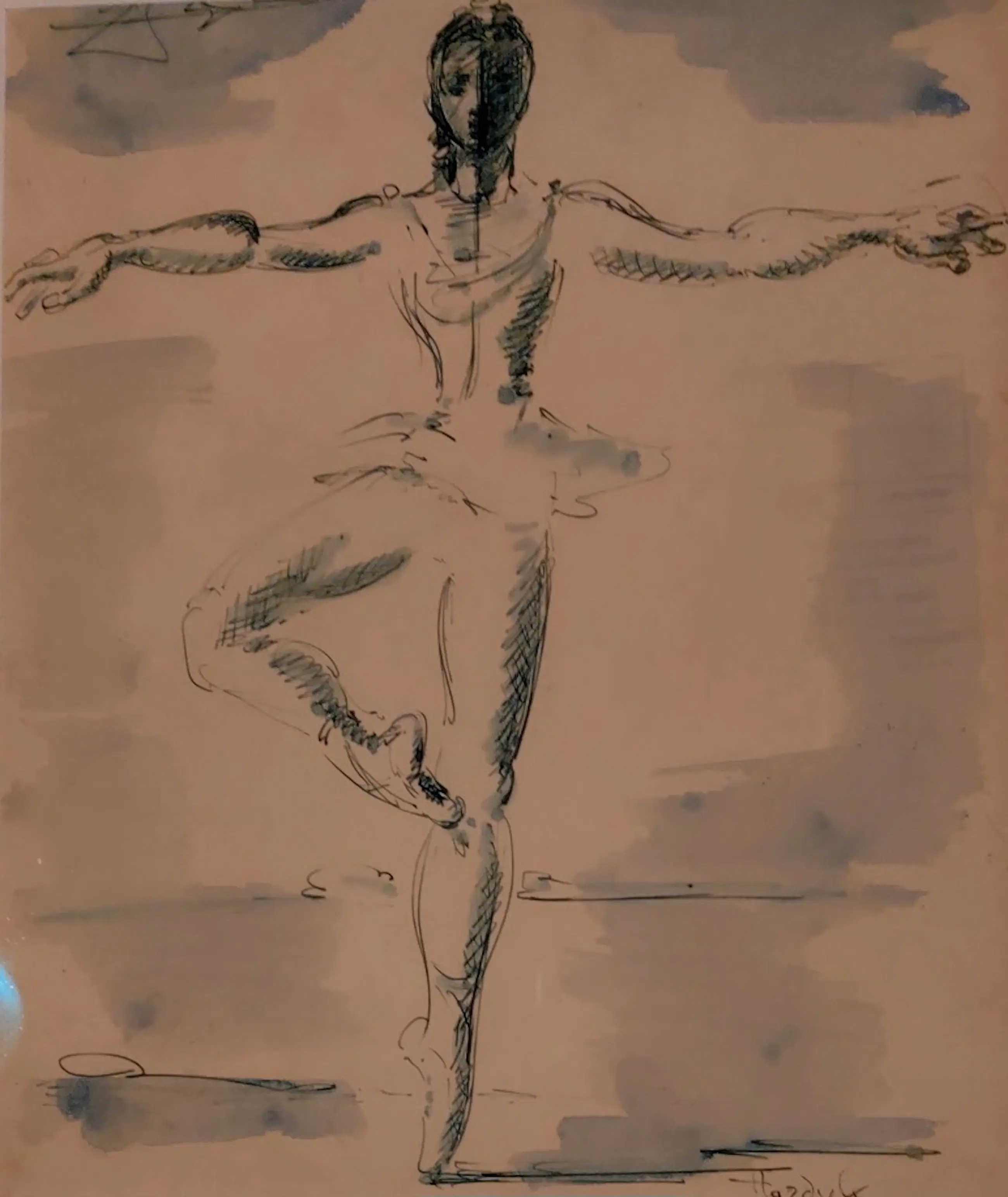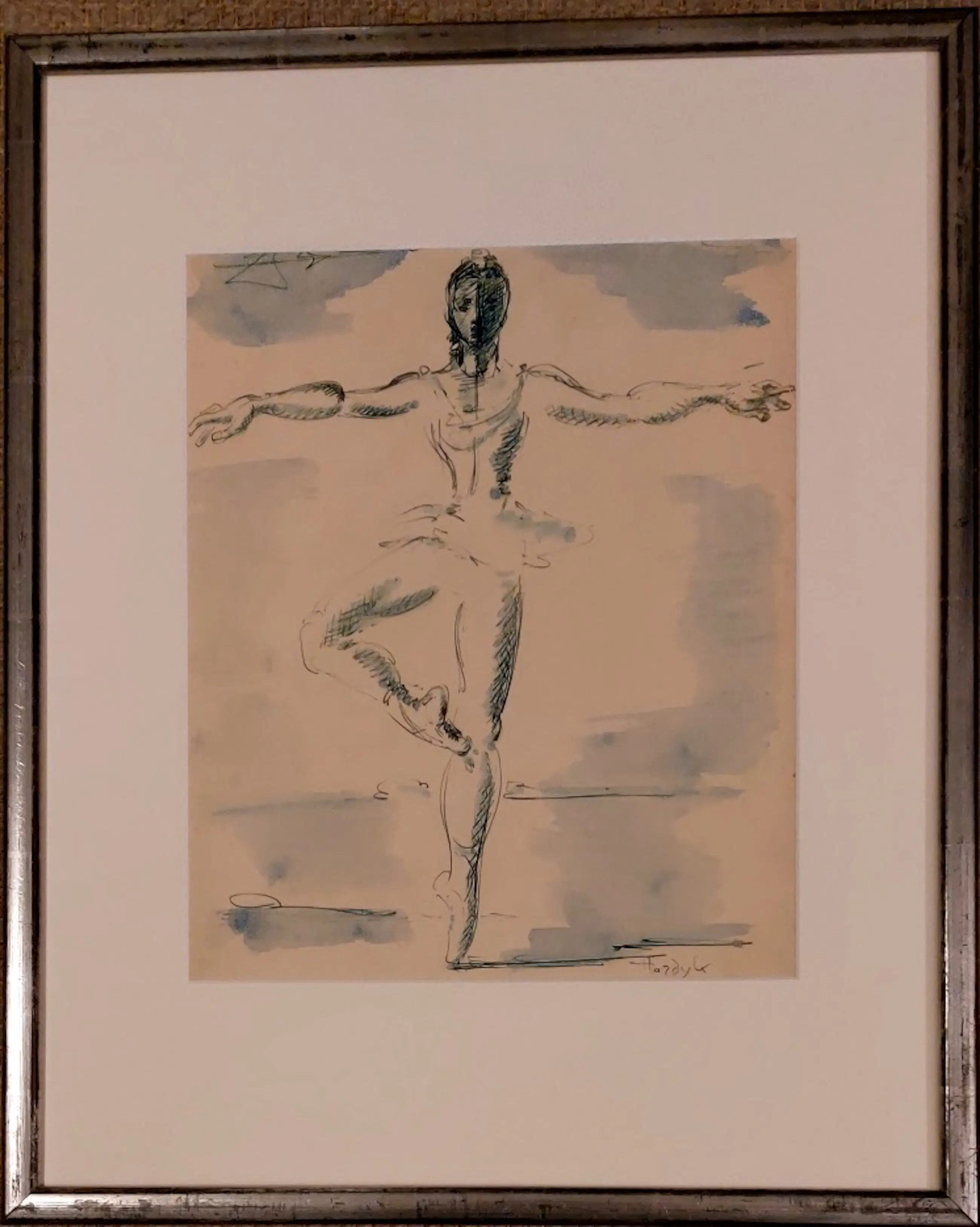 Klassieke ballethouding in aquarel, mooi ingelijst voorzien van zogenoemd art glass.