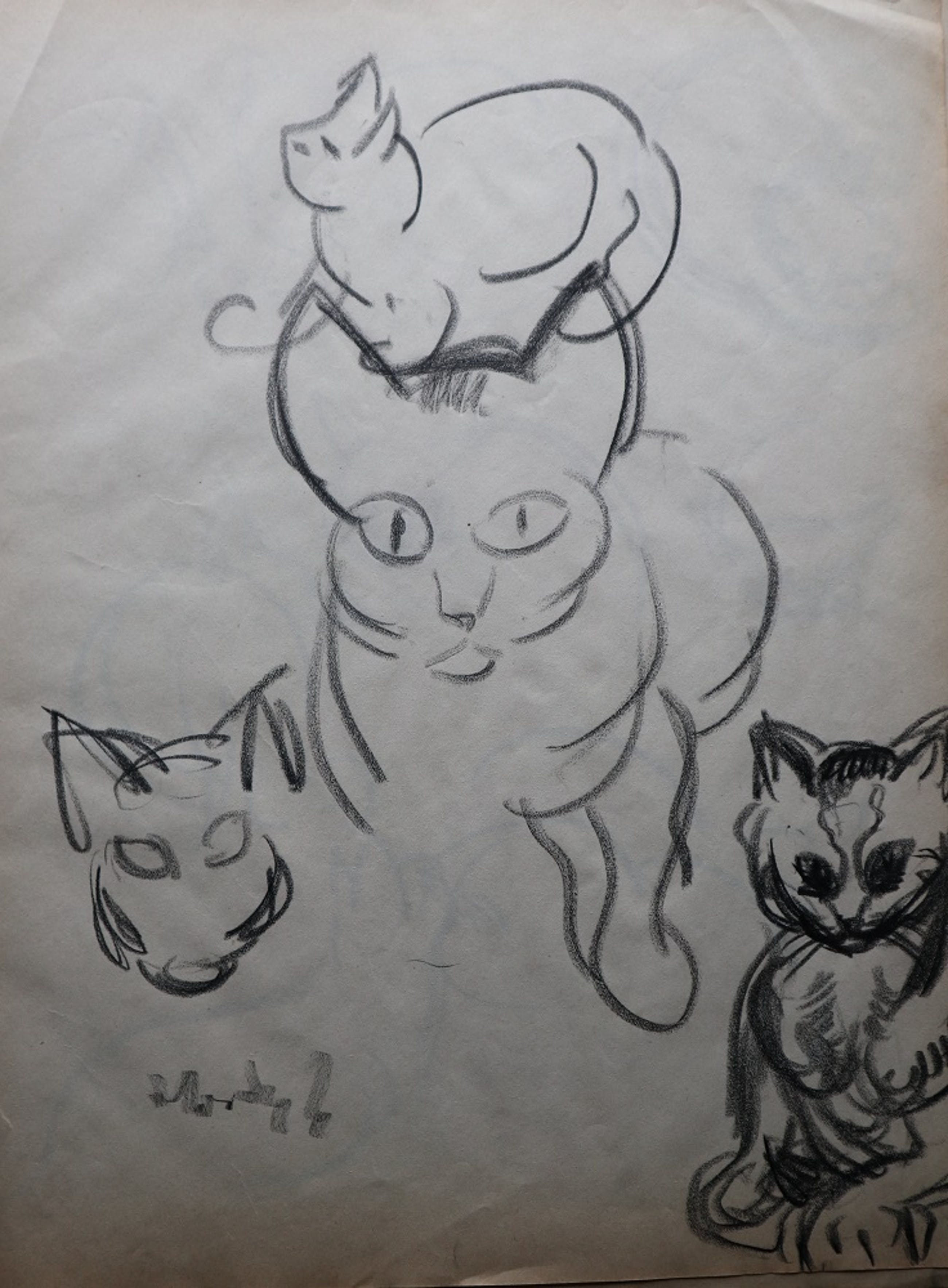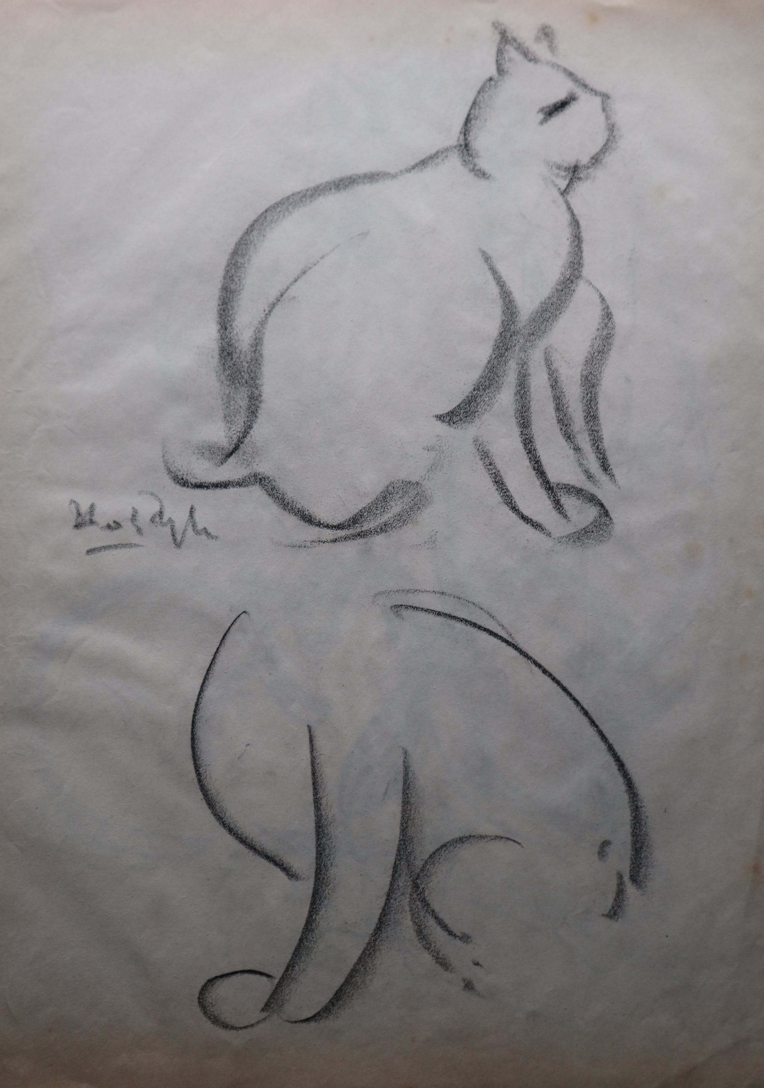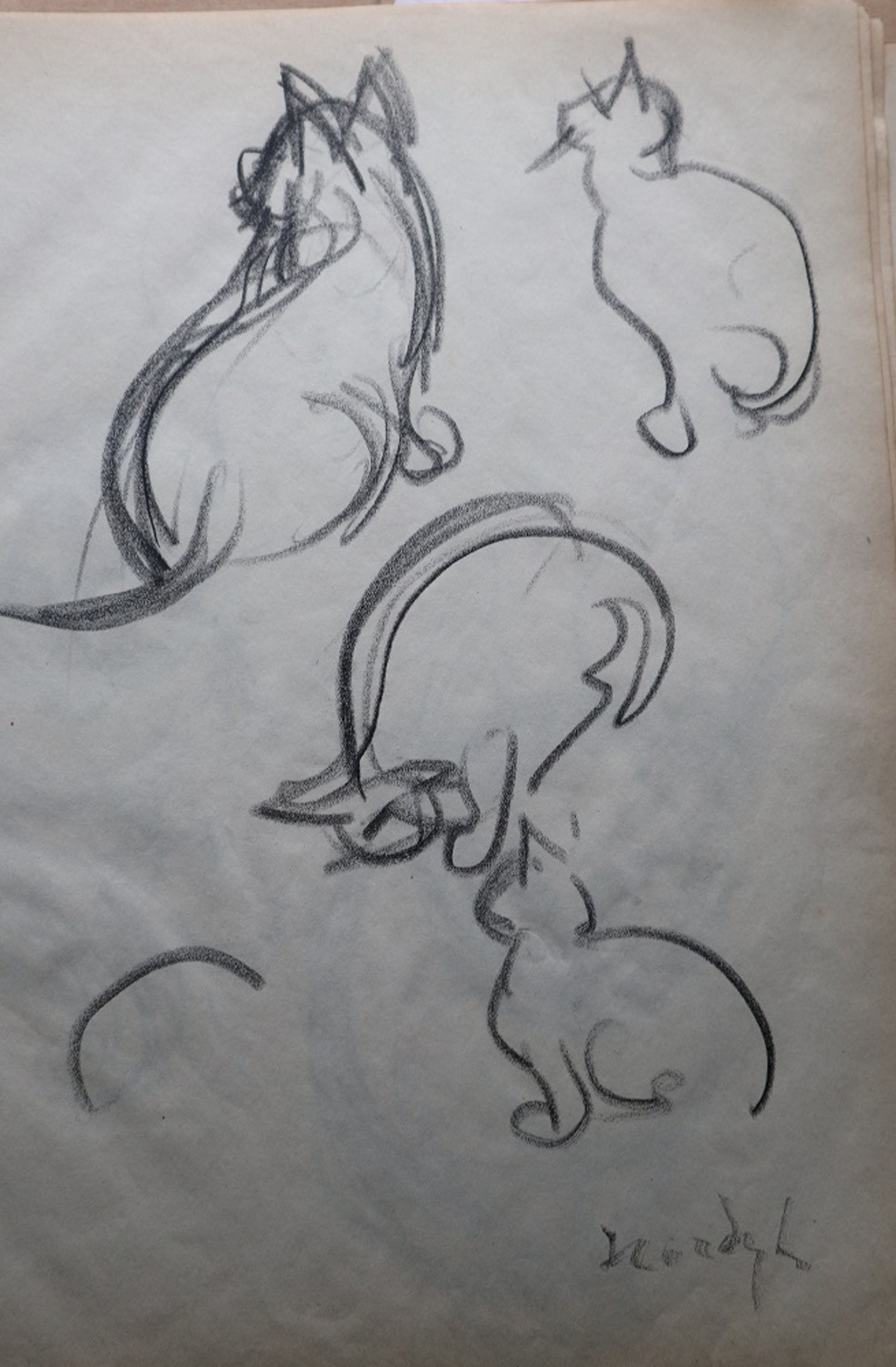 Hierbij bied ik aan een prachtig schetsboek van de Nederlandse schilder Gerard Hordijk 1899-1958. De bladen van het schetsboek hebben losgelaten van het kaft, maar zijn in redelijke conditie. Hordijk heeft dit geschilderd in ca. 1930 in zijn Parijse periode toen hij de onderbuurman van Piet Mondriaan was. Zie het aan de binnenzijde geschreven adres. Het zijn over de vijftig bladen ( ik heb ze niet geteld, misschien meer, misschien iets minder, het zijn er veel. Poezen studies en studies van mensen. Een bijzonder schetsboek! Sommige bladen zijn gesigneerd.