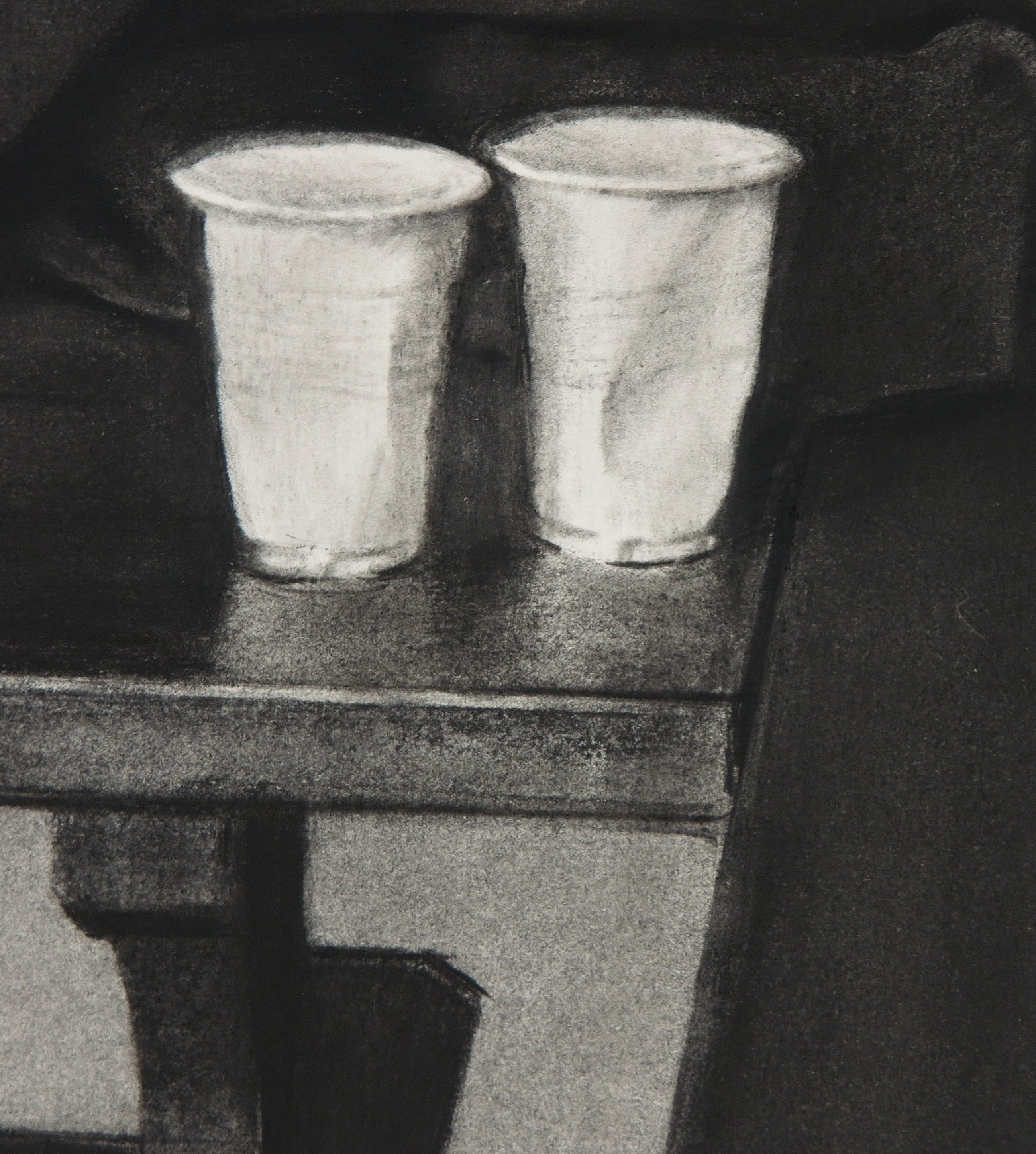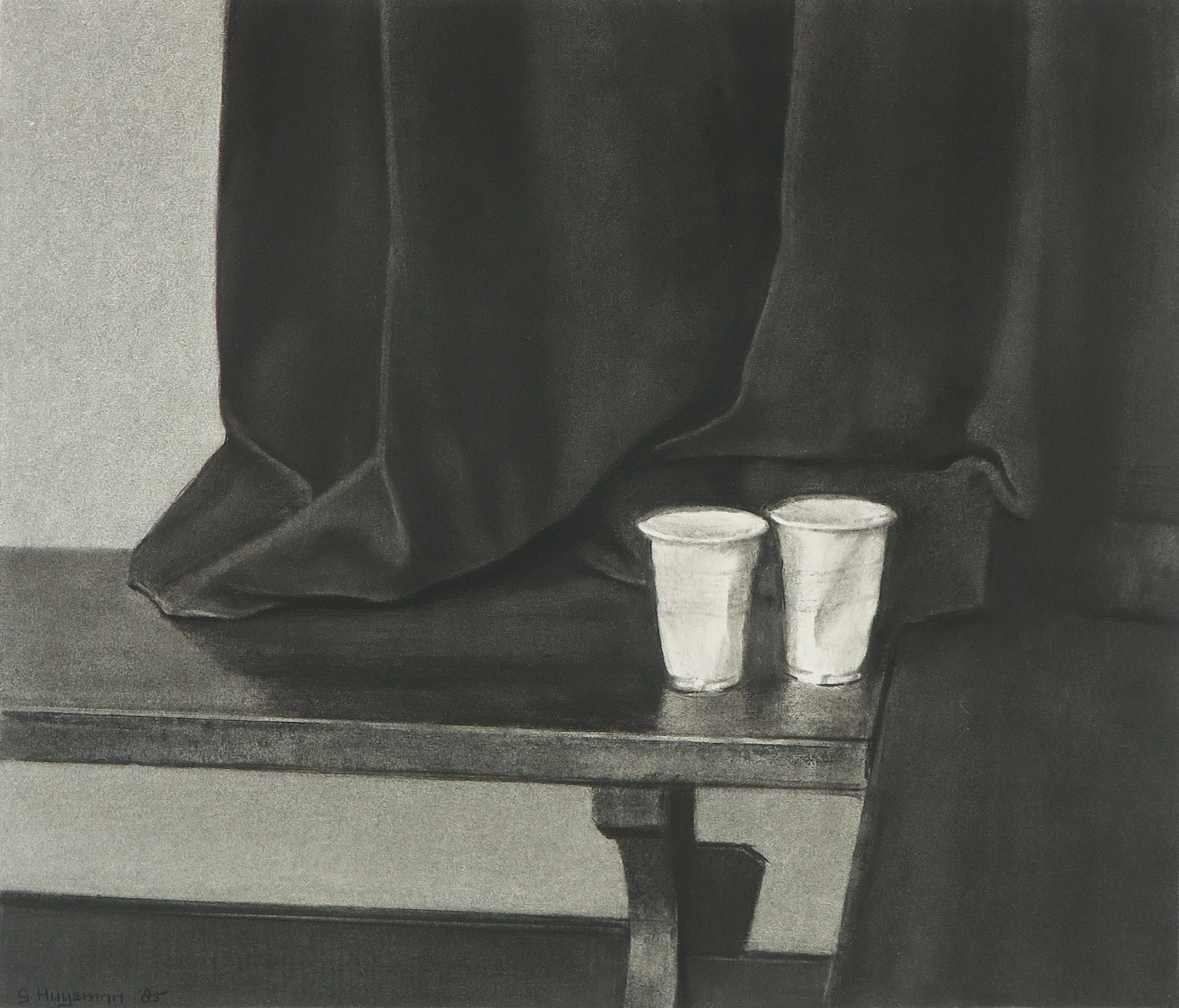 Mooie realistische pasteltekenen van twee bekers op een bankje voor een gordijnen. Huysman weet als geen ander stoffen duidelijk en realistisch over te brengen. Het gordijn oogt zwaar, de bekers weerspiegelen in het gelakte hout.