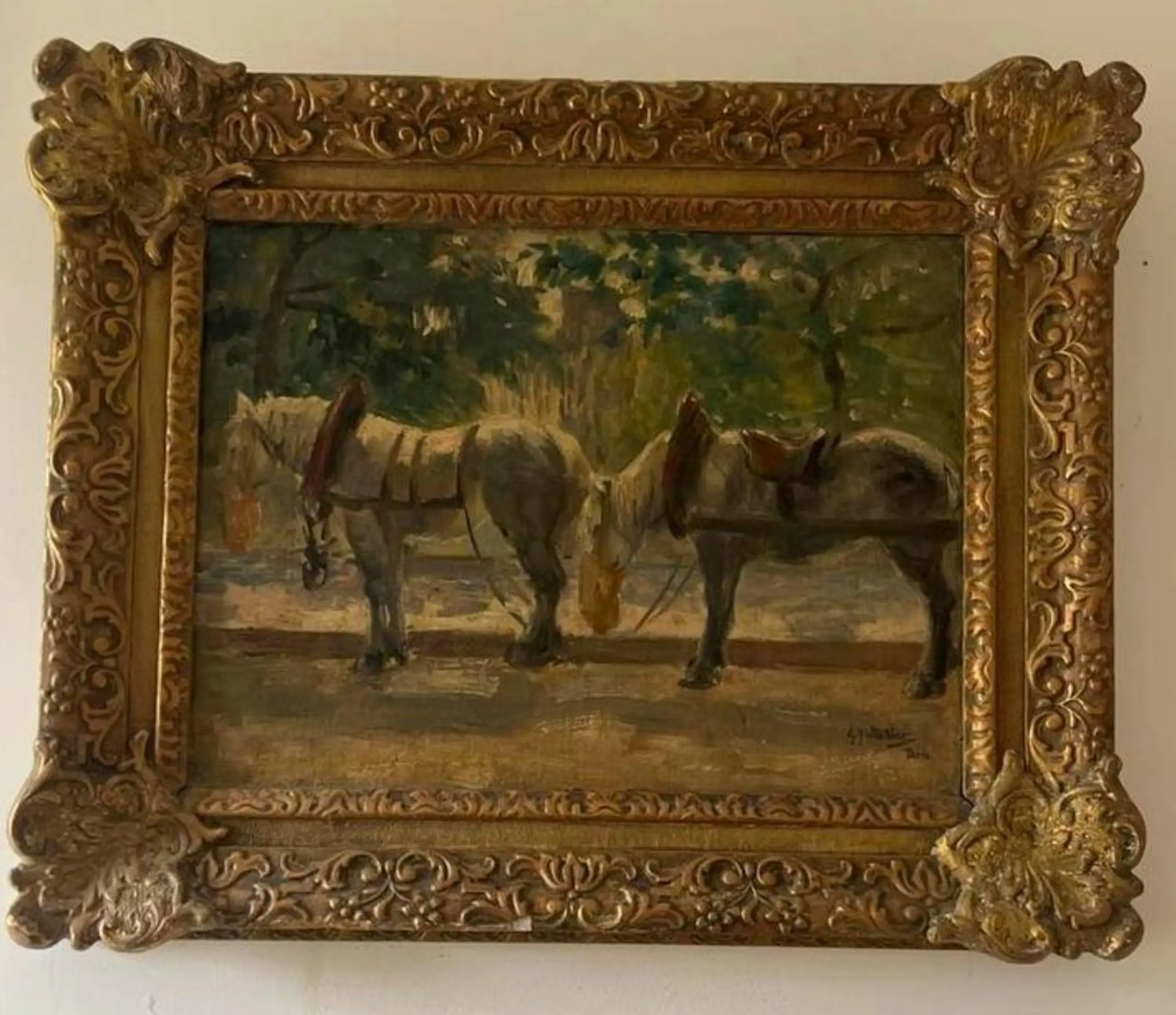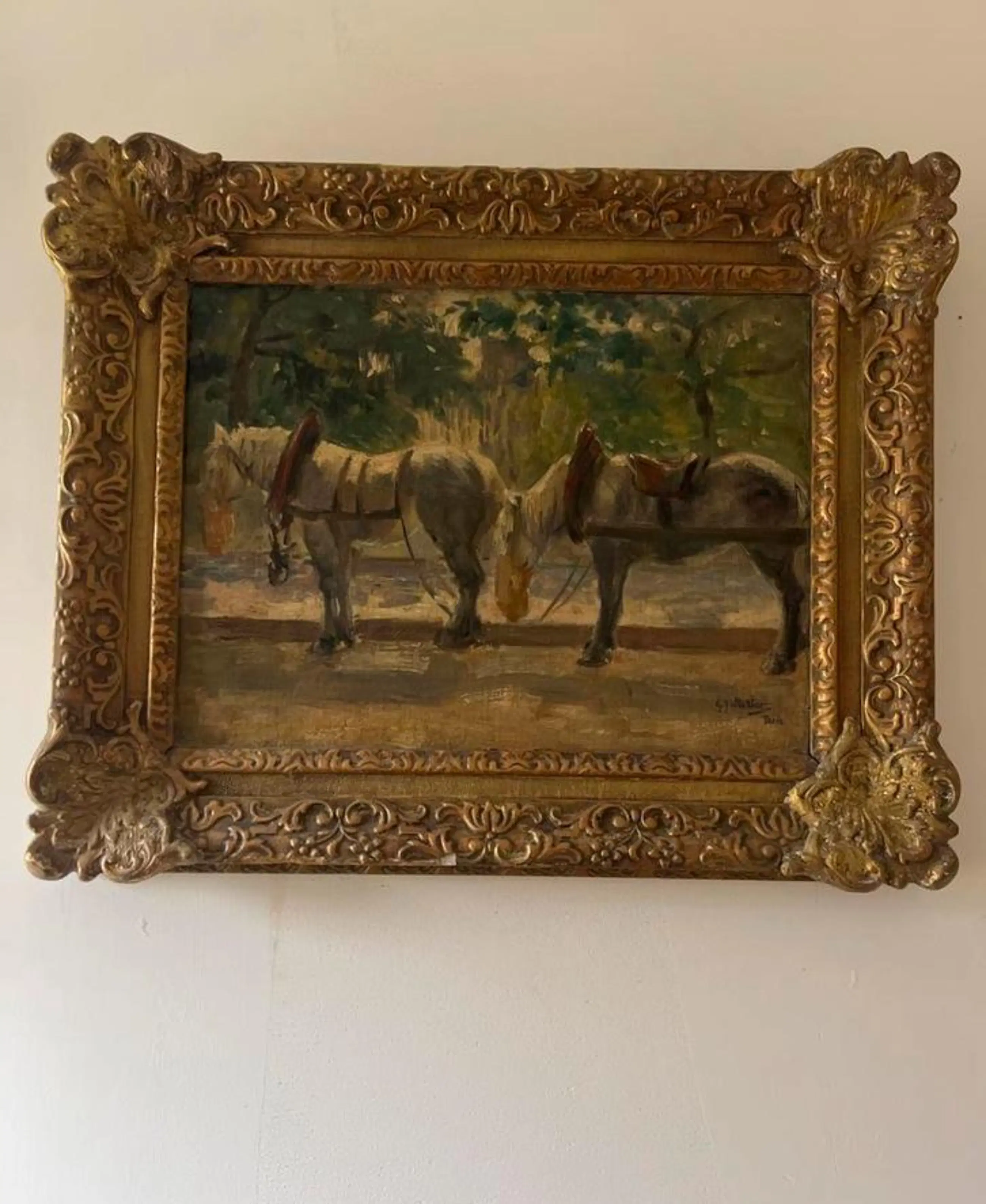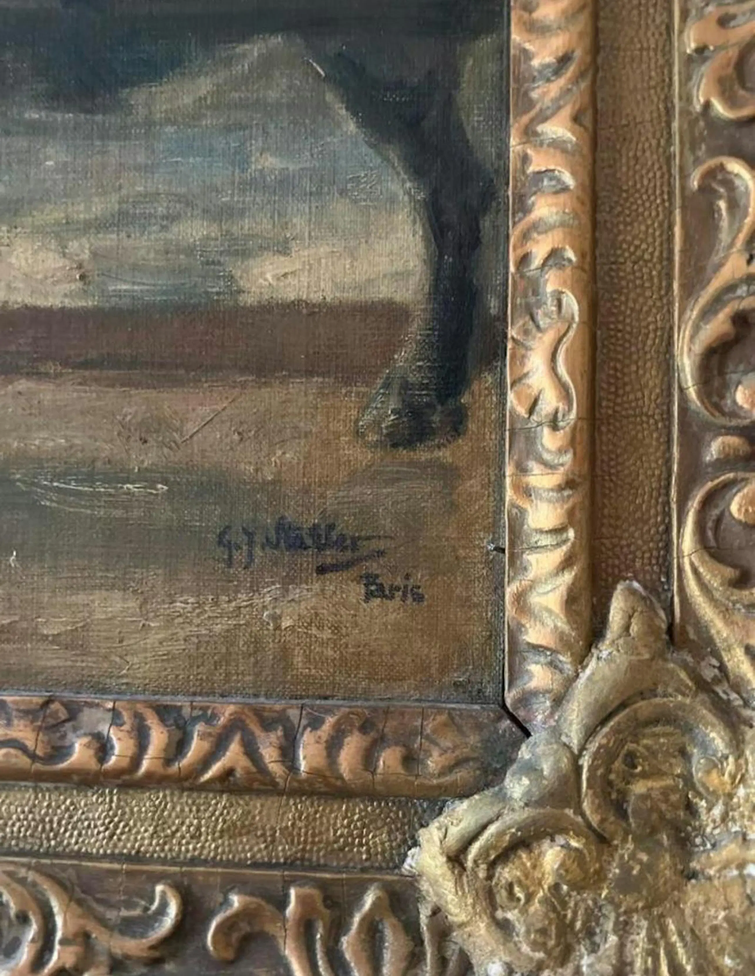 Lijst heeft enkele beschadigingen. Doek zelf helemaal netjes.