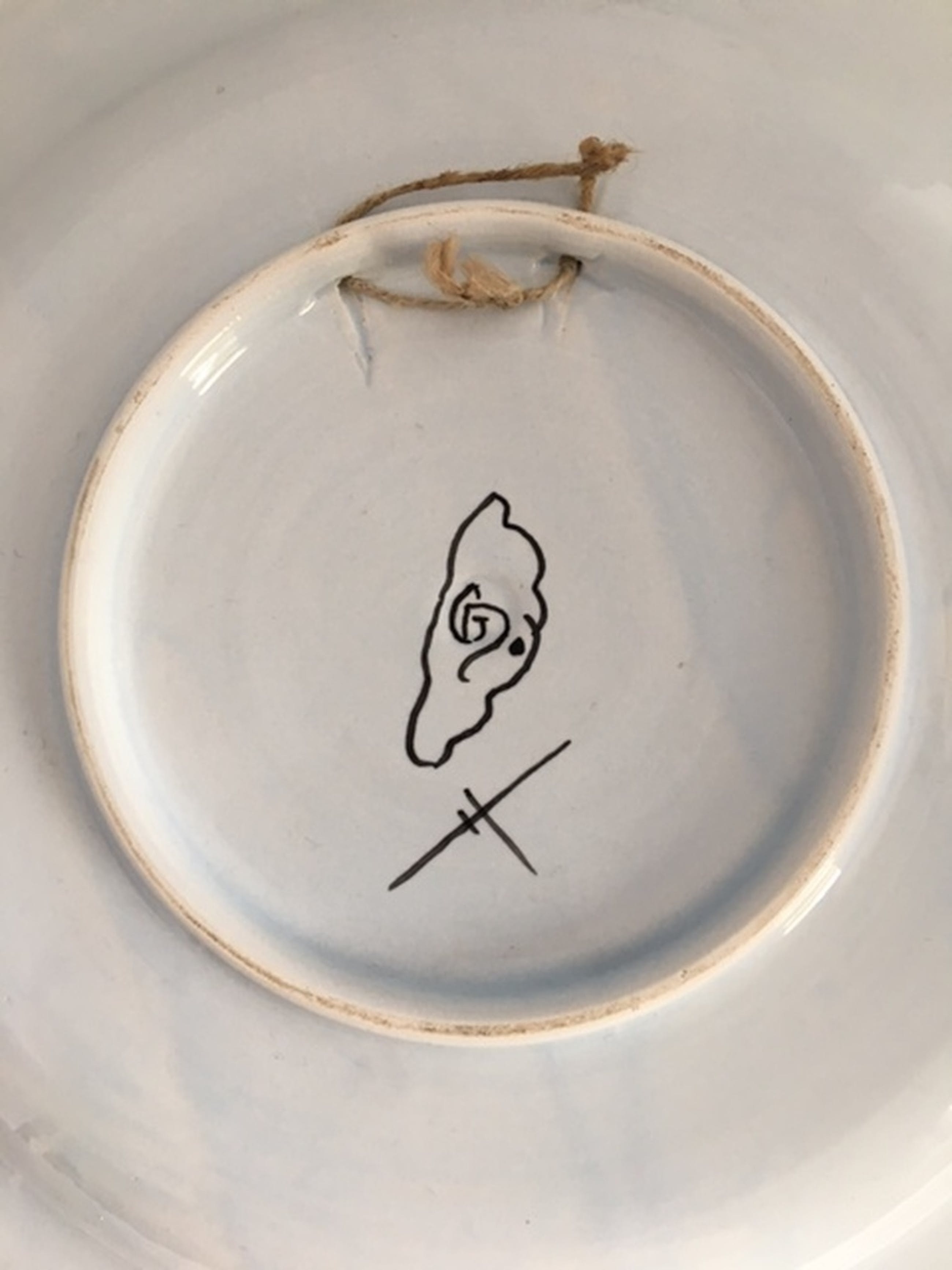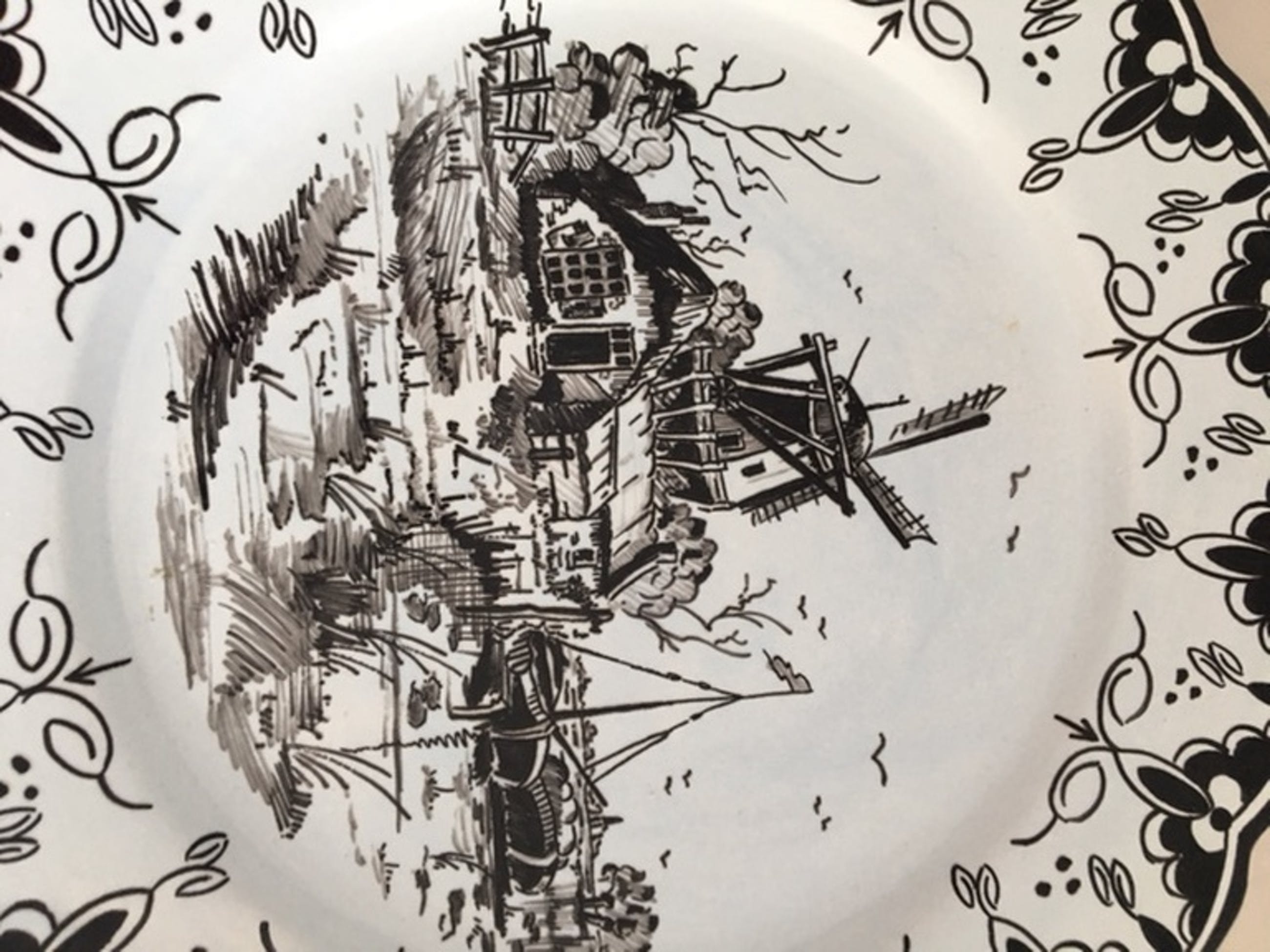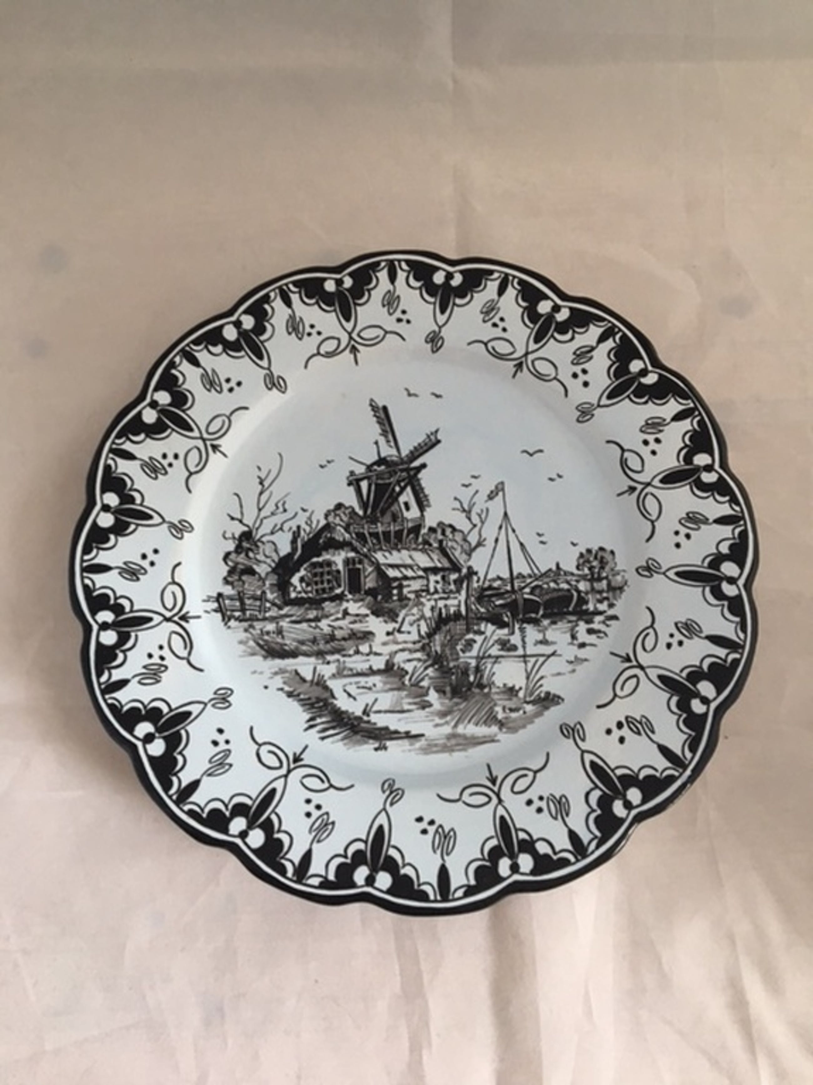 Mooi oud hand beschilderd aardewerken wandbord met de afbeelding van een Hollands Landschap, in zwart wit gedecoreerd wat relatief zeldzaam is. Uitvoering zeer waarschijnlijk aardewerkfabriek Gerard Jonkers en Zn. uit Gouda. In prima onbeschadigde conditie. Aan de achterzijde met de hand gemerkt GJ.