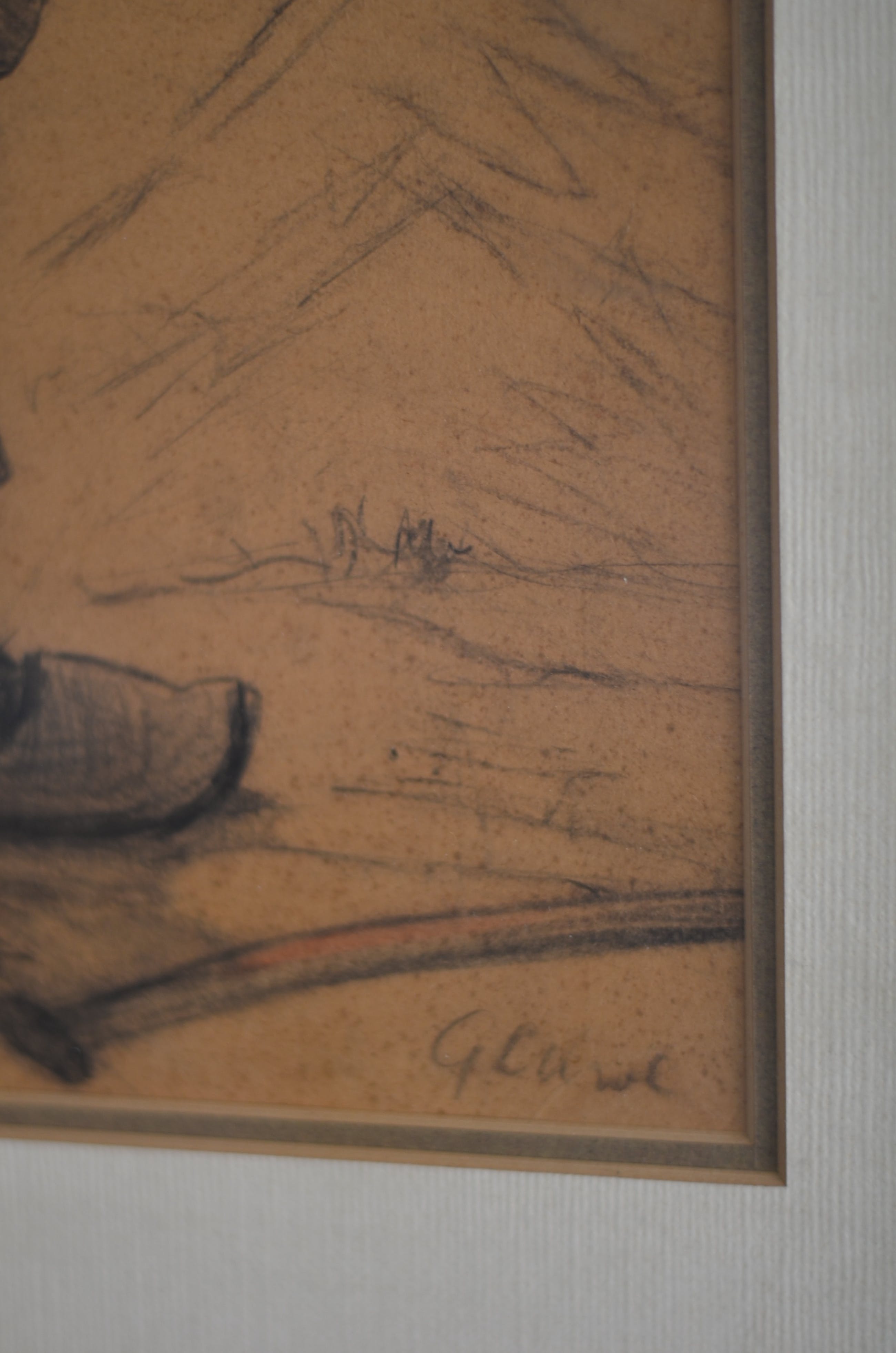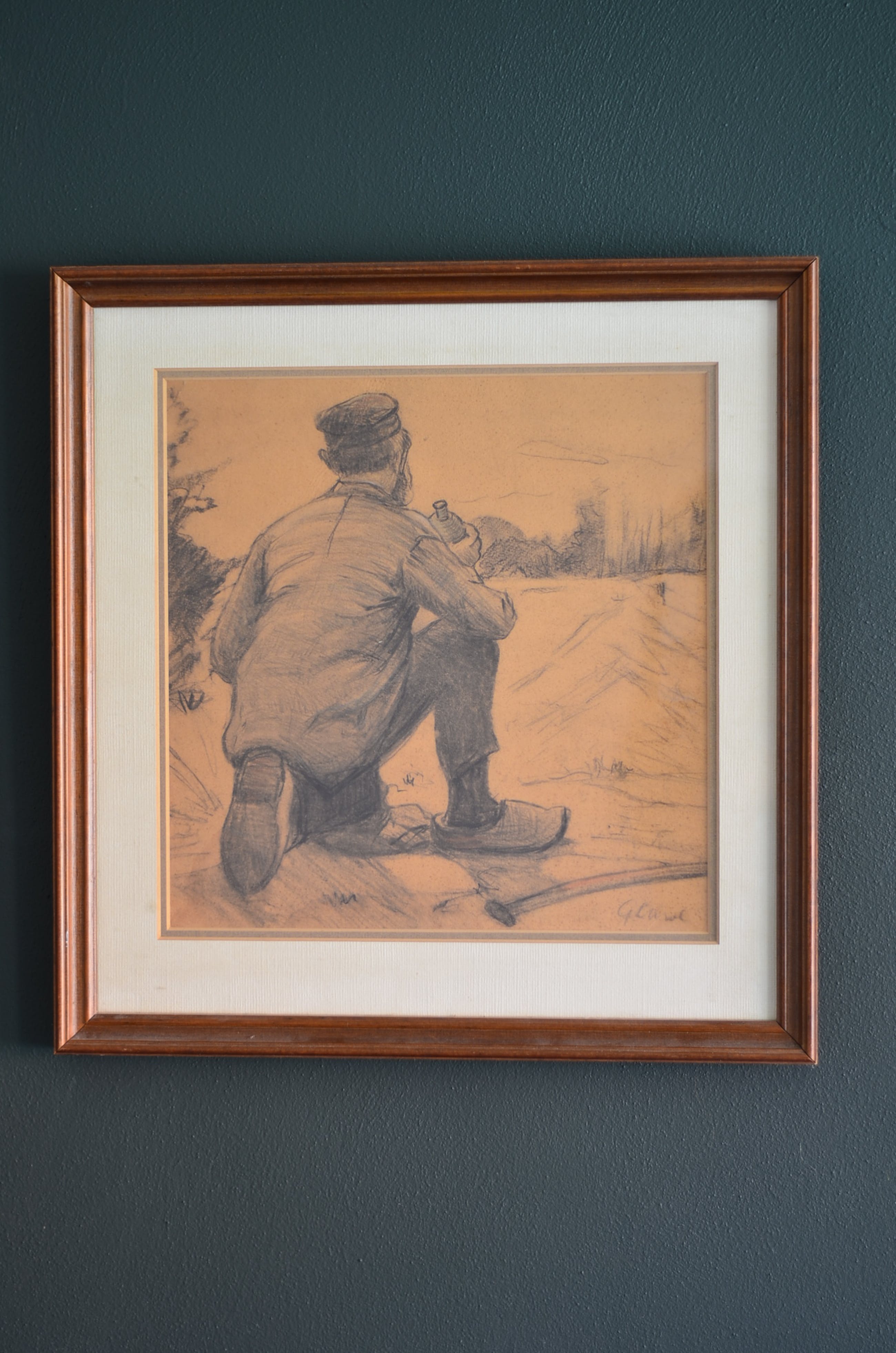 Tekening uitgevoerd met gemengde technieken (potlood, krijt) van Gerard Krol. Datum van de tekening is onbekend. Tafereel van een geknielde boer met een klos touw in zijn hand, gebruikt voor het inzaaien.