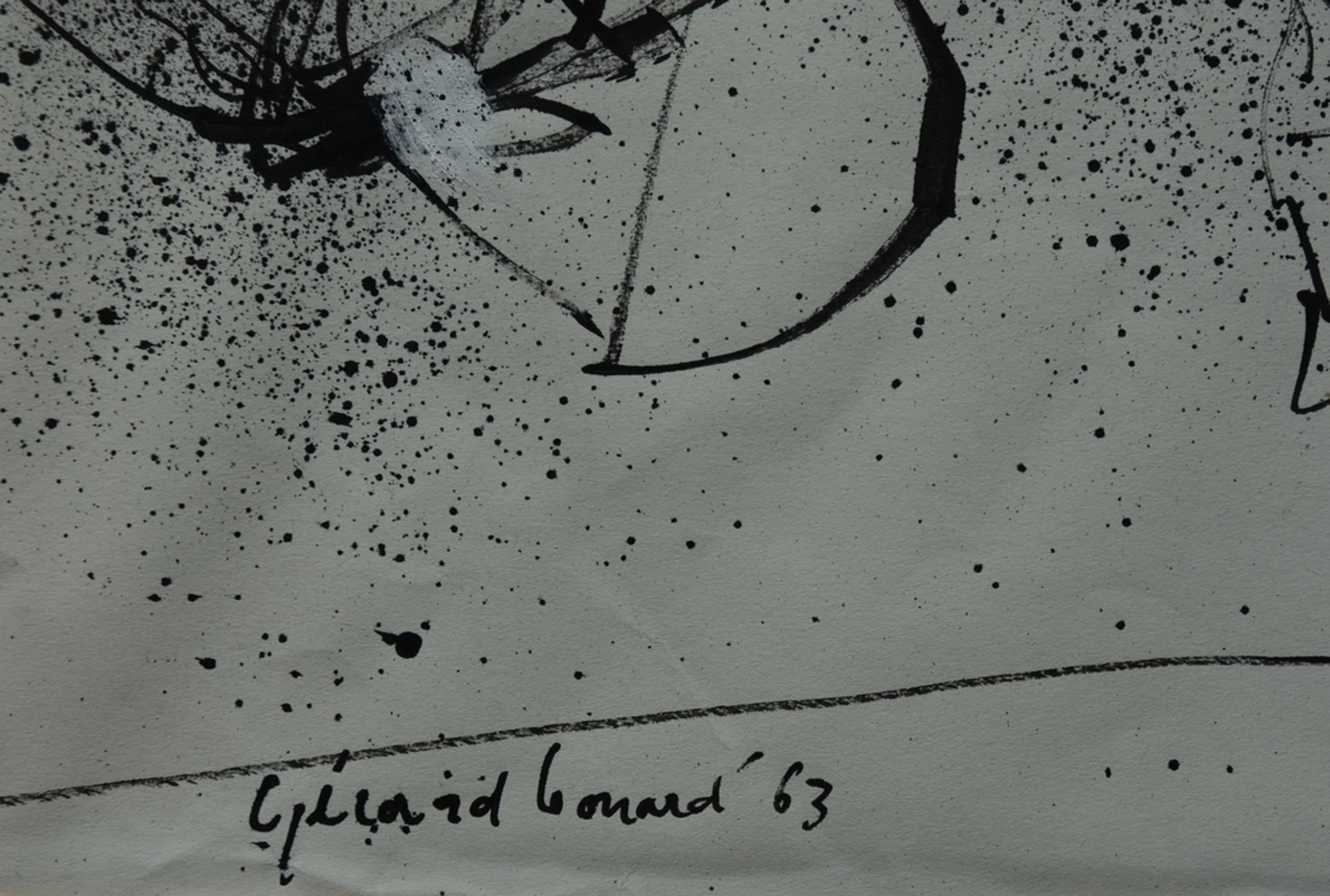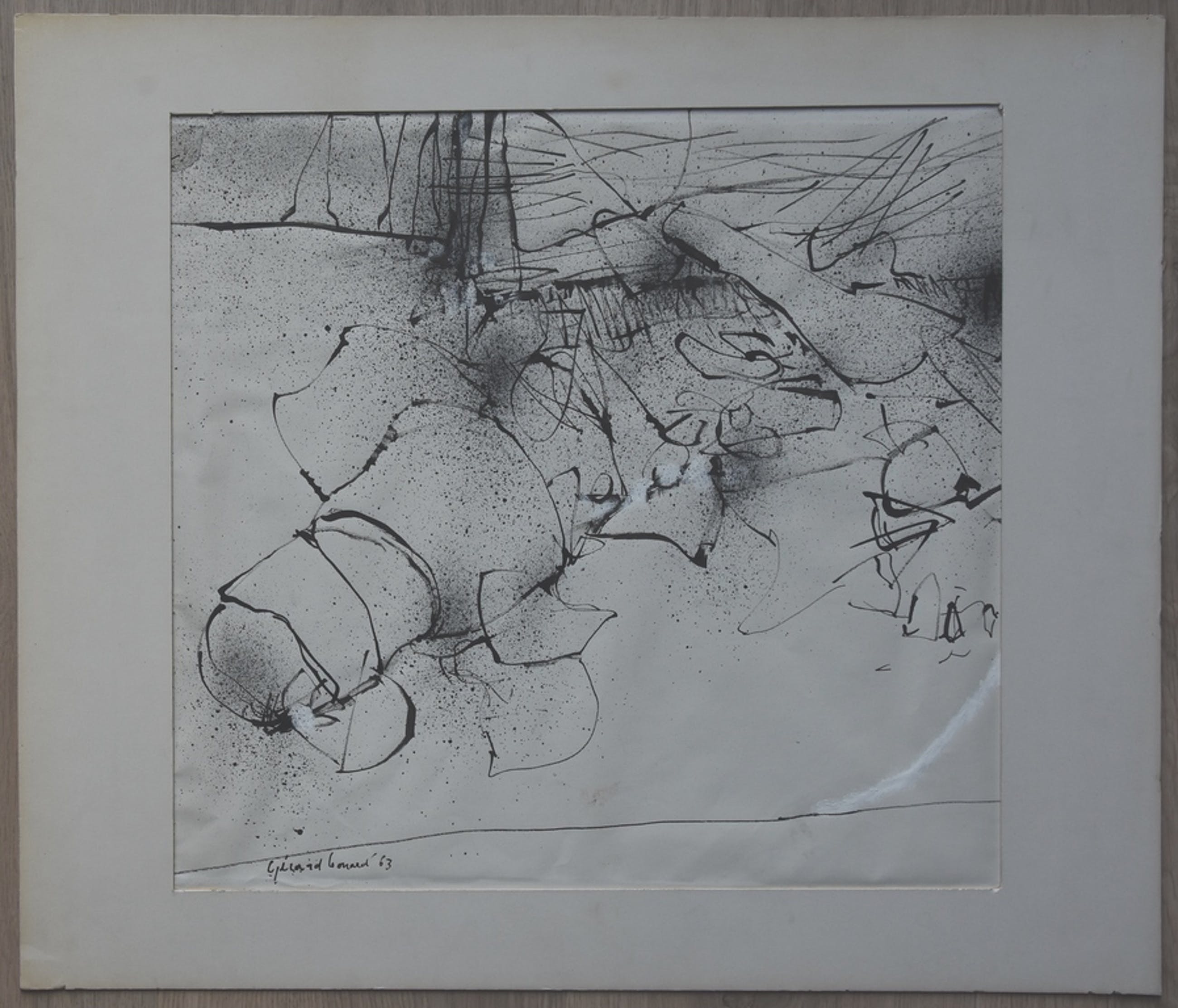 Prachtige en zeer sterke abstracte compositie waarin abstract expressionisme en het vrije van dripping painting doorklinkt. tekening is onder passe partout en wordt incllusief het passe partout geleverd en plat verzonden.