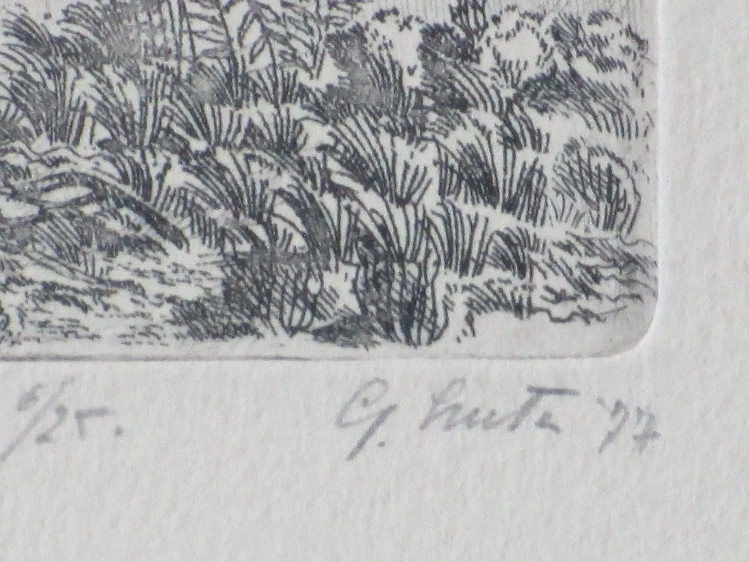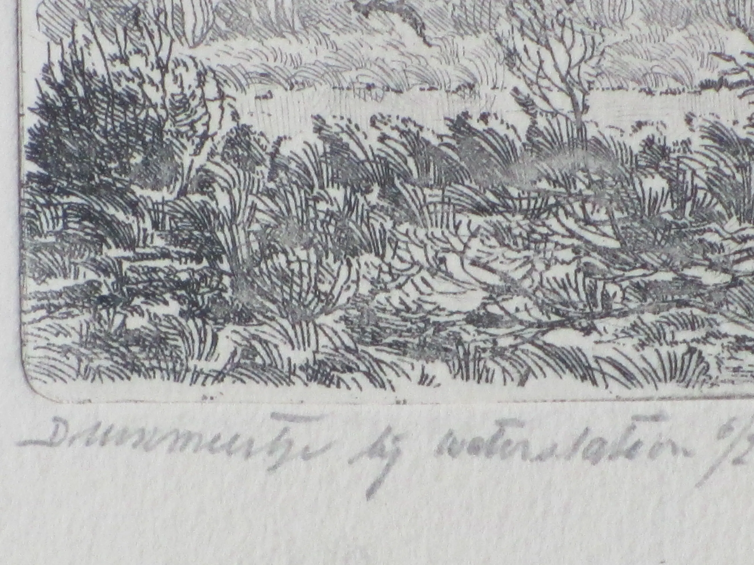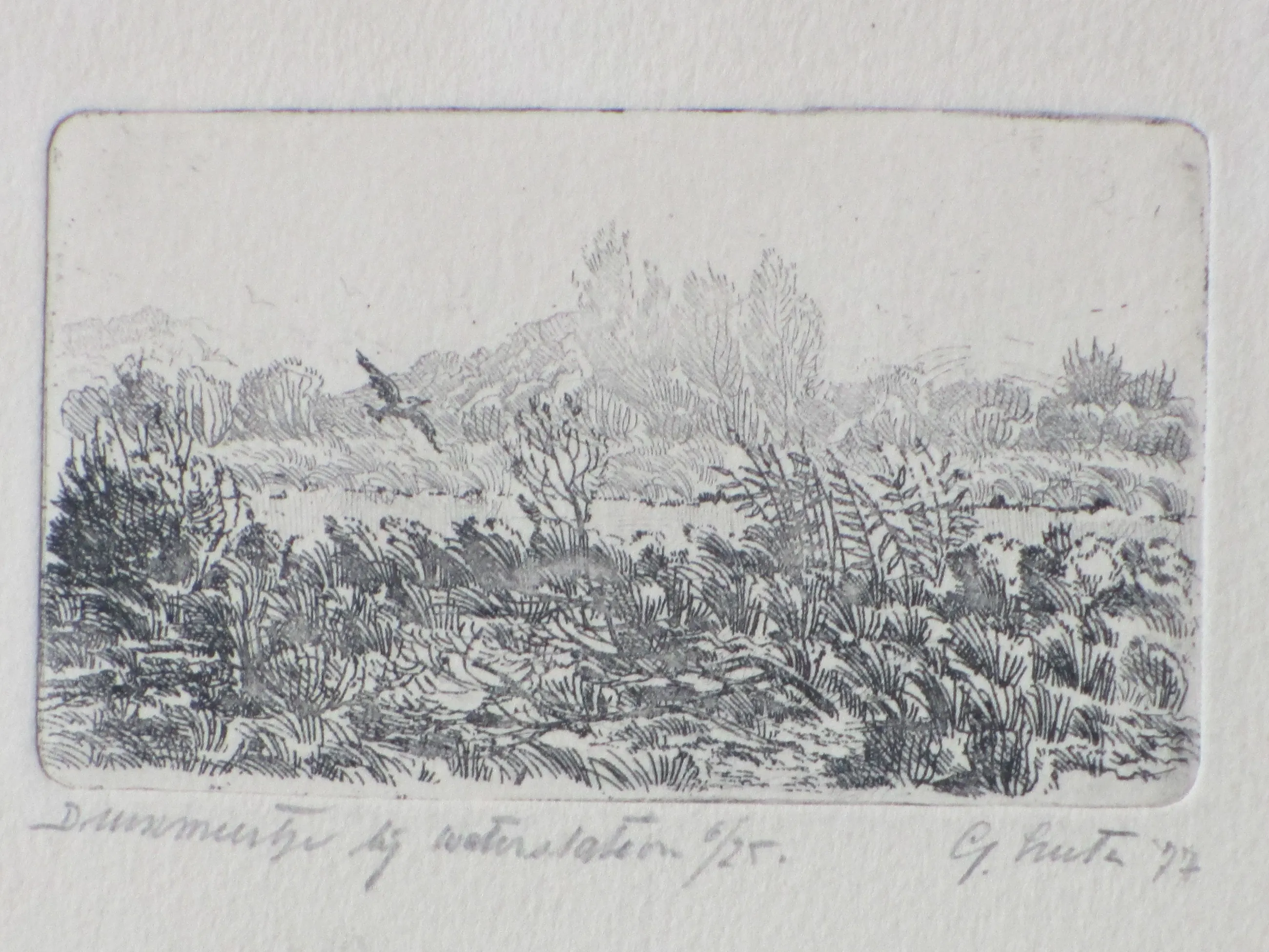 Ets door Gerard Lutz Voorstelling van een duinmeertje bij een waterstation Losbladig op onderblad getipt, beeldmaat 6x10, bladmaat 10x14, onderblad28x20 Gesigneerd en gedateerd in potlood r.o.: 'G.Lutz '77' Getiteld en genummerd in potlood l.o.: 'Duinmeertje bij waterstation 6/25' Authenticiteit volledig gegarandeerd