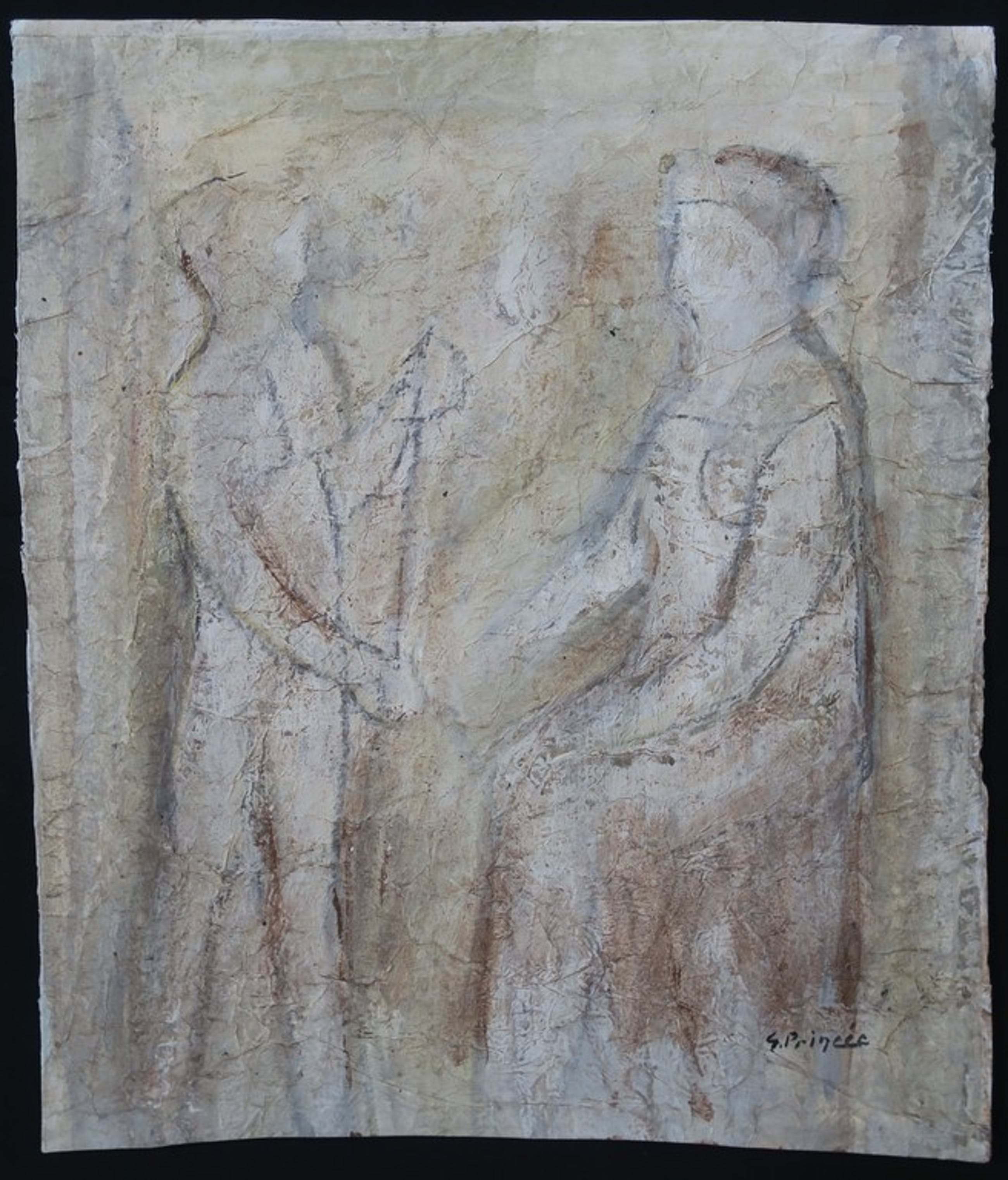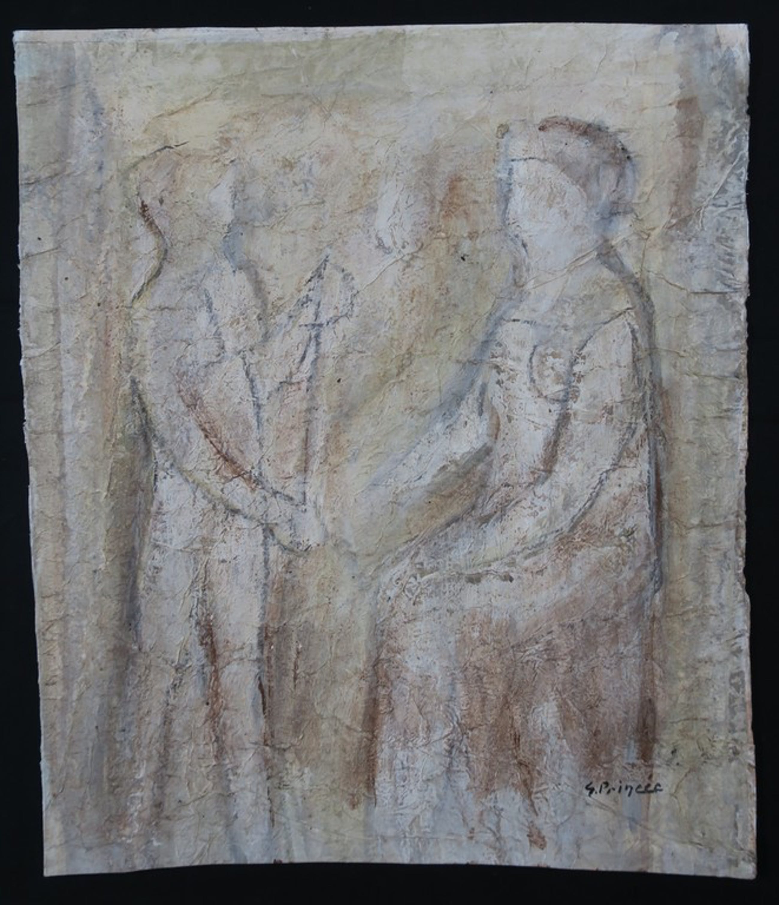 Titel: Voorstelling met twee figuren (mogelijk een christelijke voorstelling)