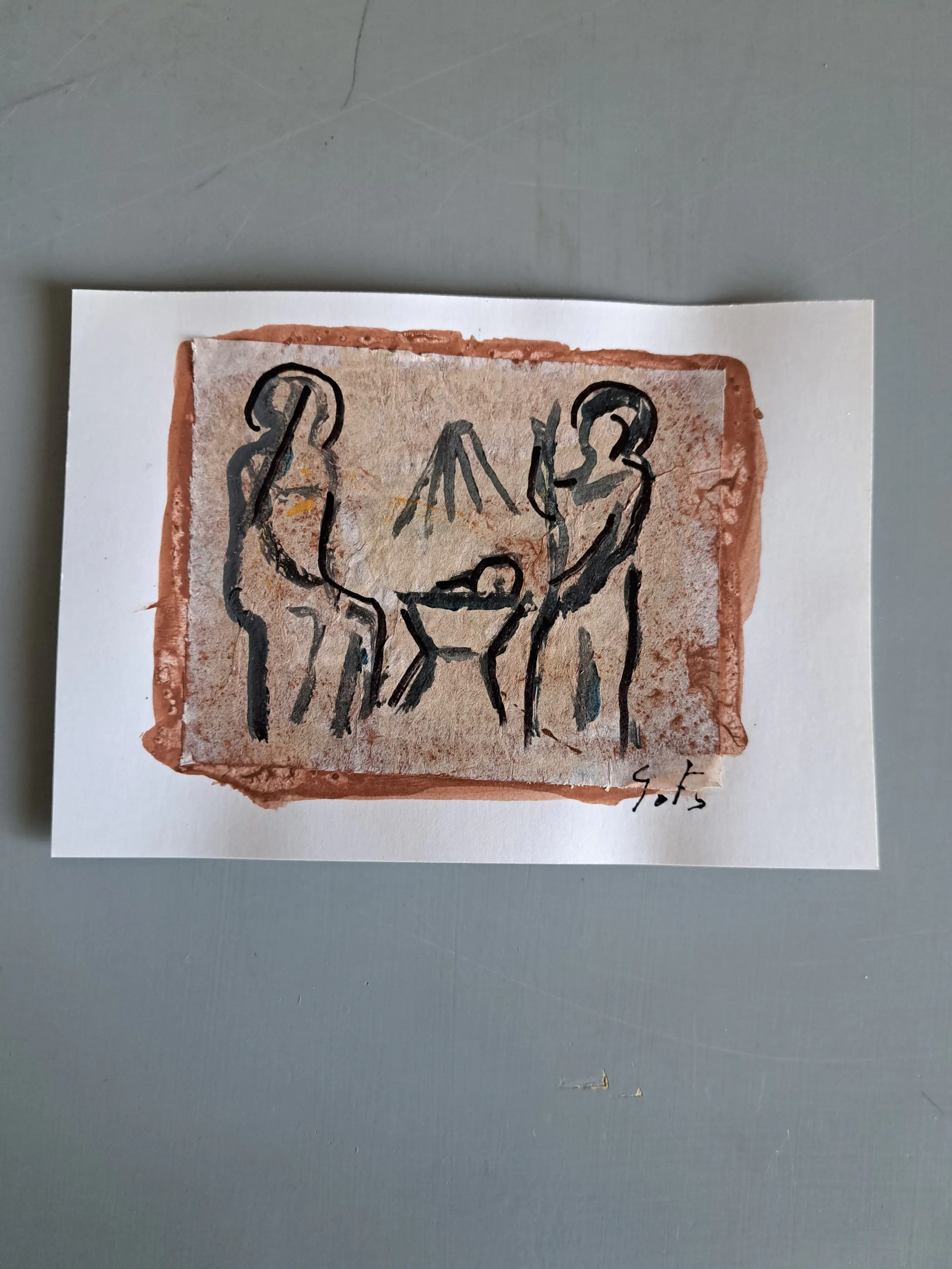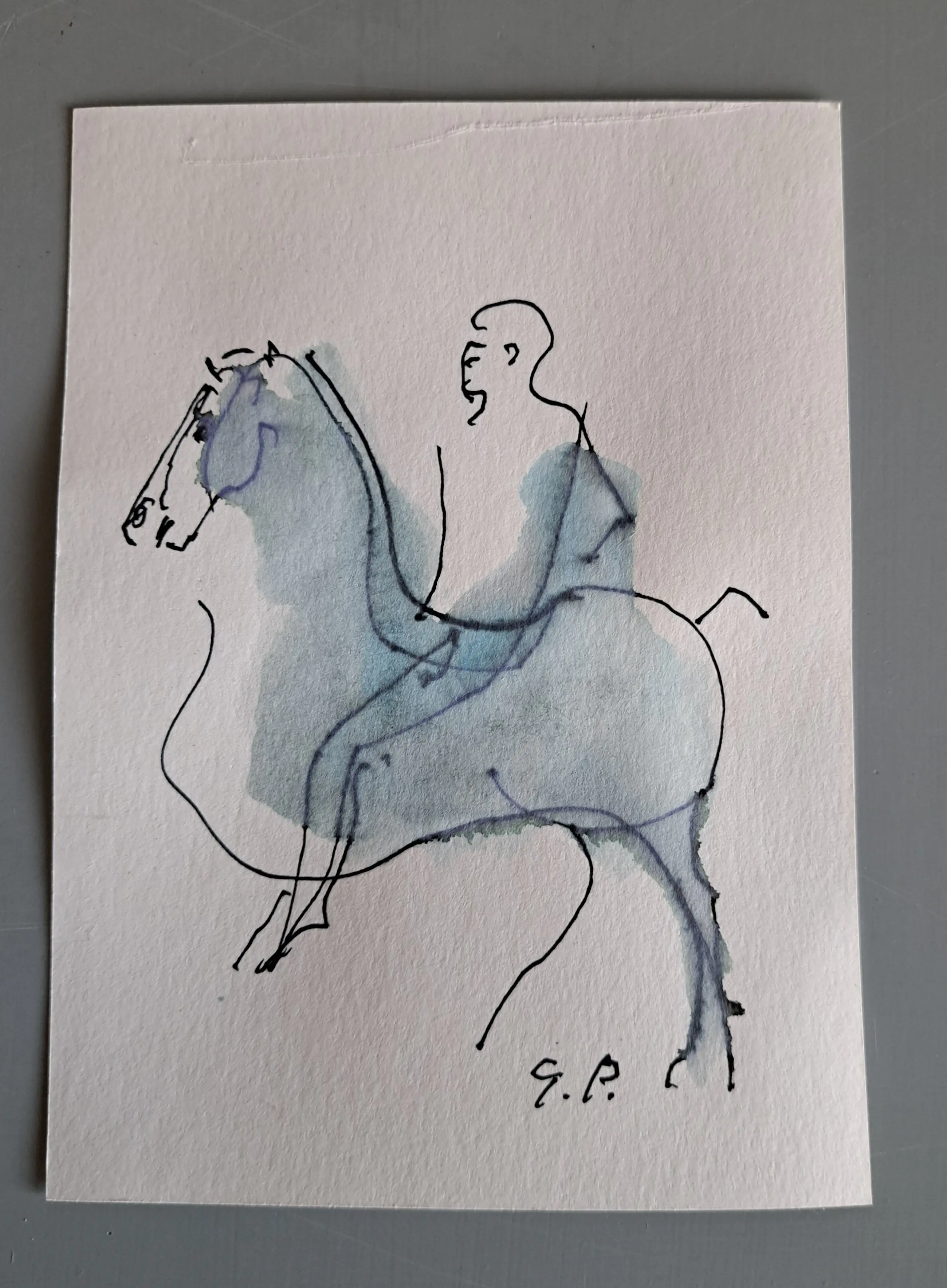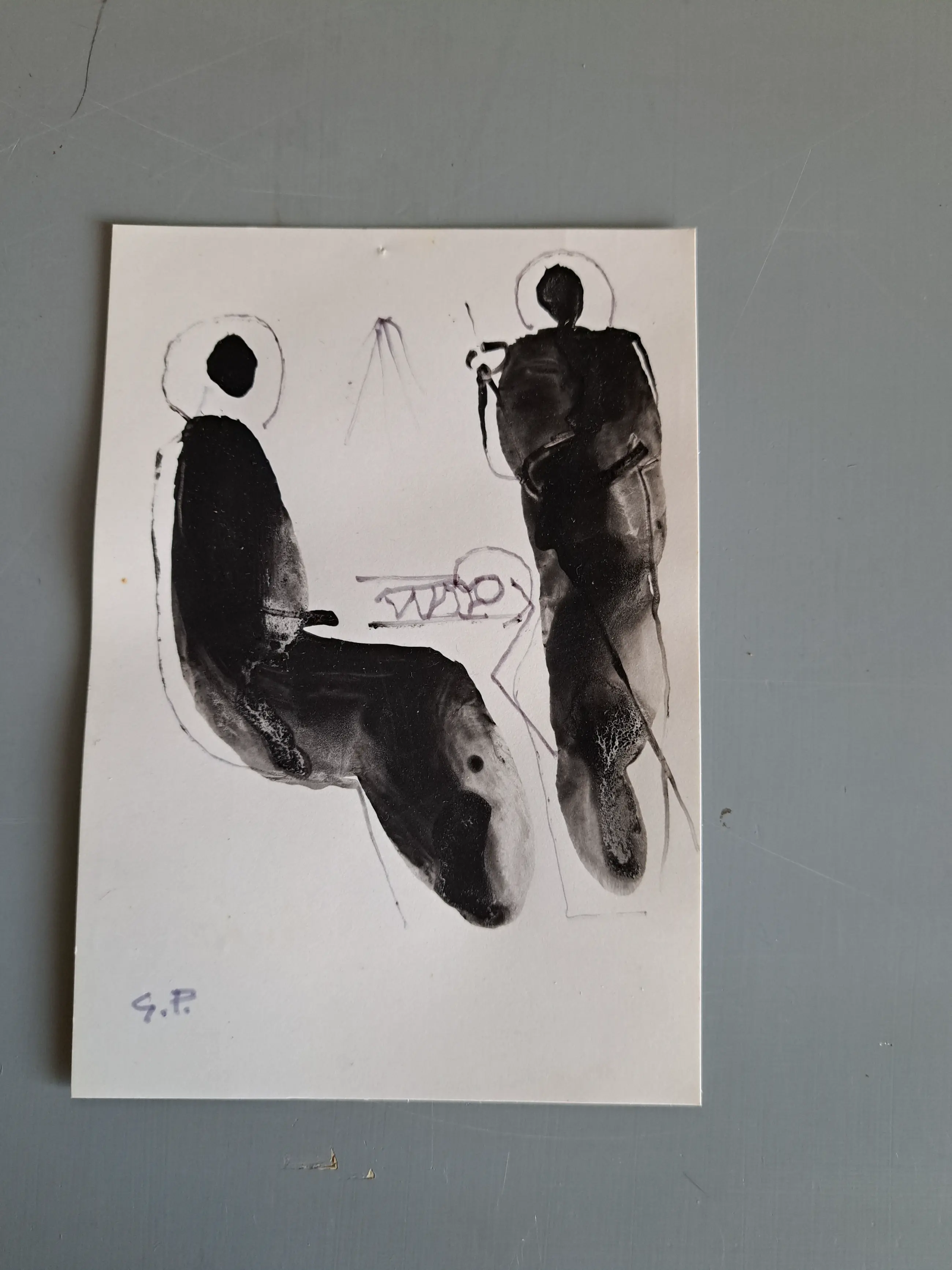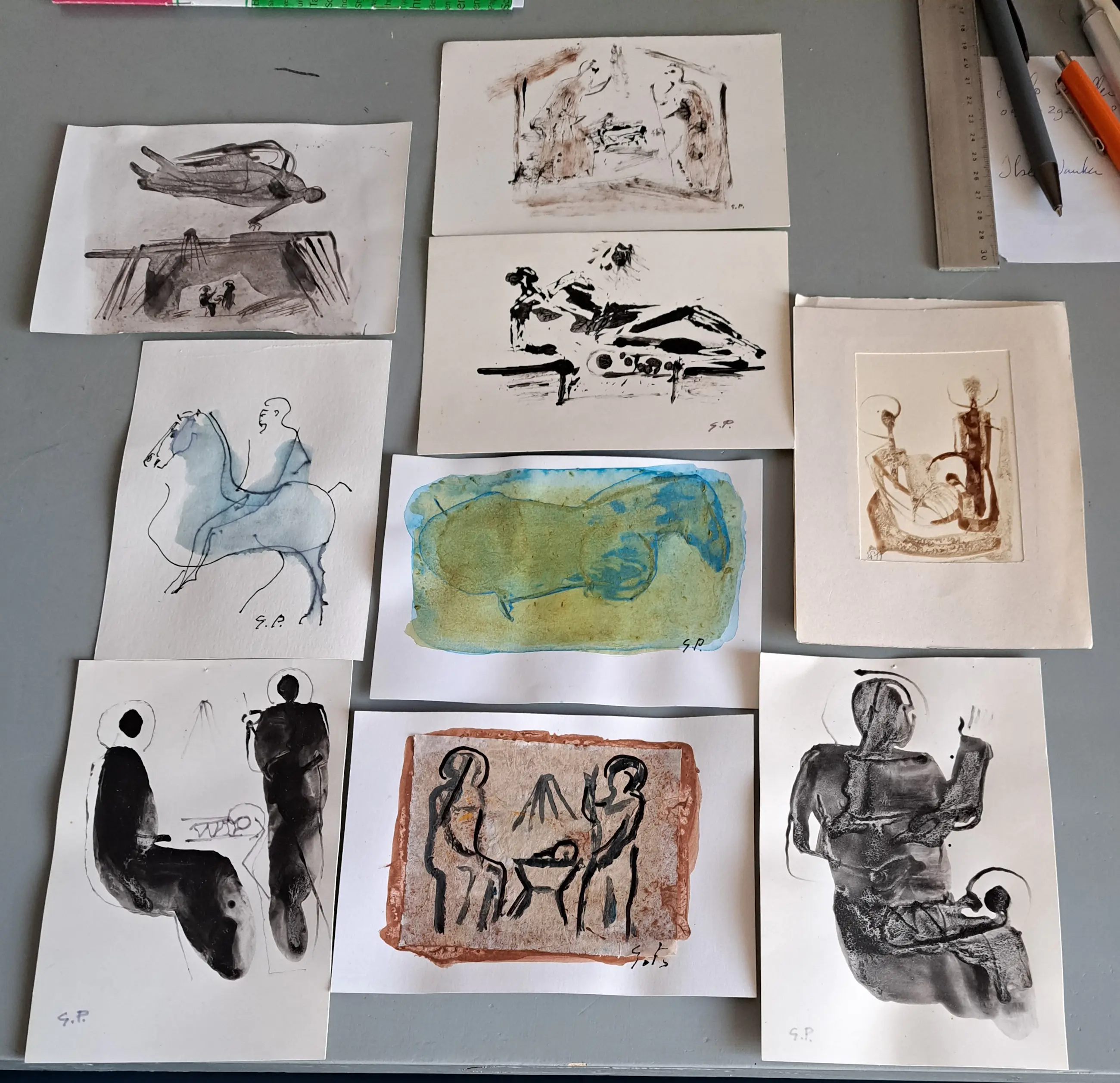 De onderwerpen zijn paarden , figuren en kersttaferelen . Het zijn allemaal gouaches op briefkaartformaat .Ik heb ze persoonlijk toegezonden gekregen rond kerst en nieuwjaar in verschillende jaren .Op één na zijn ze allemaal gesigneerd met de letters GP . Totaal 9 stuks .