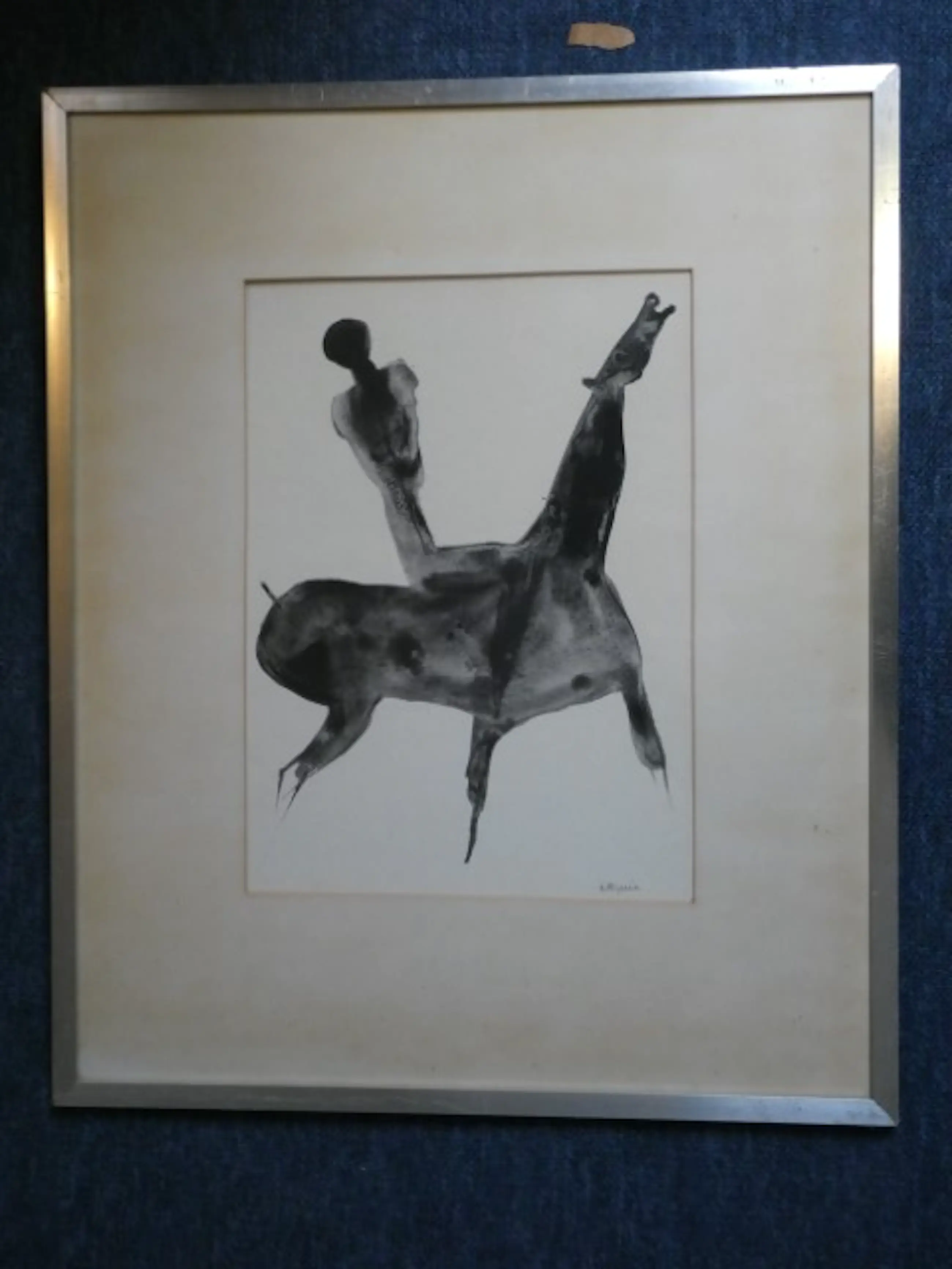 Deze gouache heb ik in de tachtiger jaren van de kunstenaar gekocht in zijn atelier . Het werk is ingelijst maar het passe partout en de houten zilverkleurige lijst zijn wel aan enige slijtage onderhevig : passe partout bruin geworden en lijst met enkele beschadegingen .