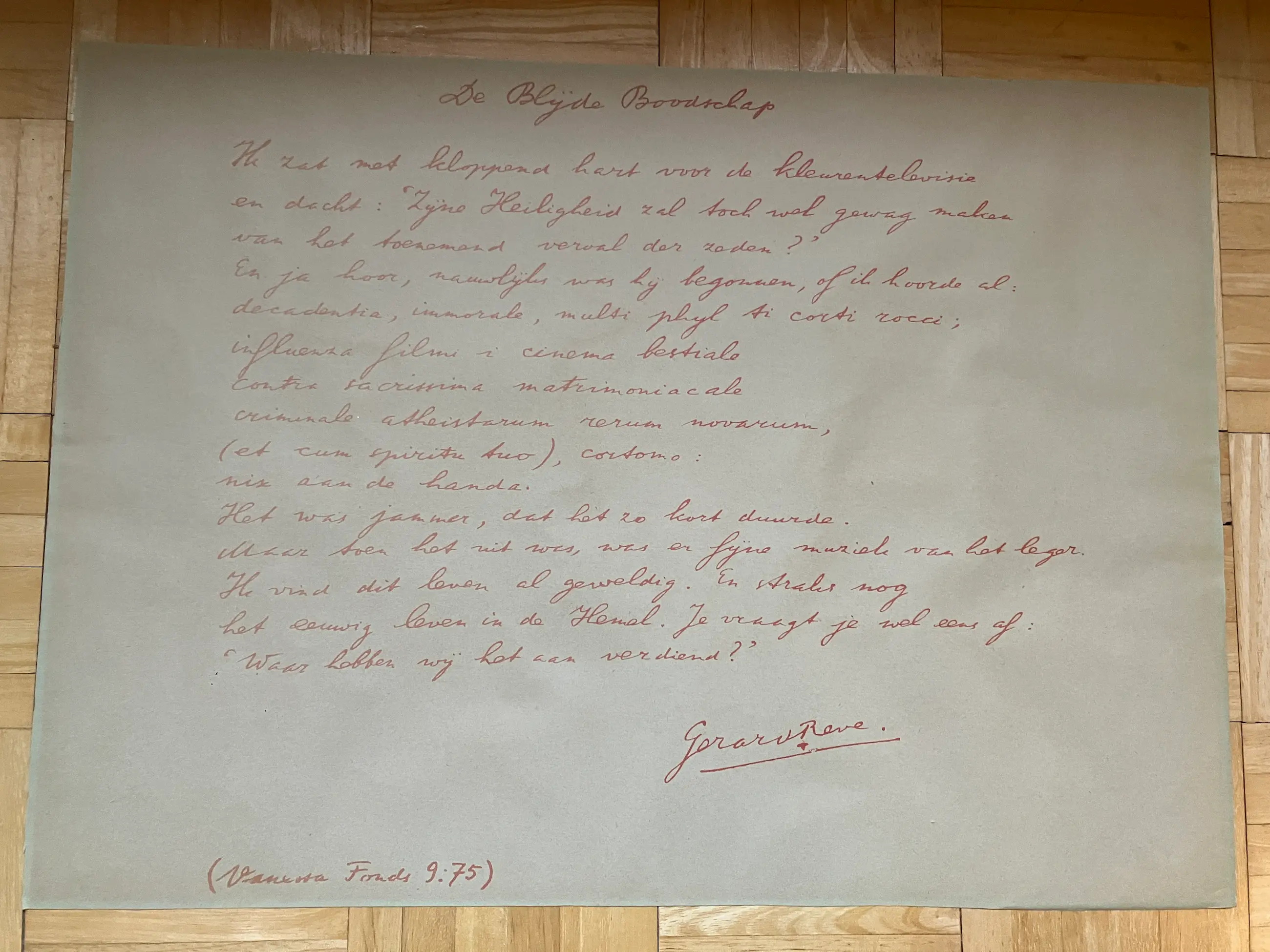 Rijmprent uitgegeven door Vanessa Fonds (= Guido Lauwaert) in 1975. Van deze uitgave is dit een eerste druk op groen papier. Latere drukken waren op bruin papier. Prent is enigszins bobbelig, maar schoon en heel. Bijpassende lijst aanwezig.