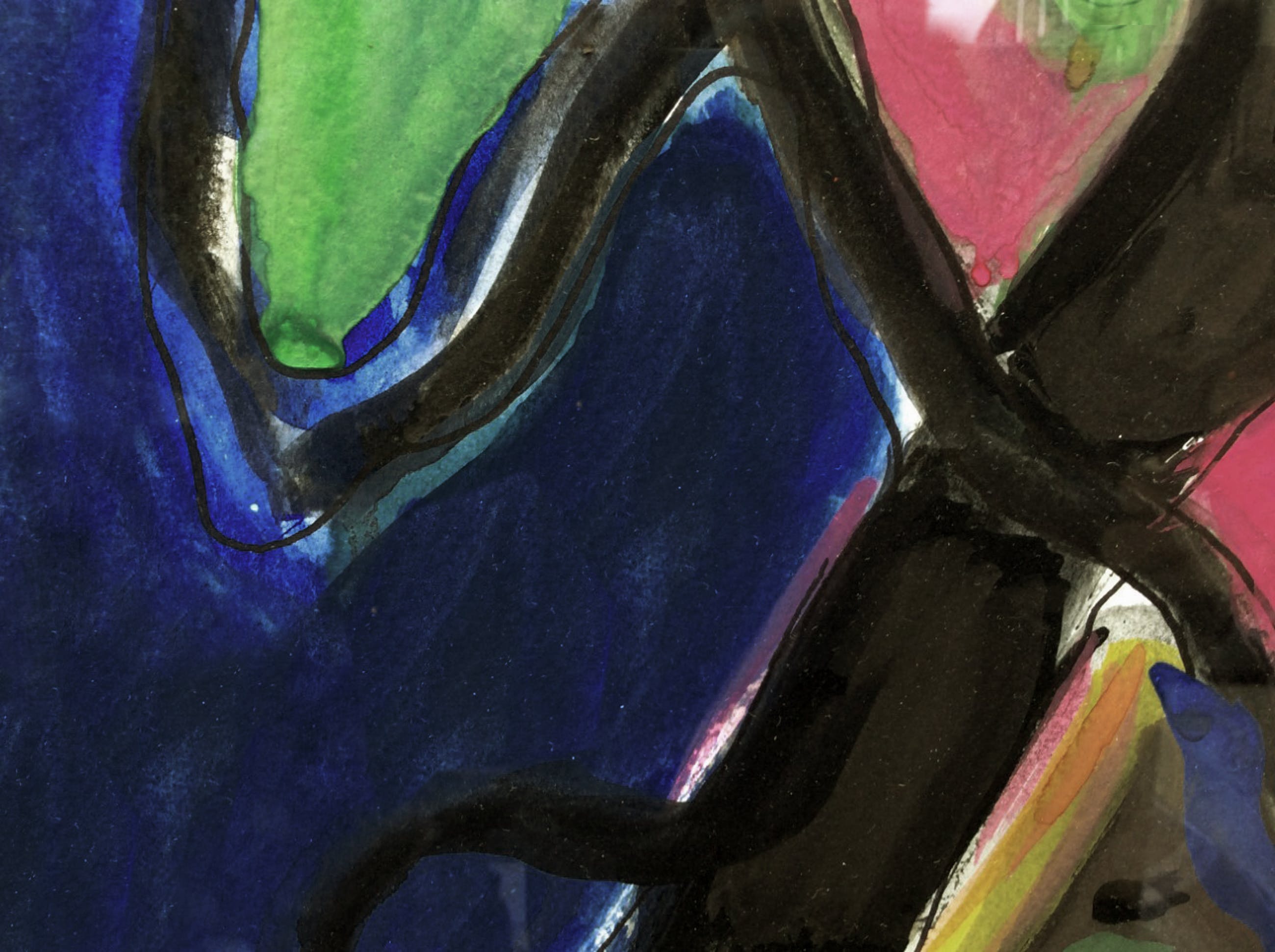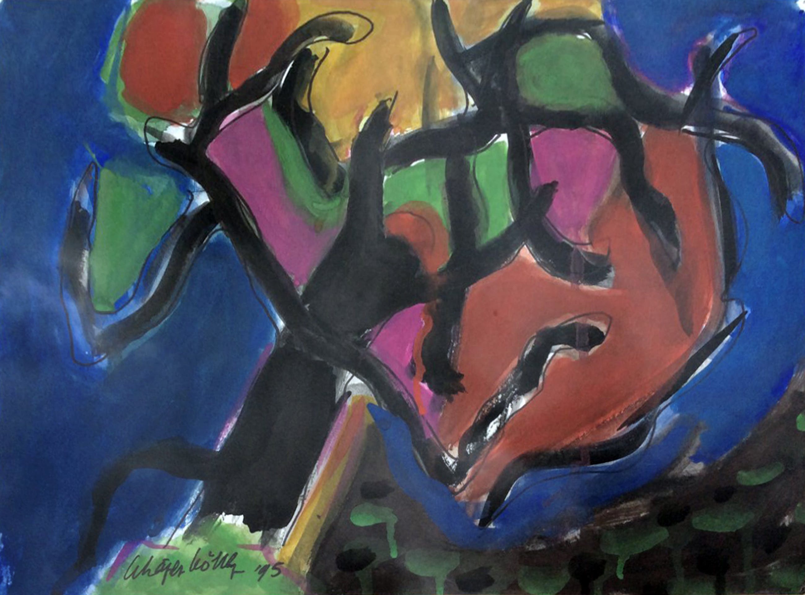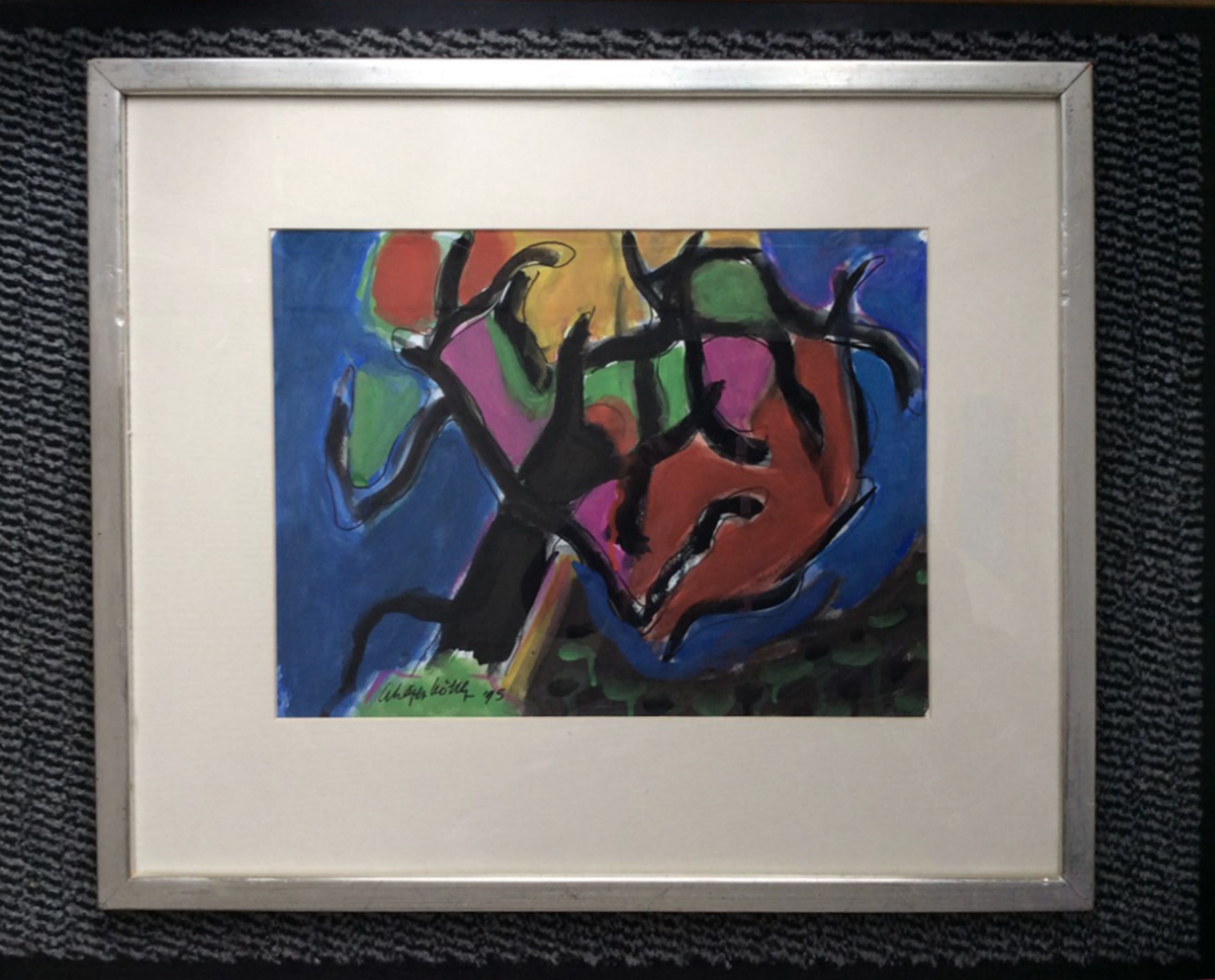 Landschap met boom - gemengde techniek (acryl/aquarel) van Gerard Schaperkotter uit 1995.In eenvoudige houten lijst (wat gebruikssporen).Formaat incl. 50 x 58 cm.