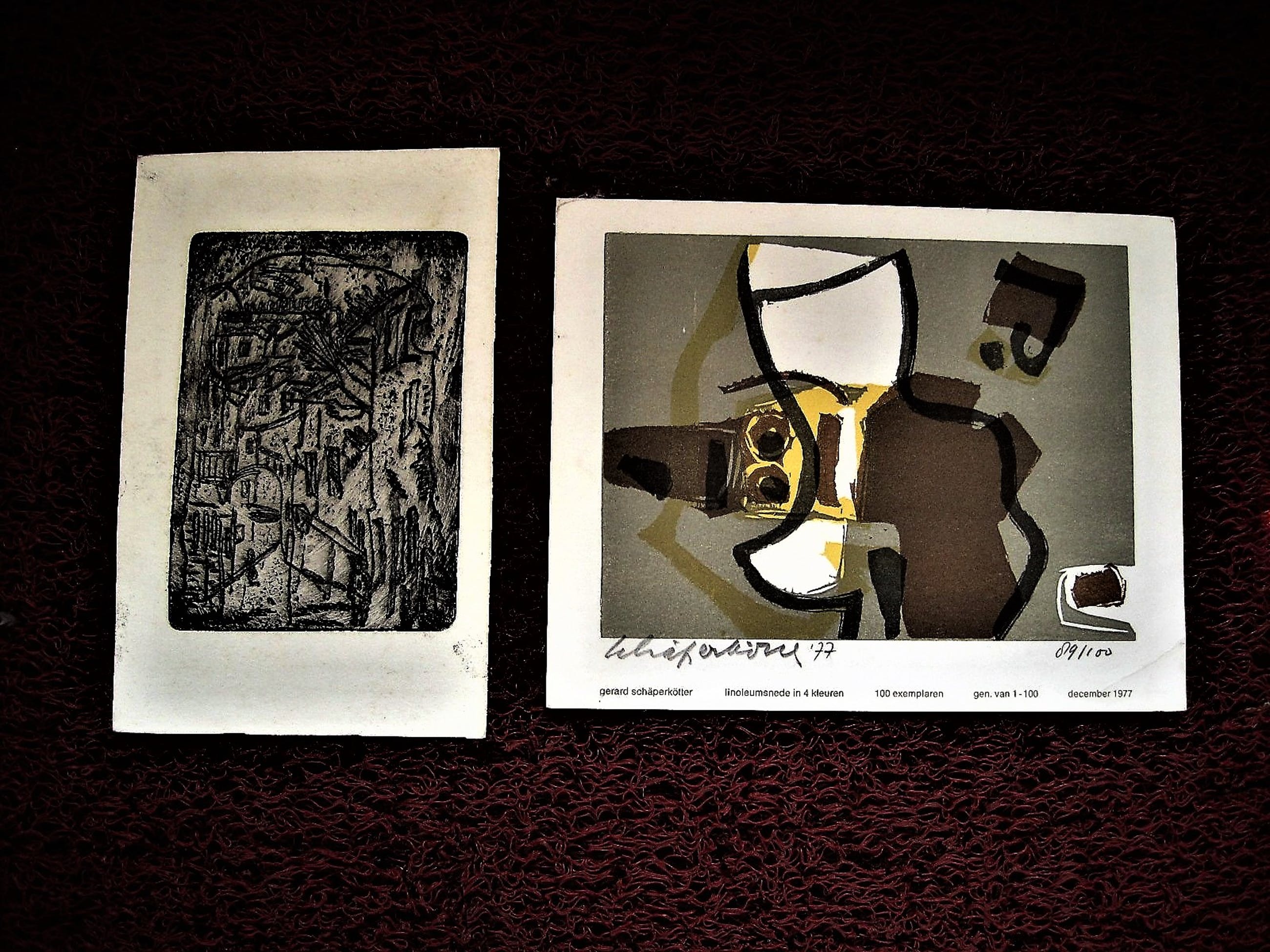 weinig zichtbare onregelmatigheden. rechterhoekje van linosnede gevouwen.