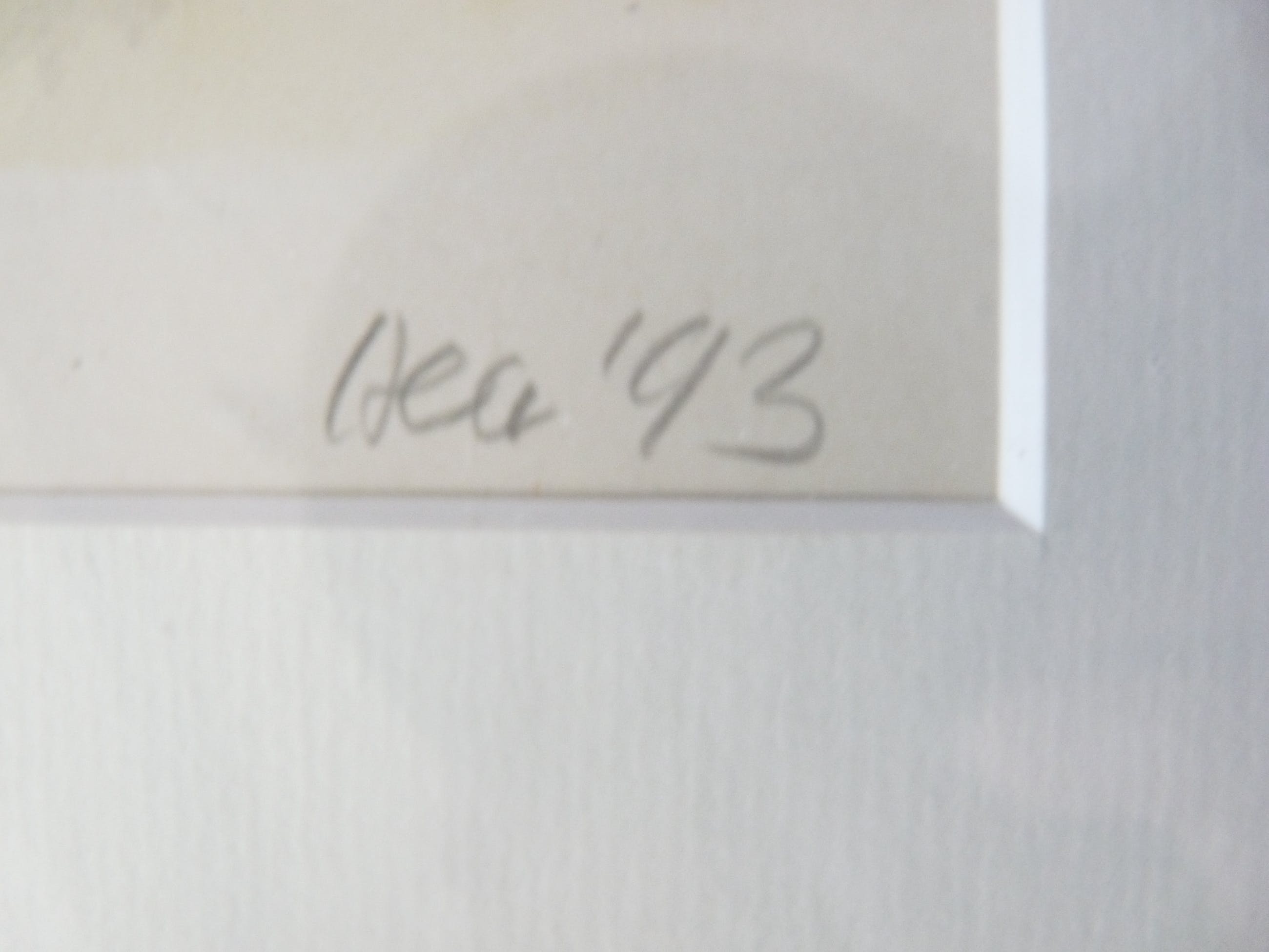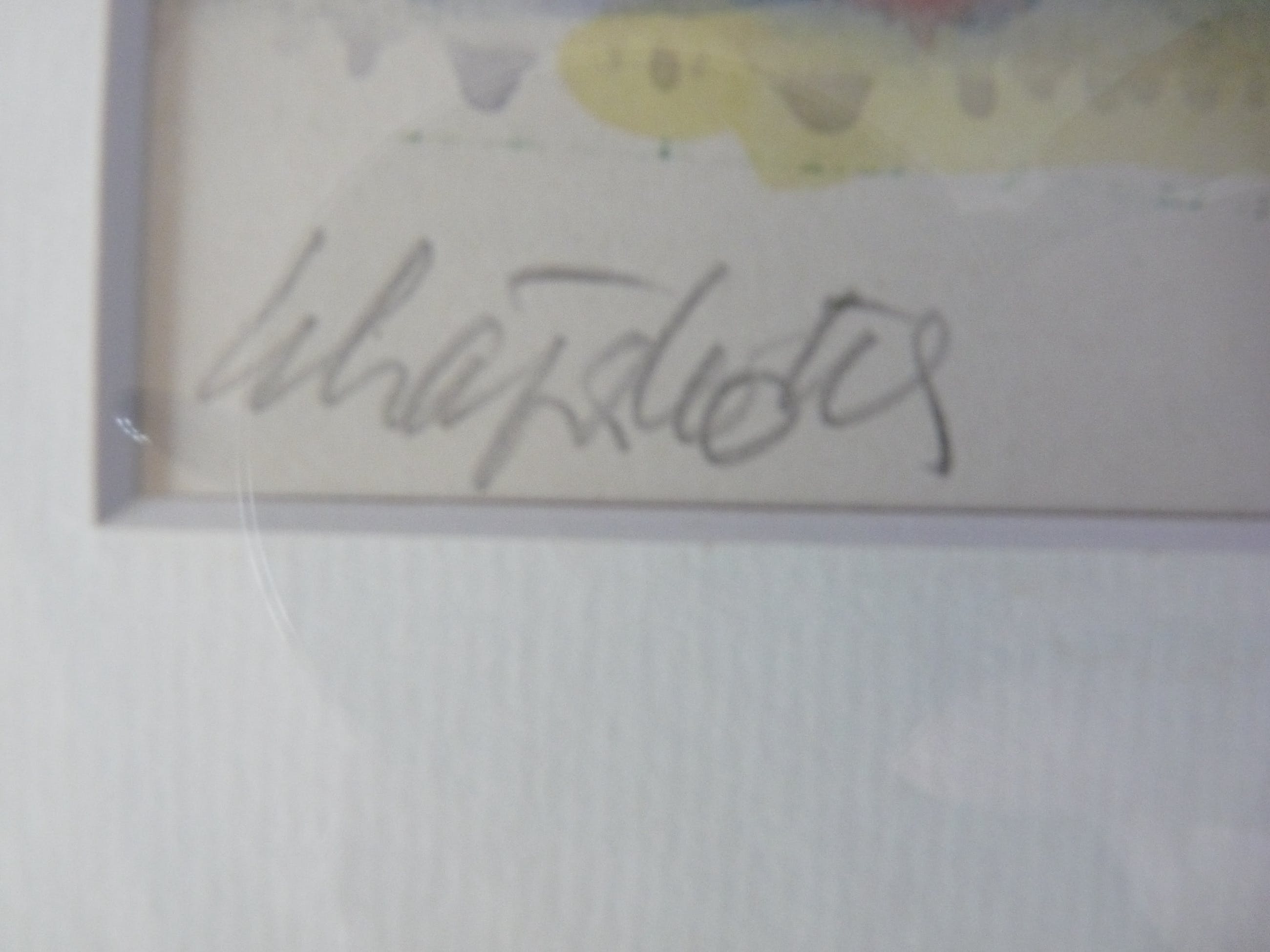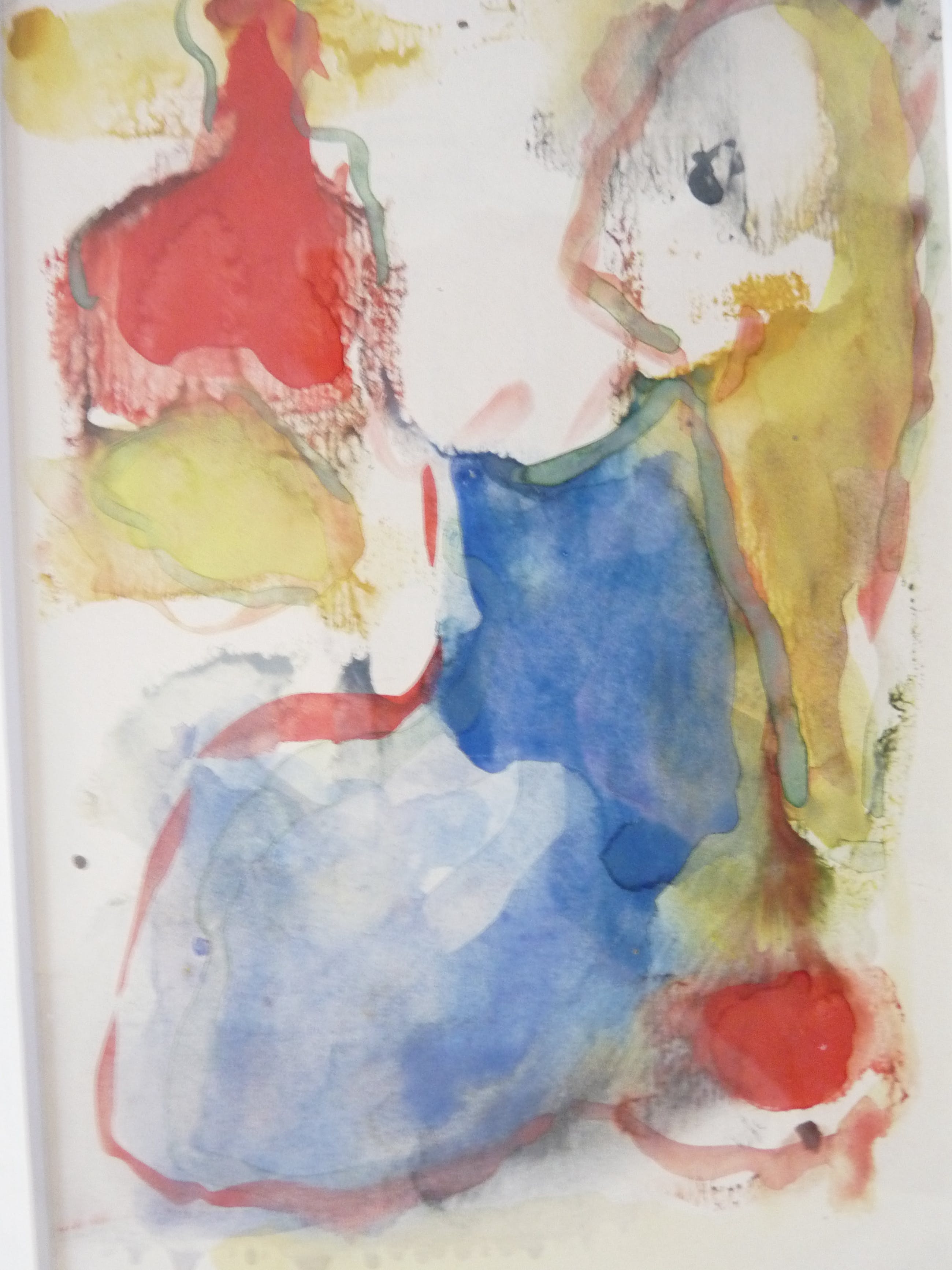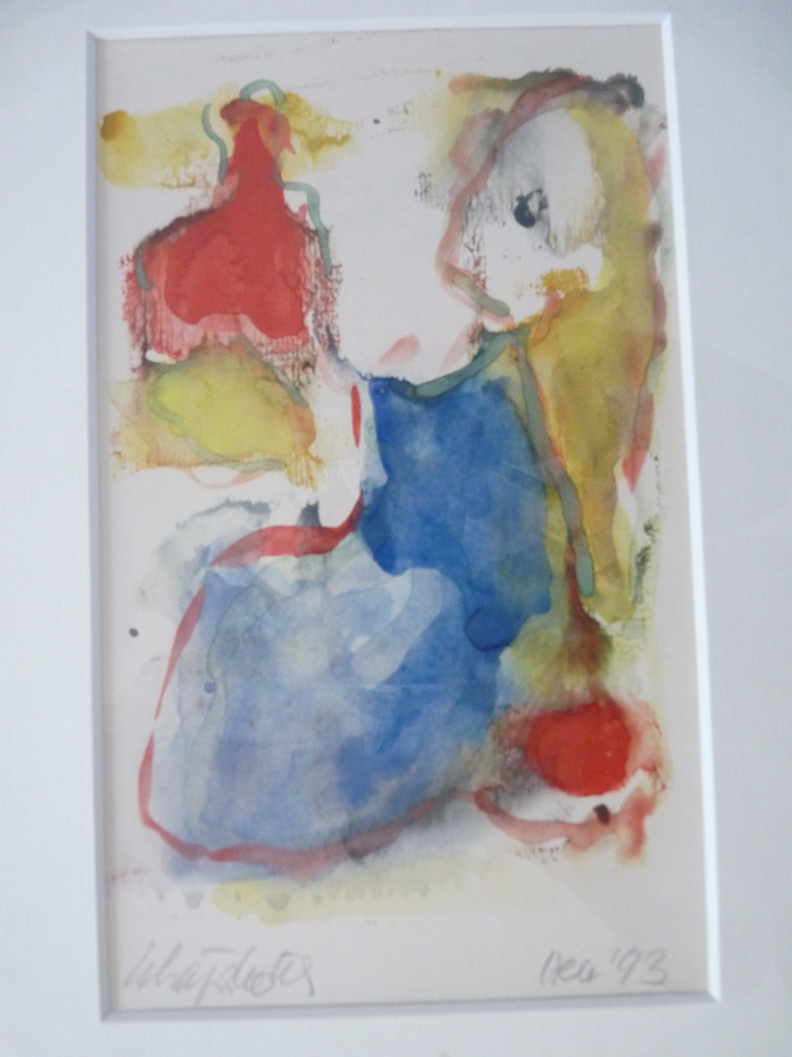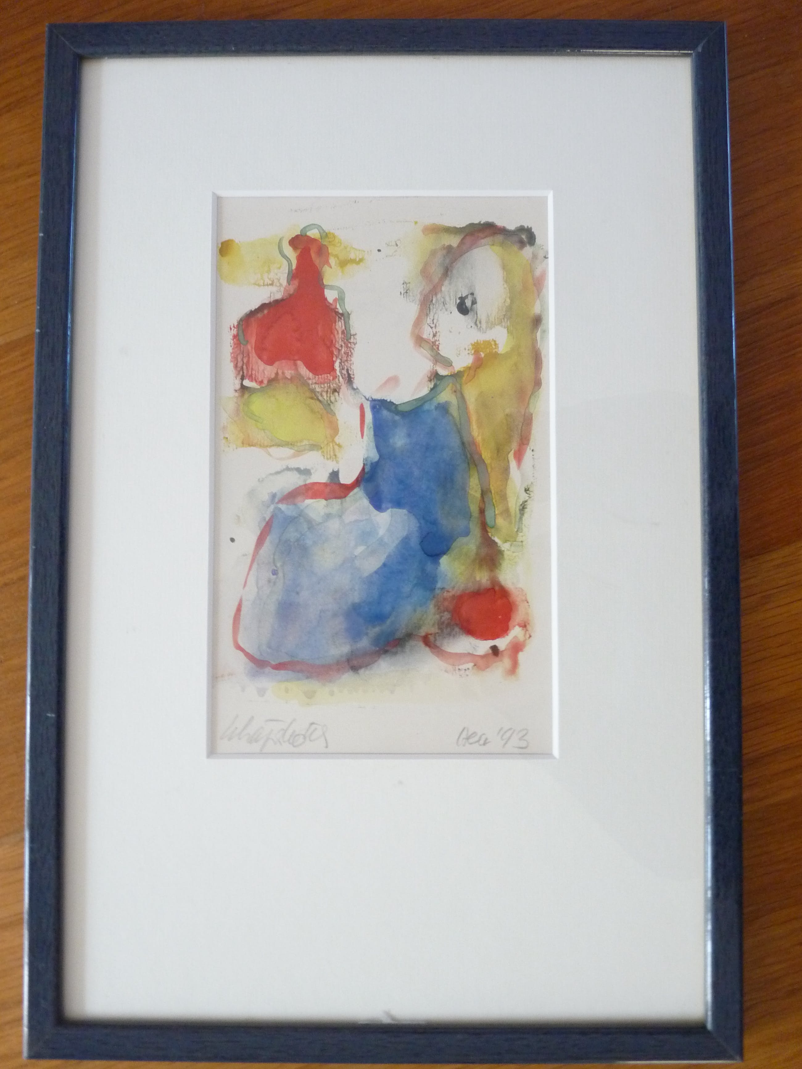 Klein, maar sterk aquarel gelijst in een glanzend blauw houten lijst. Werkje kan zo aan de muur. Afmeting aquarel 21 x 12,5 cm. Ingelijst 39 x 26,5 cm.