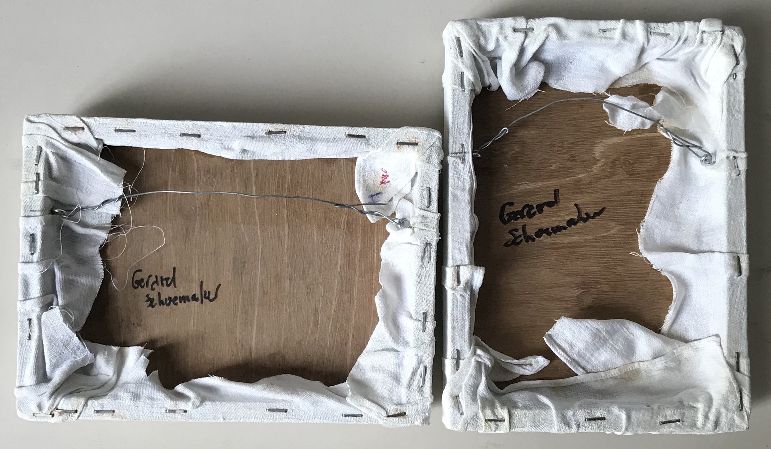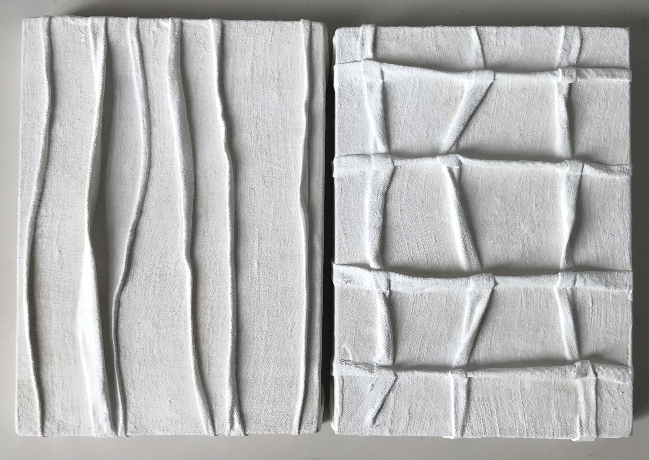 Tweeluik van textielreliëfs van Gerard Schoemaker. Het betreft in plooien genaaid textiel gelijmd op paneel en daarna wit geschilderd. De werken zijn in goede staat. De werken komen zeer mooi uit in strijklicht.