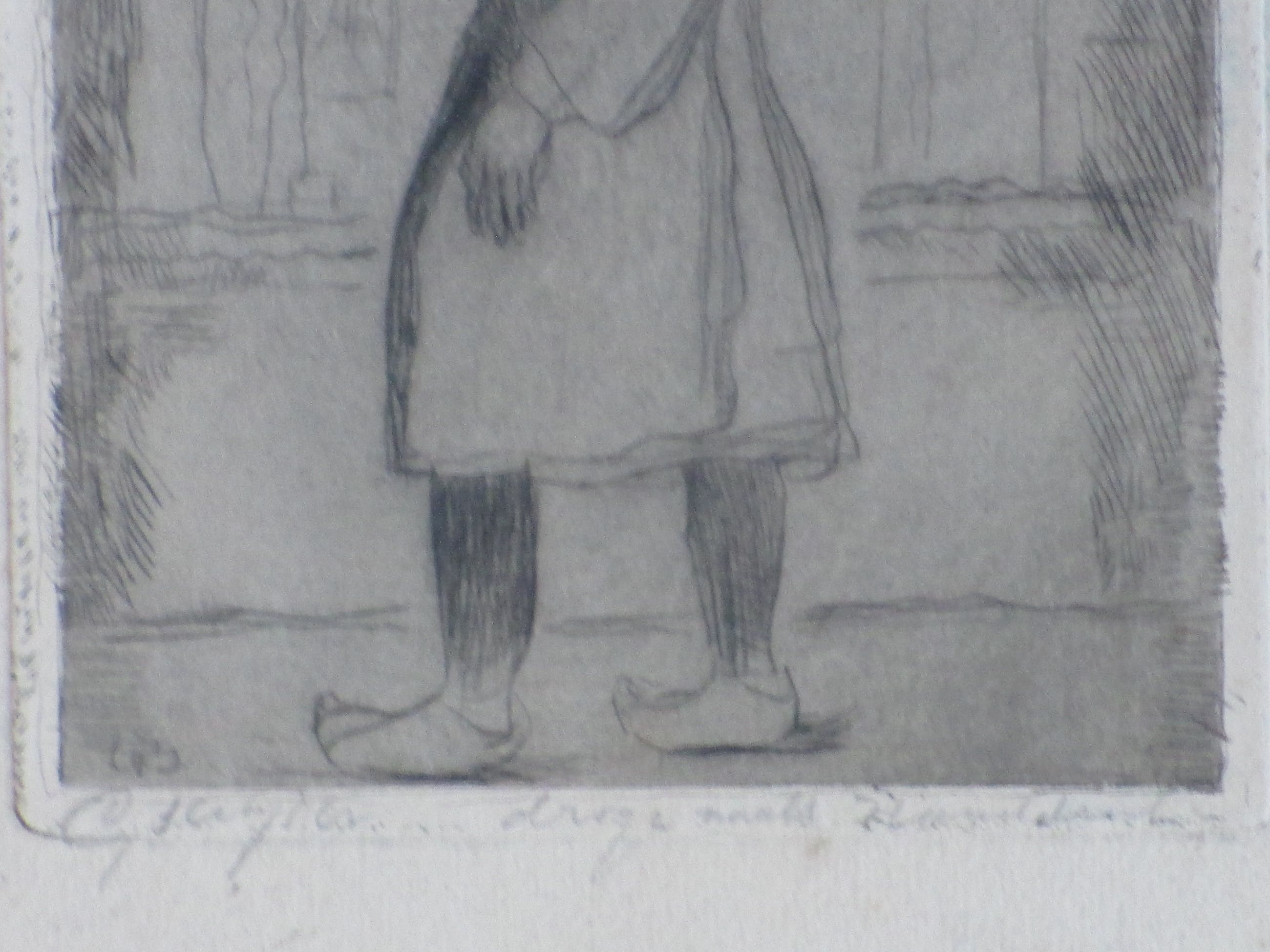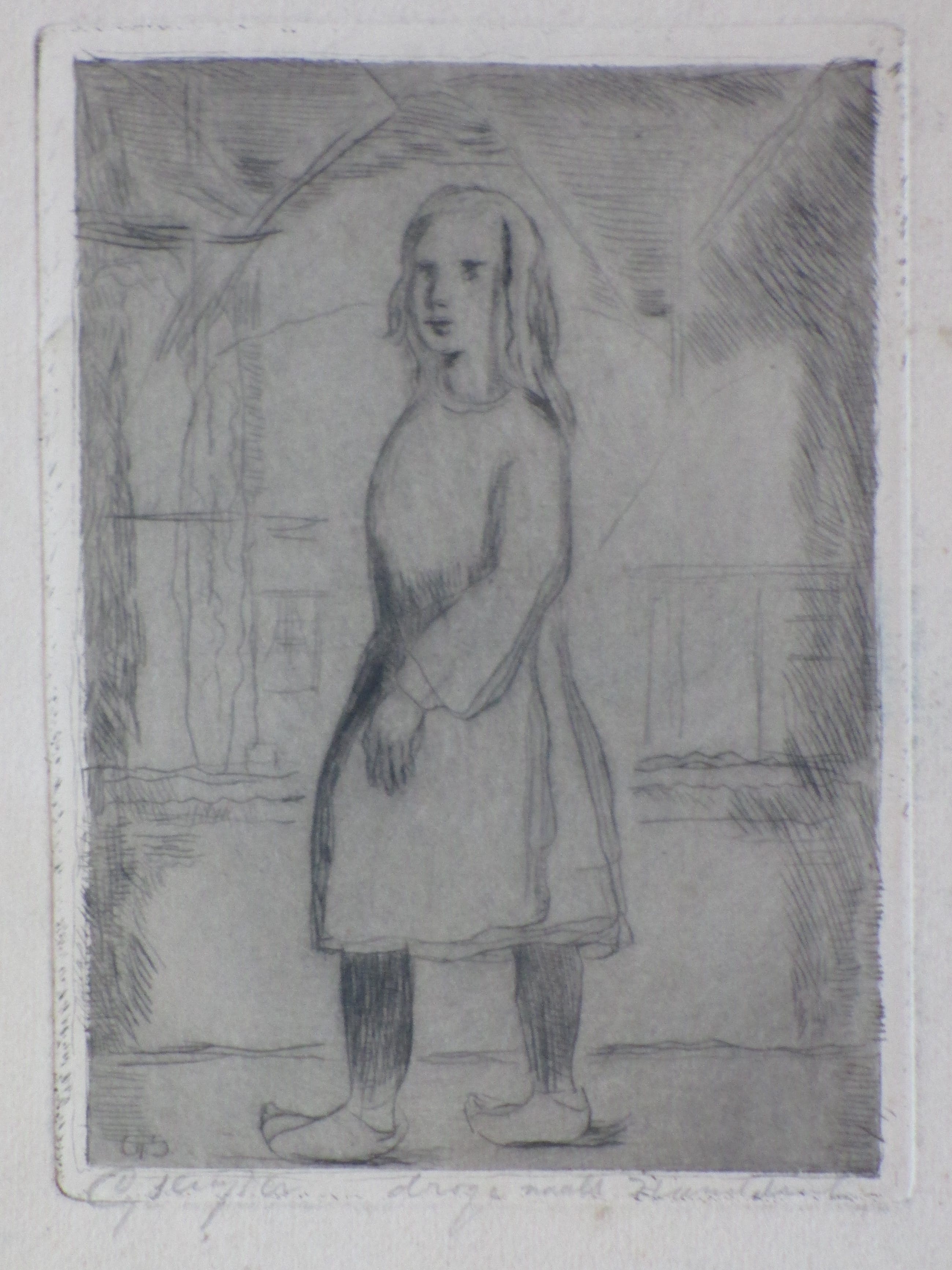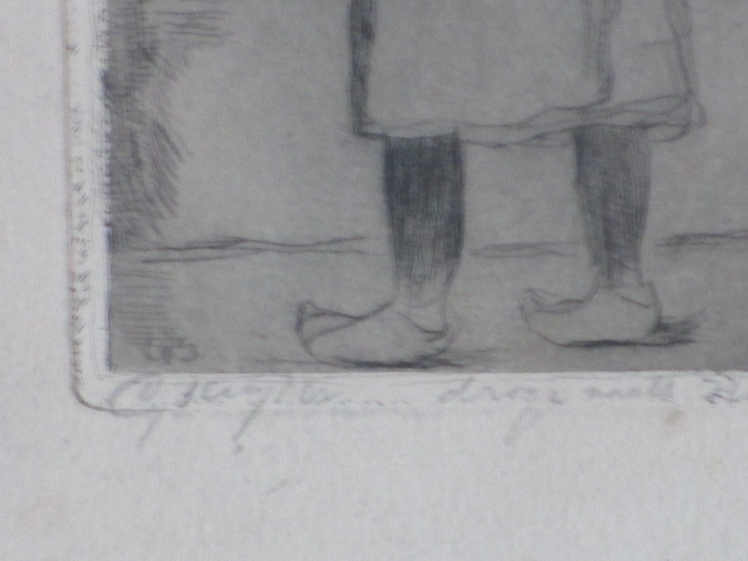 Ets door Gerard Sluijter. Voorstelling van een meisje op klompen. Losbladig, beeldmaat 13x10, bladmaat 28x20 Gesigneerd in potlood l.o.: 'Gerard Sluijter' Annotatie in potlood r.o.: 'droge naald handdruk' Authenticiteit volledig gegarandeerd