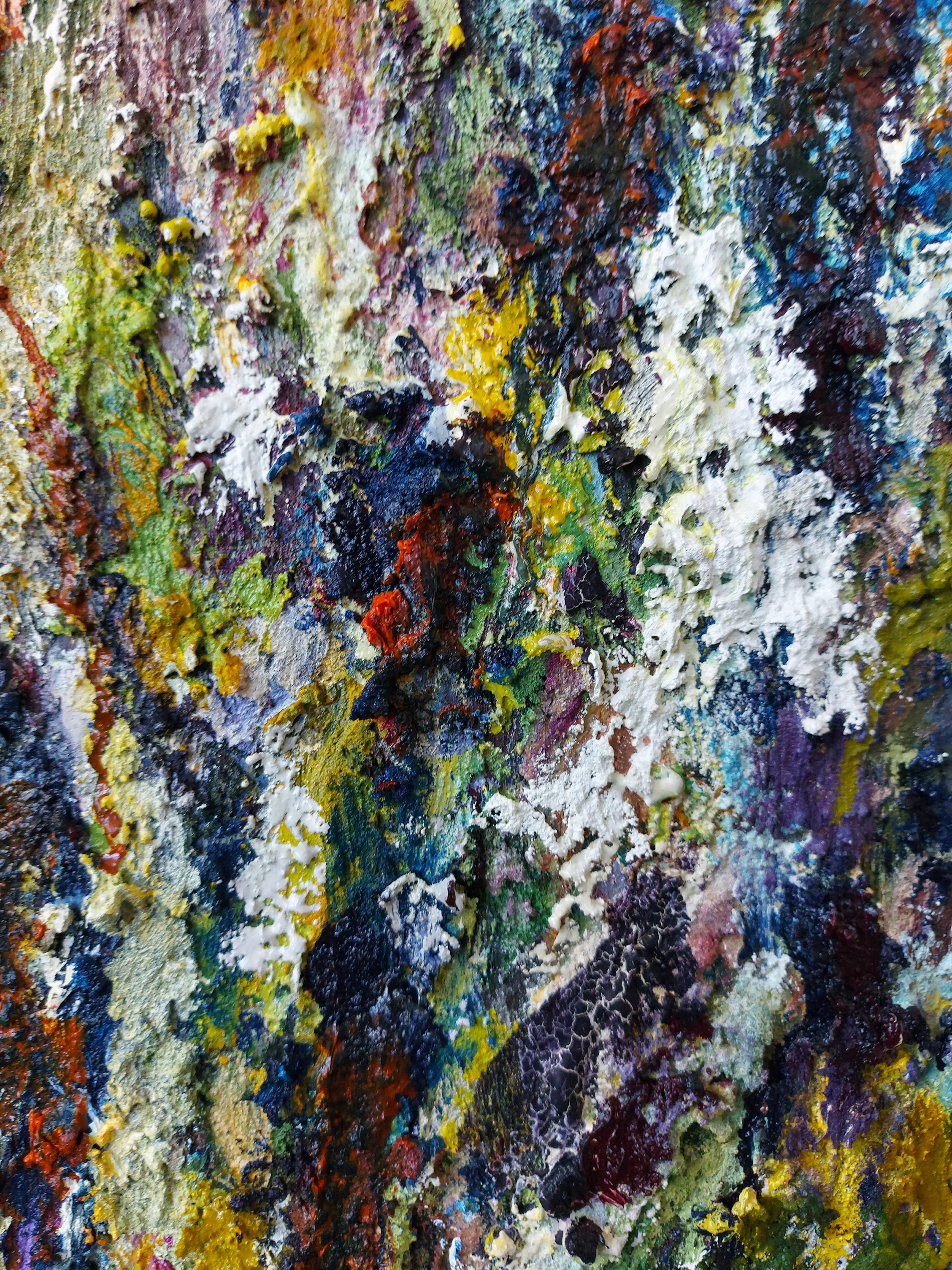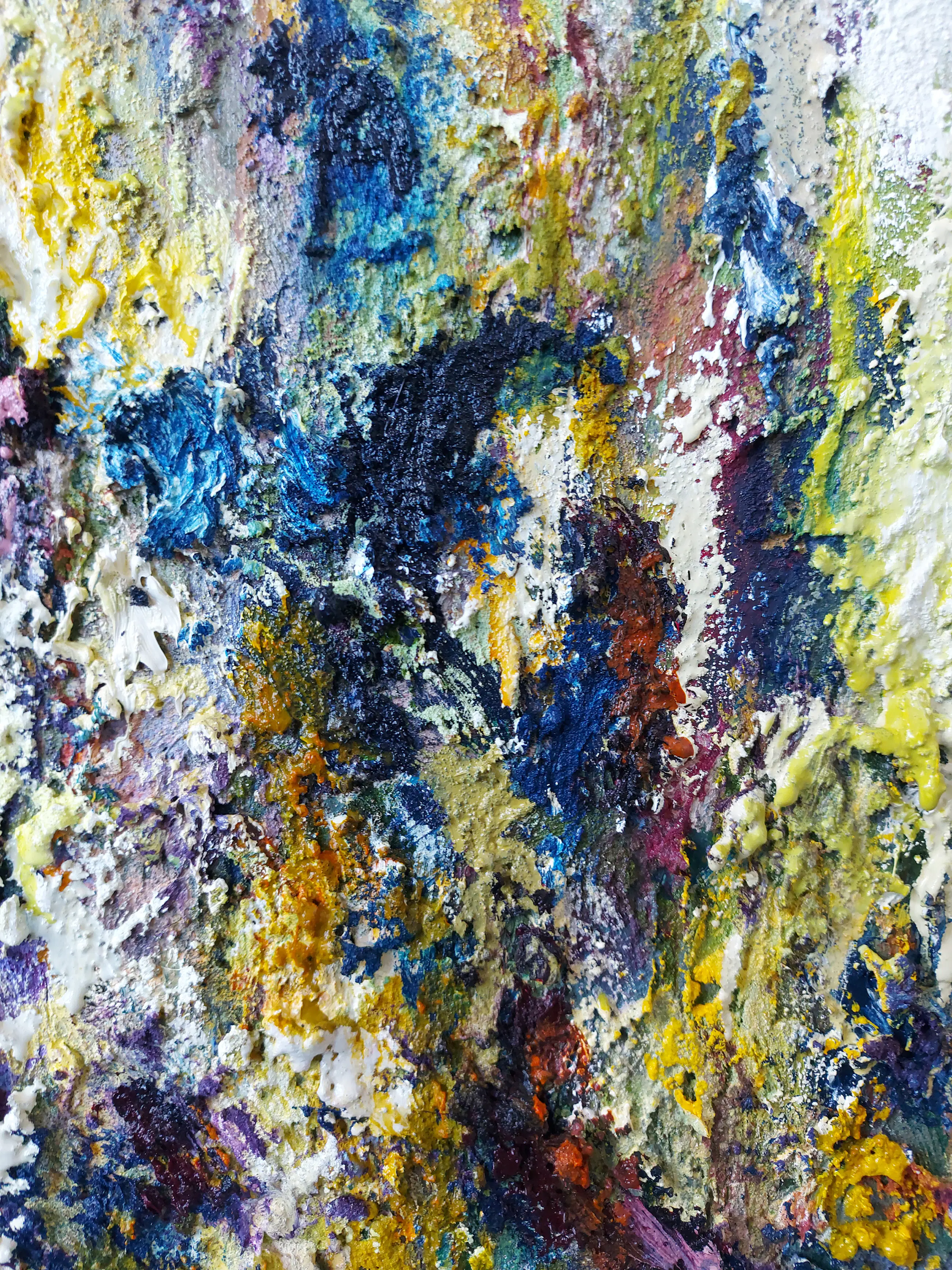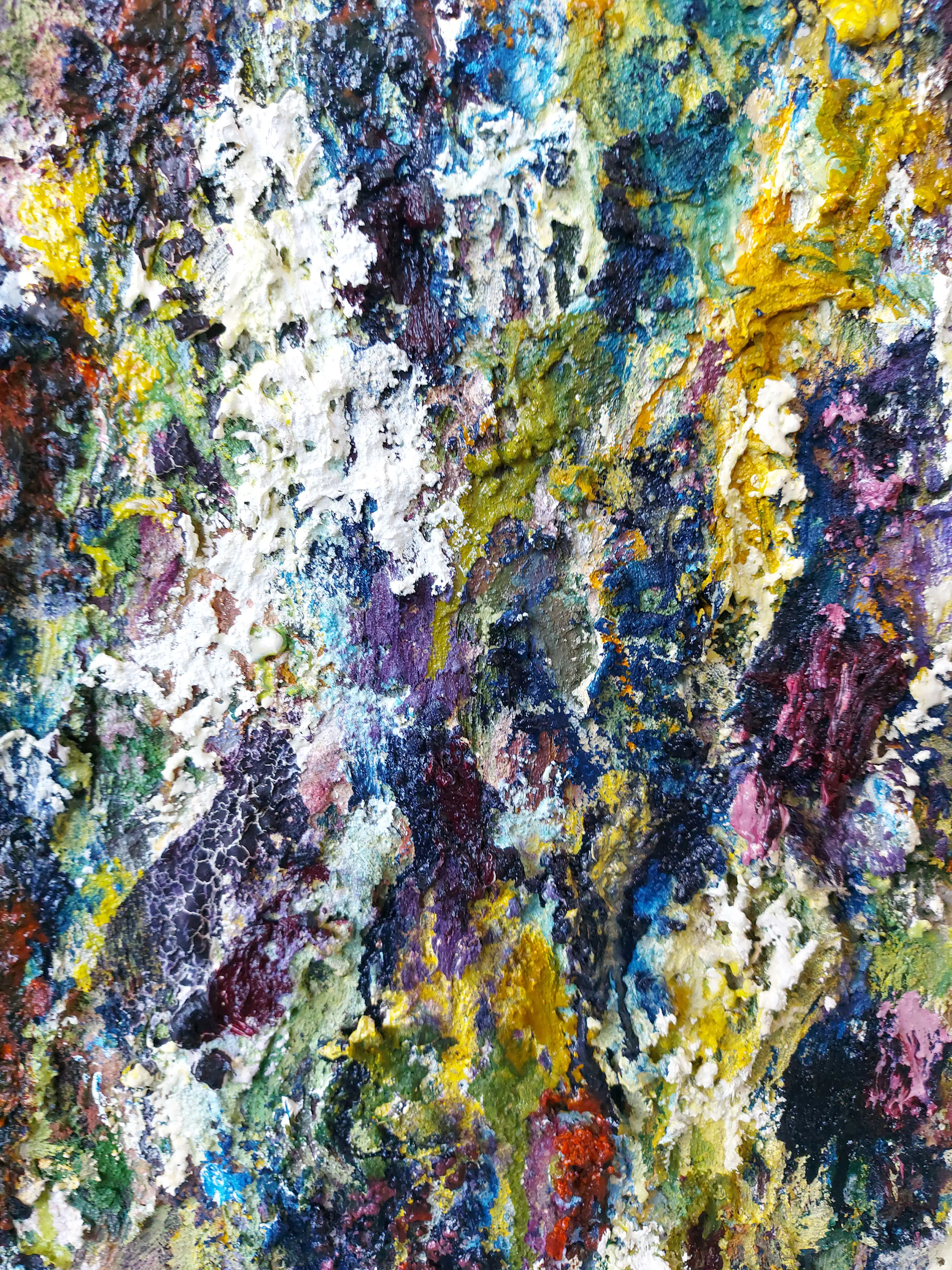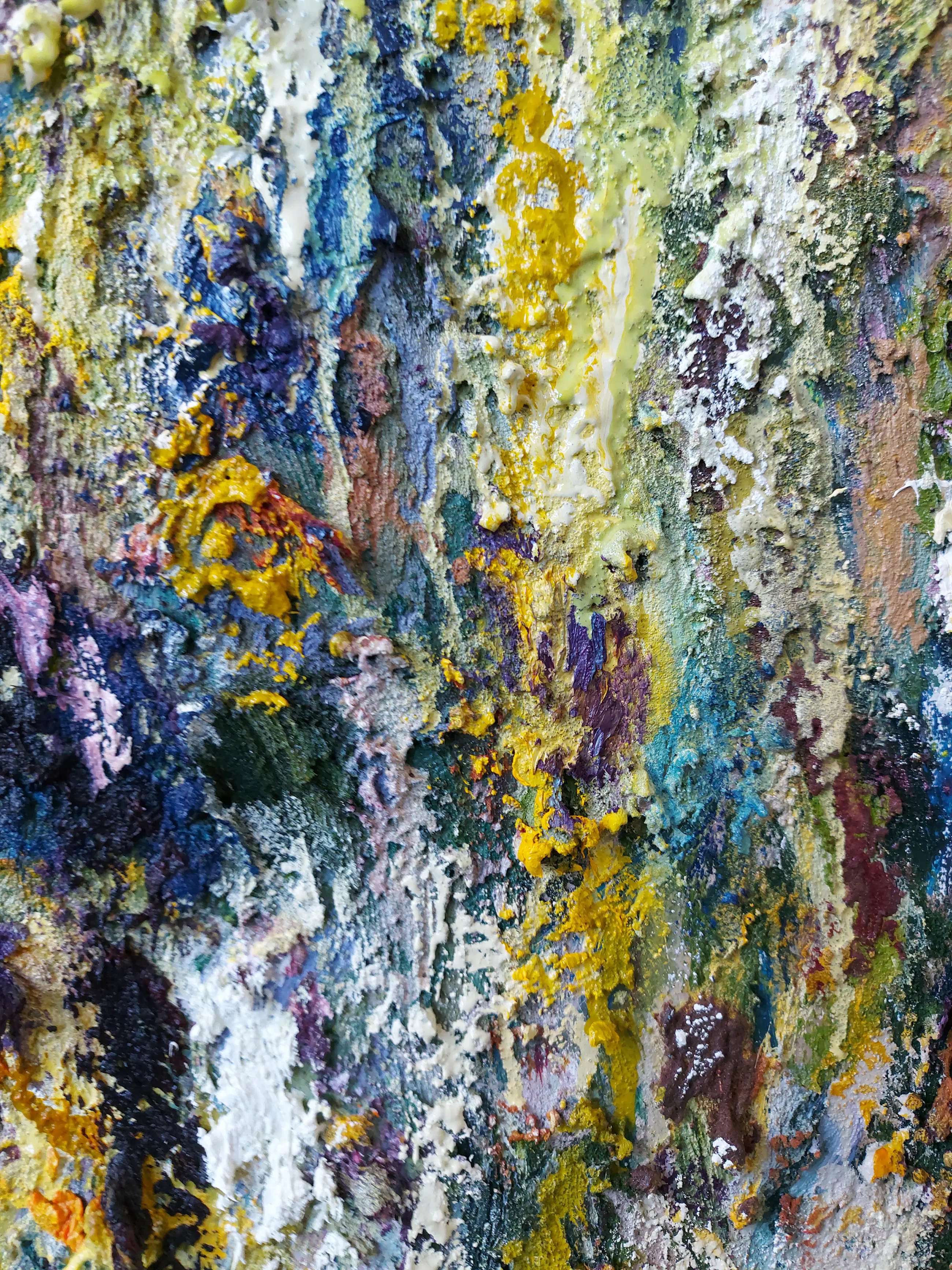 Olieverf met zand op doek. Door zijn verfbehandeling met vele vele lagen verf hebben veel van de schilderijen van Gerard Strik een bijna geboetseerde oppervlaktestructuur. Het zand dat hij aan zijn olieverf toevoegt, is niet alleen voor de structuur; het maakt zijn verf ‘aards’. Het geabstraheerde landschap wordt voelbaar.