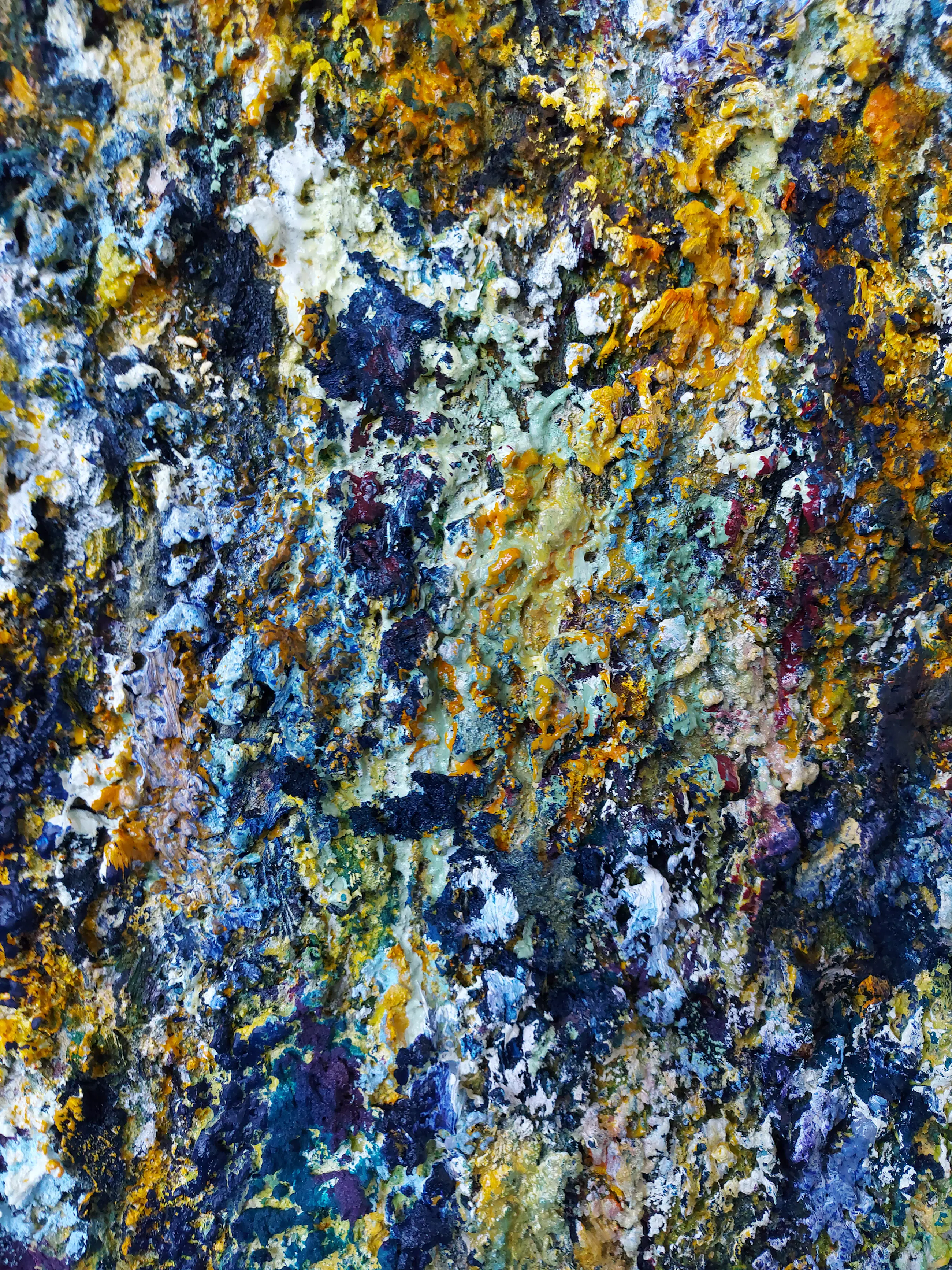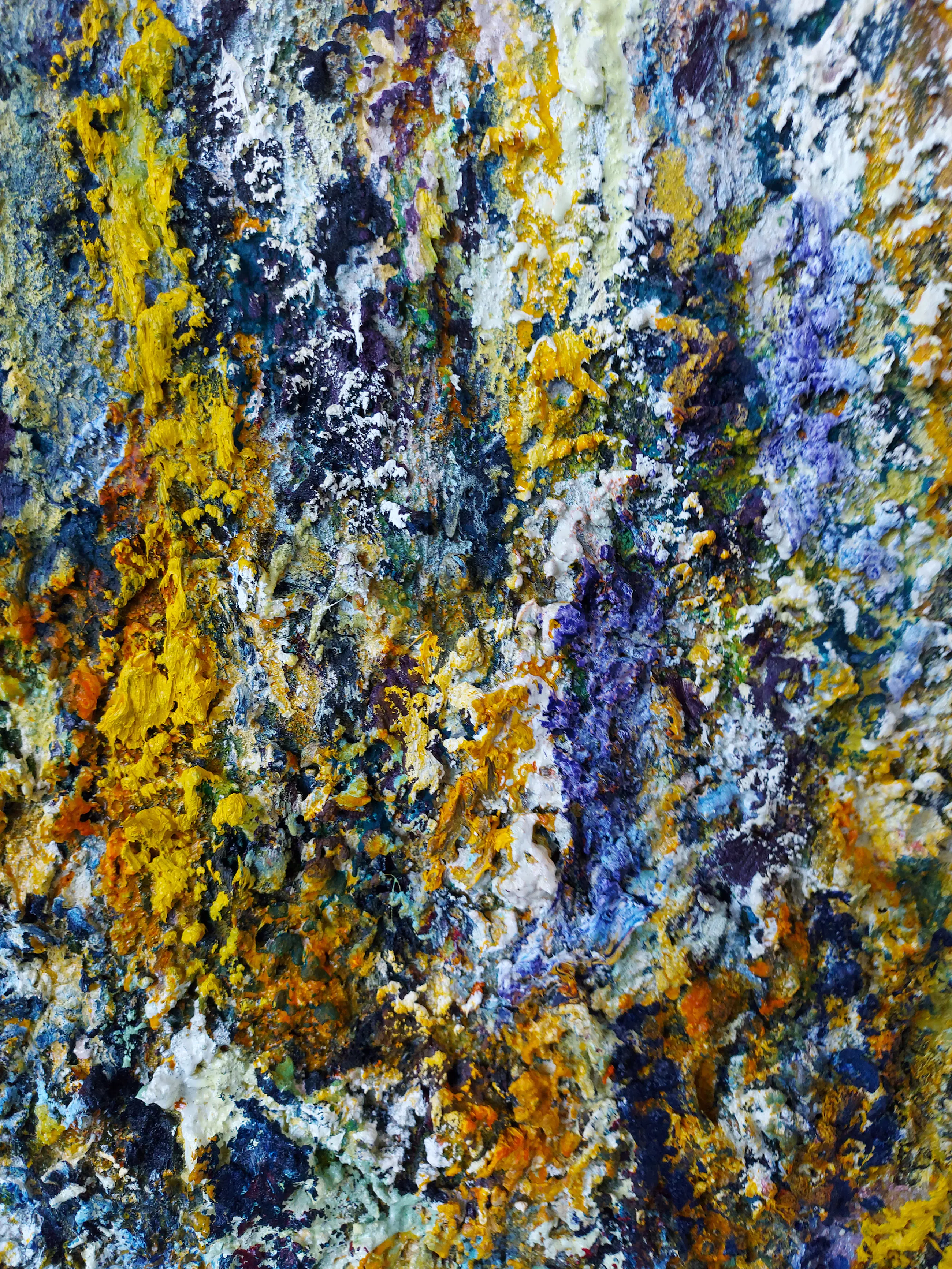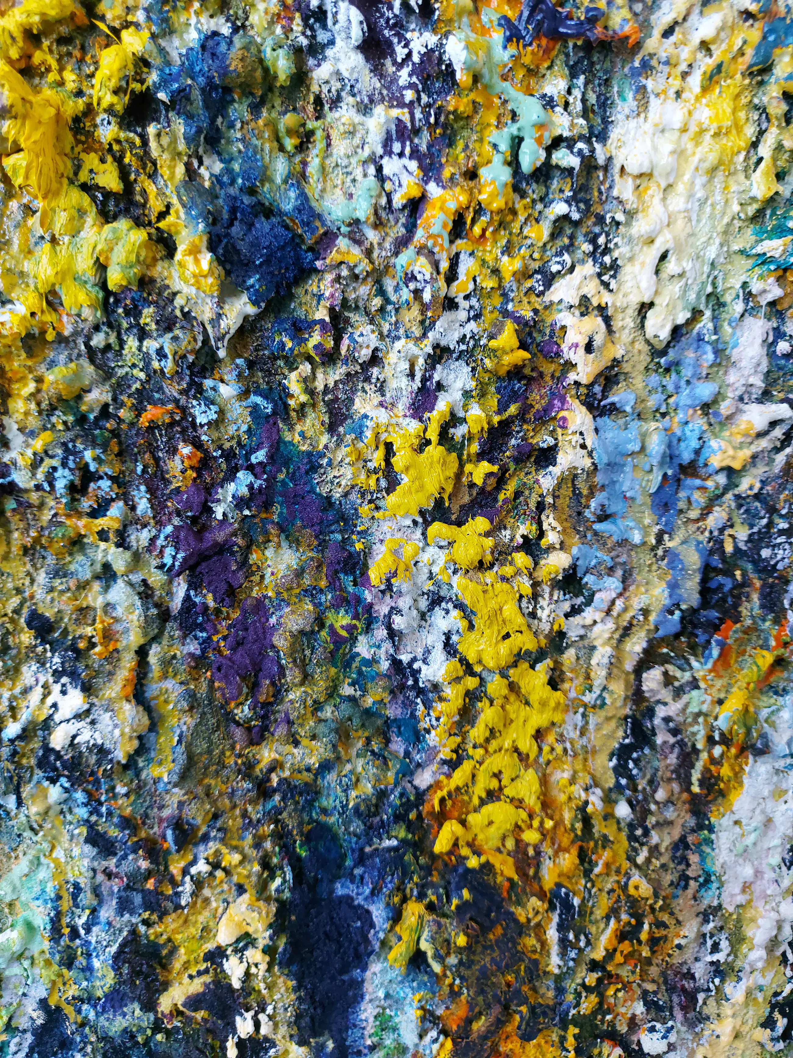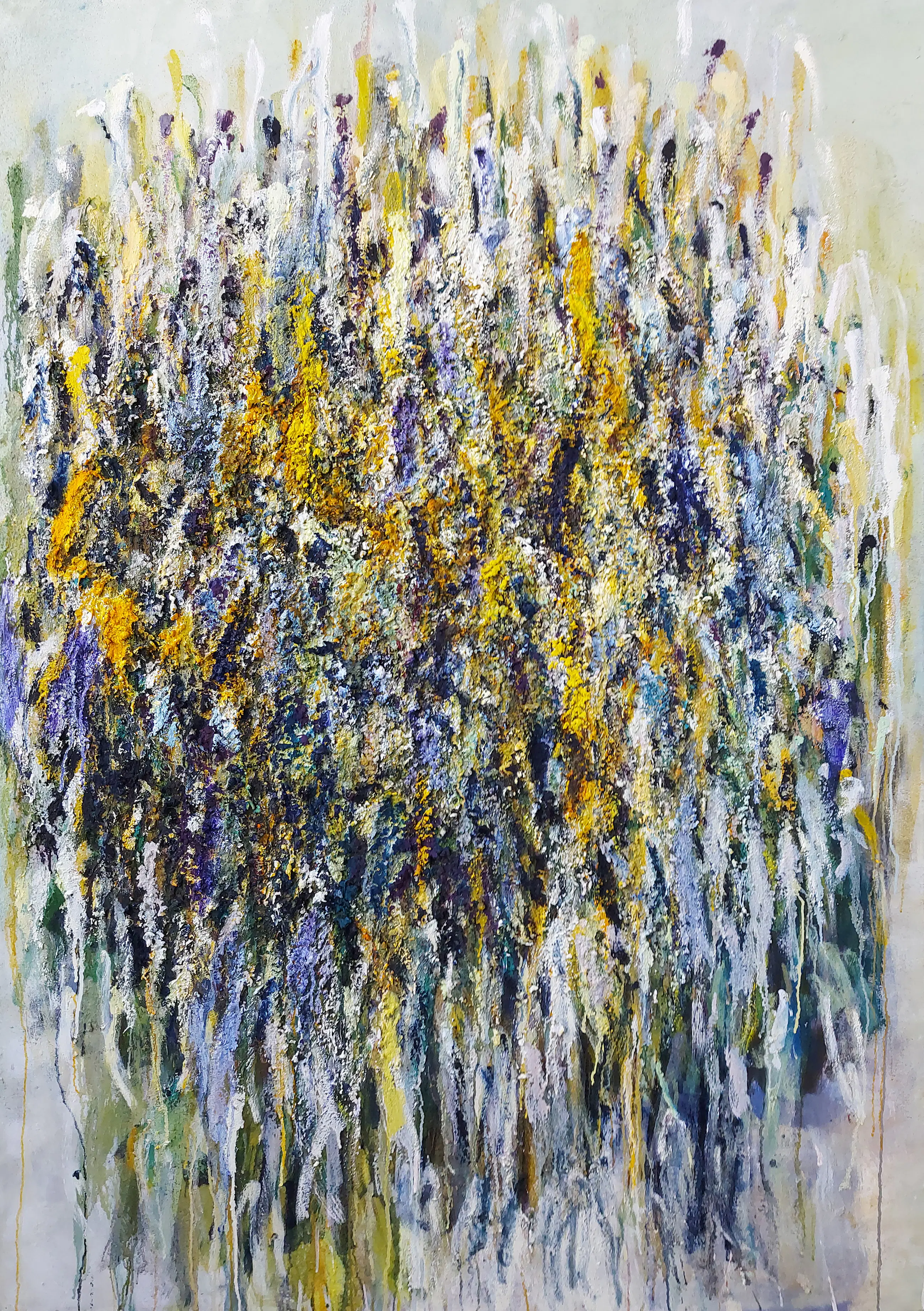 Olieverf met zand op doek. Door zijn verfbehandeling met vele vele lagen verf hebben veel van de schilderijen van Gerard Strik een bijna geboetseerde oppervlaktestructuur. Het zand dat hij aan zijn olieverf toevoegt, is niet alleen voor de structuur; het maakt zijn verf ‘aards’. Het geabstraheerde landschap wordt voelbaar.