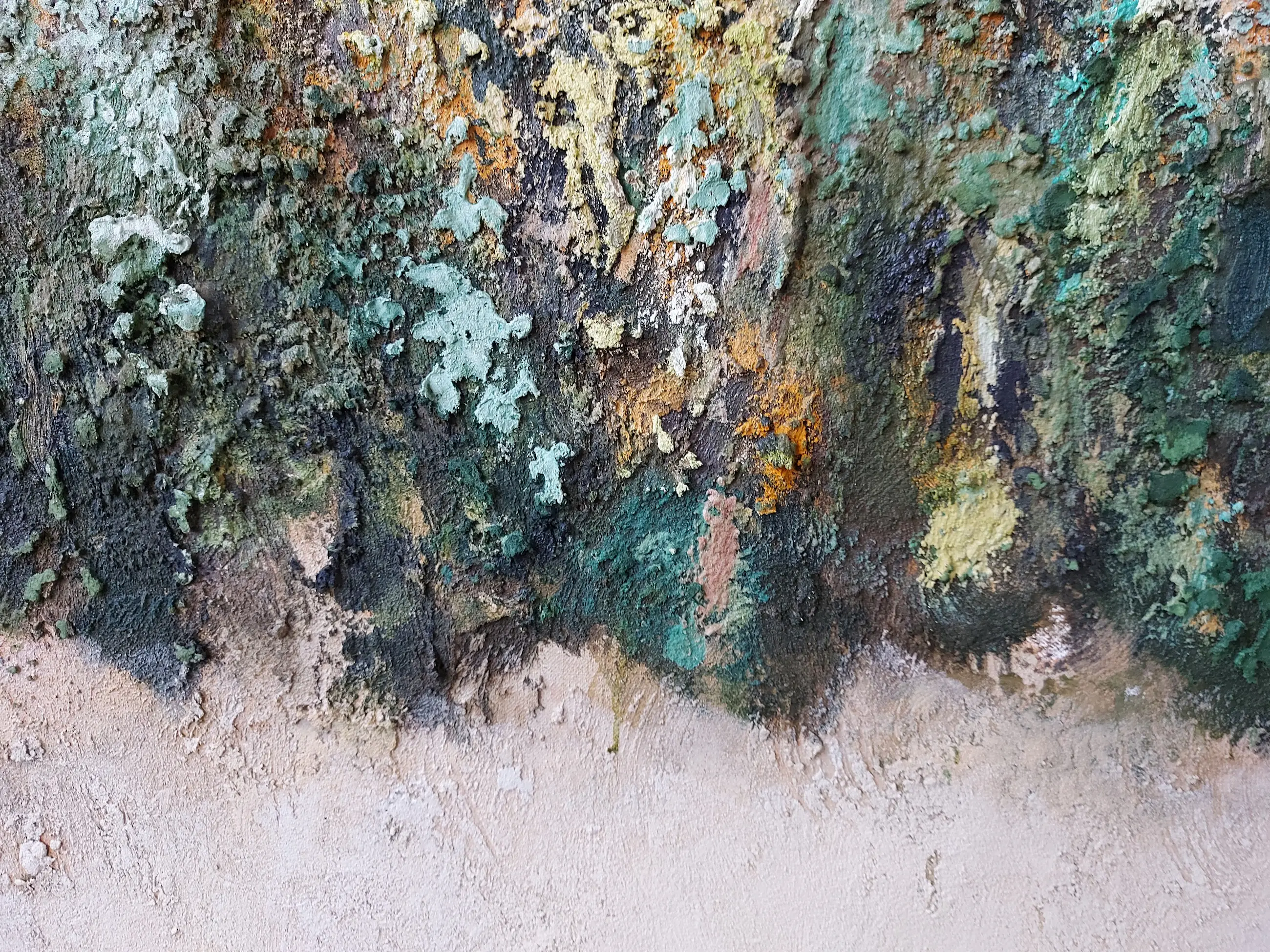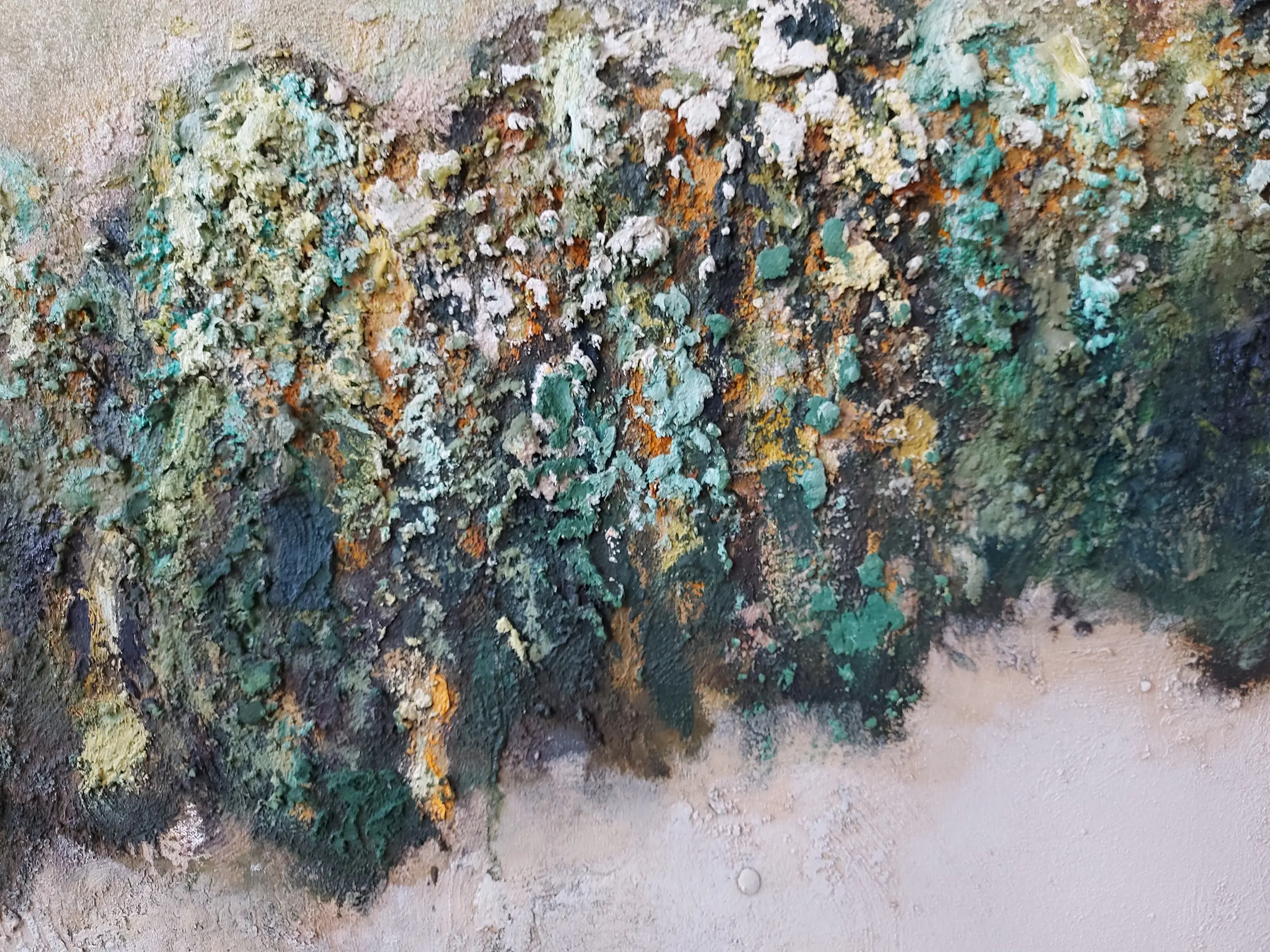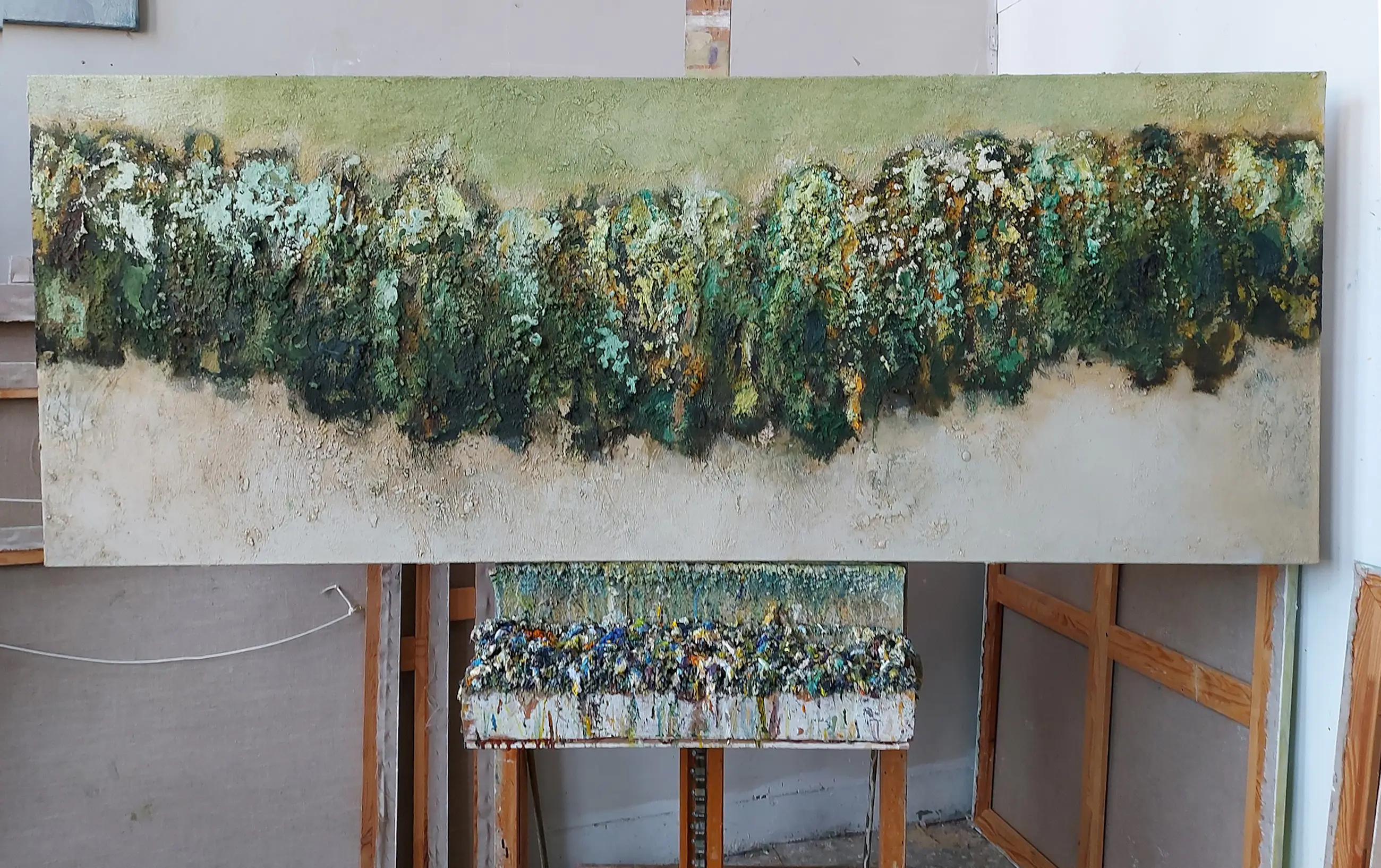 Olieverf met zand op doek. Door zijn verfbehandeling met vele vele lagen verf hebben veel van de schilderijen van Gerard Strik een bijna geboetseerde oppervlaktestructuur. Het zand dat hij aan zijn olieverf toevoegt, is niet alleen voor de structuur; het maakt zijn verf ‘aards’. Het geabstraheerde landschap wordt voelbaar.