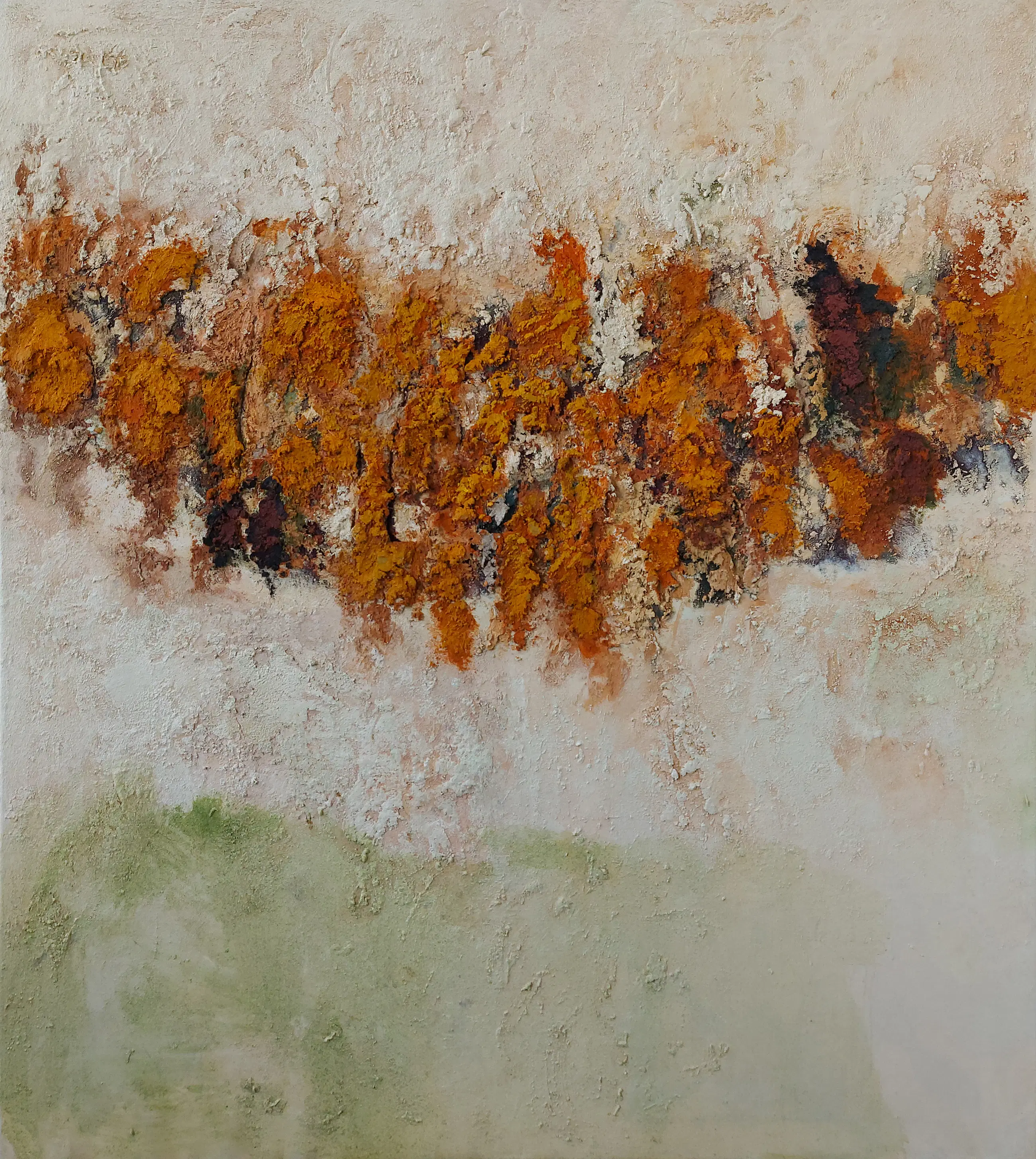 Olieverf met zand op doek. Door zijn verfbehandeling met vele vele lagen verf hebben veel van de schilderijen van Gerard Strik een bijna geboetseerde oppervlaktestructuur. Het zand dat hij aan zijn olieverf toevoegt, is niet alleen voor de structuur; het maakt zijn verf ‘aards’. Het geabstraheerde landschap wordt voelbaar.
