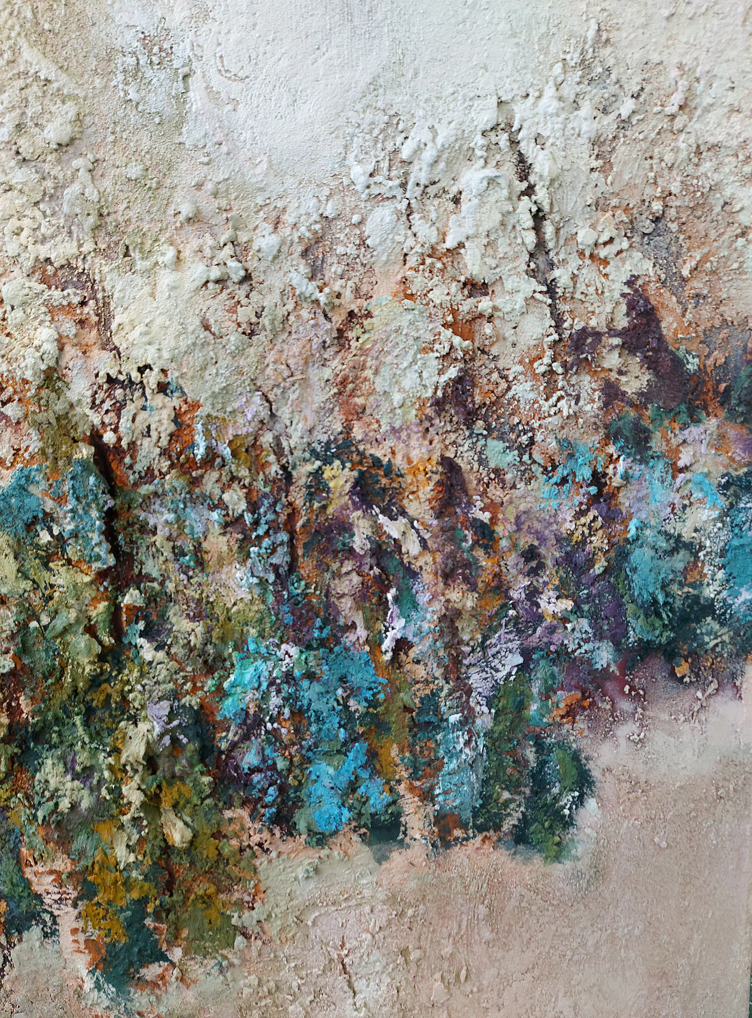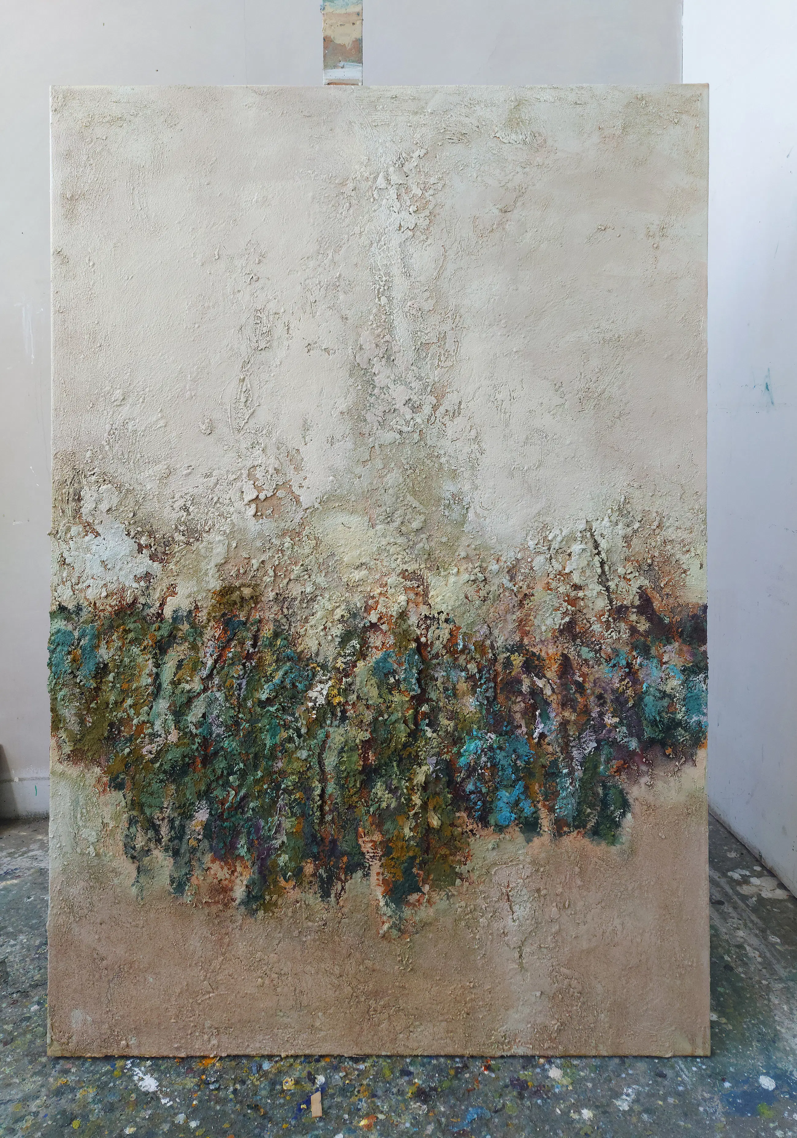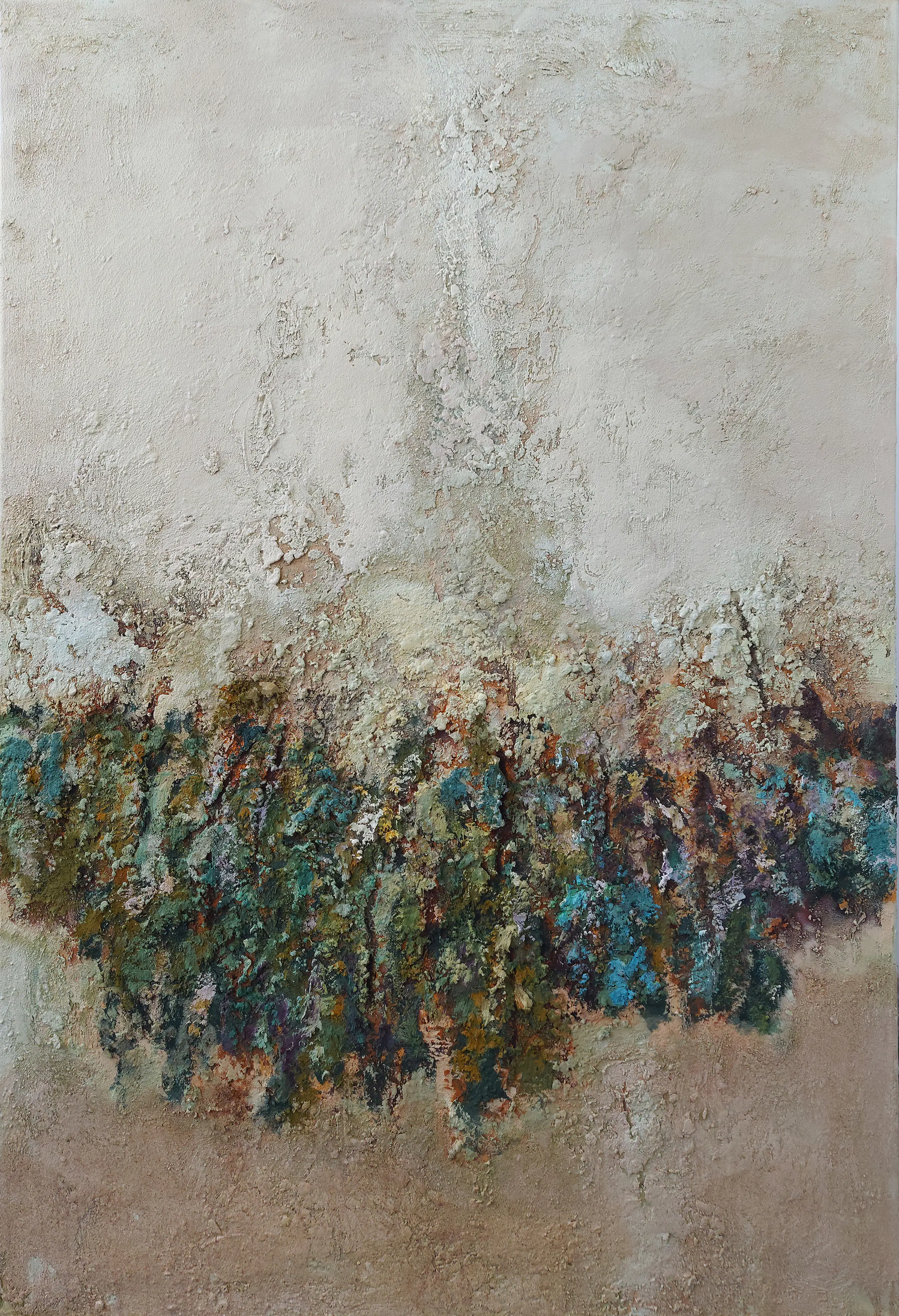 Olieverf met zand op doek. Door zijn verfbehandeling met vele vele lagen verf hebben veel van de schilderijen van Gerard Strik een bijna geboetseerde oppervlaktestructuur. Het zand dat hij aan zijn olieverf toevoegt, is niet alleen voor de structuur; het maakt zijn verf ‘aards’. Het geabstraheerde landschap wordt voelbaar.