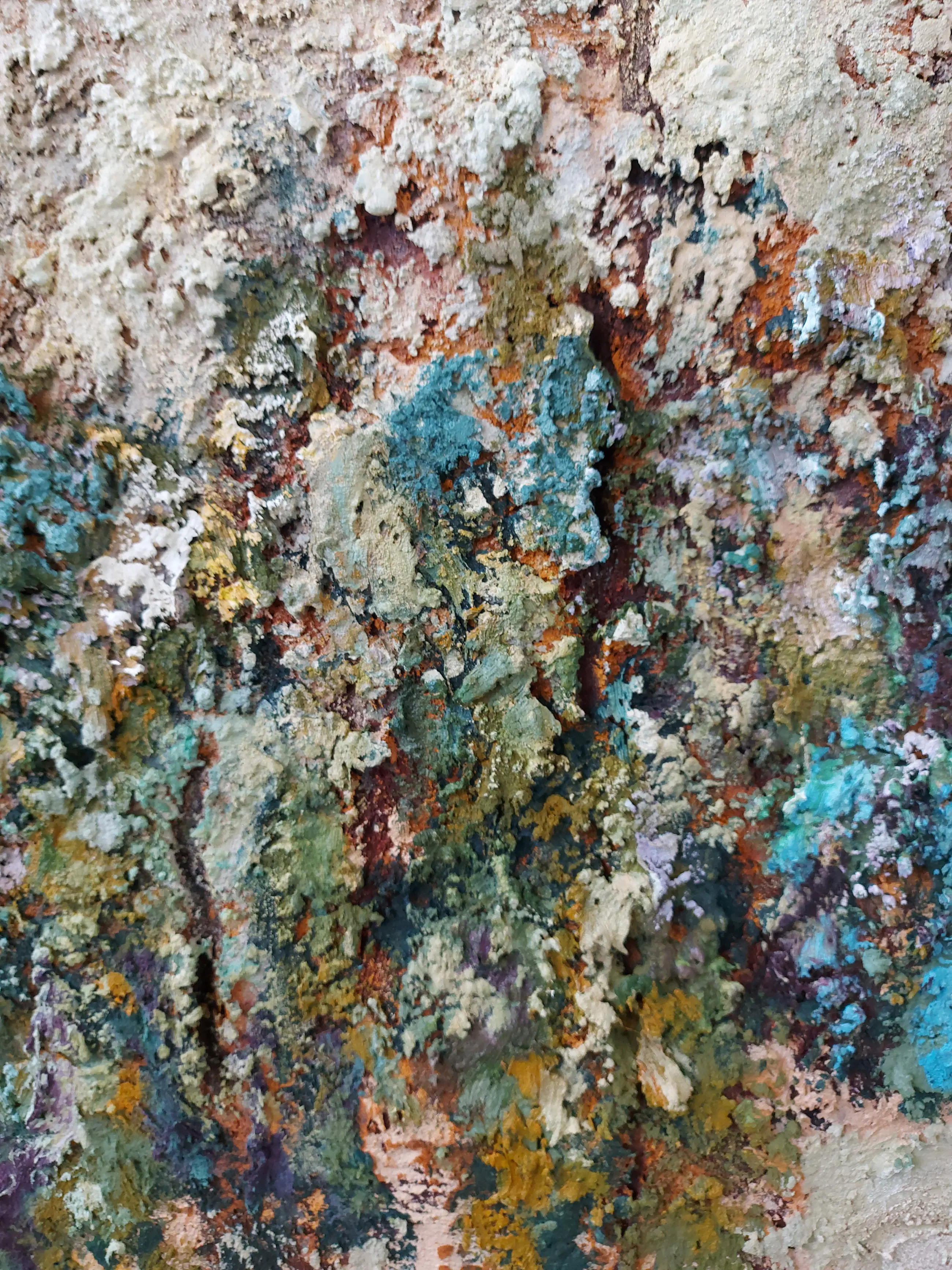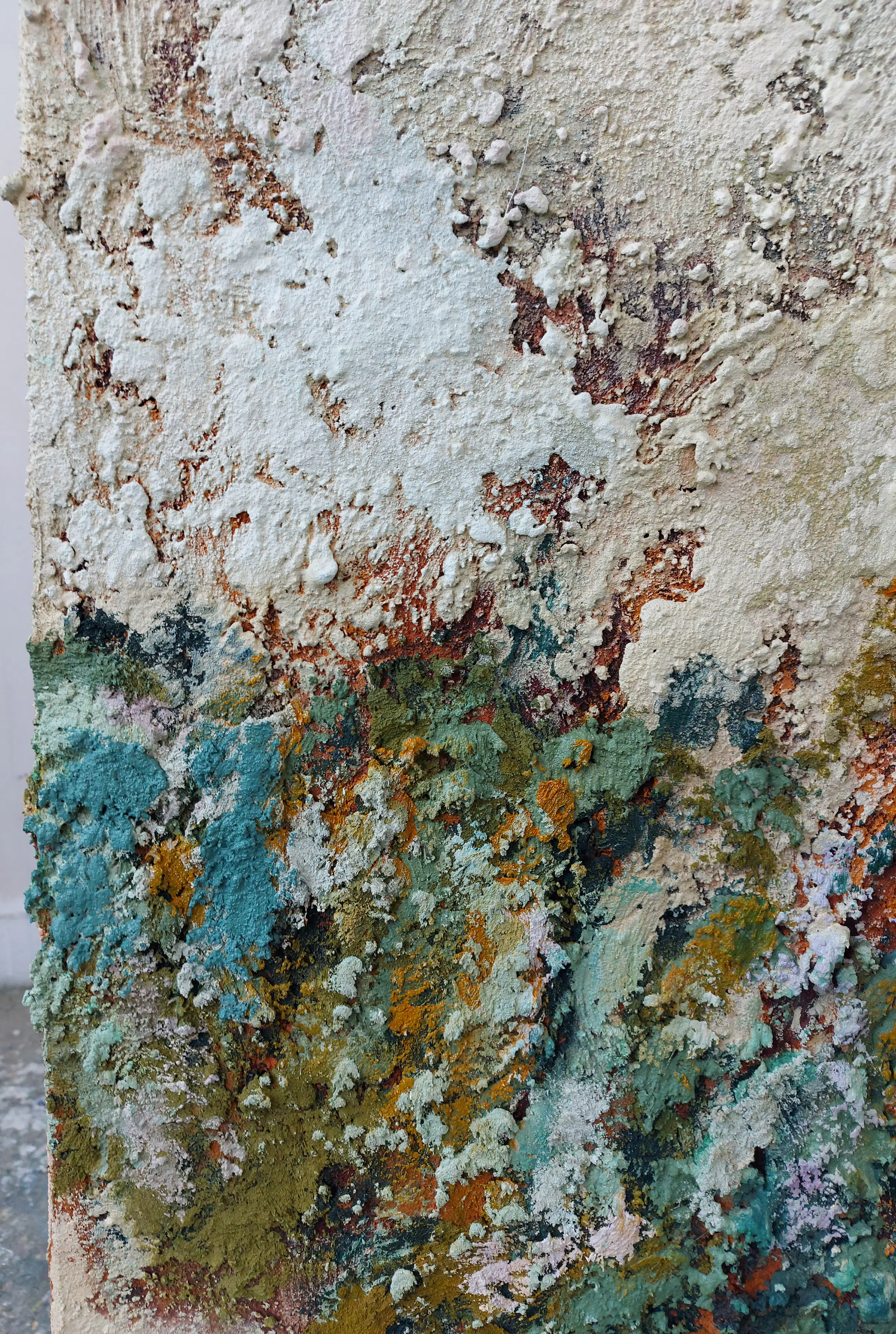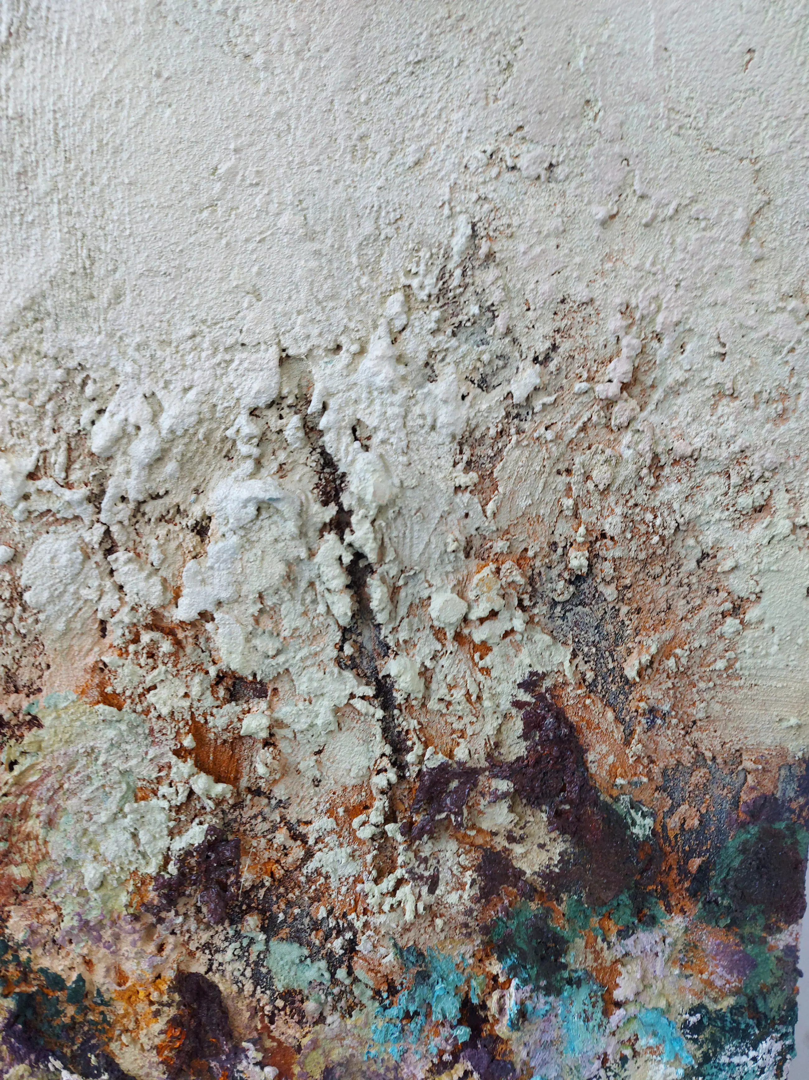 Olieverf met zand op doek. Door zijn verfbehandeling met vele vele lagen verf hebben veel van de schilderijen van Gerard Strik een bijna geboetseerde oppervlaktestructuur. Het zand dat hij aan zijn olieverf toevoegt, is niet alleen voor de structuur; het maakt zijn verf ‘aards’. Het geabstraheerde landschap wordt voelbaar.