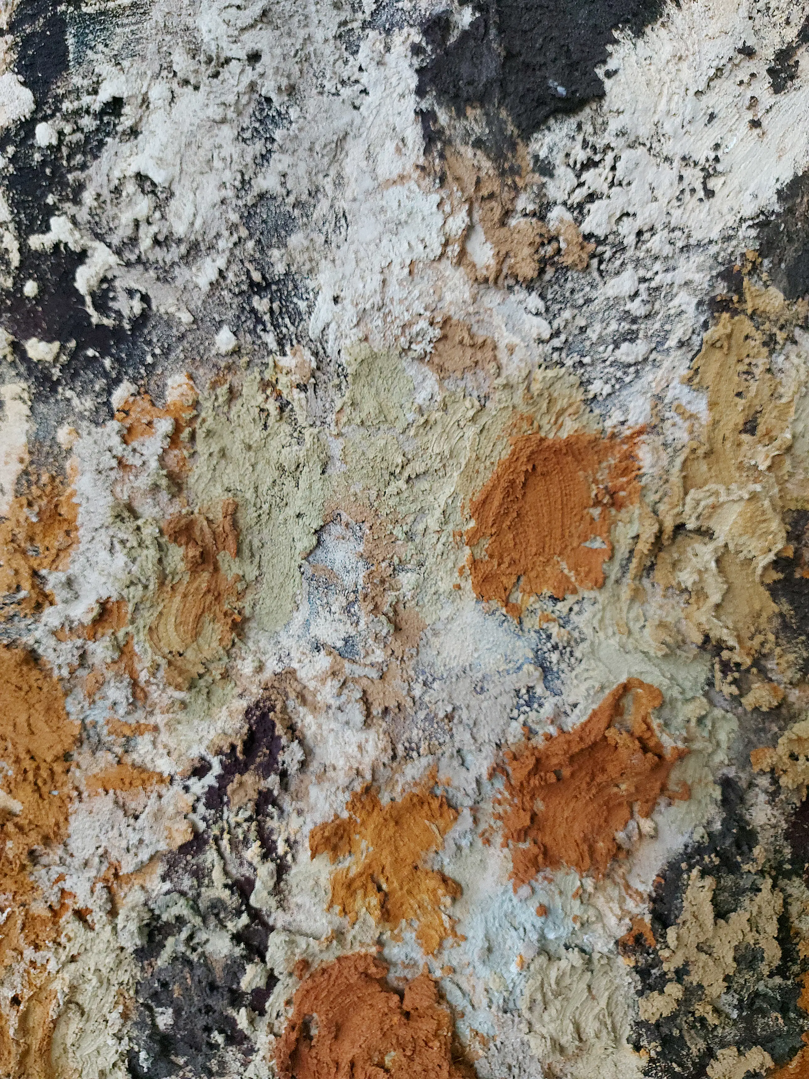 Olieverf met zand op doek. Door zijn verfbehandeling met vele vele lagen verf hebben veel van de schilderijen van Gerard Strik een bijna geboetseerde oppervlaktestructuur. Het zand dat hij aan zijn olieverf toevoegt, is niet alleen voor de structuur; het maakt zijn verf ‘aards’. Het geabstraheerde landschap wordt voelbaar.