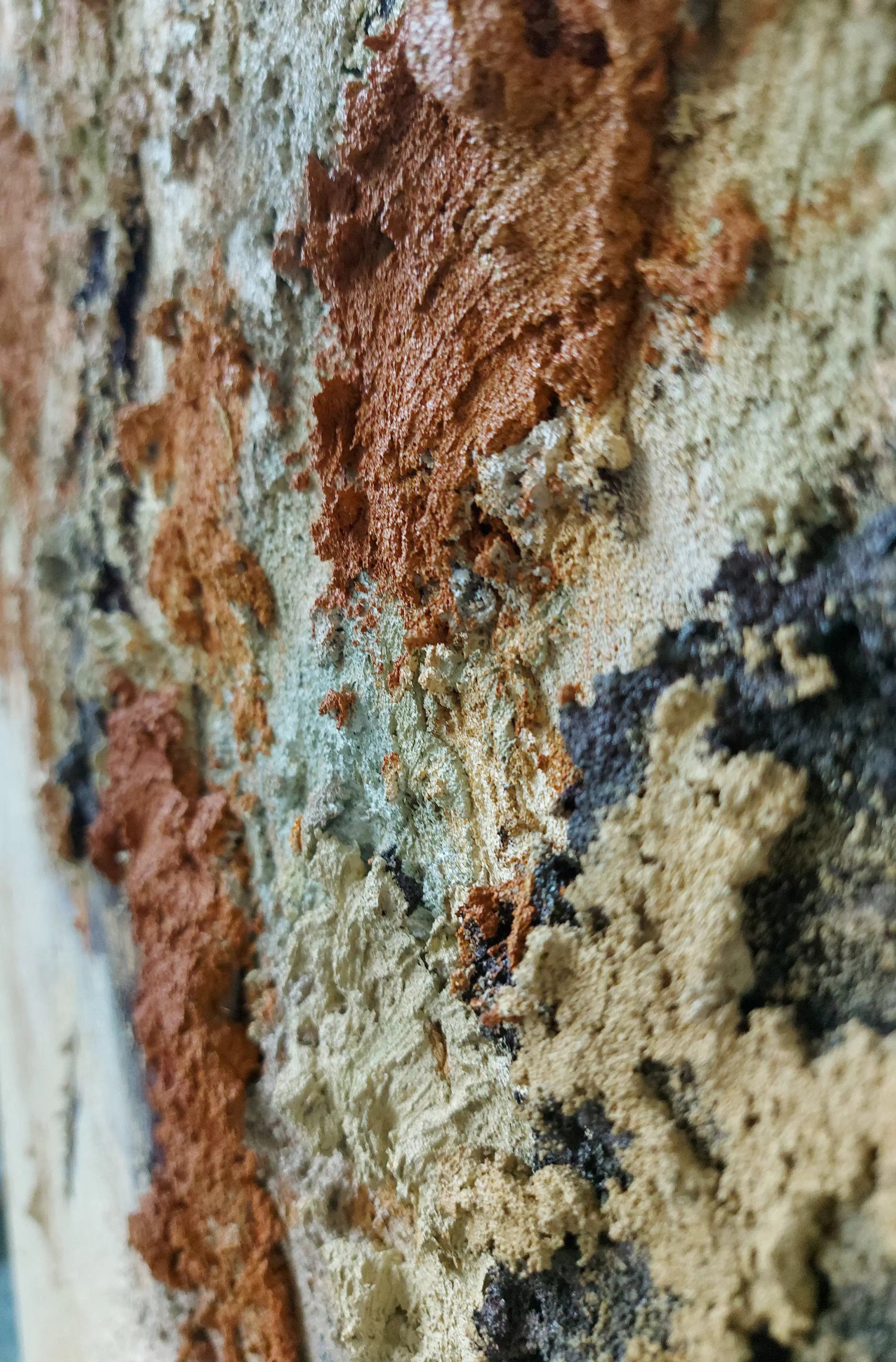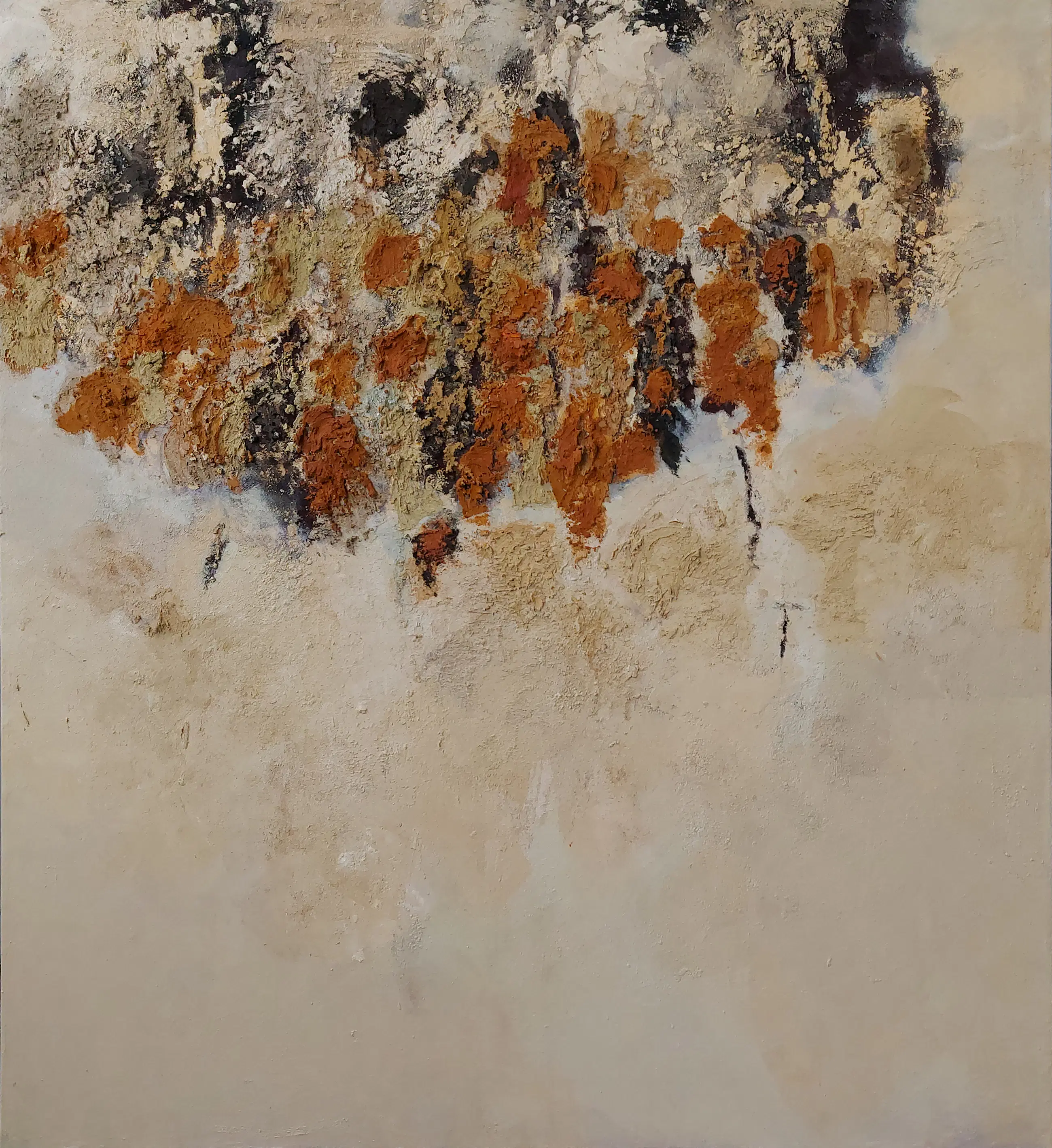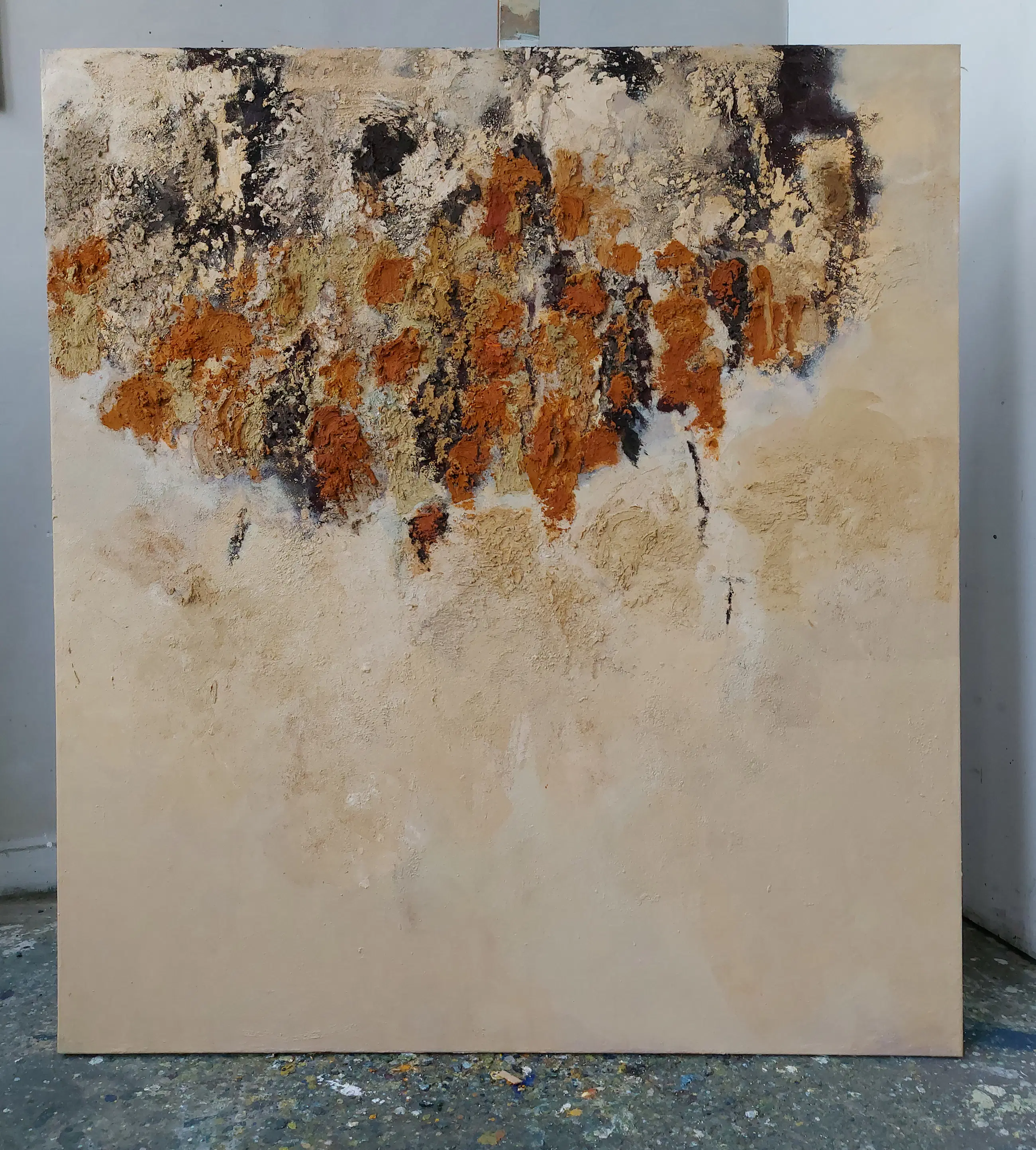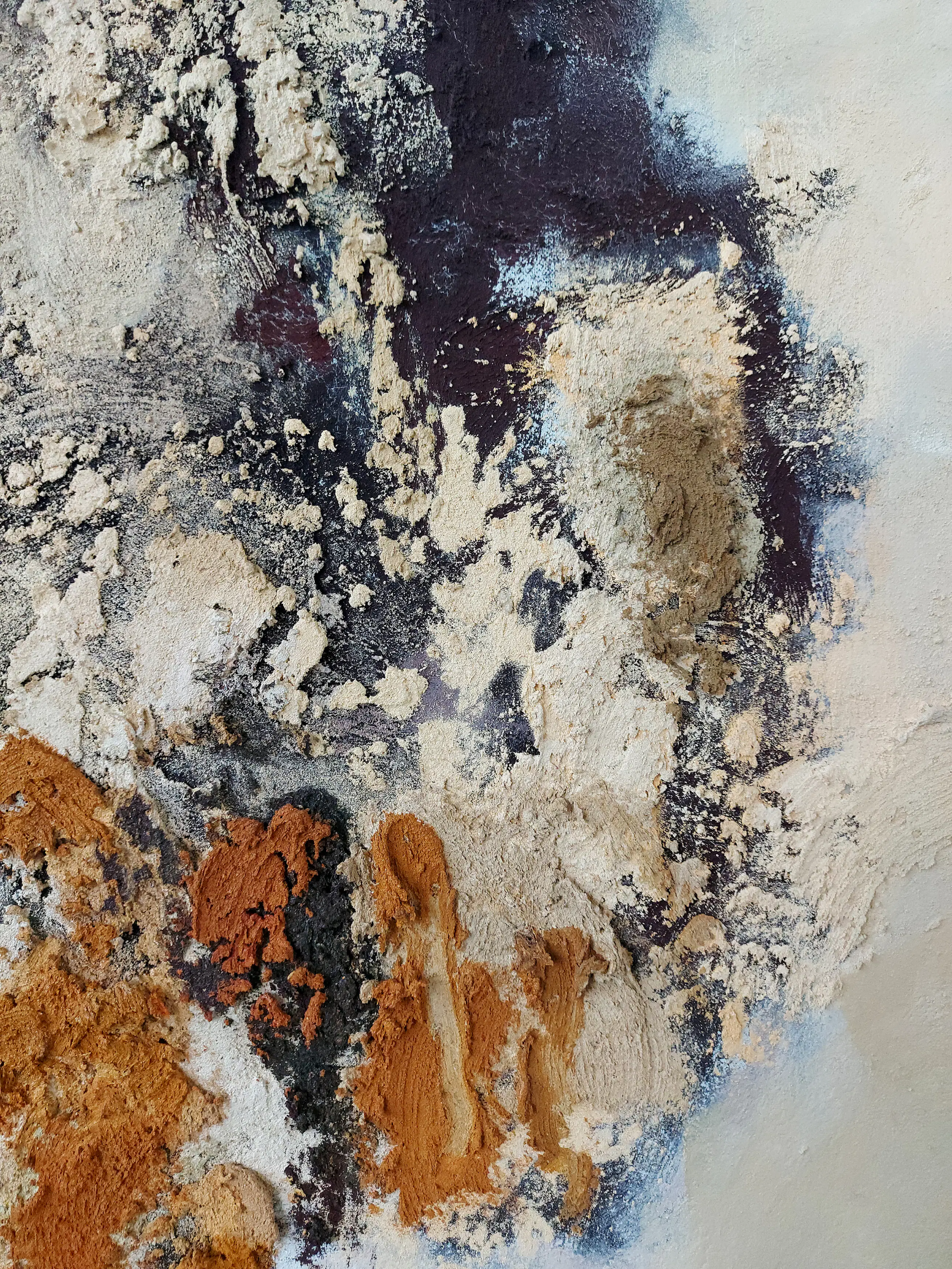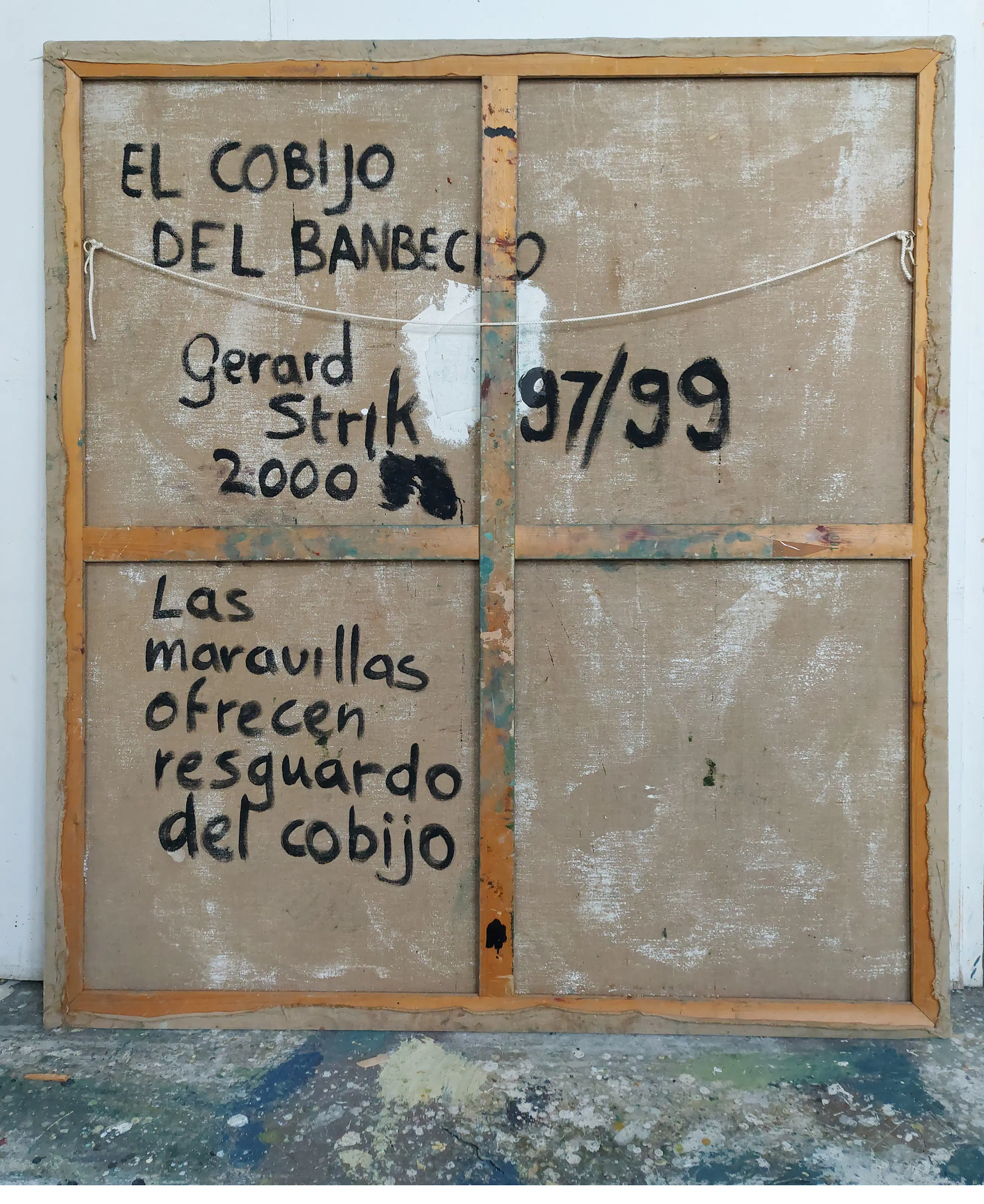 Olieverf met zand op doek. Door zijn verfbehandeling met vele vele lagen verf hebben veel van de schilderijen van Gerard Strik een bijna geboetseerde oppervlaktestructuur. Het zand dat hij aan zijn olieverf toevoegt, is niet alleen voor de structuur; het maakt zijn verf ‘aards’. Het geabstraheerde landschap wordt voelbaar.