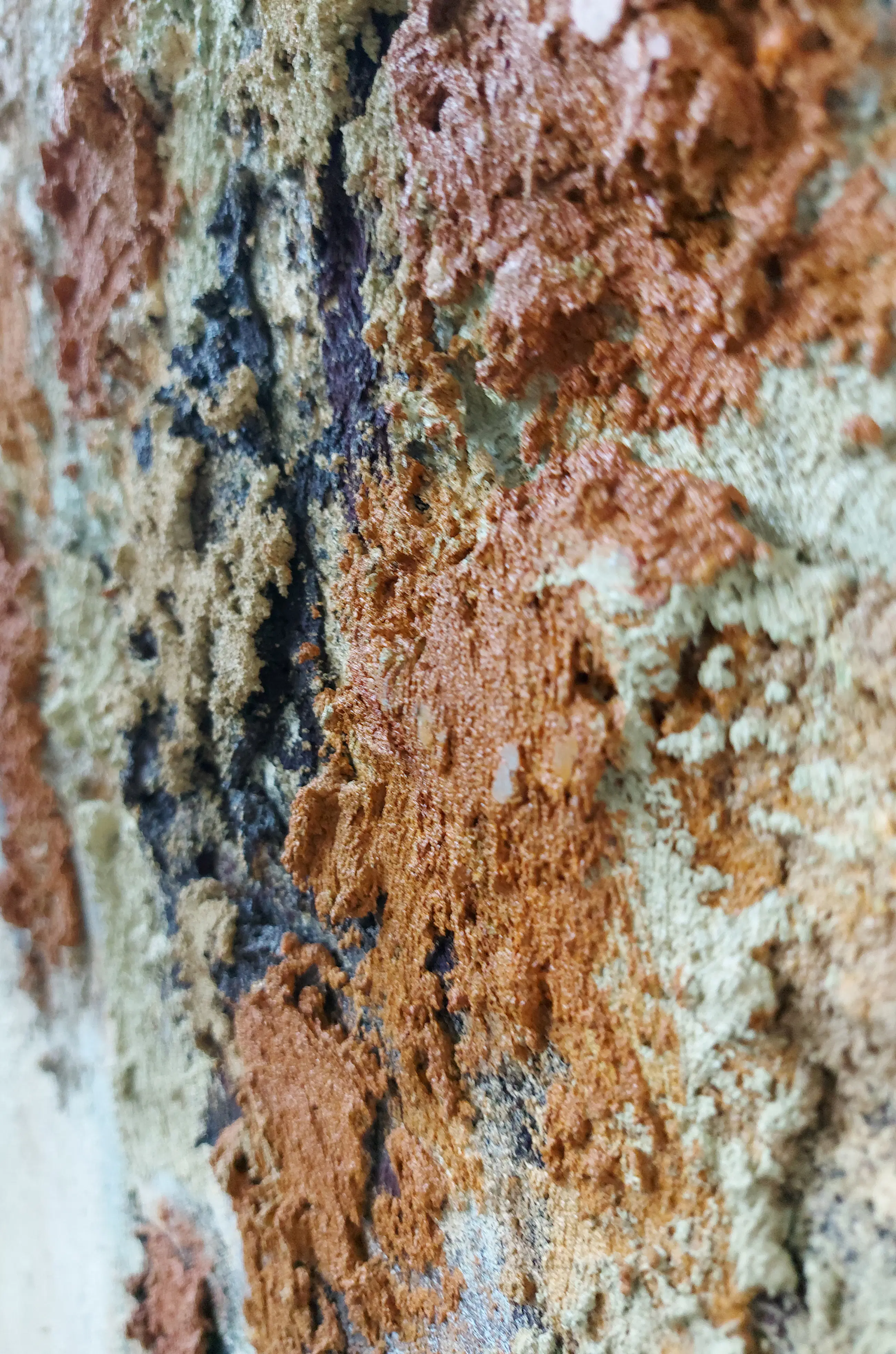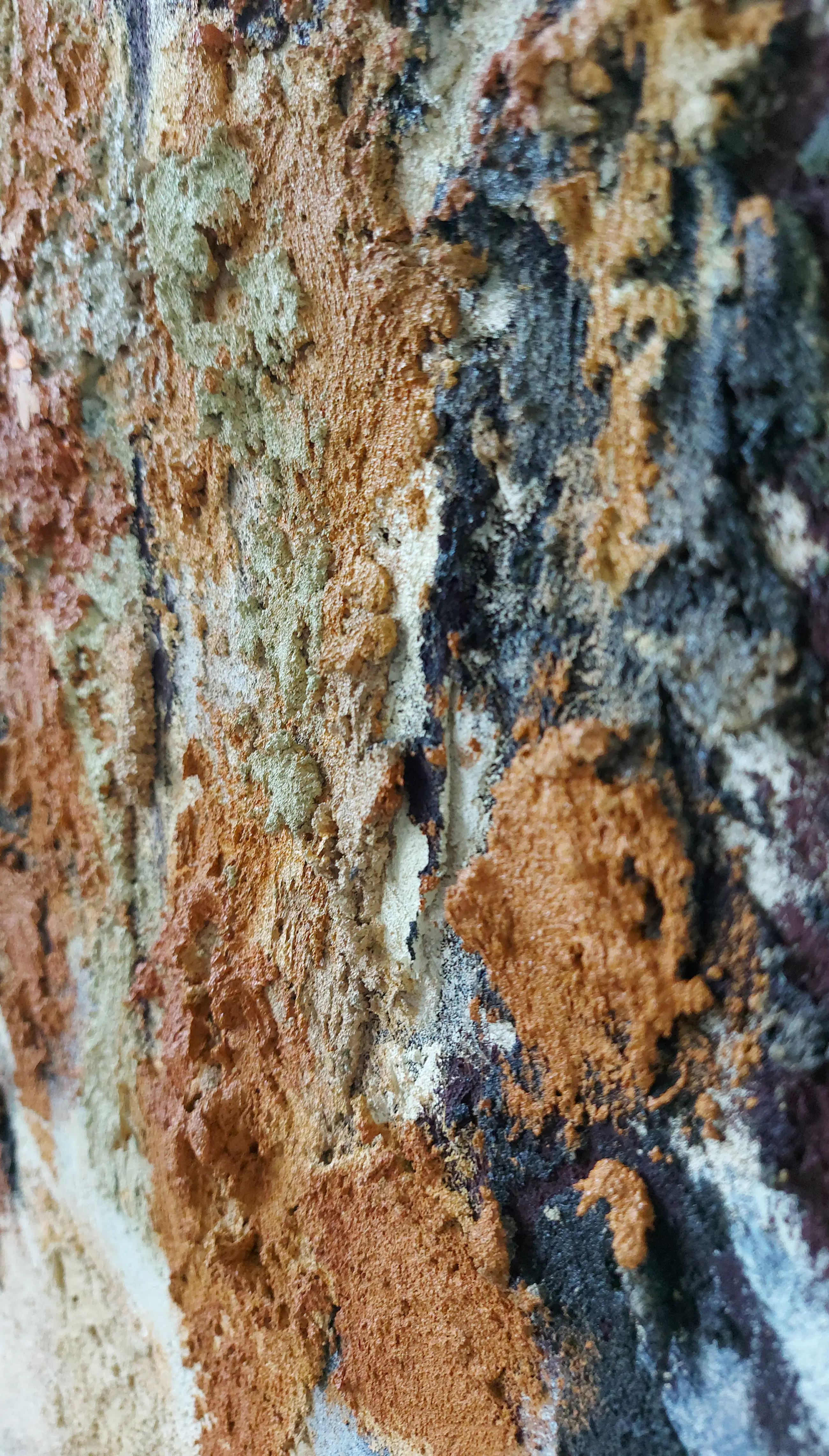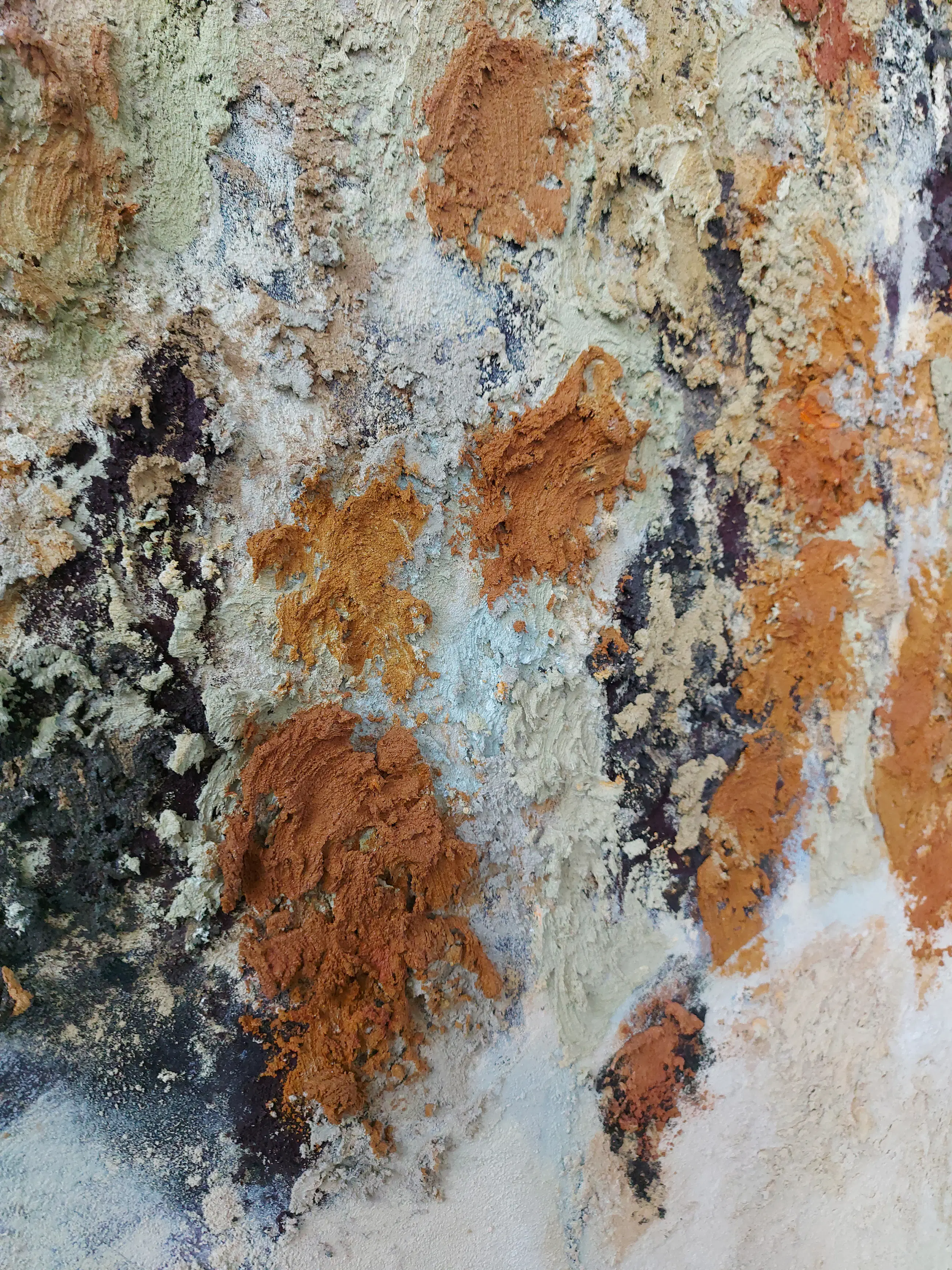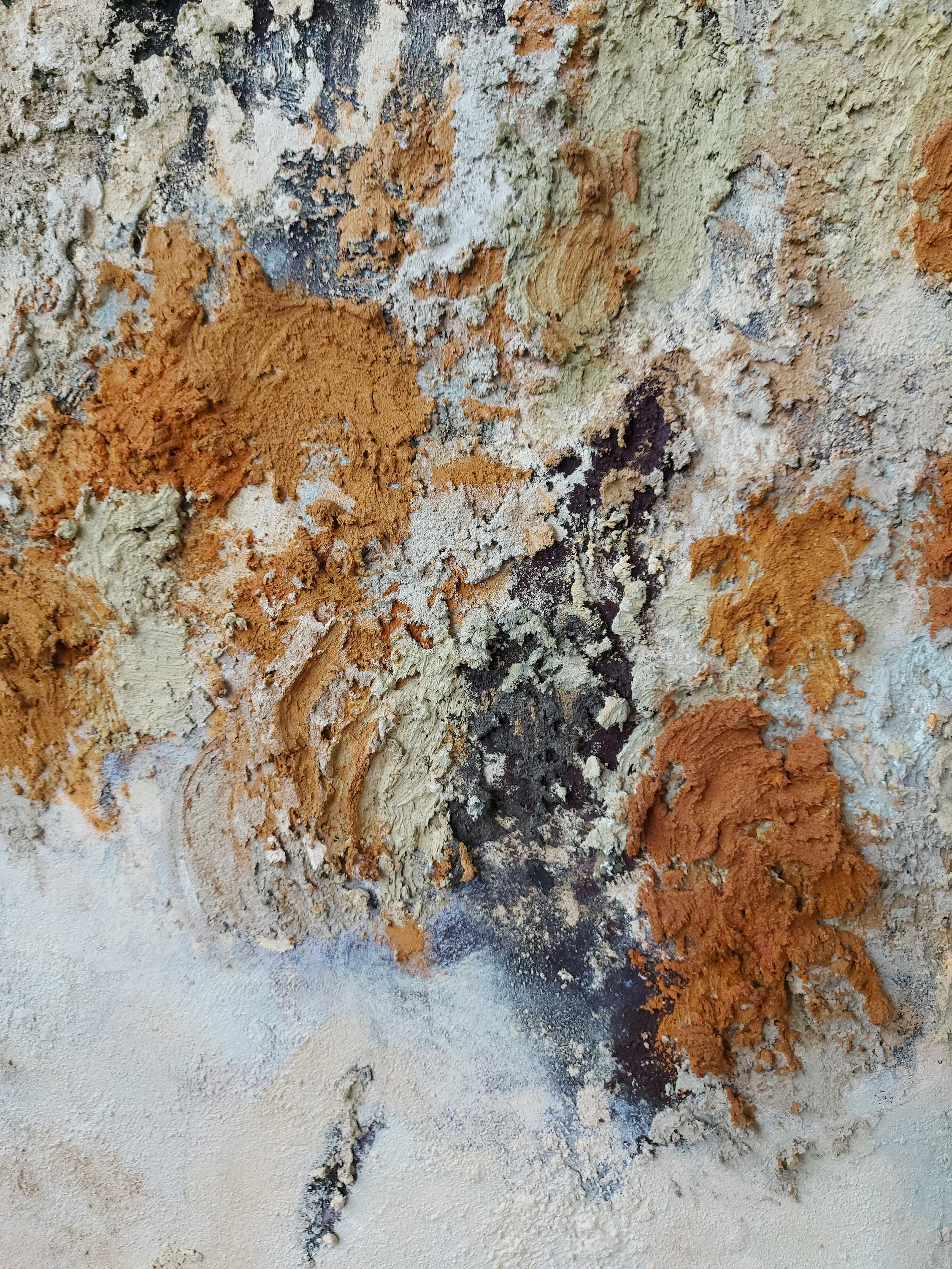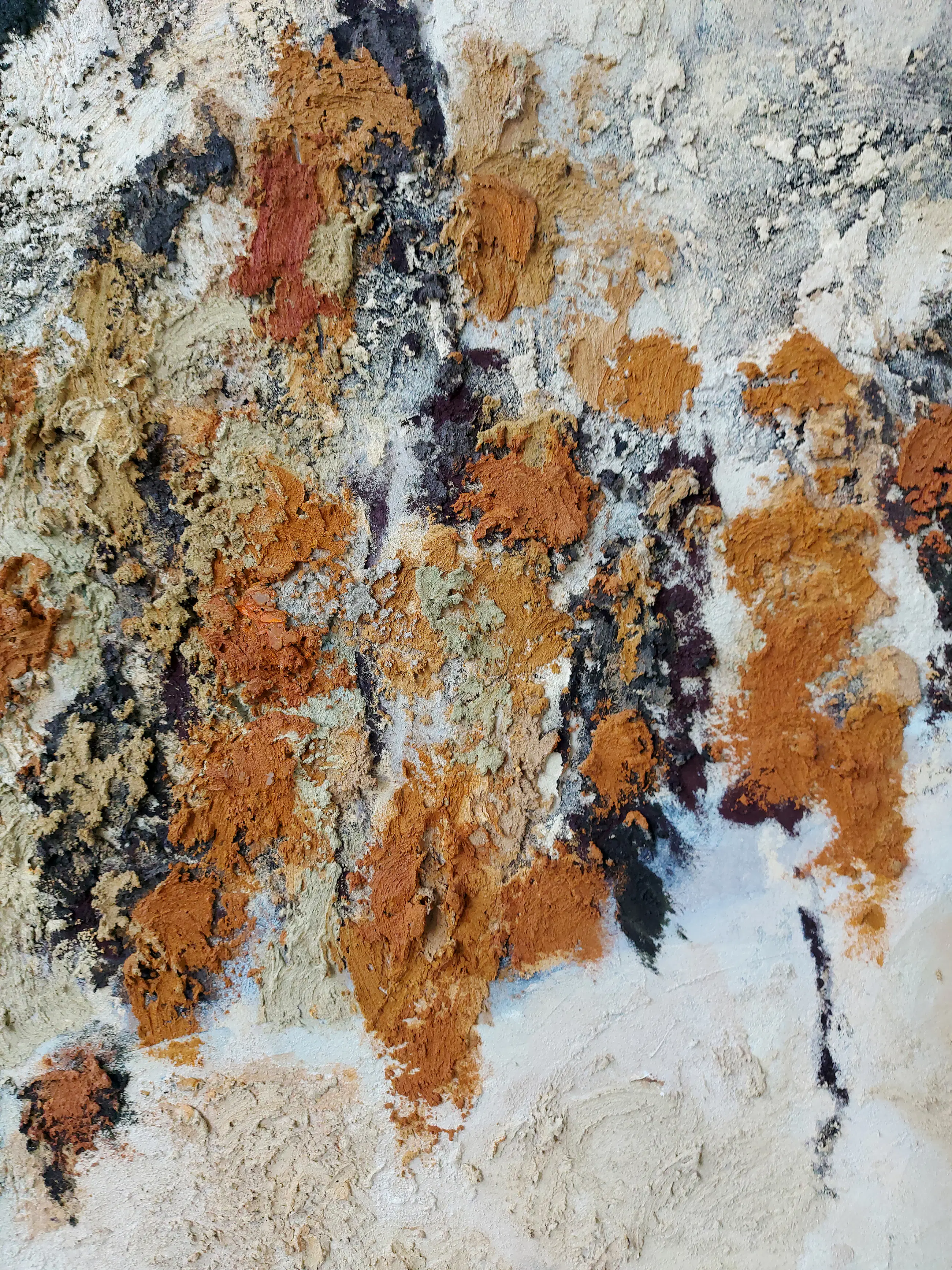 Olieverf met zand op doek. Door zijn verfbehandeling met vele vele lagen verf hebben veel van de schilderijen van Gerard Strik een bijna geboetseerde oppervlaktestructuur. Het zand dat hij aan zijn olieverf toevoegt, is niet alleen voor de structuur; het maakt zijn verf ‘aards’. Het geabstraheerde landschap wordt voelbaar.