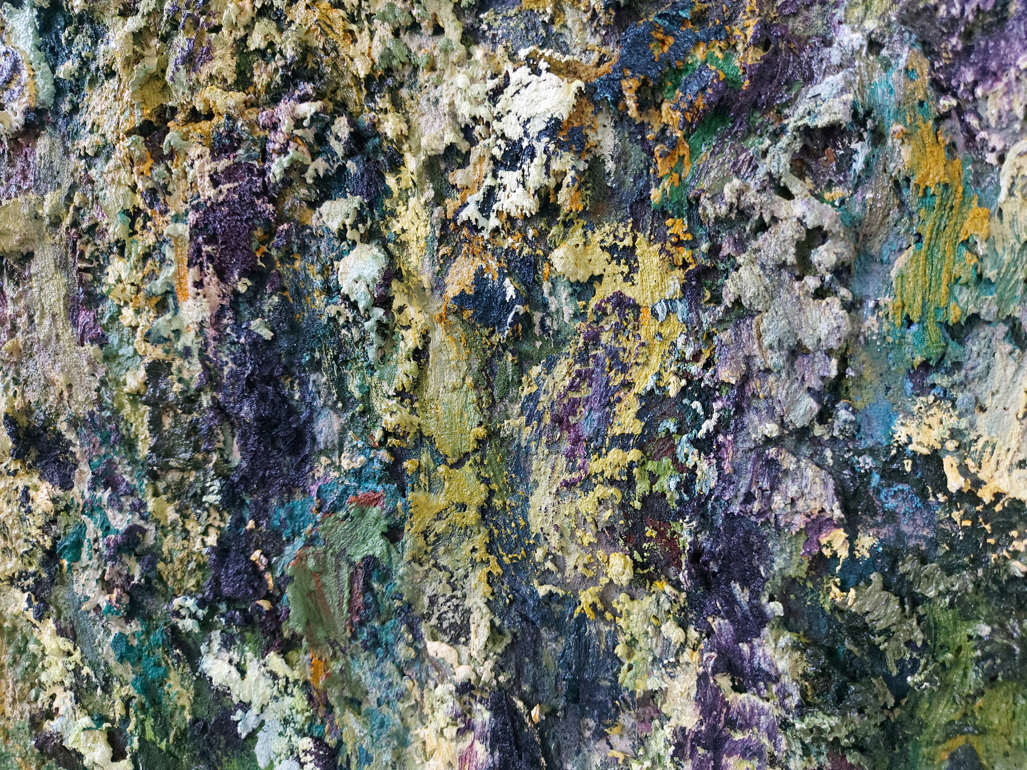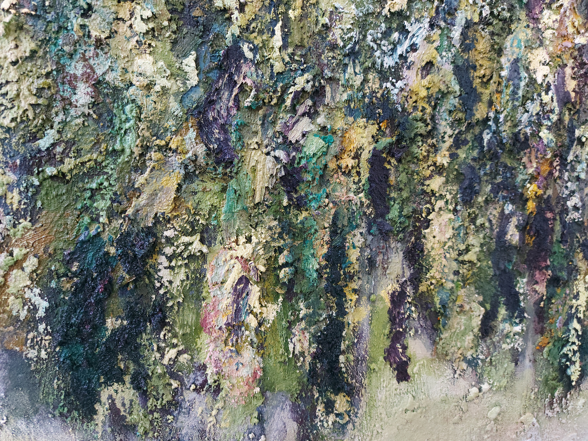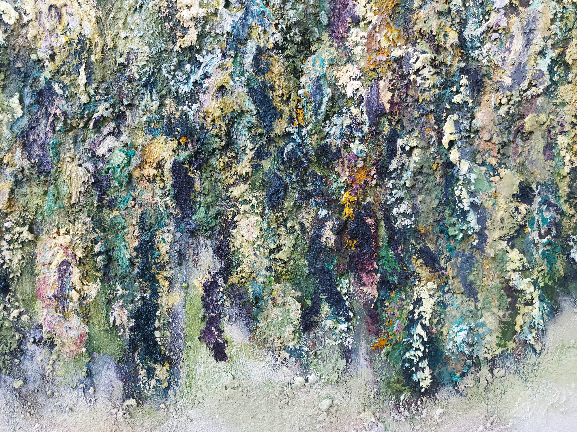 Olieverf met zand op doek.