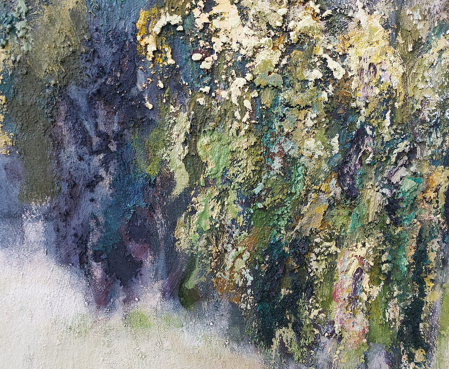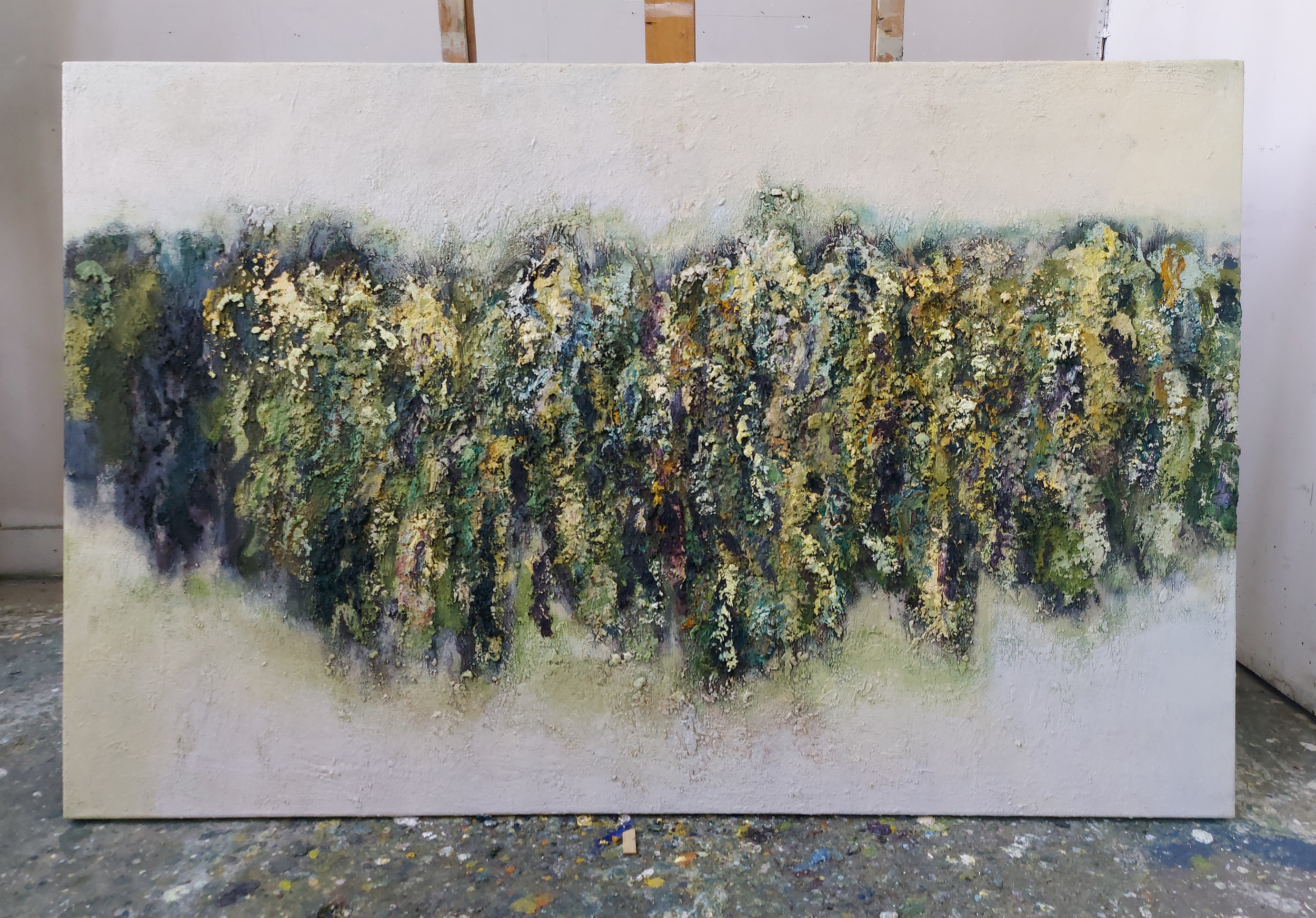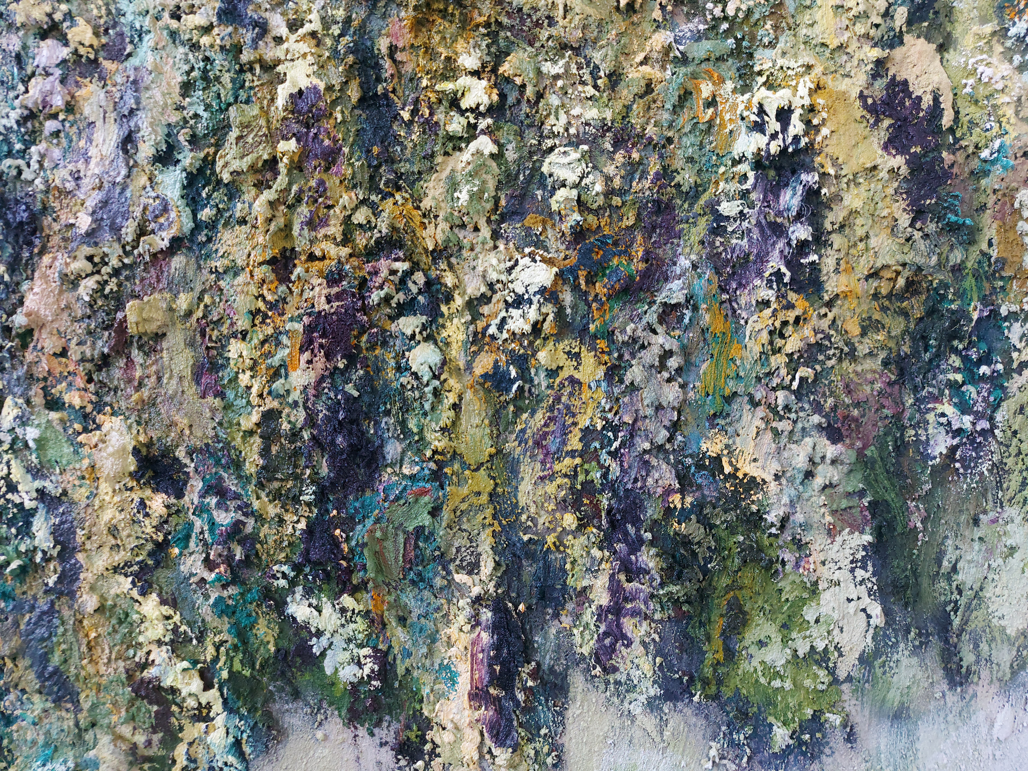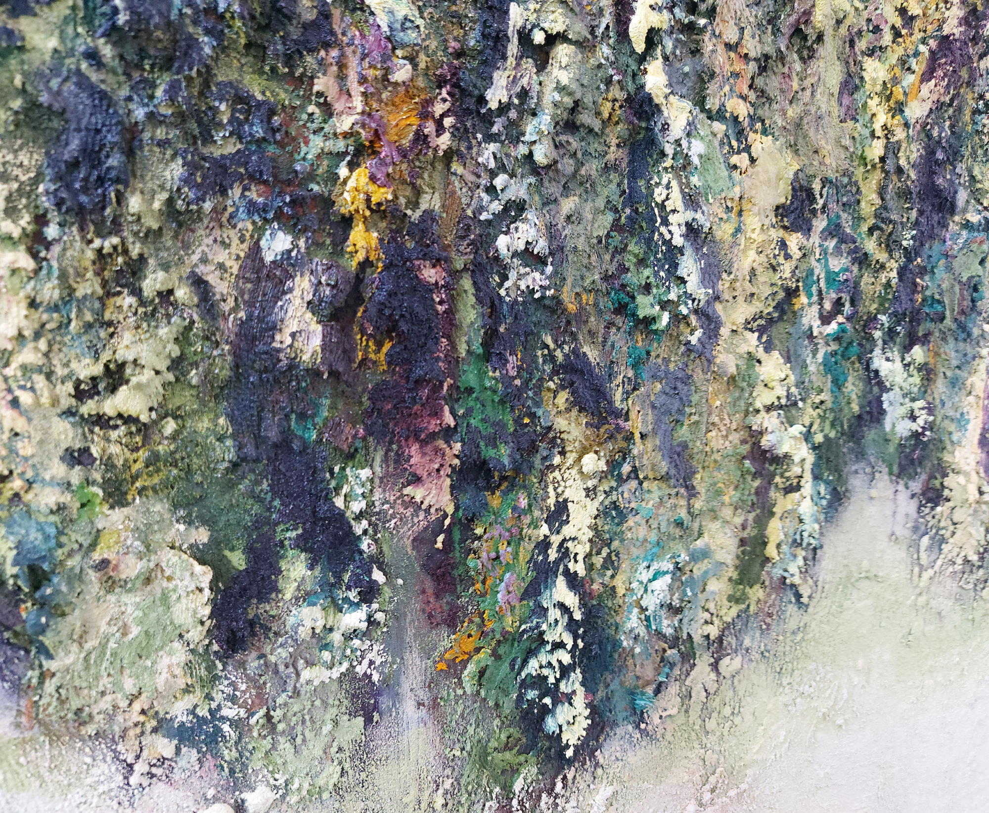 Olieverf met zand op doek.