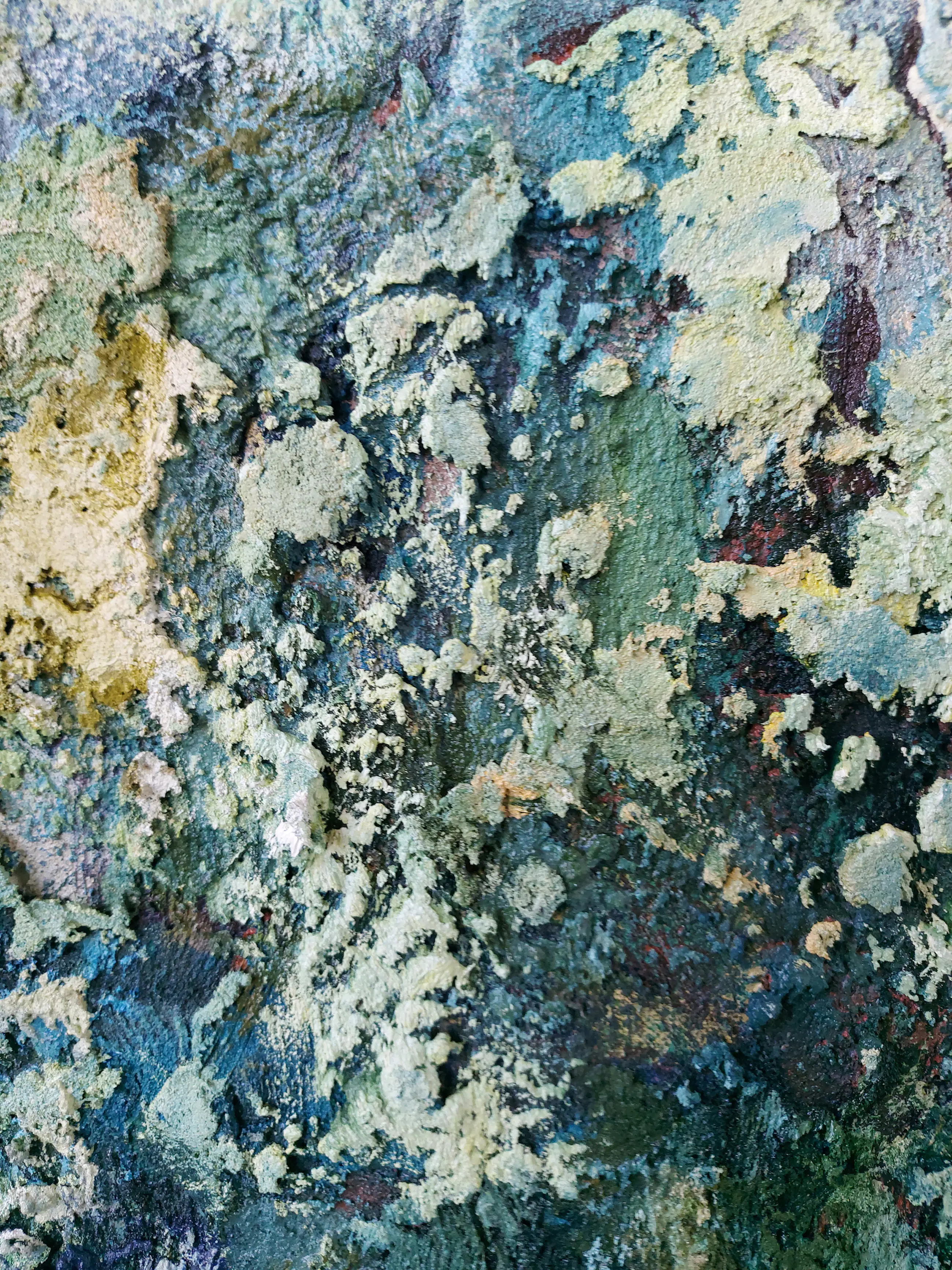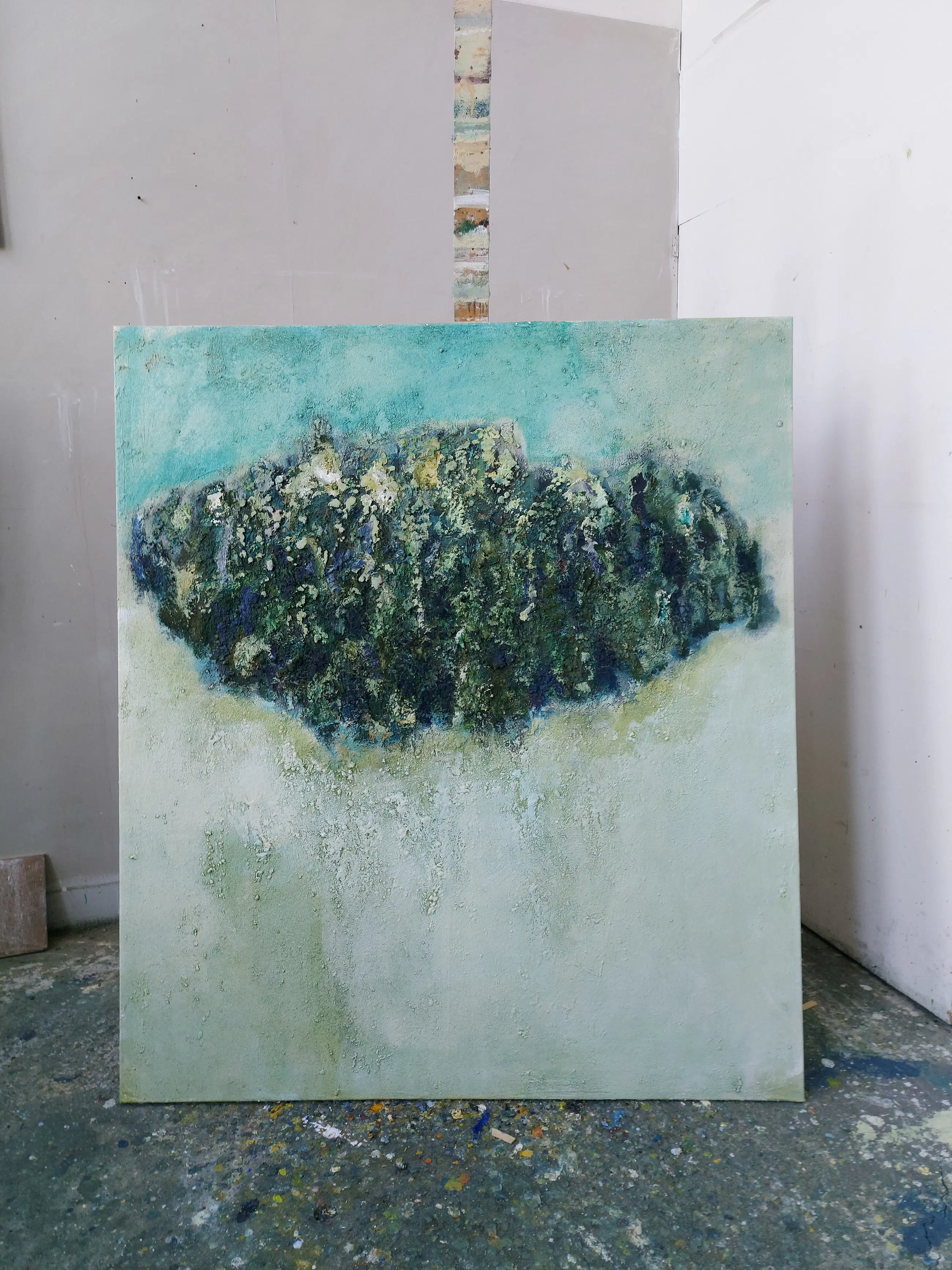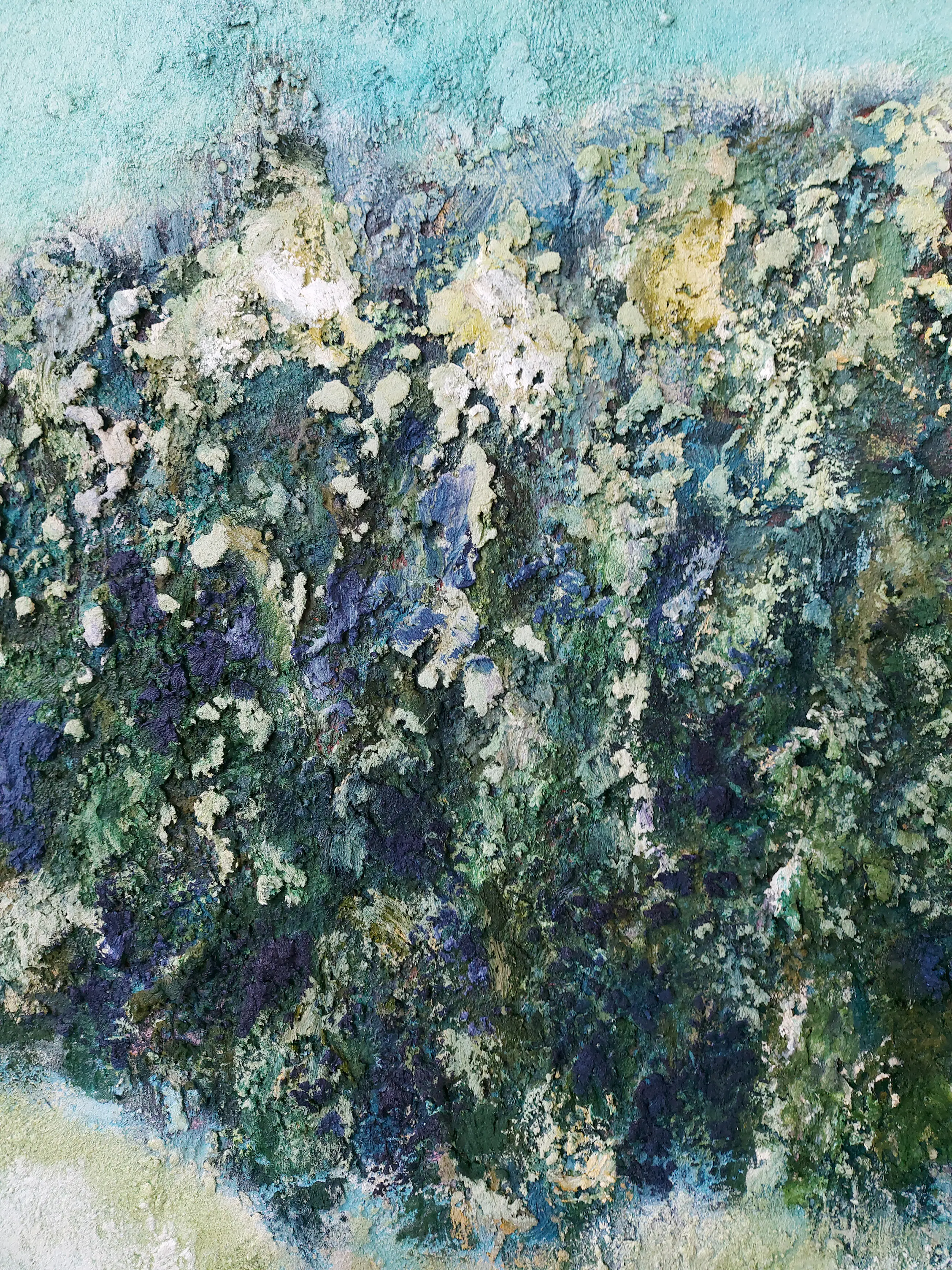 Olieverf met zand op doek. Door zijn verfbehandeling met vele vele lagen verf hebben veel van de schilderijen van Gerard Strik een bijna geboetseerde oppervlaktestructuur. Het zand dat hij aan zijn olieverf toevoegt, is niet alleen voor de structuur; het maakt zijn verf ‘aards’. Het geabstraheerde landschap wordt voelbaar.