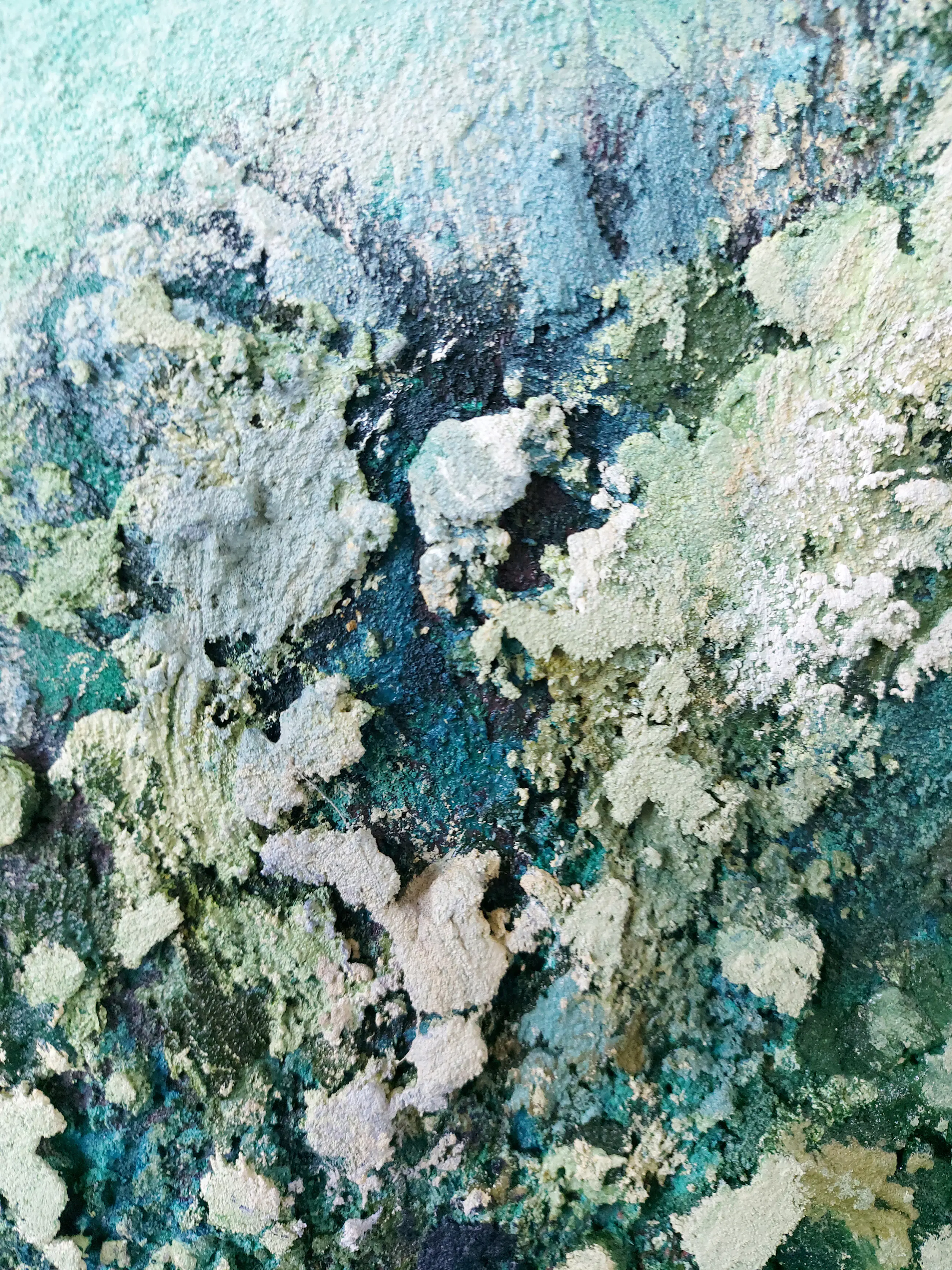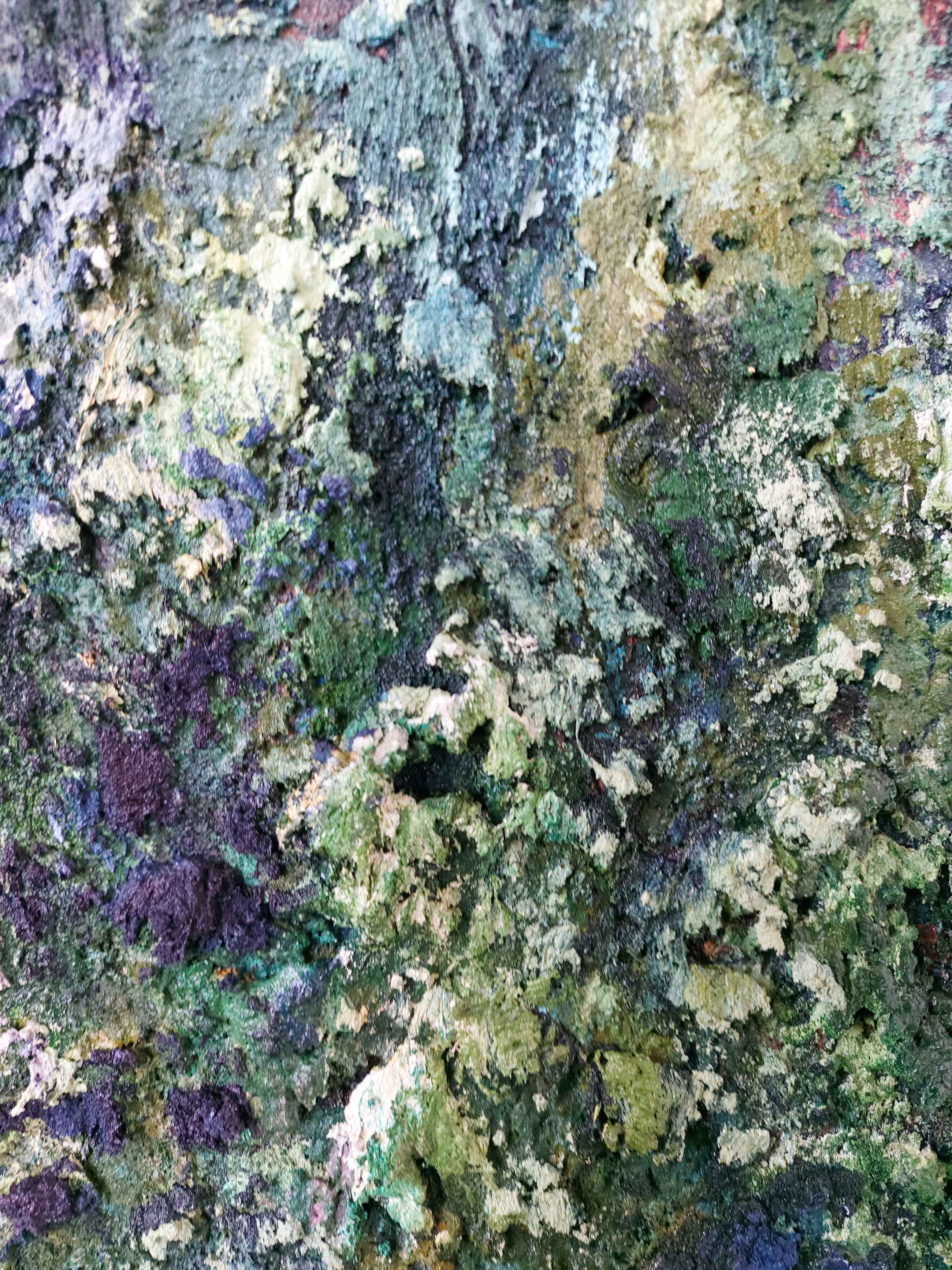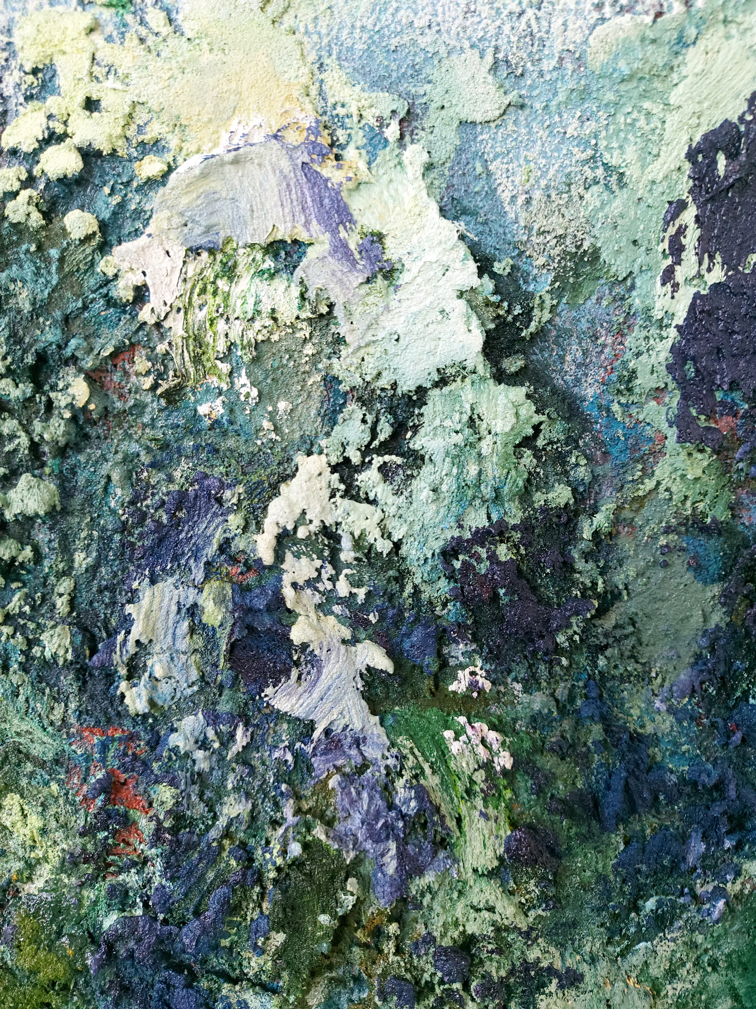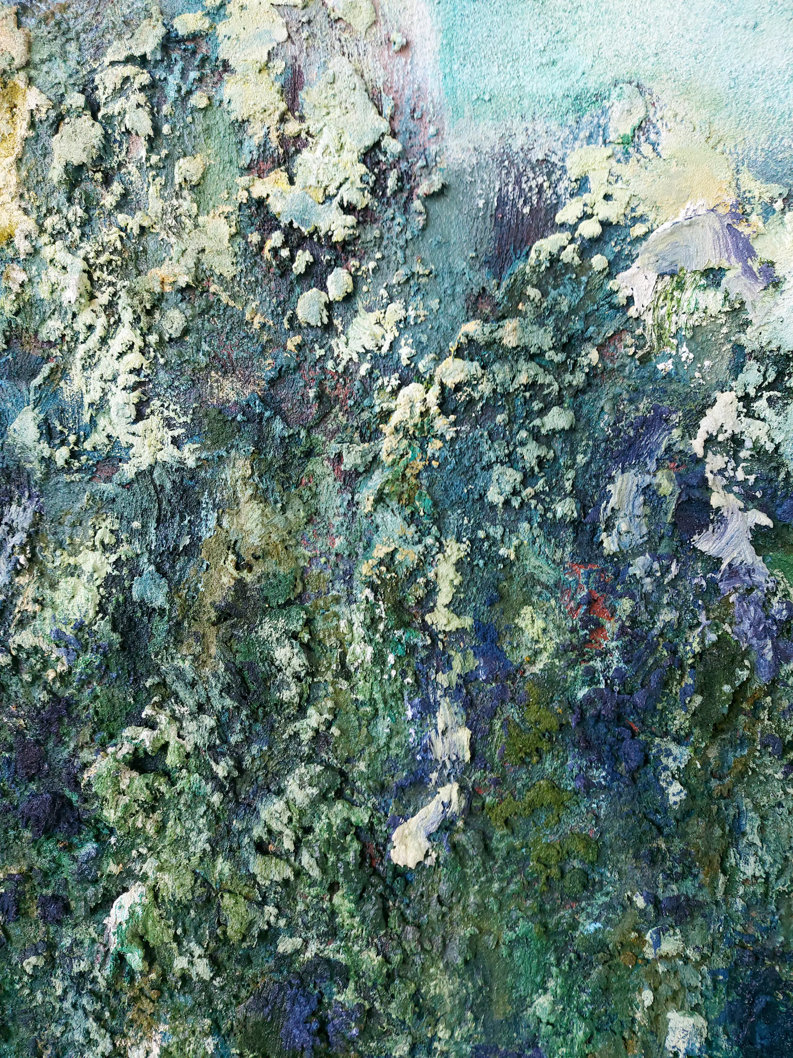 Olieverf met zand op doek. Door zijn verfbehandeling met vele vele lagen verf hebben veel van de schilderijen van Gerard Strik een bijna geboetseerde oppervlaktestructuur. Het zand dat hij aan zijn olieverf toevoegt, is niet alleen voor de structuur; het maakt zijn verf ‘aards’. Het geabstraheerde landschap wordt voelbaar.