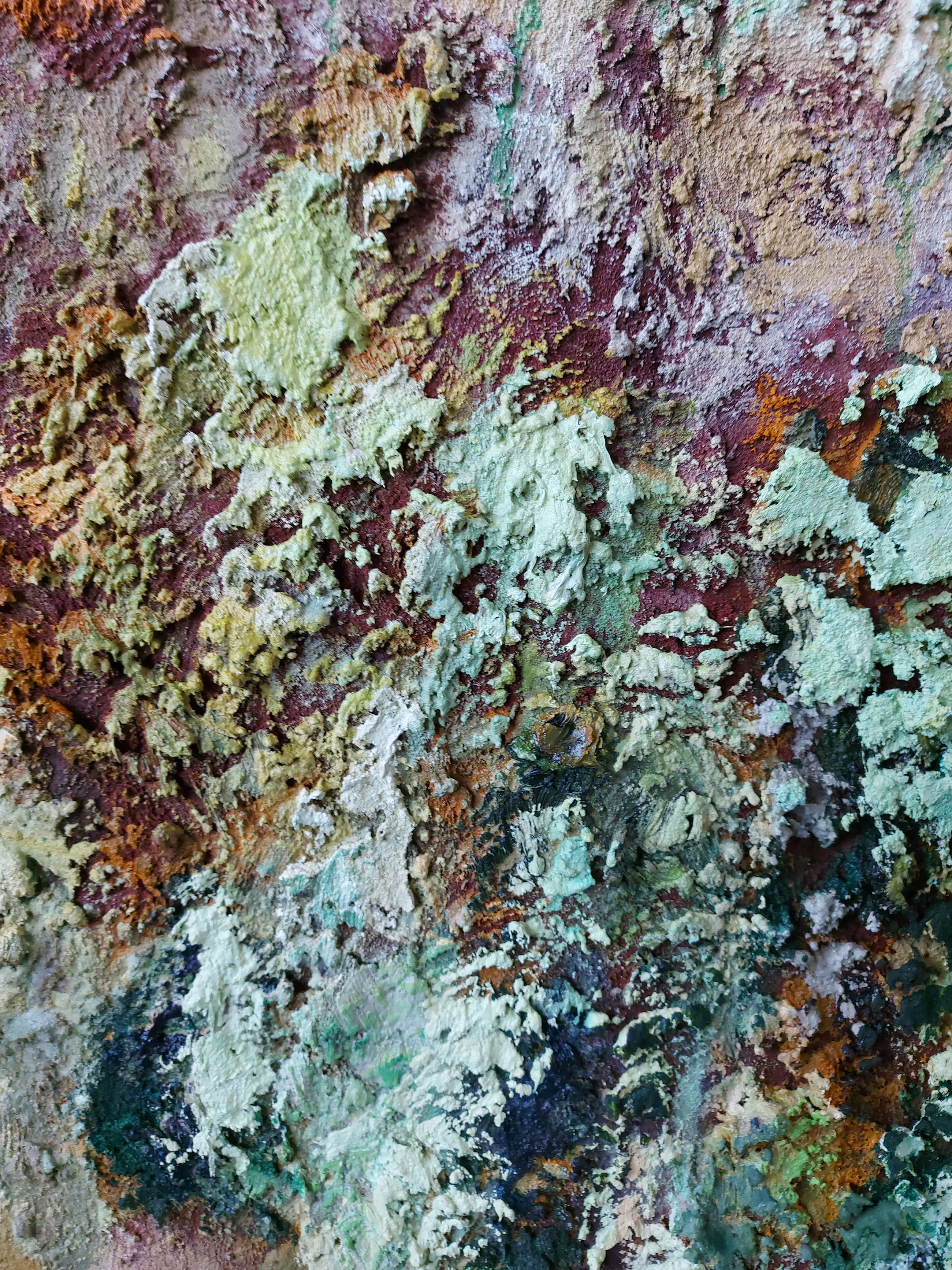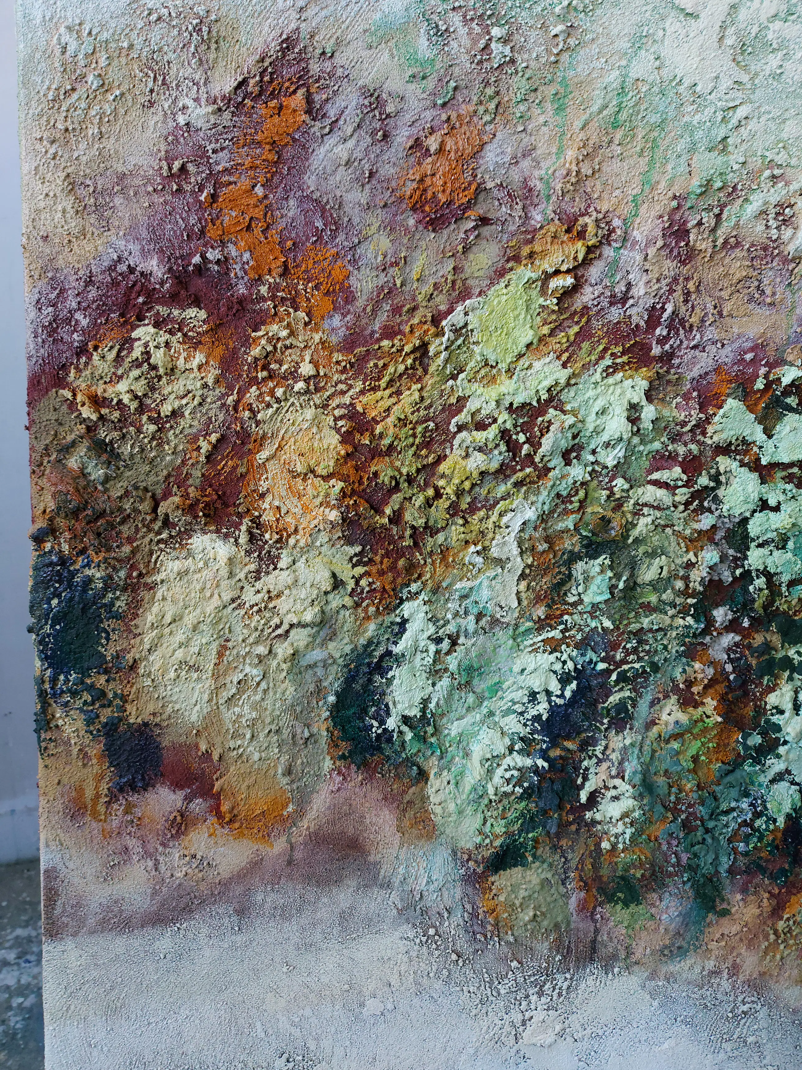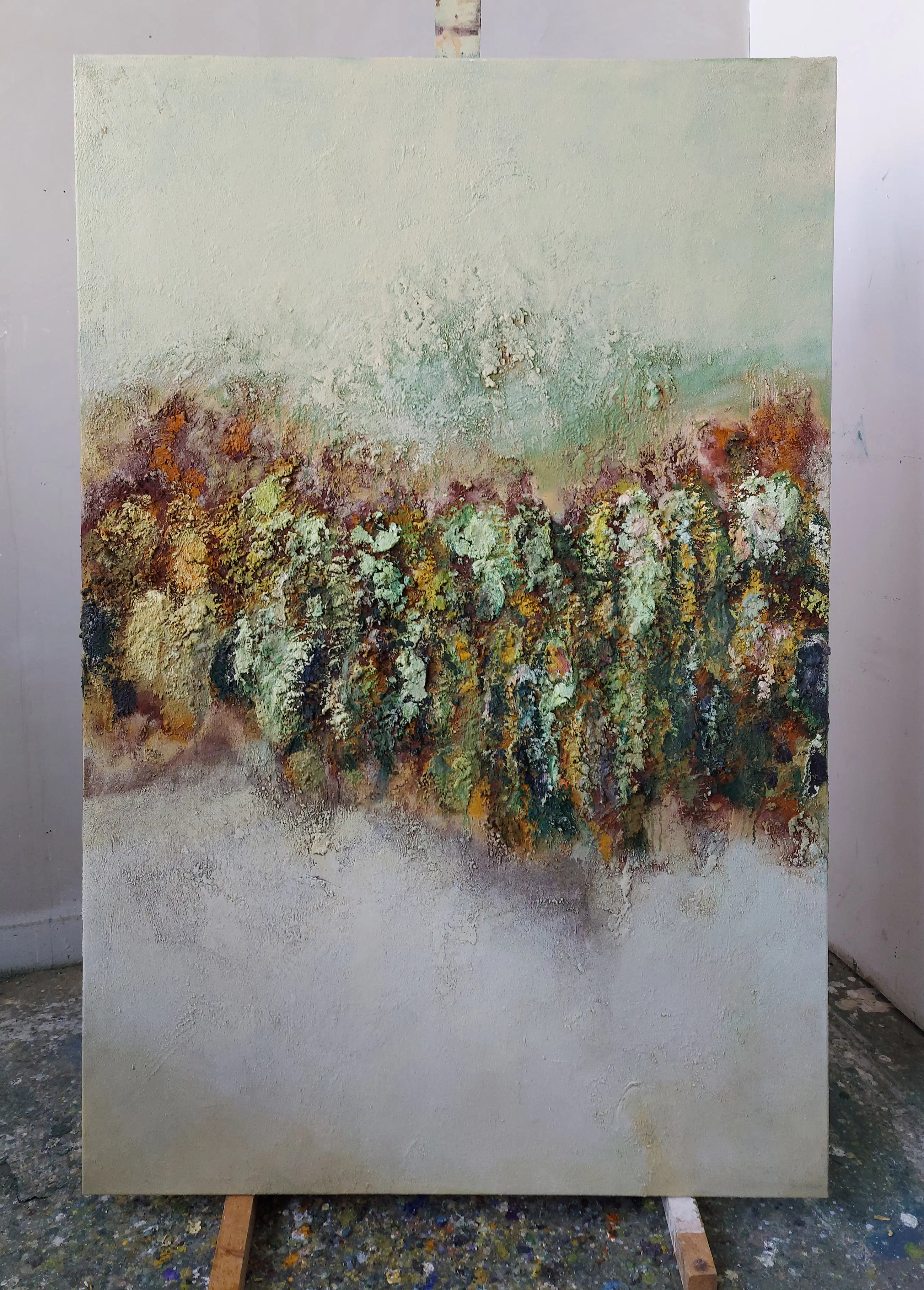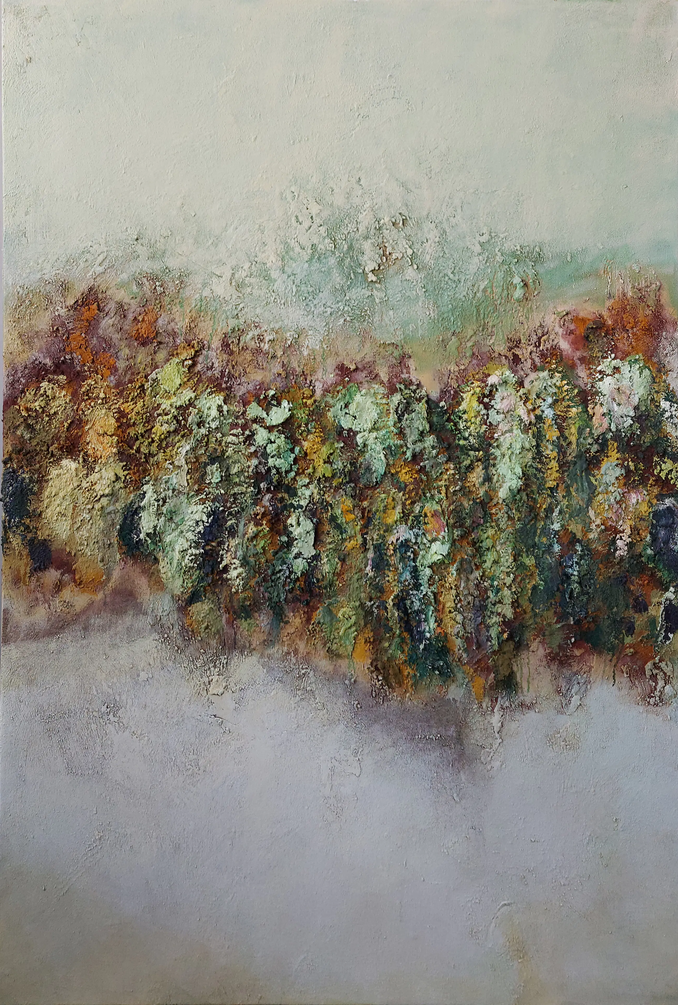 Olieverf met zand op doek. Door zijn verfbehandeling met vele vele lagen verf hebben veel van de schilderijen van Gerard Strik een bijna geboetseerde oppervlaktestructuur. Het zand dat hij aan zijn olieverf toevoegt, is niet alleen voor de structuur; het maakt zijn verf ‘aards’. Het geabstraheerde landschap wordt voelbaar.