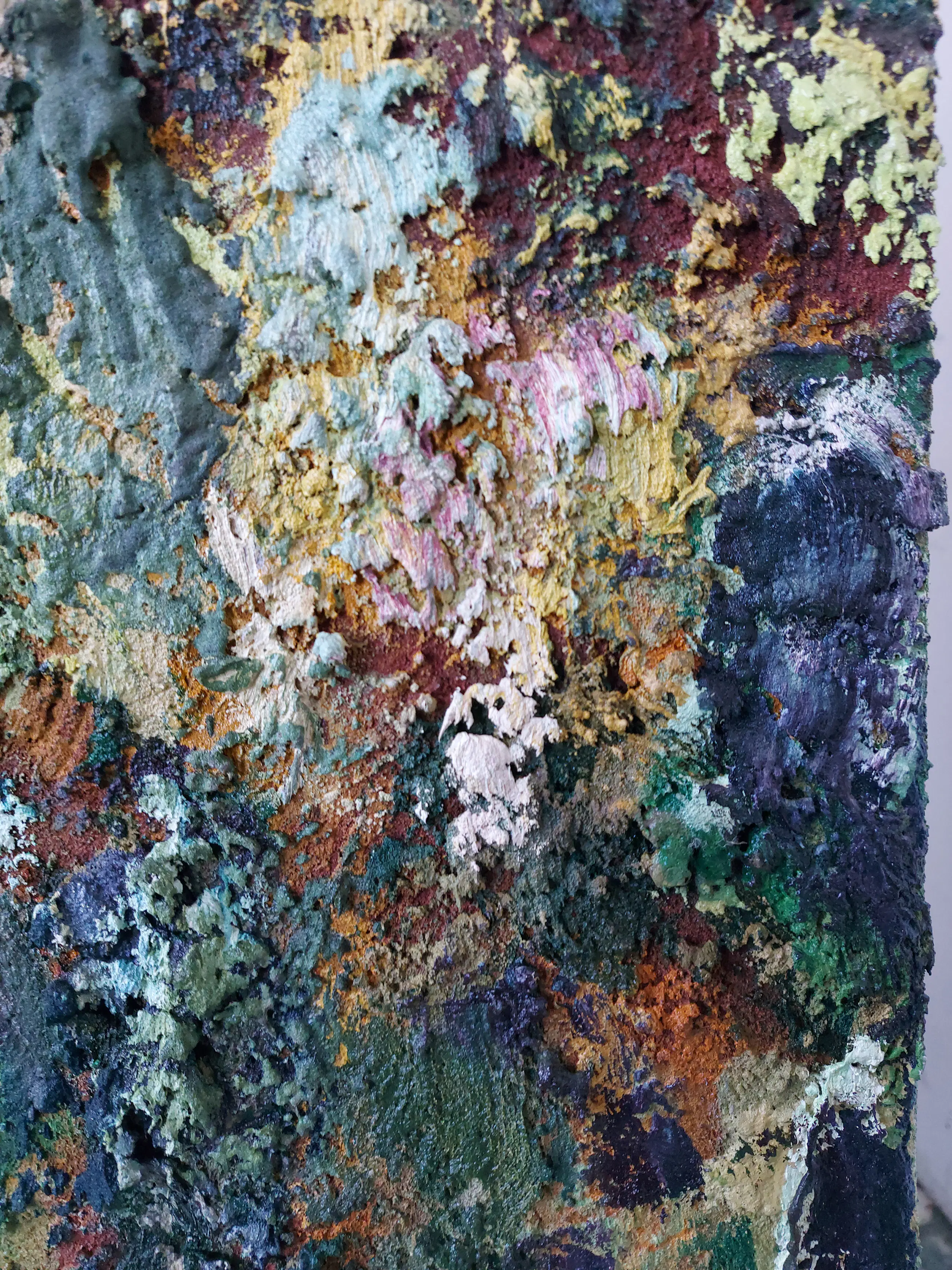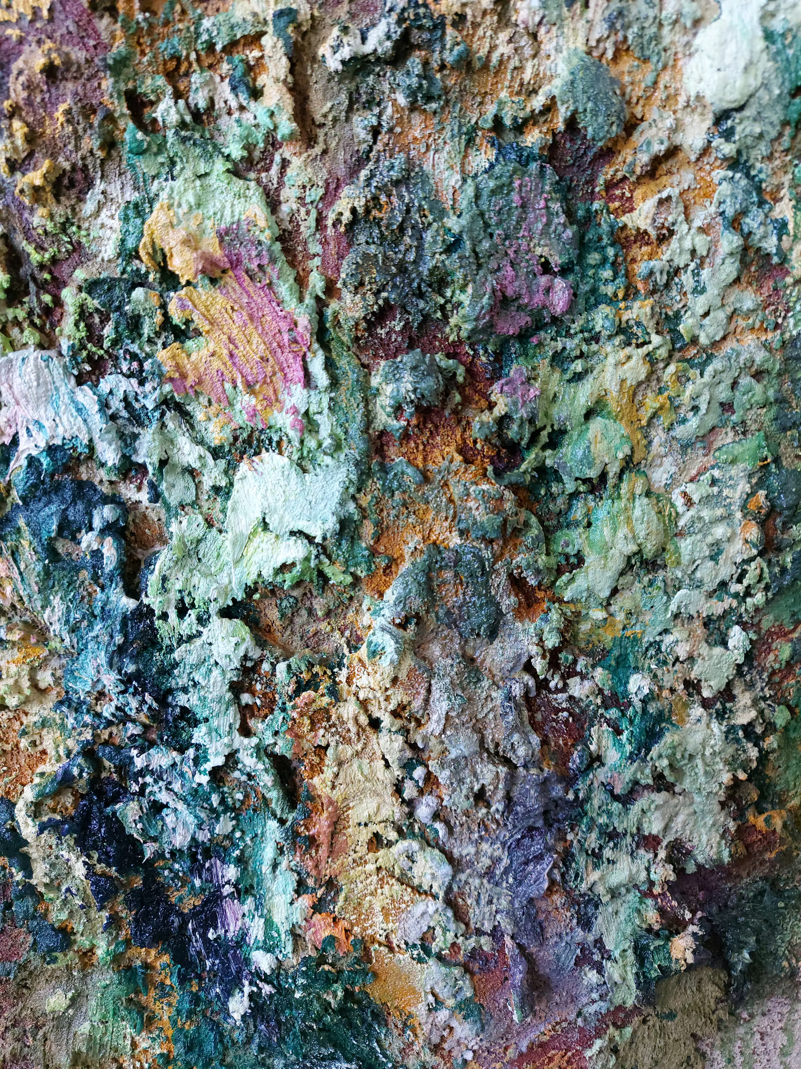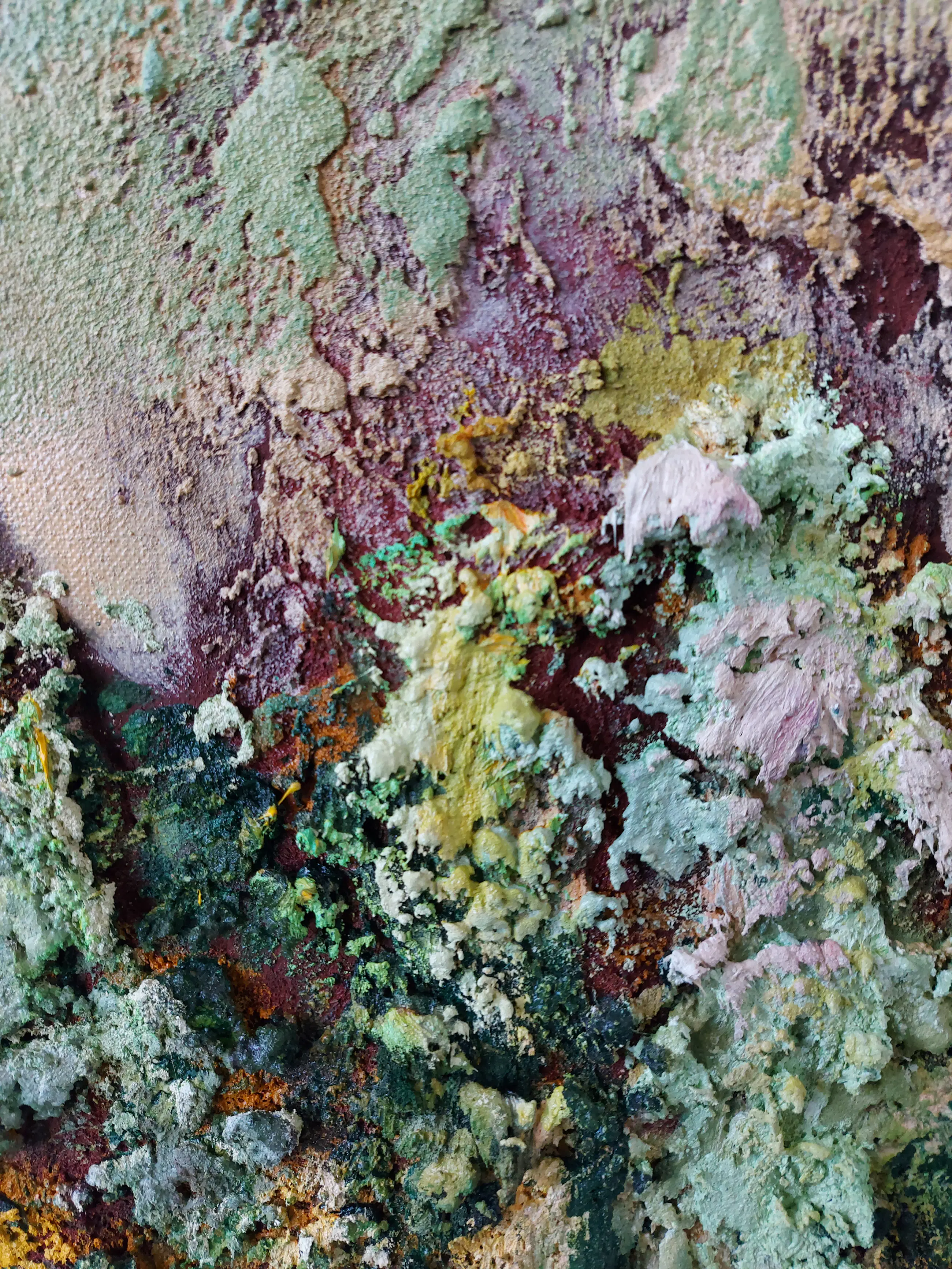 Olieverf met zand op doek. Door zijn verfbehandeling met vele vele lagen verf hebben veel van de schilderijen van Gerard Strik een bijna geboetseerde oppervlaktestructuur. Het zand dat hij aan zijn olieverf toevoegt, is niet alleen voor de structuur; het maakt zijn verf ‘aards’. Het geabstraheerde landschap wordt voelbaar.