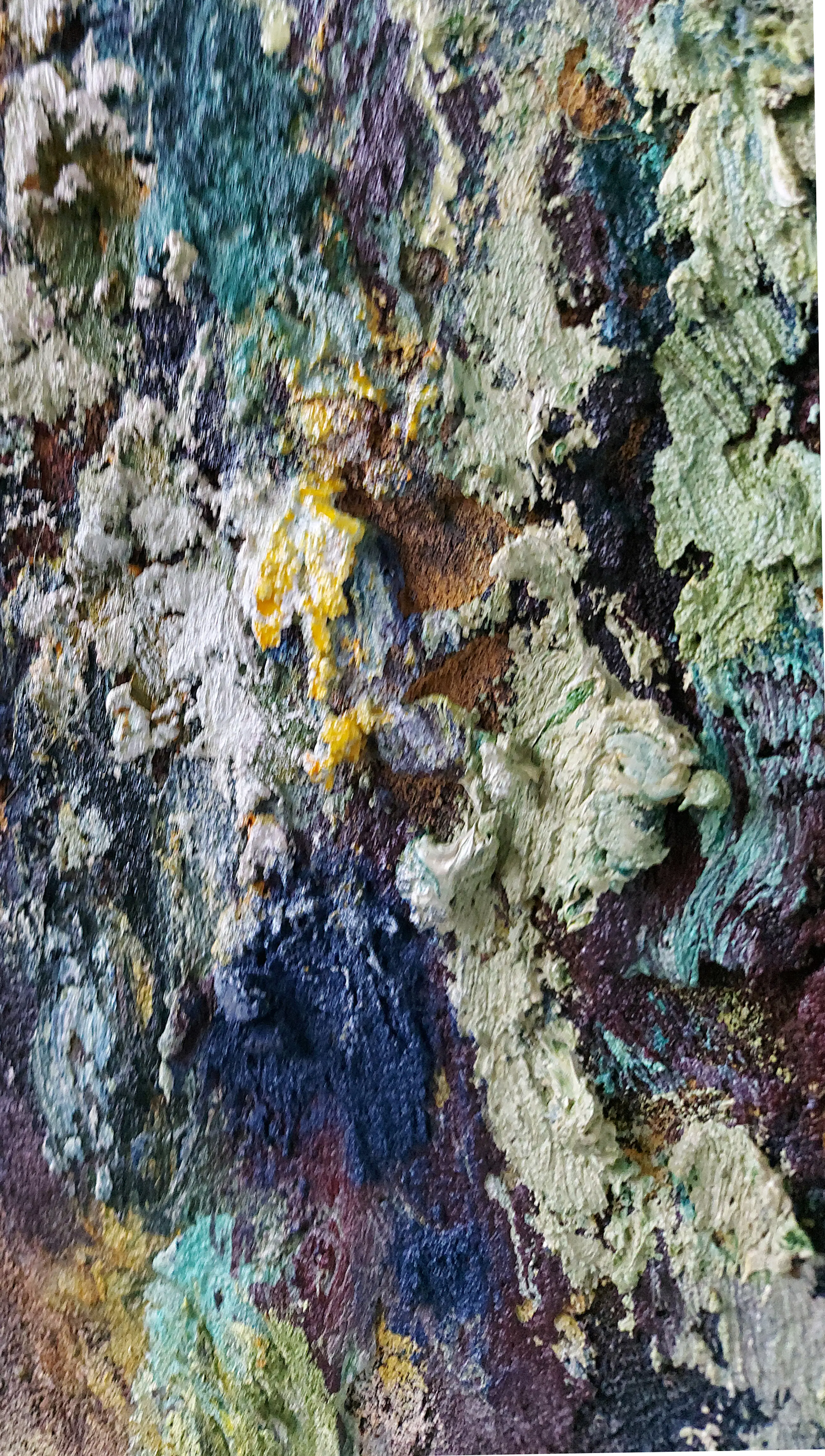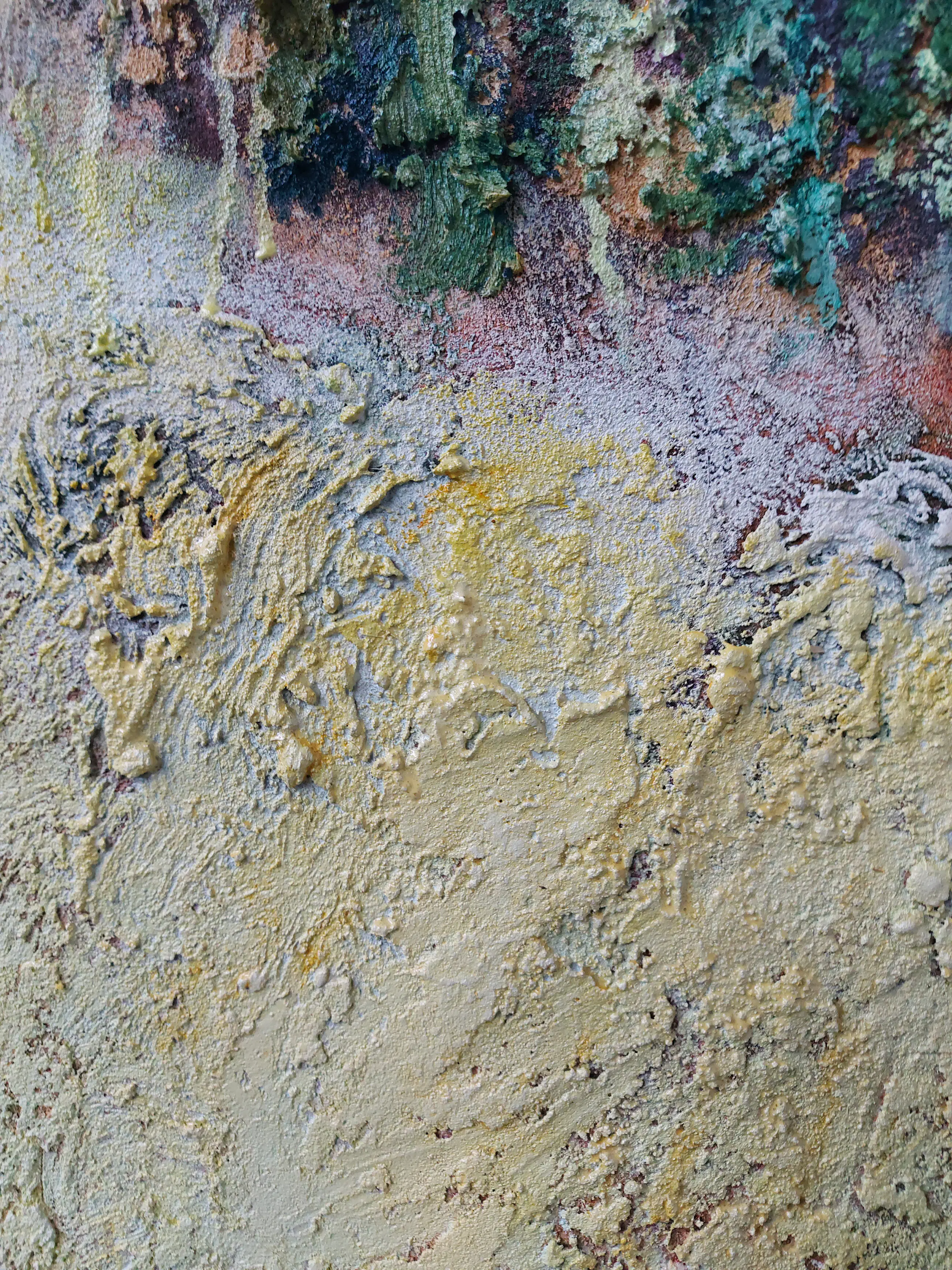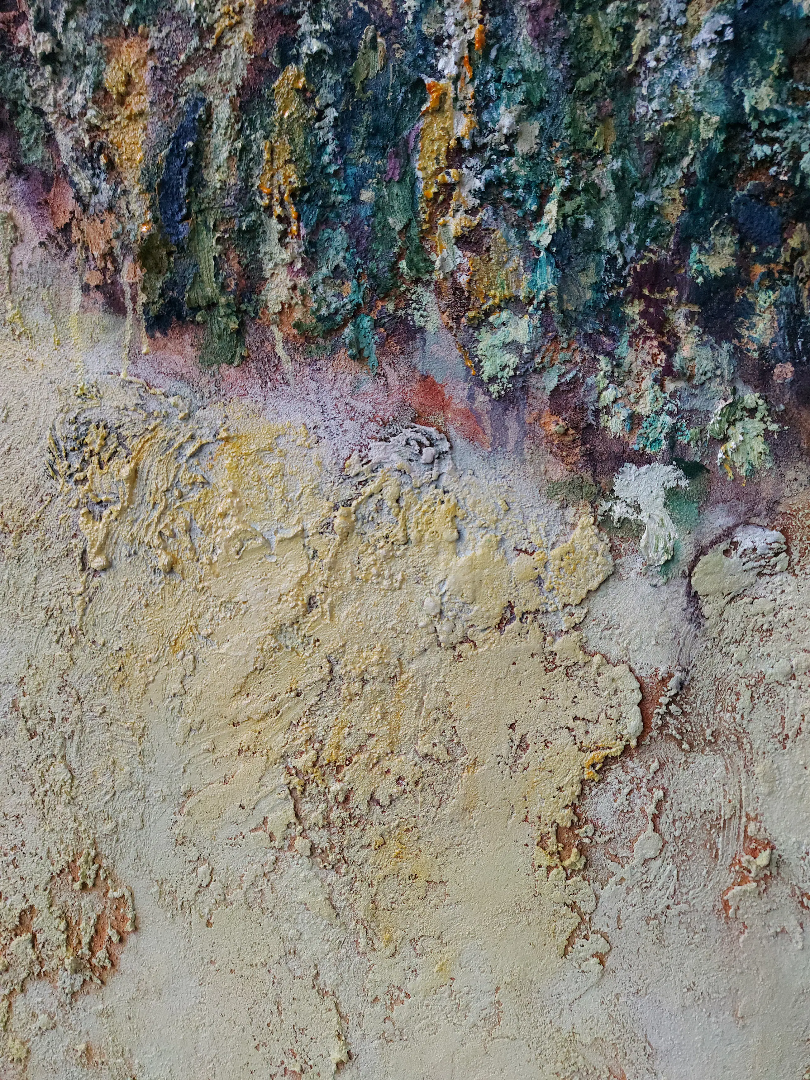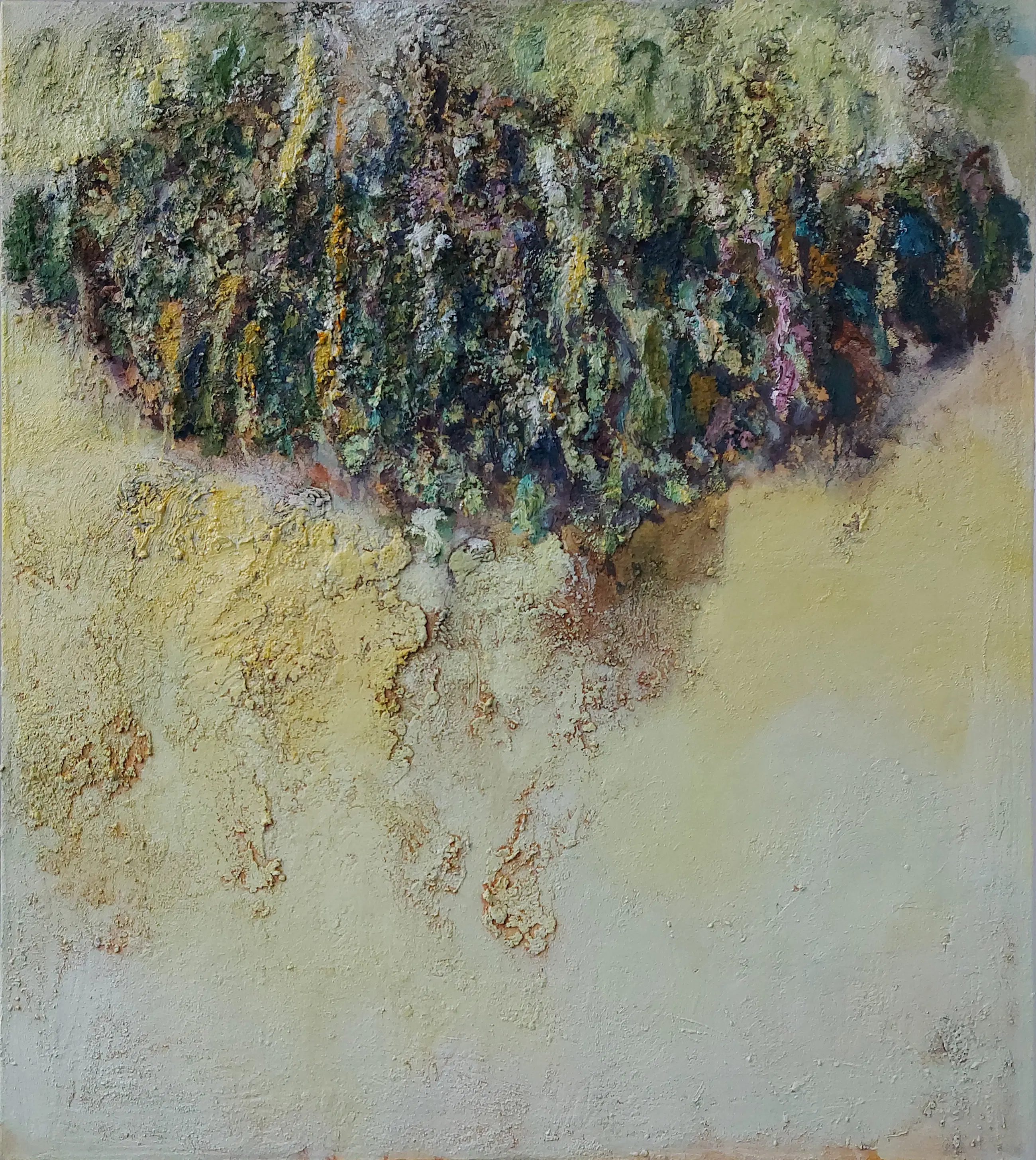 Olieverf met zand op doek. Door zijn verfbehandeling met vele vele lagen verf hebben veel van de schilderijen van Gerard Strik een bijna geboetseerde oppervlaktestructuur. Het zand dat hij aan zijn olieverf toevoegt, is niet alleen voor de structuur; het maakt zijn verf ‘aards’. Het geabstraheerde landschap wordt voelbaar.