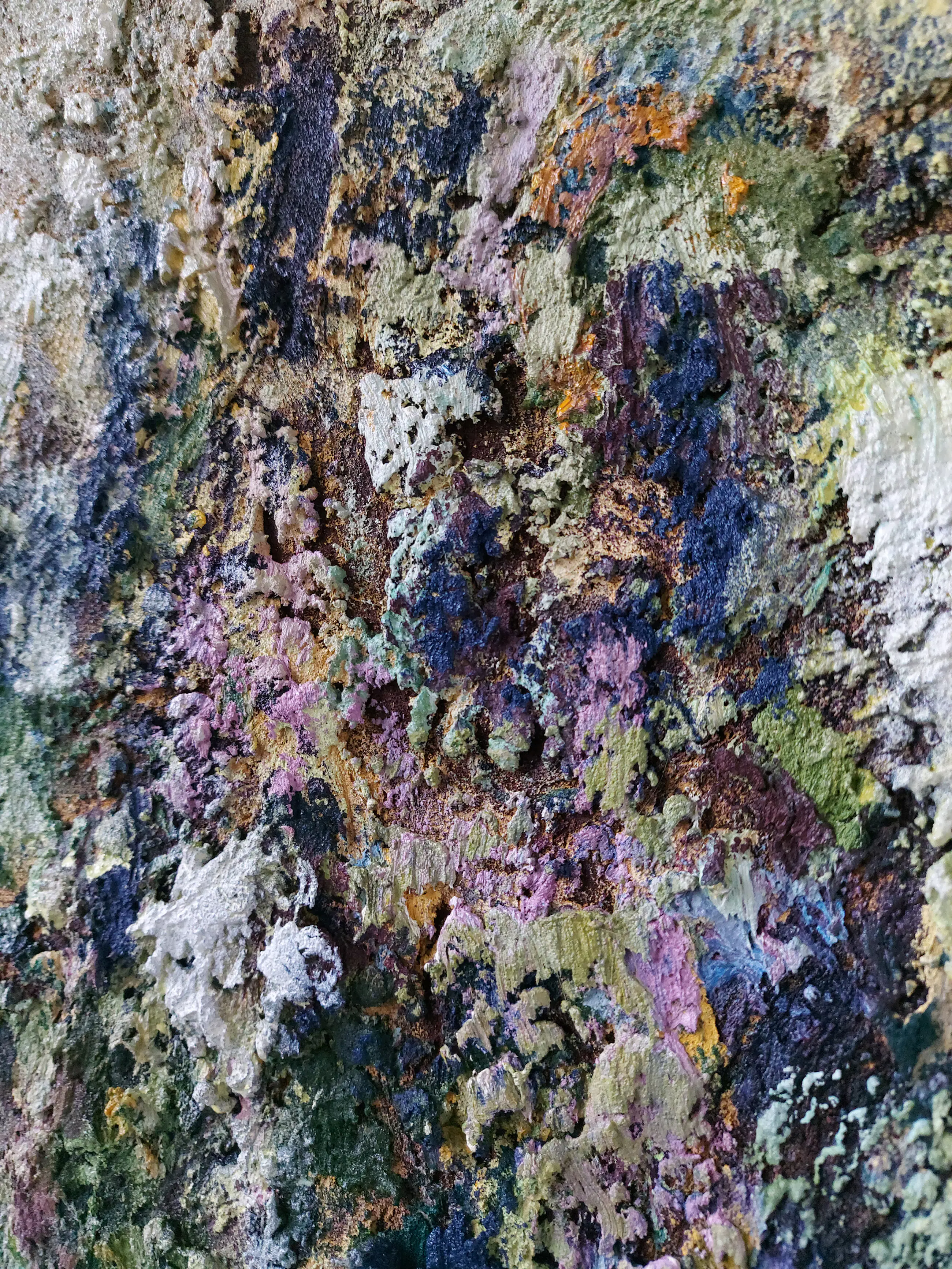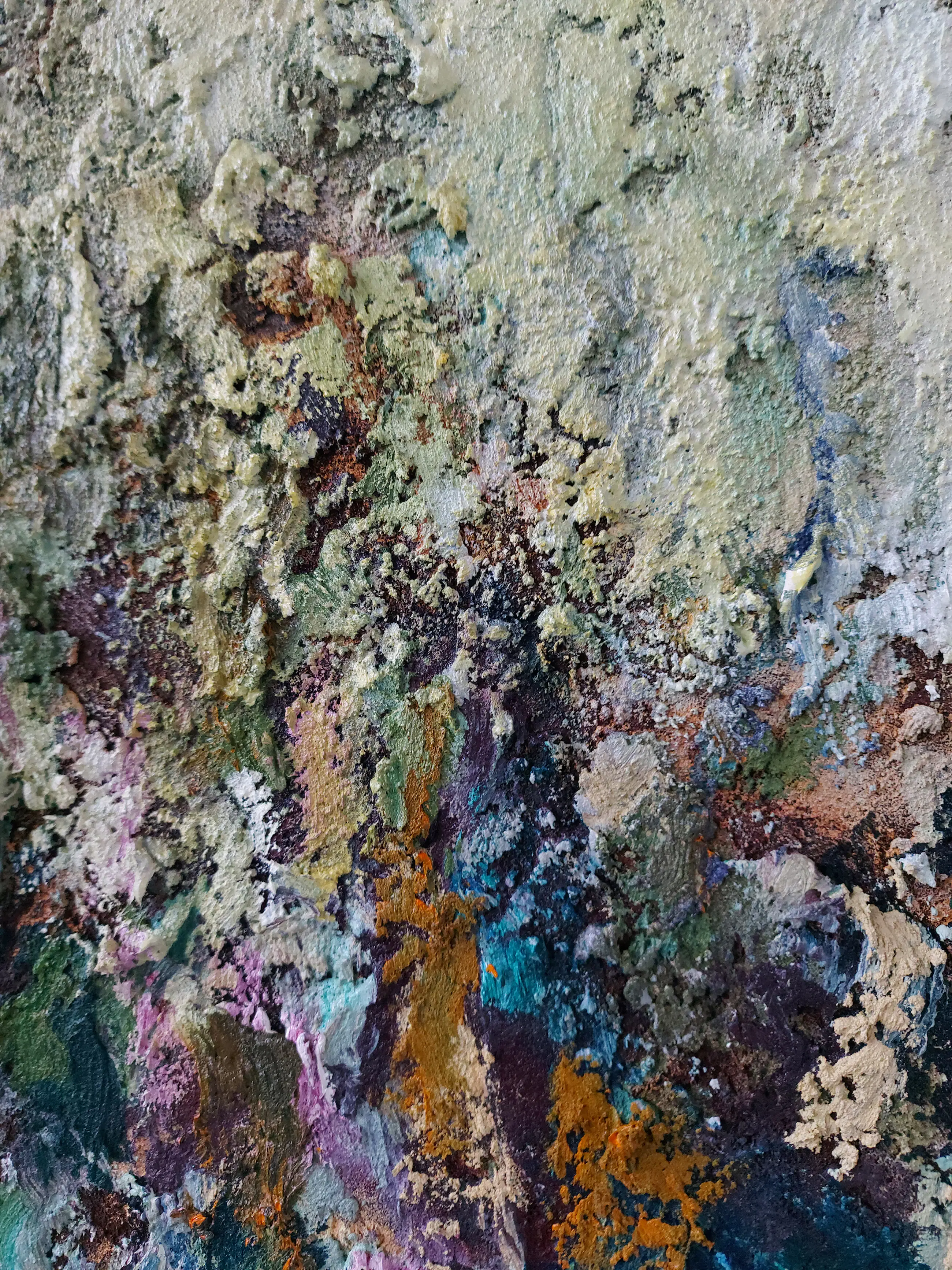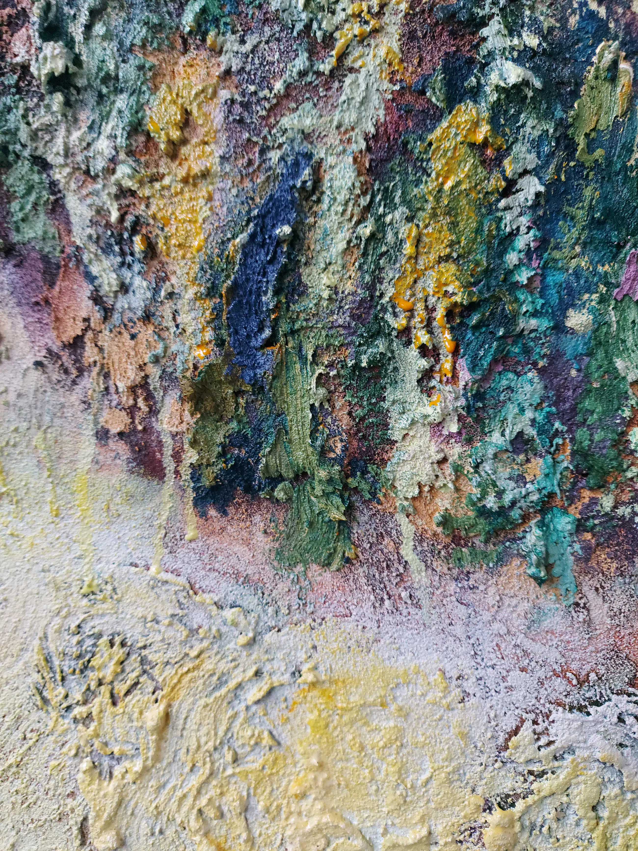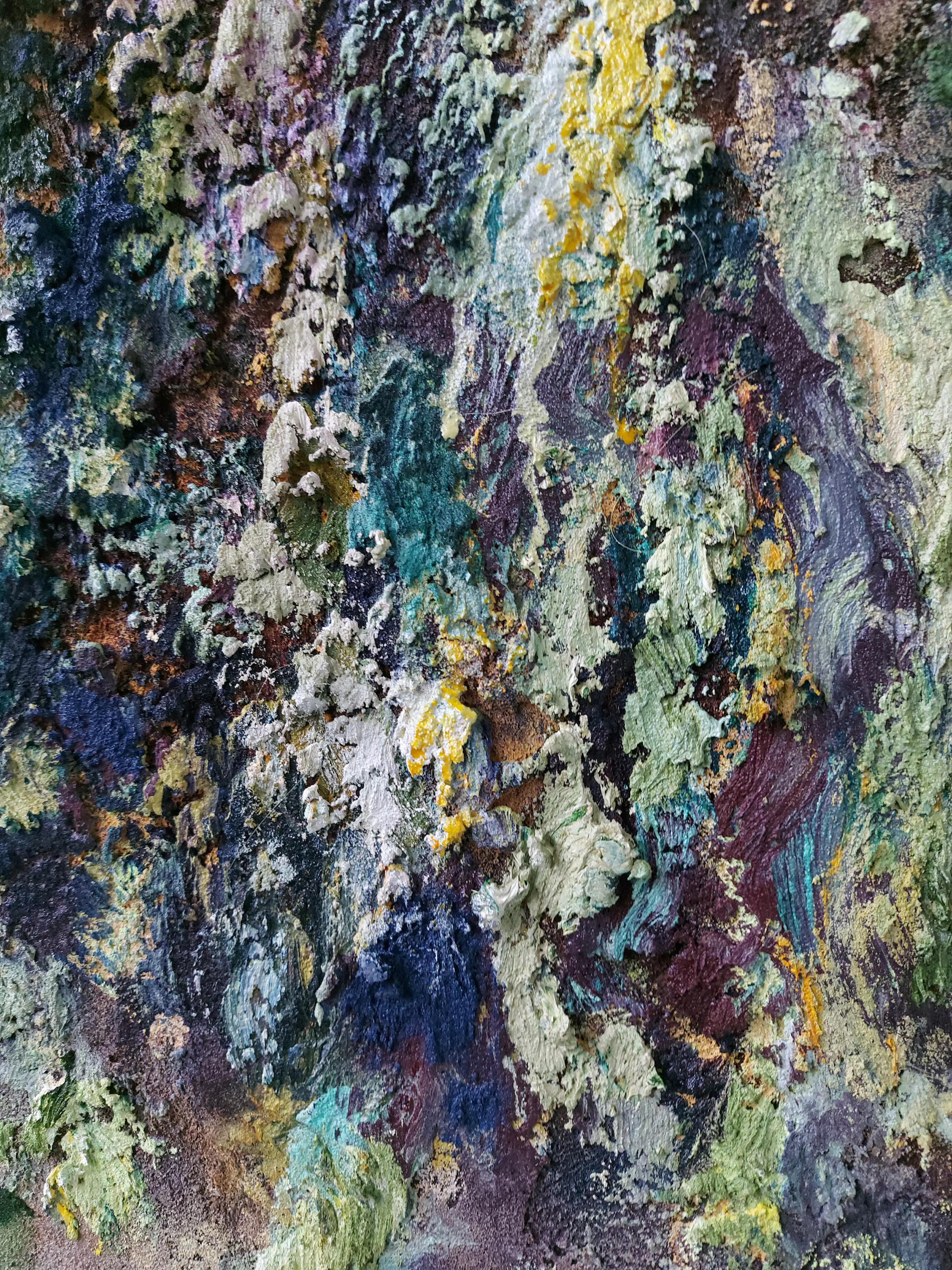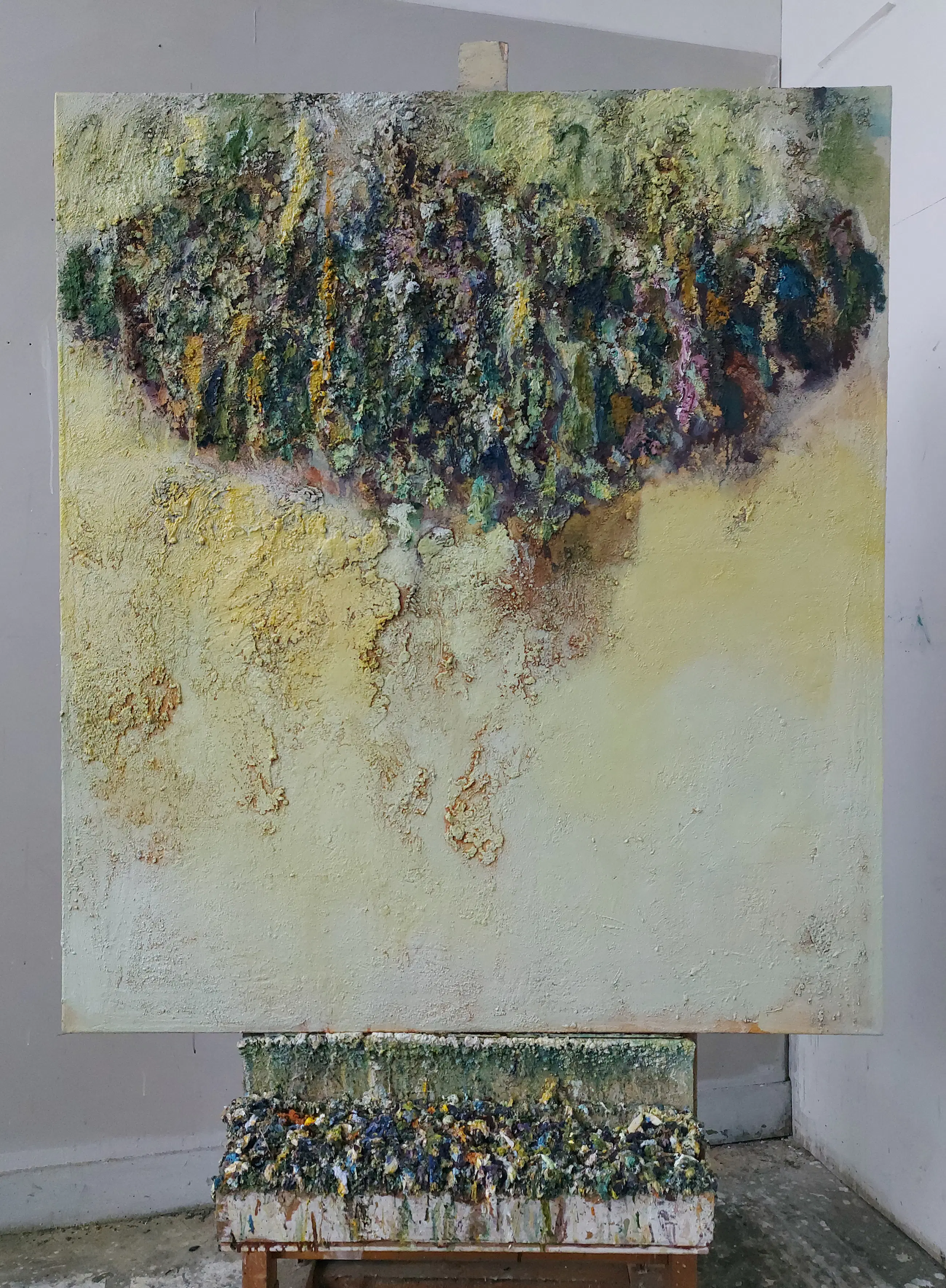 Olieverf met zand op doek. Door zijn verfbehandeling met vele vele lagen verf hebben veel van de schilderijen van Gerard Strik een bijna geboetseerde oppervlaktestructuur. Het zand dat hij aan zijn olieverf toevoegt, is niet alleen voor de structuur; het maakt zijn verf ‘aards’. Het geabstraheerde landschap wordt voelbaar.