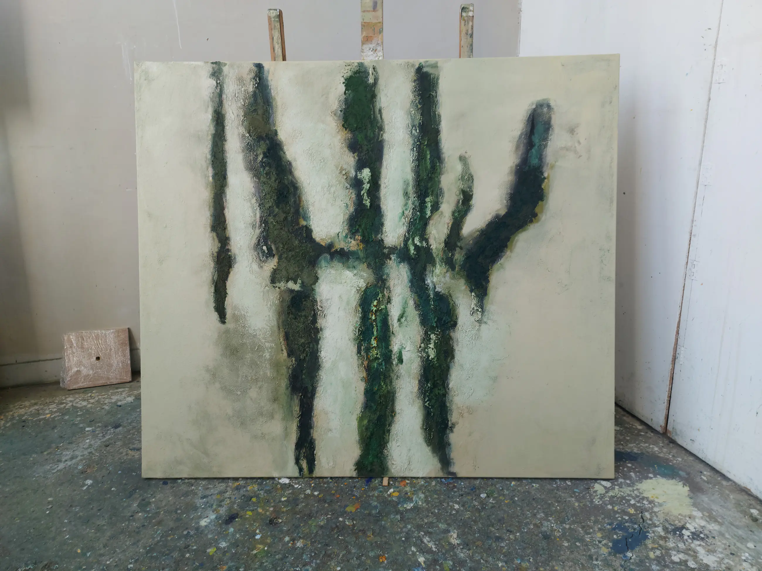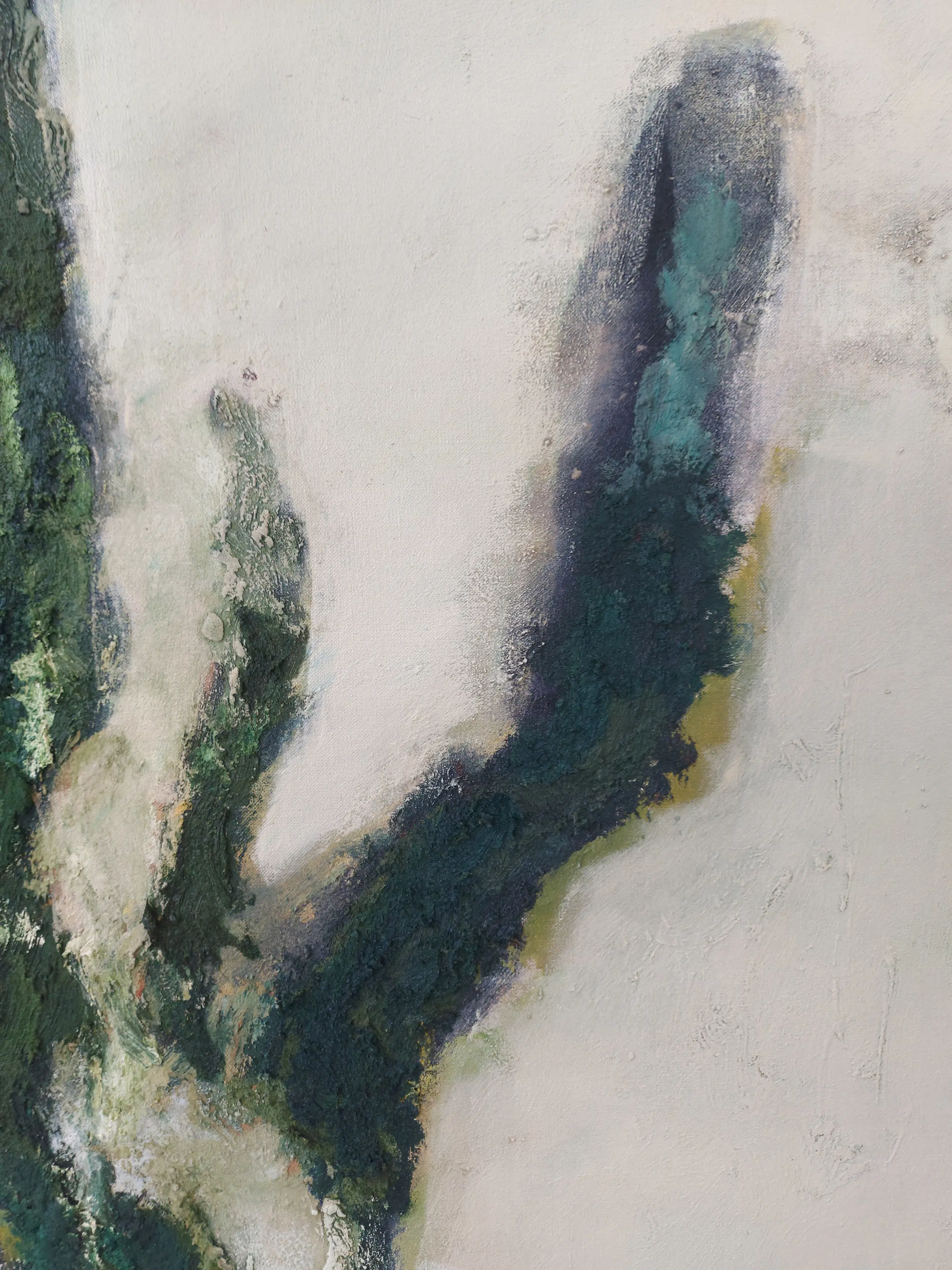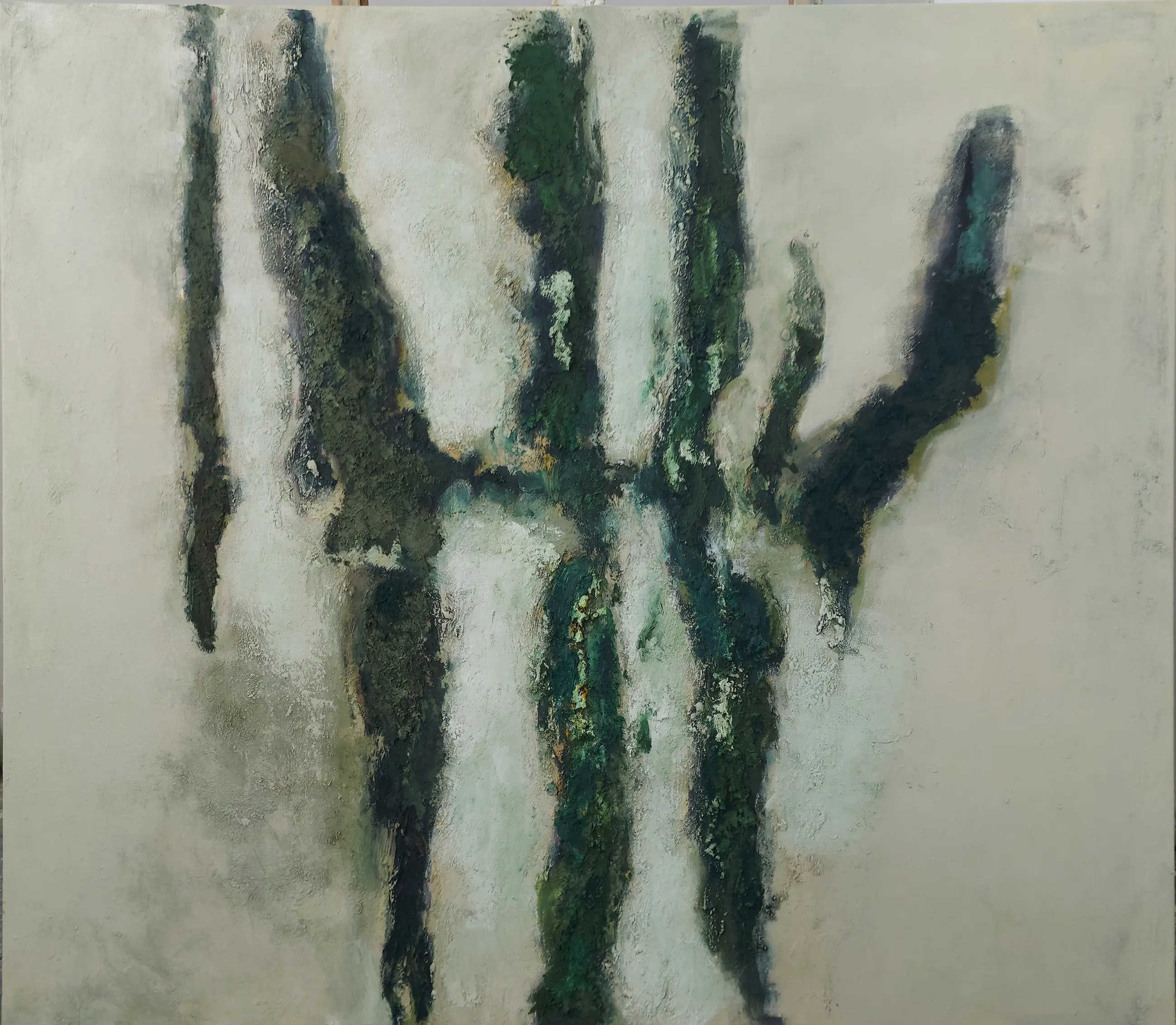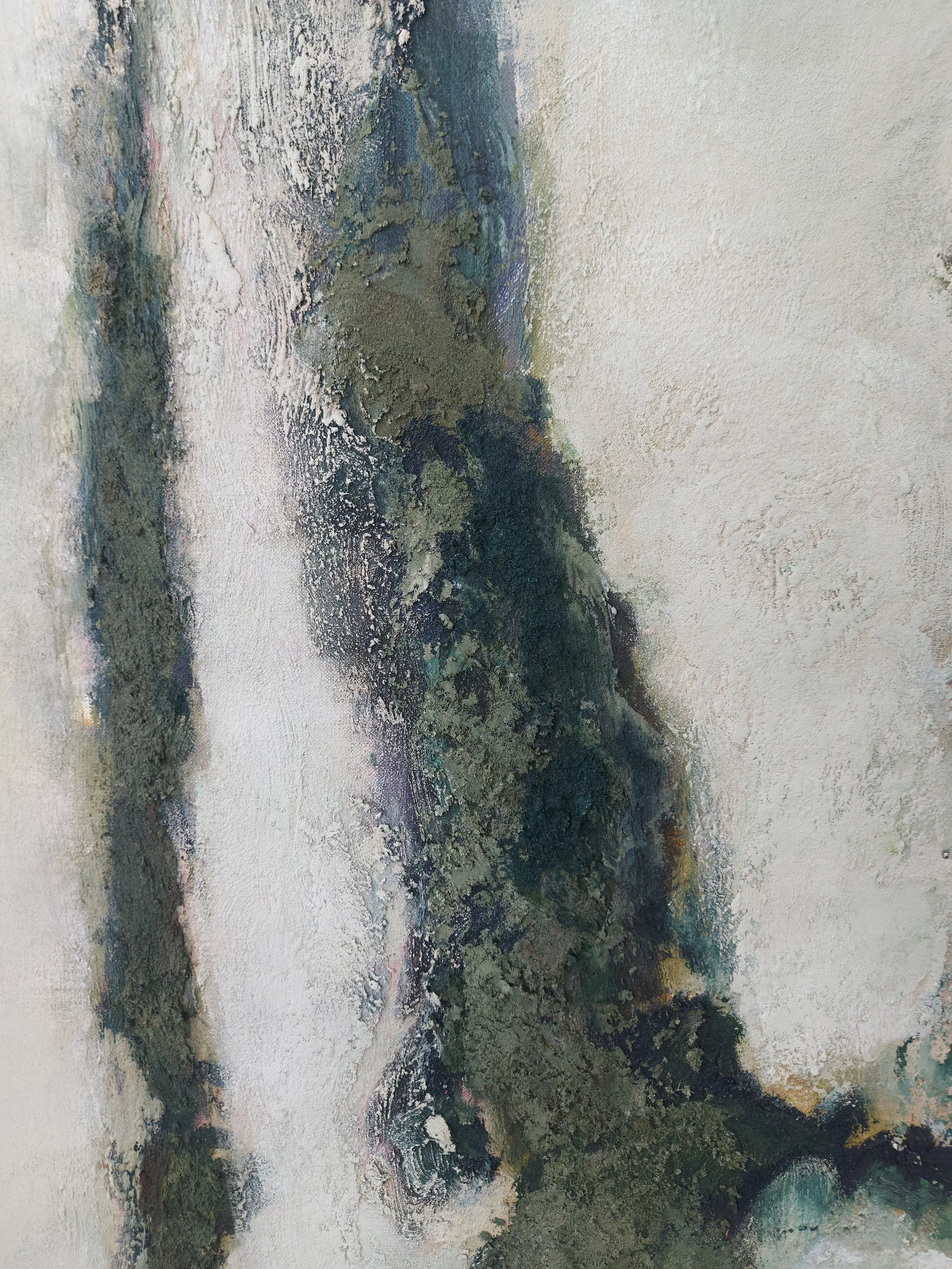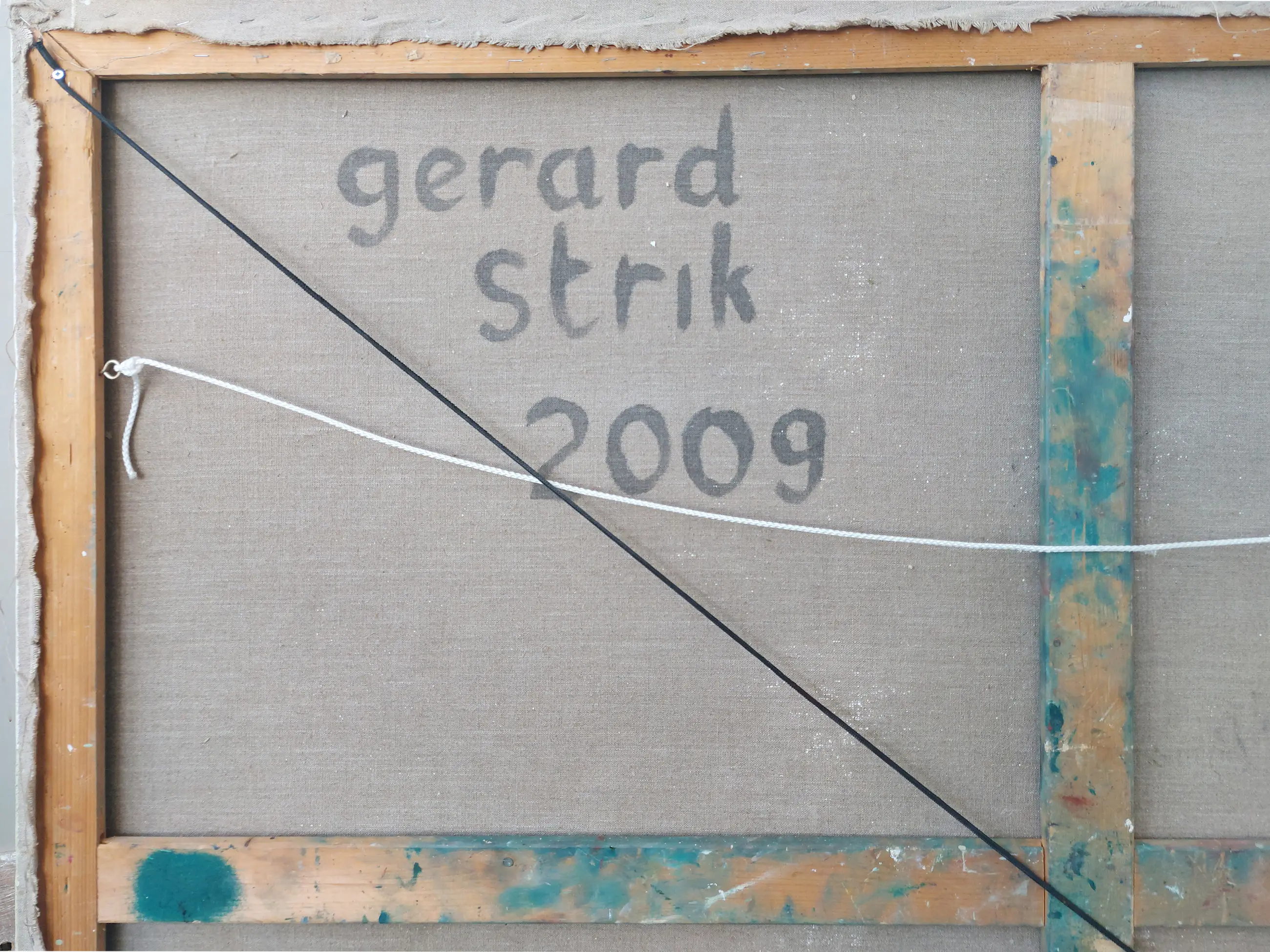 Olieverf met zand op doek. Door zijn verfbehandeling met vele vele lagen verf hebben veel van de schilderijen van Gerard Strik een bijna geboetseerde oppervlaktestructuur. Het zand dat hij aan zijn olieverf toevoegt, is niet alleen voor de structuur; het maakt zijn verf ‘aards’. Het geabstraheerde landschap wordt voelbaar.