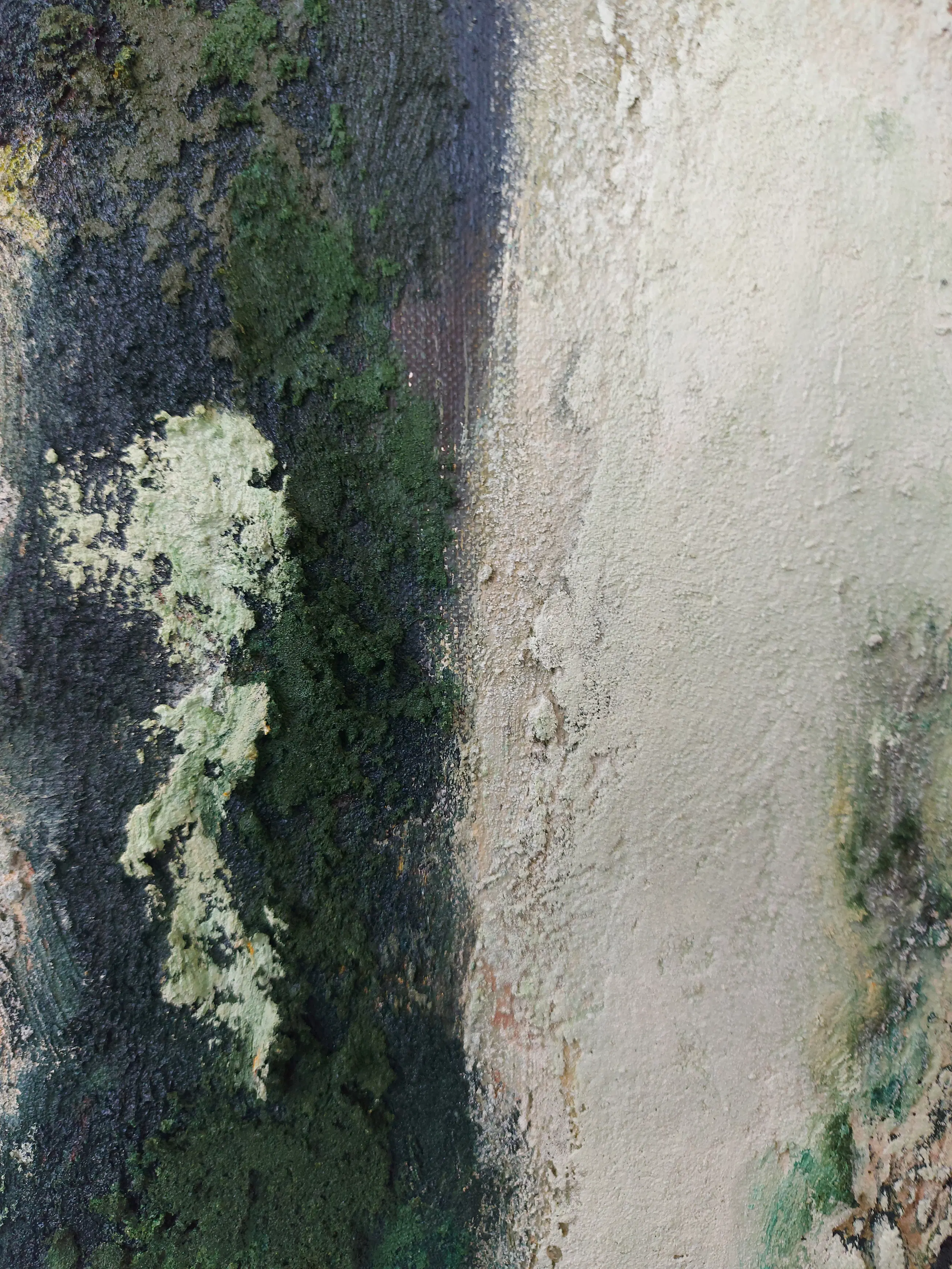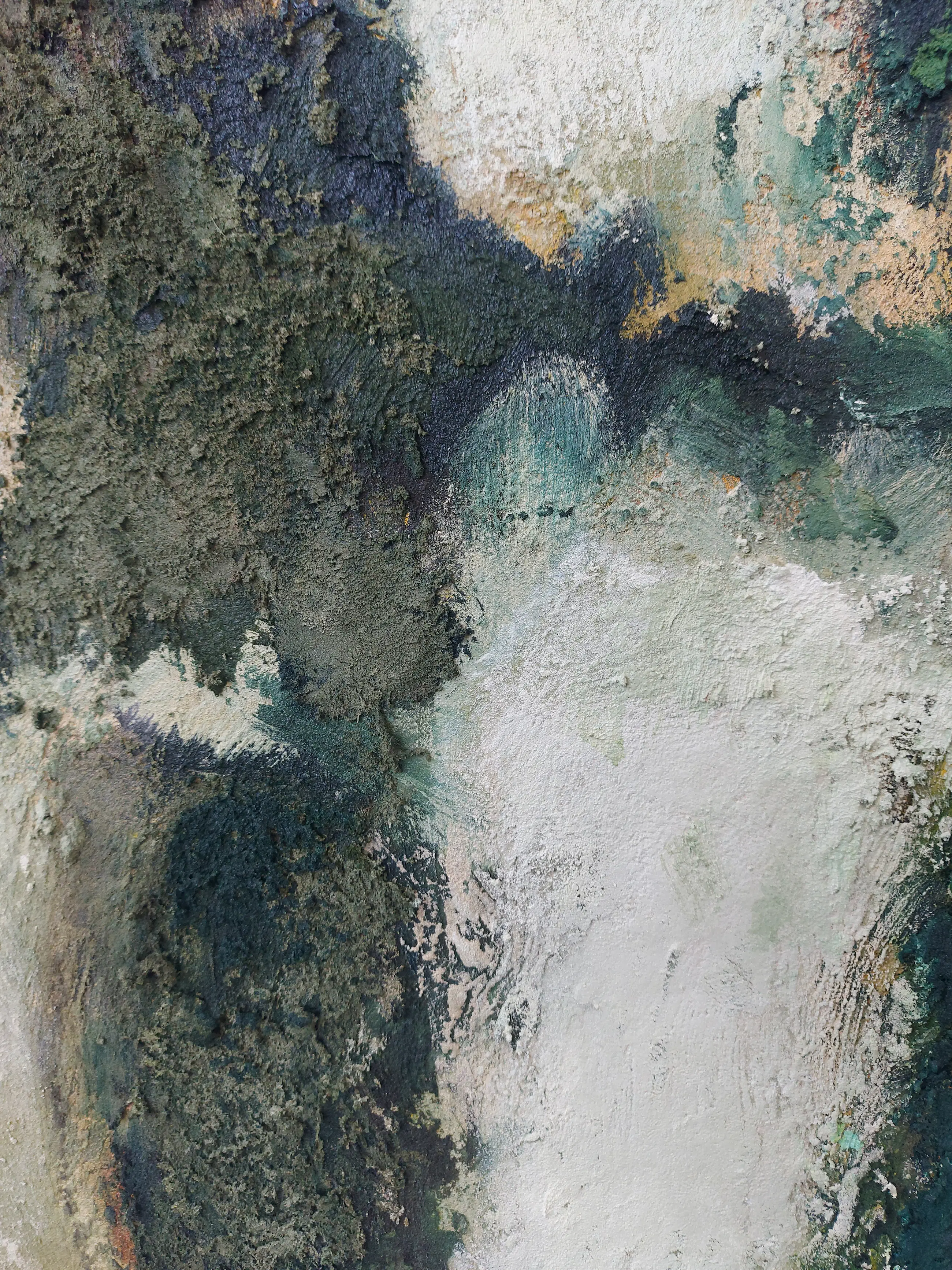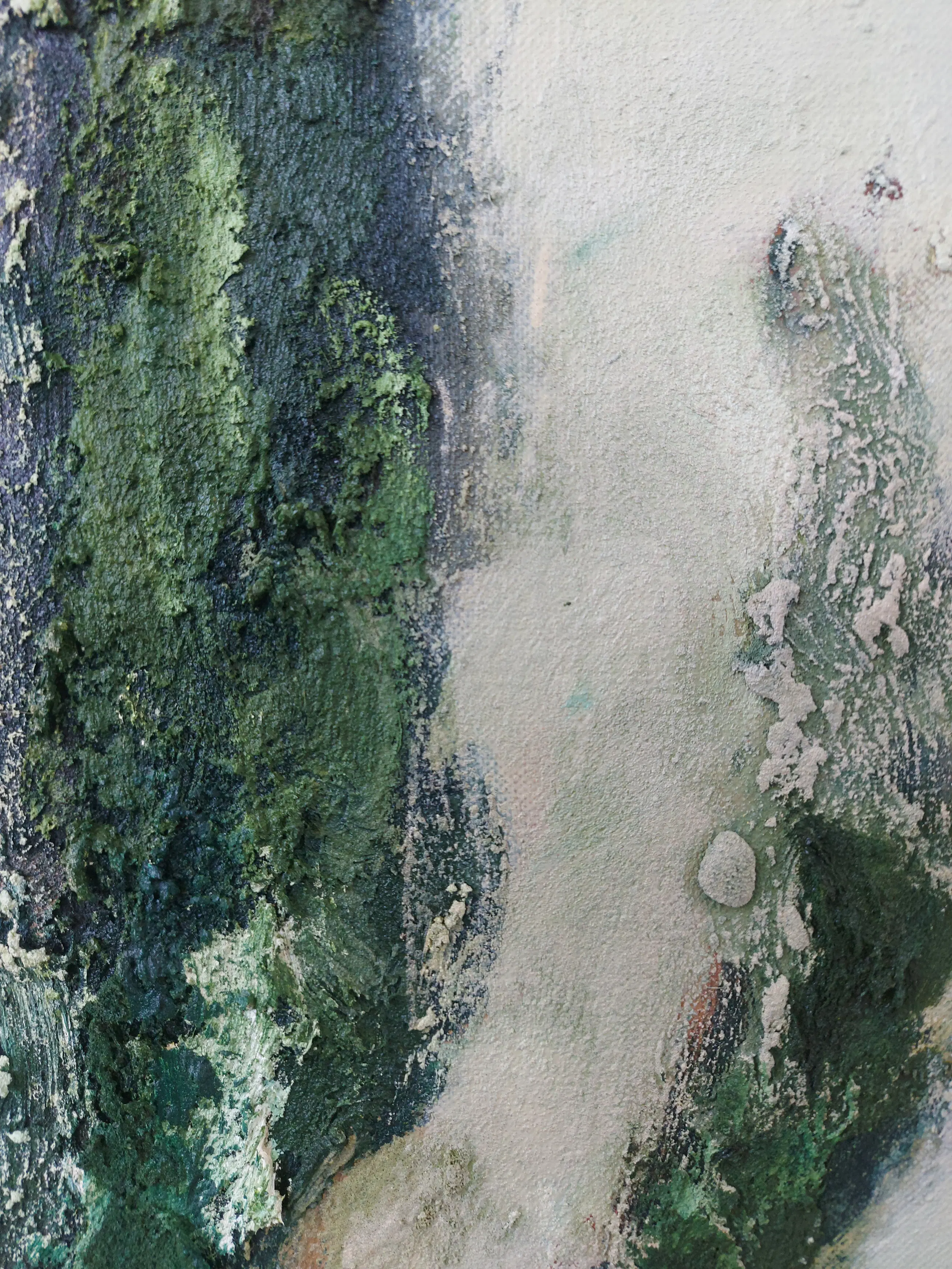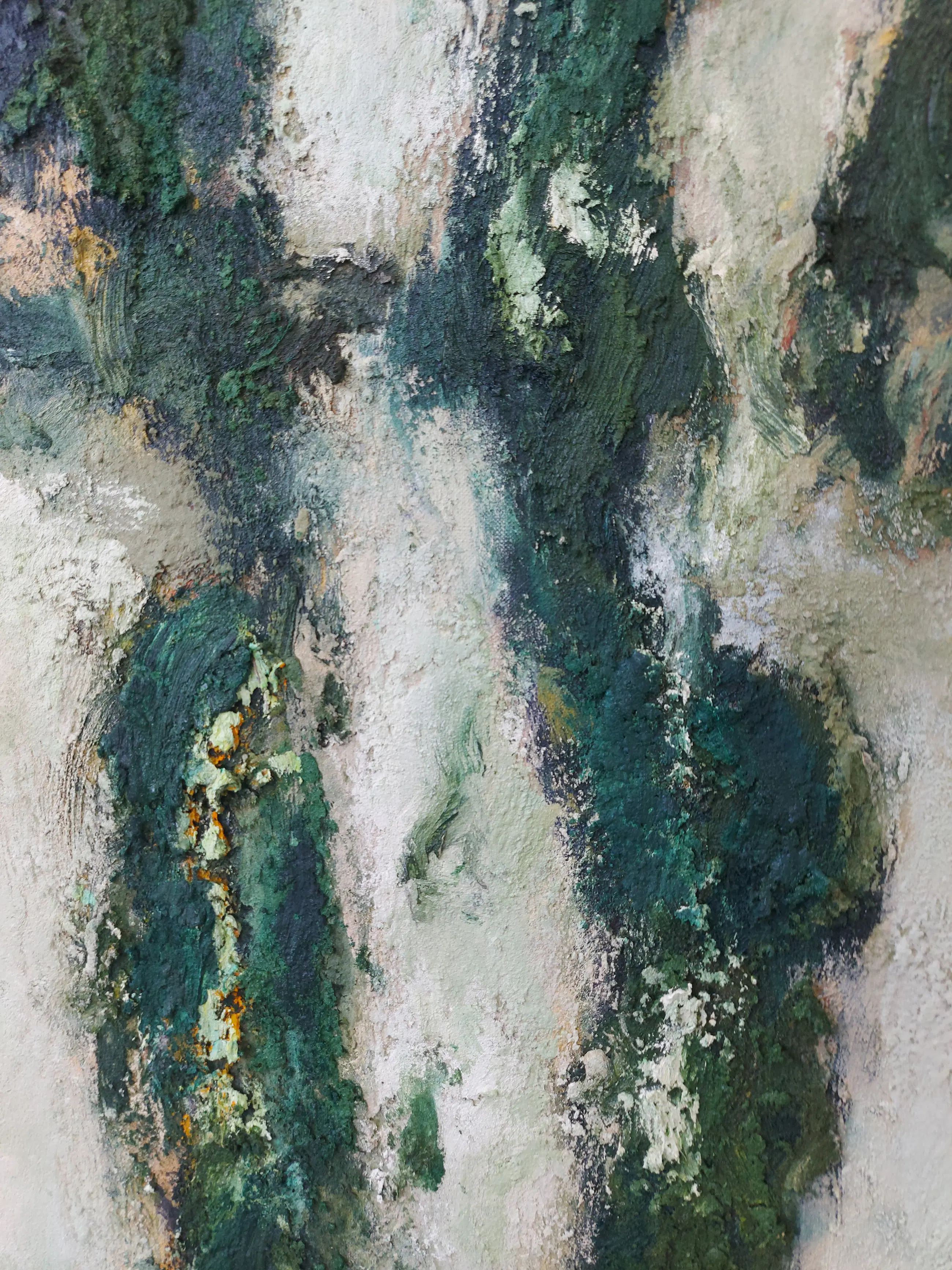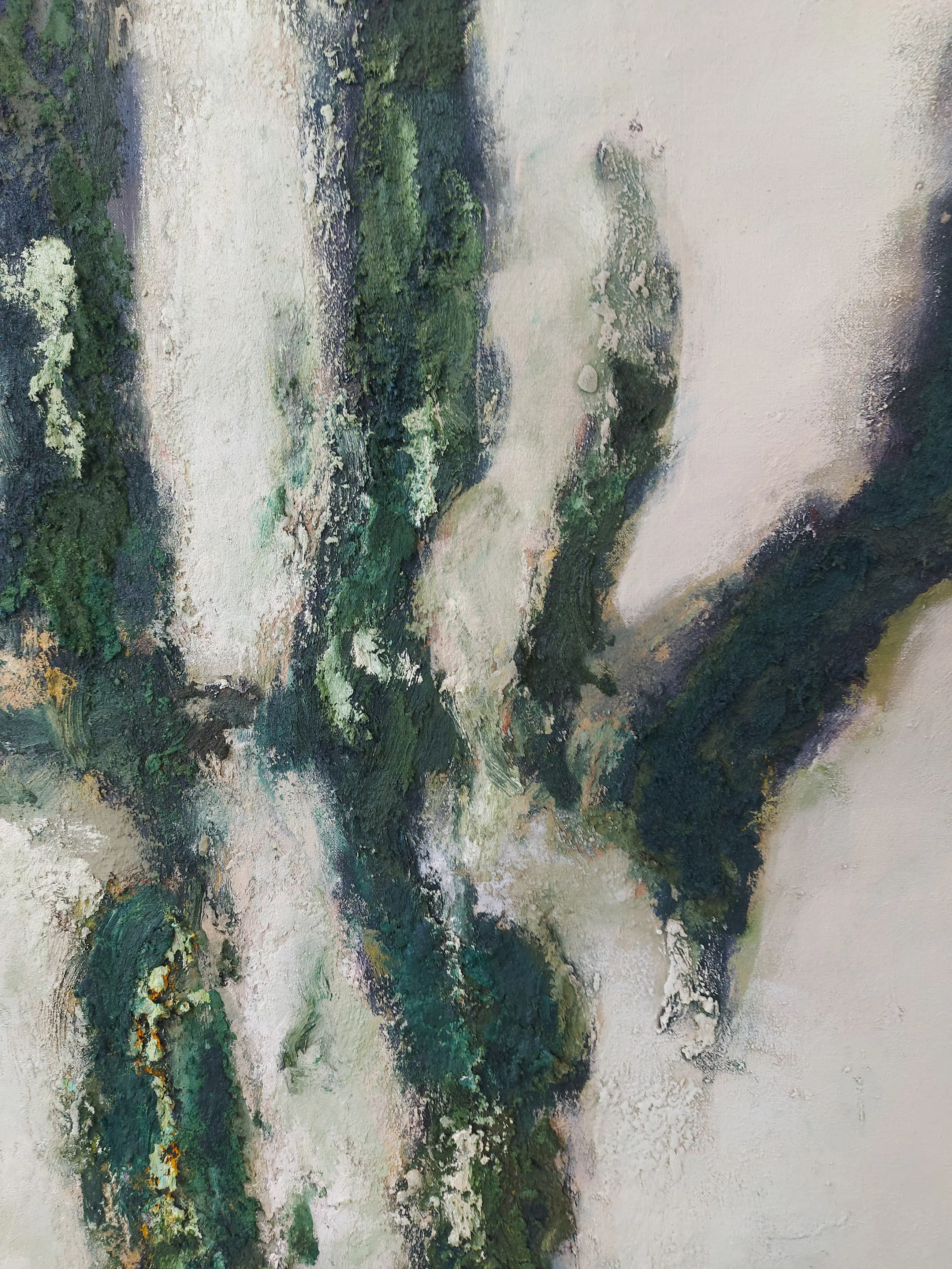 Olieverf met zand op doek. Door zijn verfbehandeling met vele vele lagen verf hebben veel van de schilderijen van Gerard Strik een bijna geboetseerde oppervlaktestructuur. Het zand dat hij aan zijn olieverf toevoegt, is niet alleen voor de structuur; het maakt zijn verf ‘aards’. Het geabstraheerde landschap wordt voelbaar.